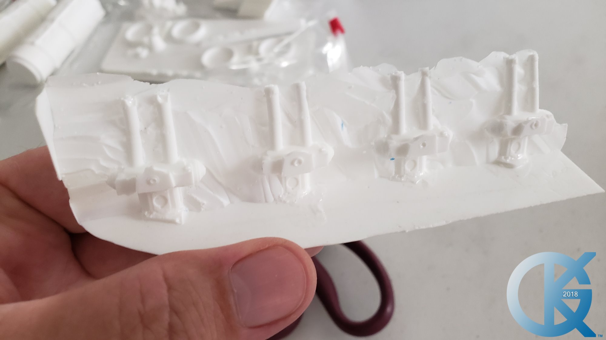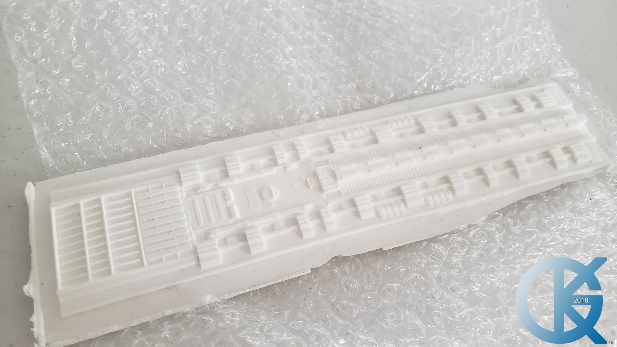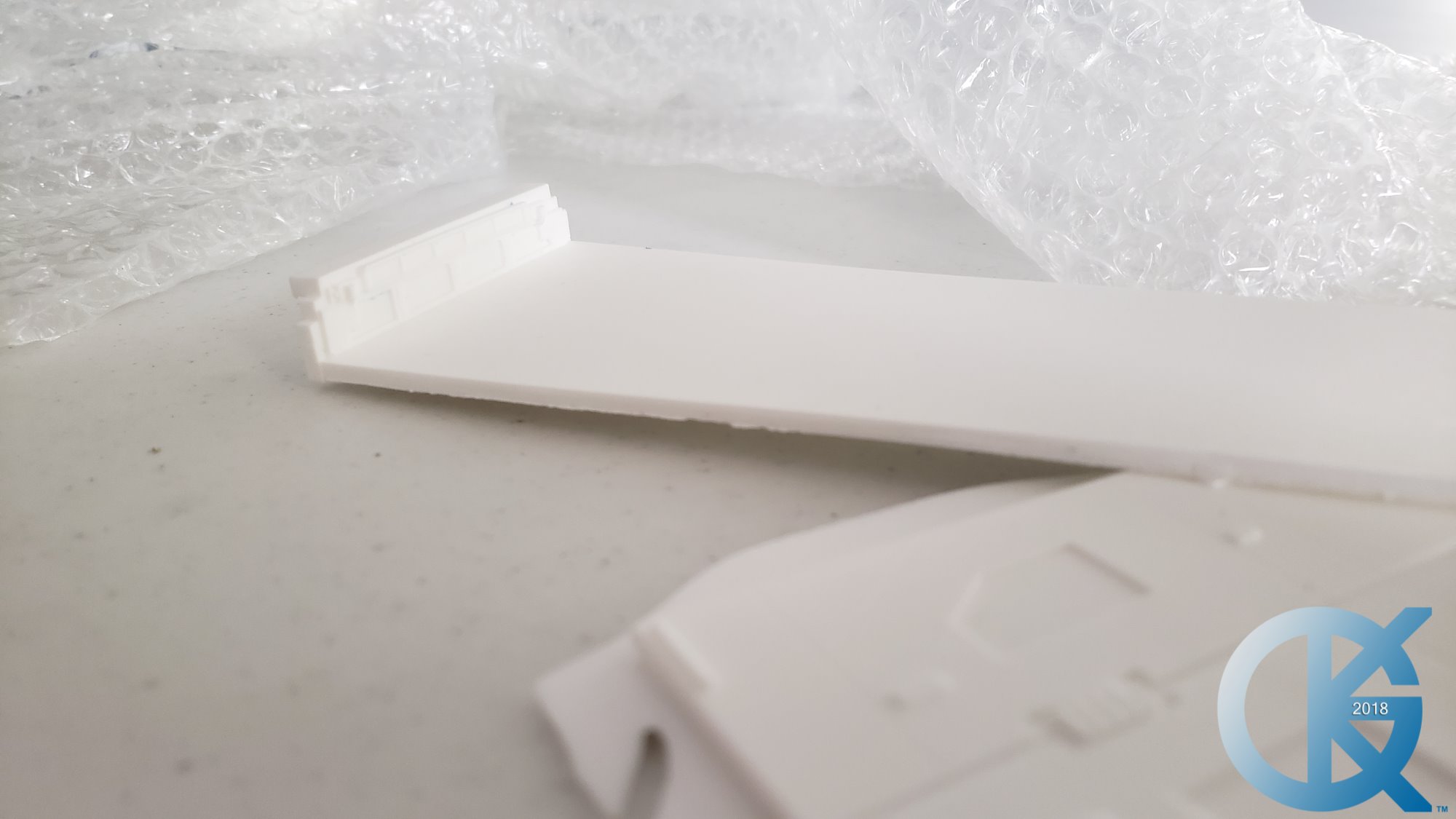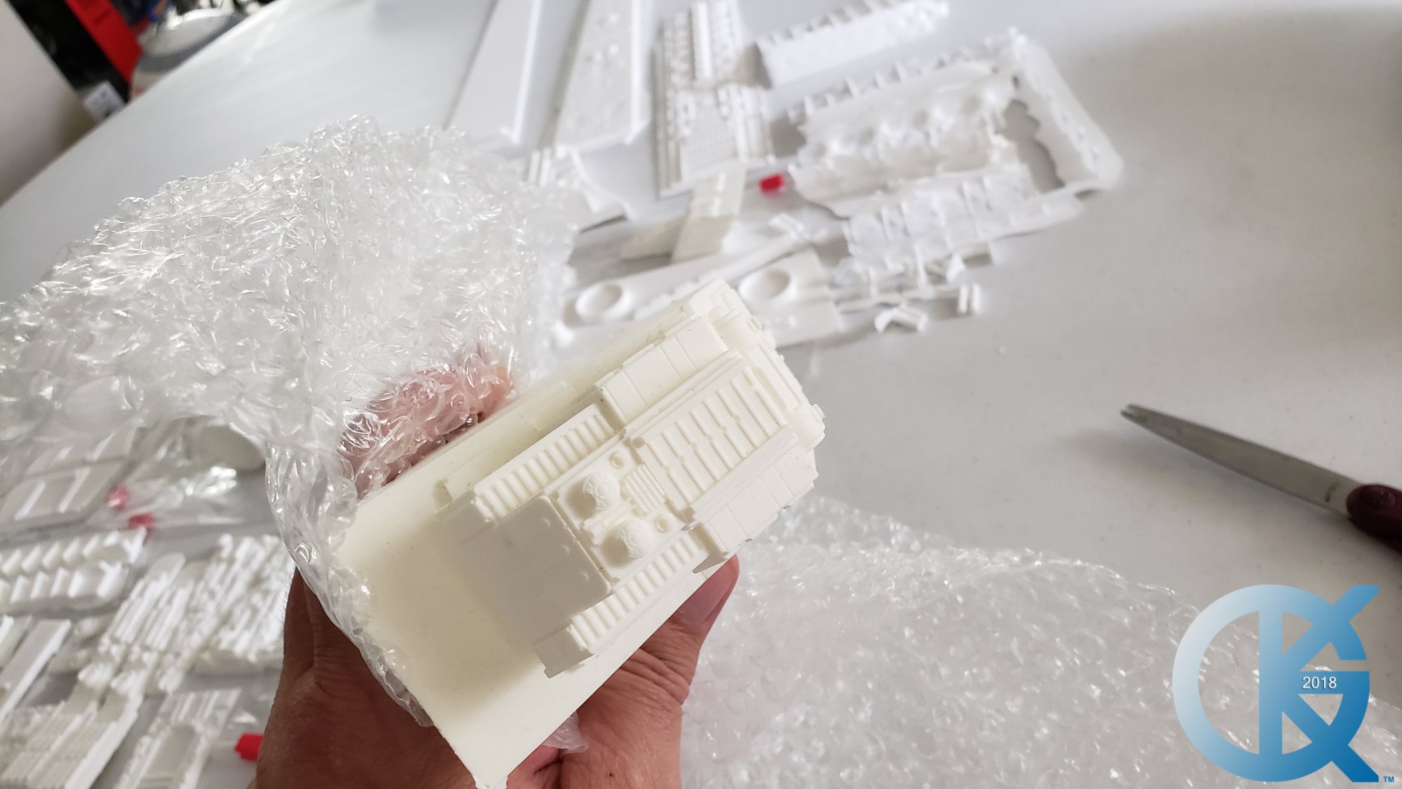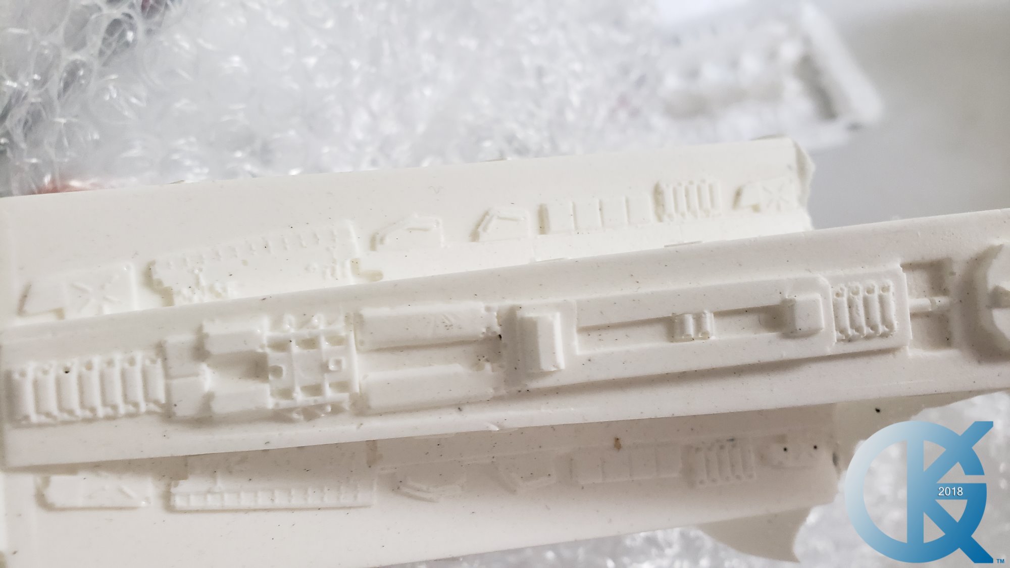 The box arrived with a small dent in the top from the shippers, but all in all, it was in good condition when it arrived. It had heft to it as well, and when I opened the box to reveal the well packed parts, I could see why. This one was packed so well that not one part was found broken when I finally finished unwrapping it all (a process that took me 1/2 hour). This is great news to me, as I have received kits before from many kit makers (that had been shipped in much smaller boxes) that were delivered to me with broken parts here and there. I take this as a great sign. The first thing noticeable is how many parts there are, and that some will need significant trimming of flash. That stated…. I found this kit to be quite crisp in cast, with the ‘sometimes’ found teeny tiny bits of rubber mold in tiny detail areas here and there. Not an issue for us at all. If I look really hard, with my aging eyes, and I take extreme close-up shots of the parts, you might see a micro-bubble once in a while… which has been common in this art form, and of which has lessened over this last decade with new technologies and skill. There is a large block of resin that is actually part of the kit… a kind of armature that enforces the overlaying panels. It is heavy for sure, and something we may end up replacing, while keeping it’s form and purpose in mind. There are many guns and long tubular shaped cast parts that we may replace as well, using brass in their stead. Over all… this kit is very build-able, and will display nicely when built. We shall see that review at that time. Alfred Wong did amazing work in creating these patterns. I am very happy to have one, let alone two (the second of which will be in one of those future shipments).