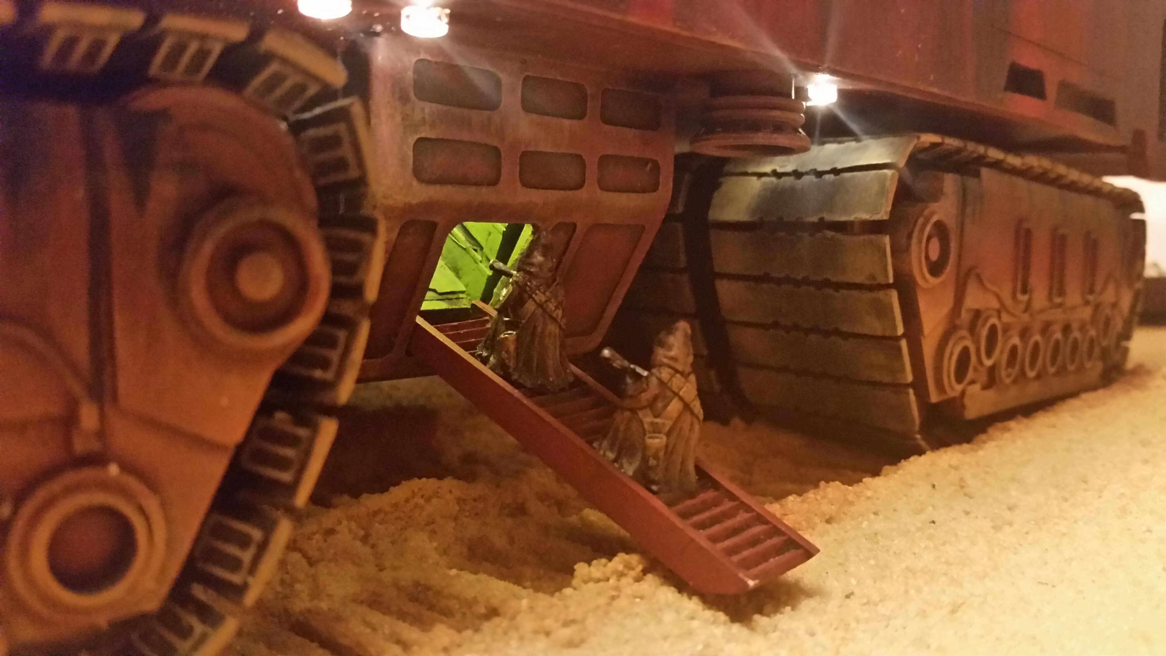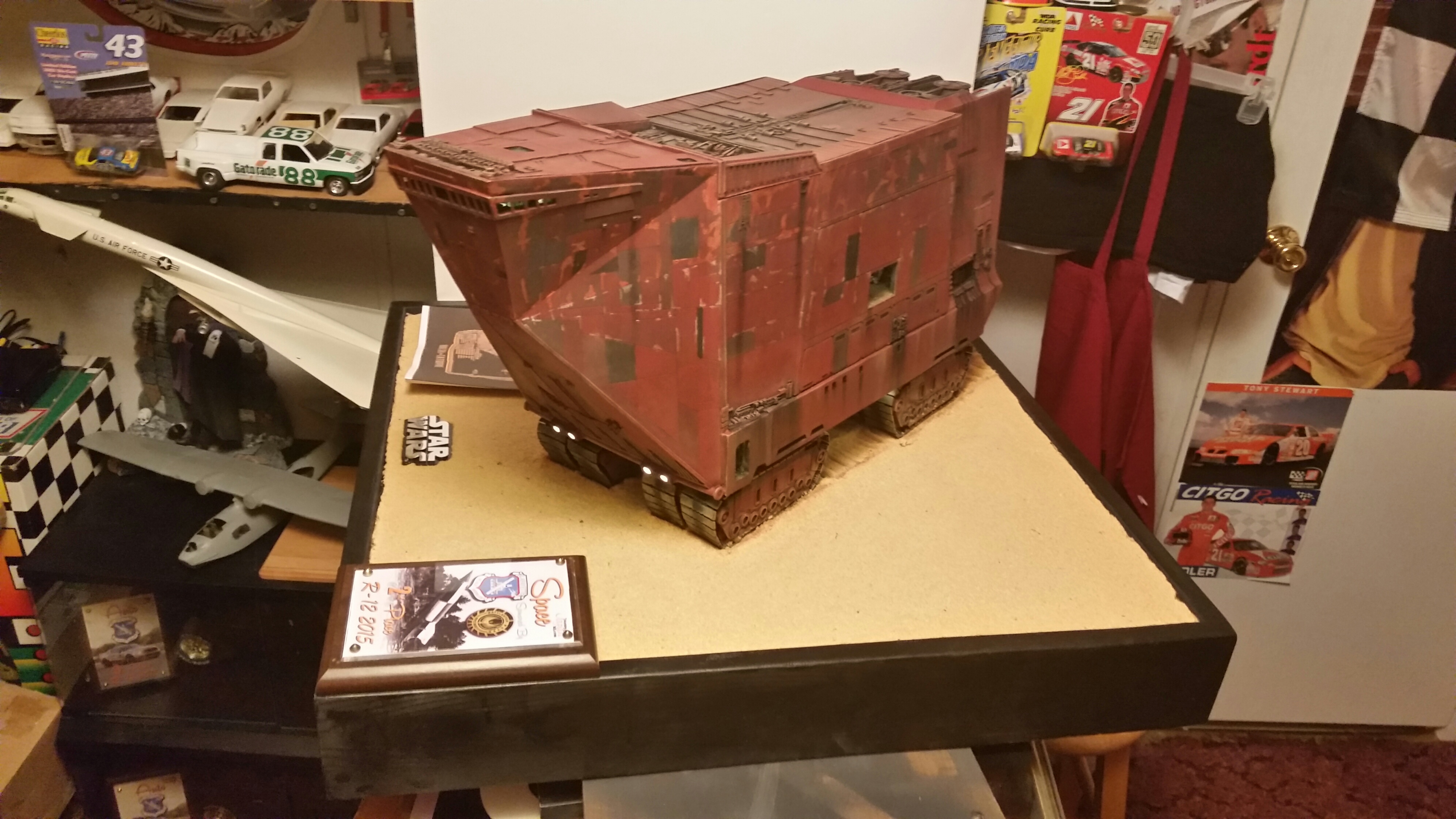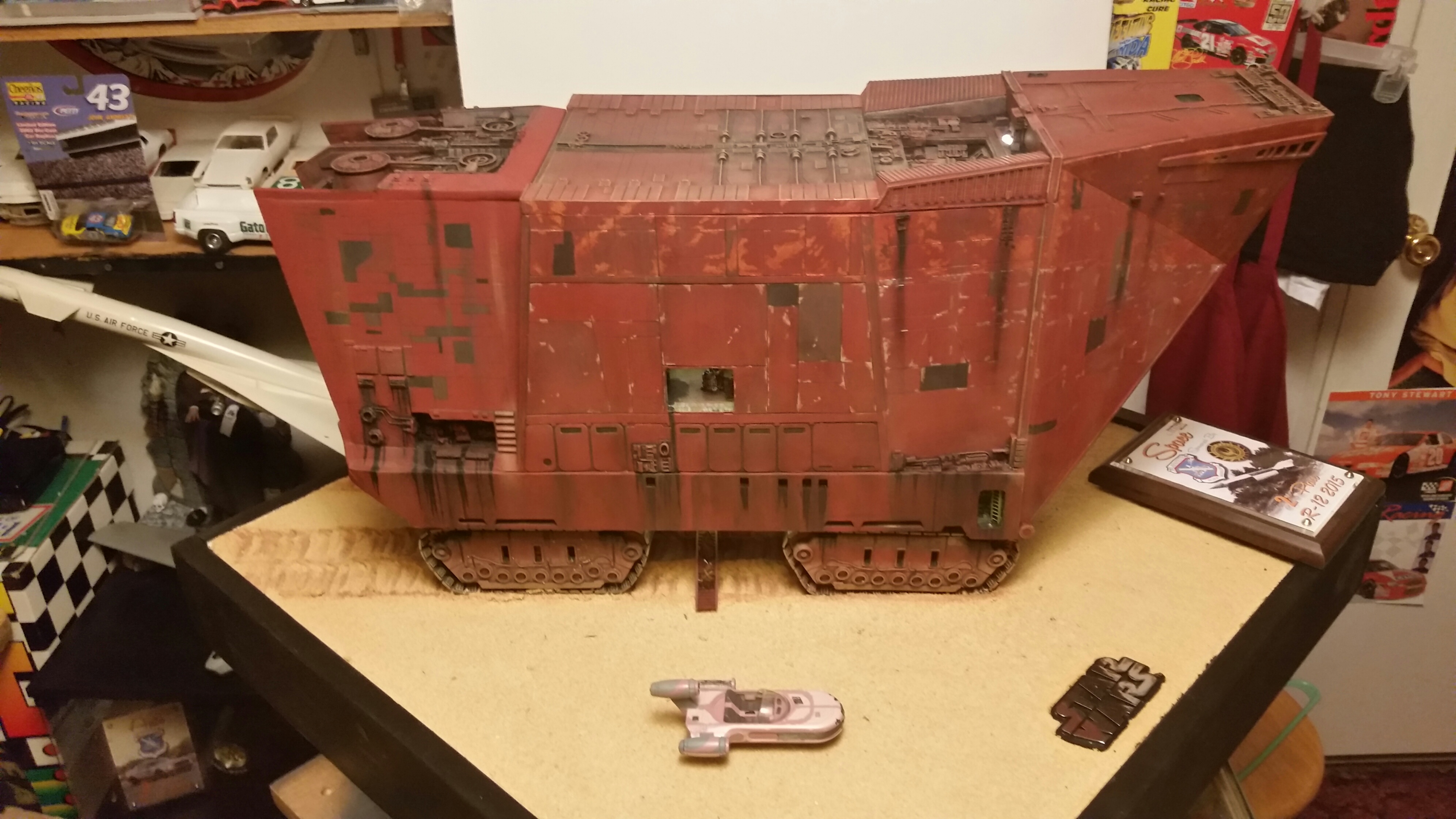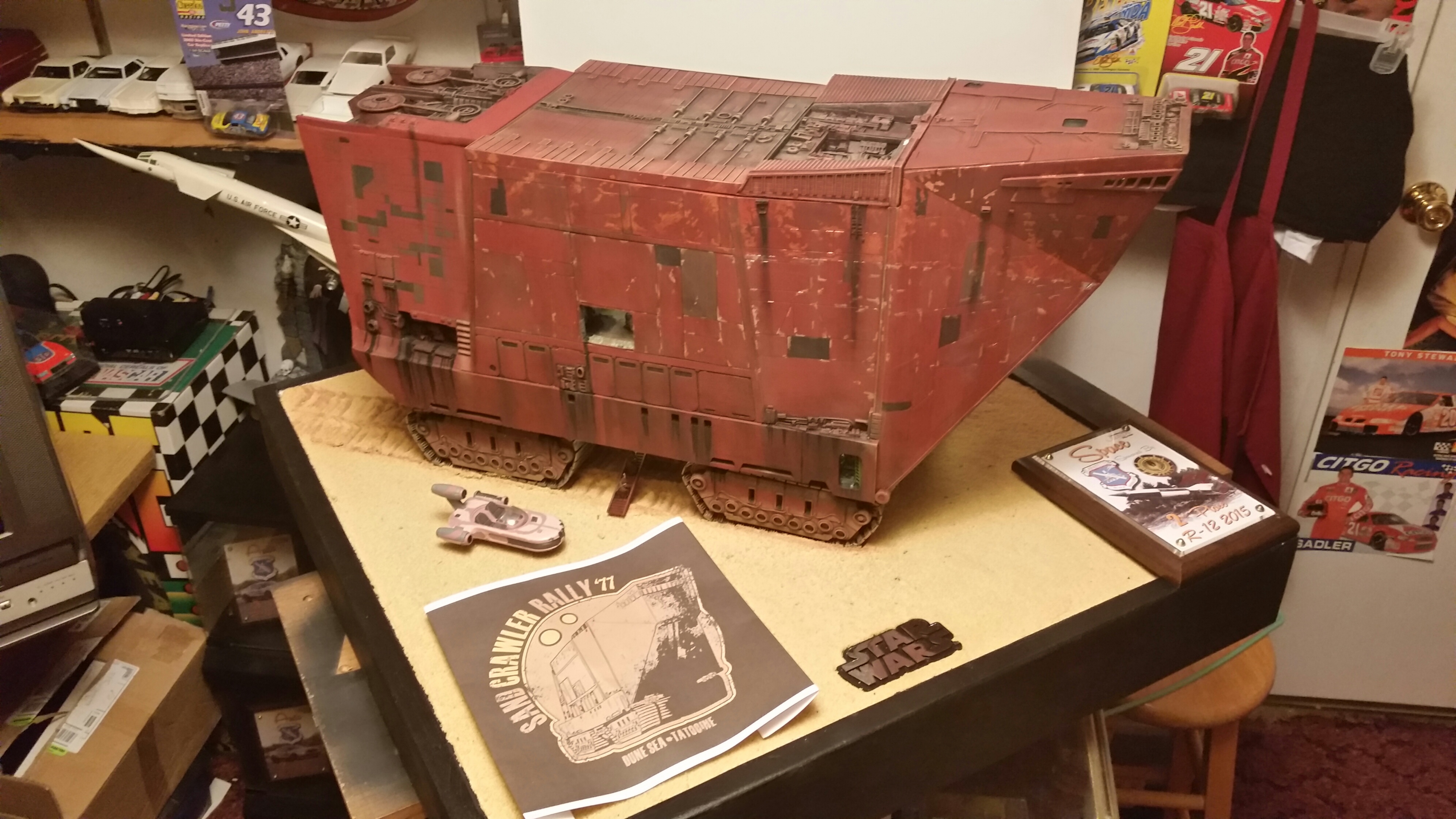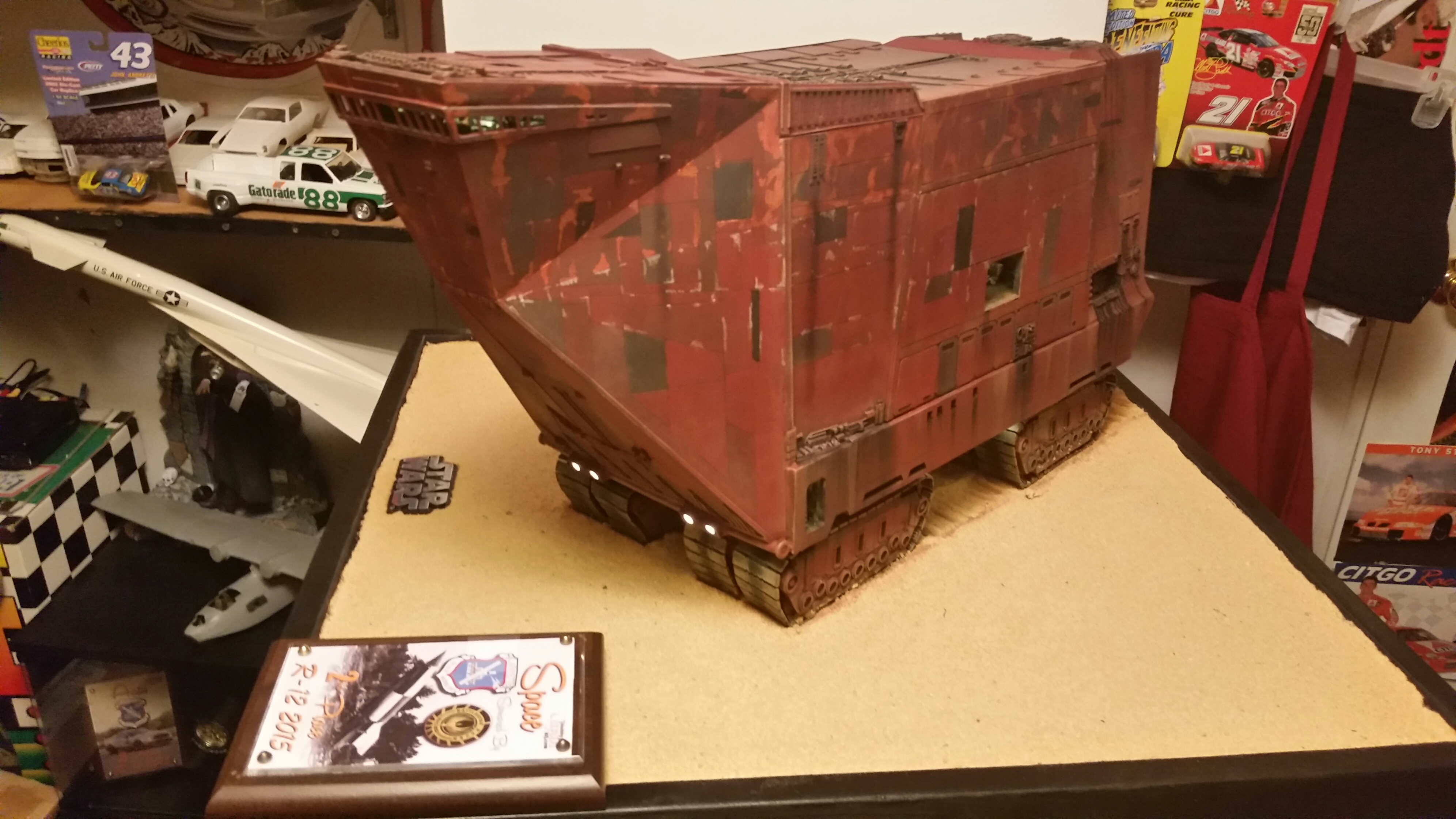 Cooper Sandcrawler built for my wife Stacy. Complete scratch built main floor with an escape pod , droids (micro machine sets) and fully lit ceiling using around 90 lights total. The base was made with brick mortar sand and three bottles of white glue. It dried rock hard.