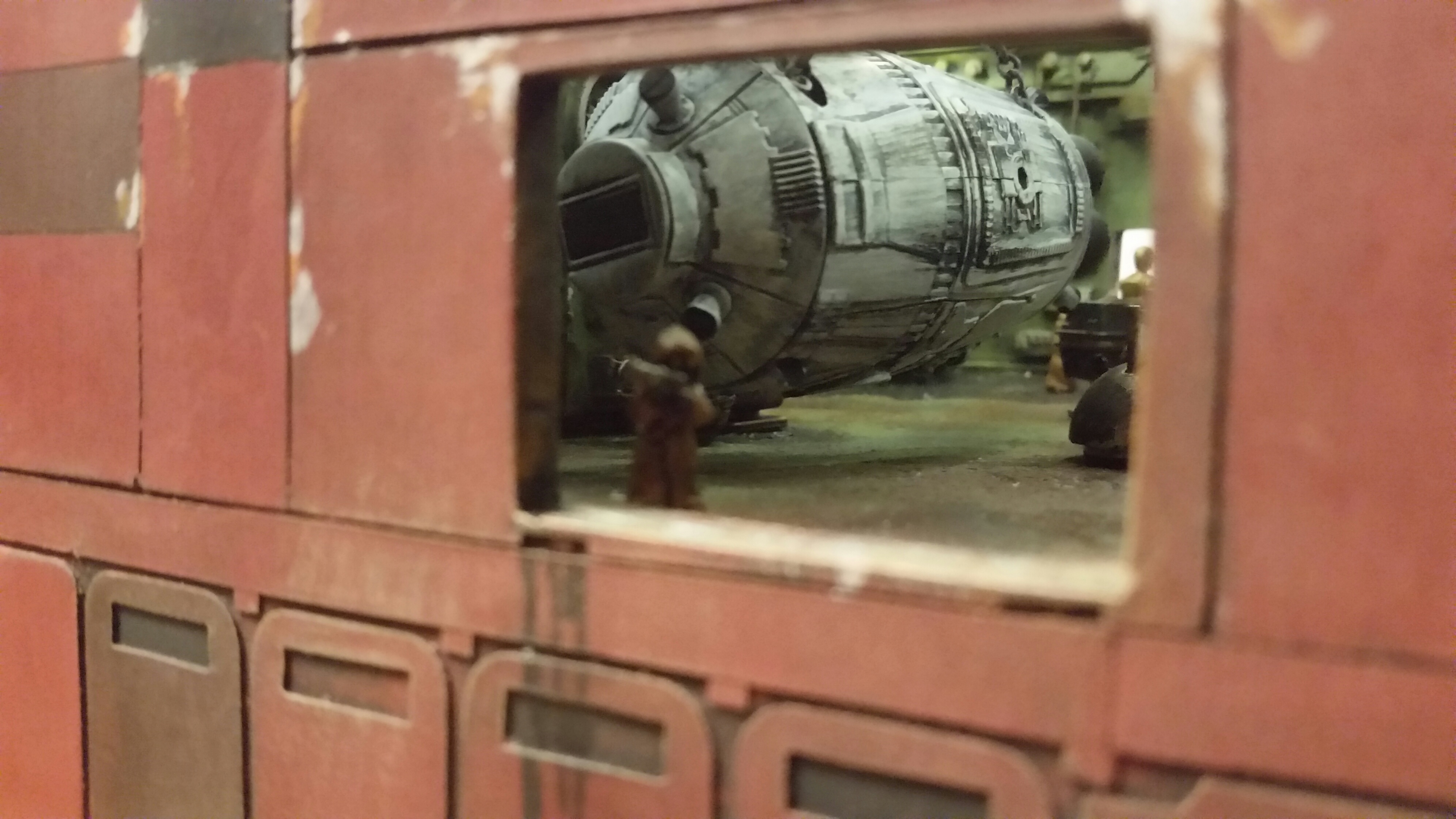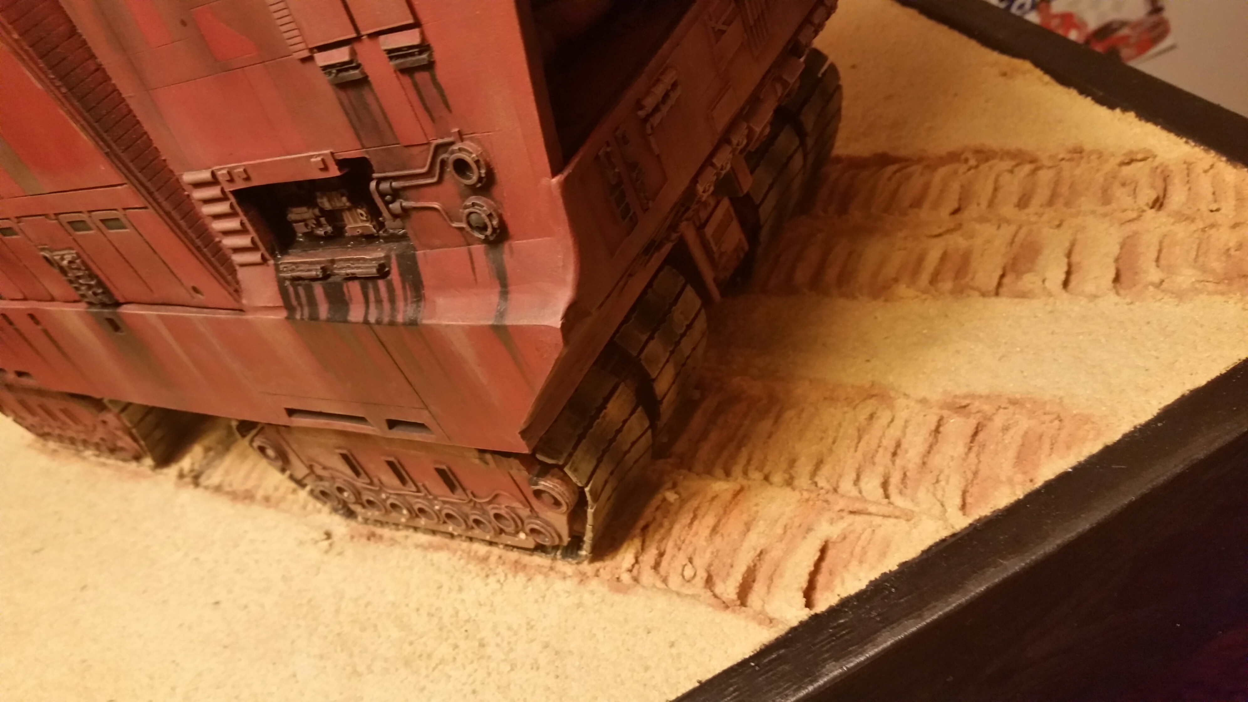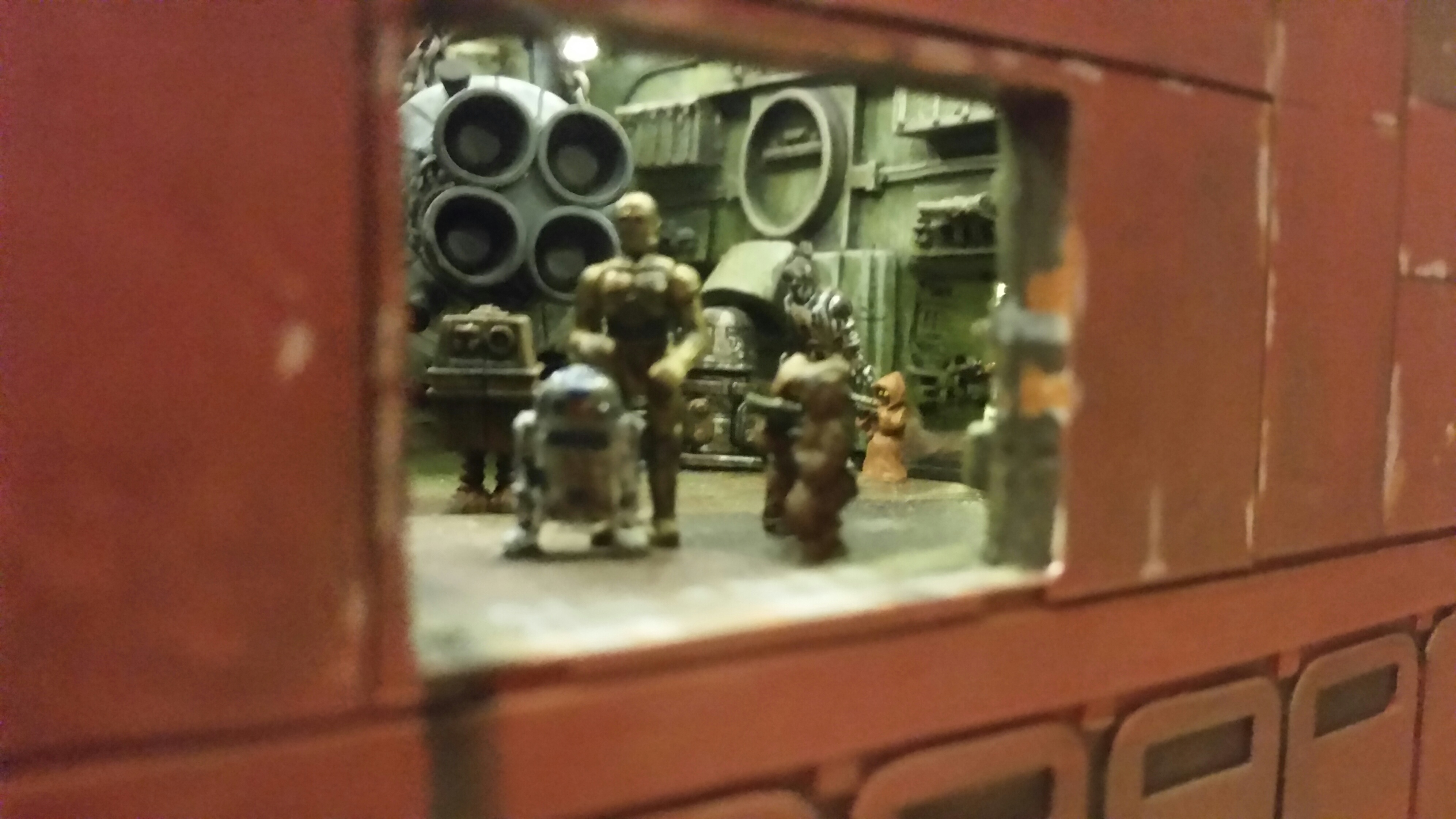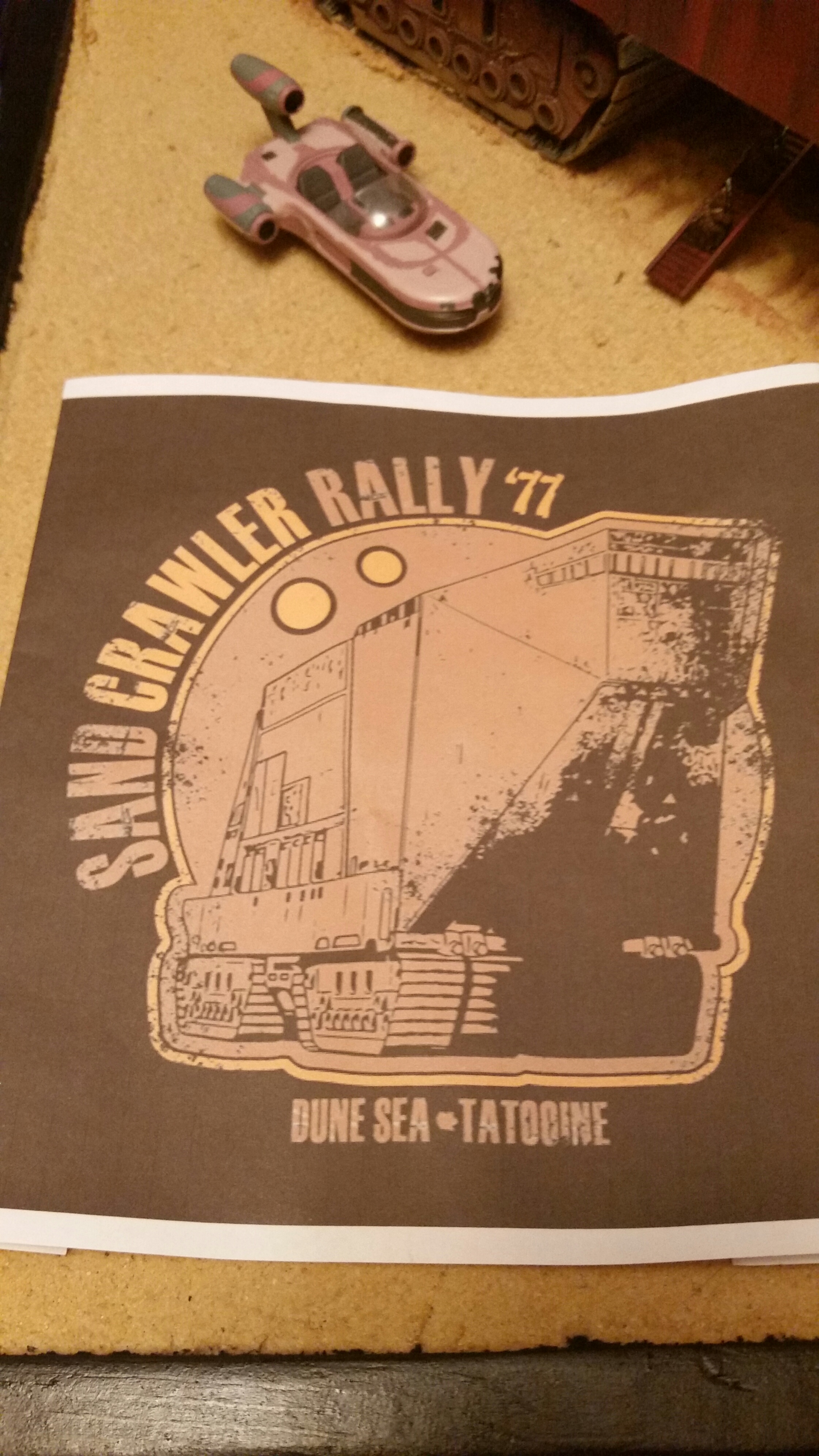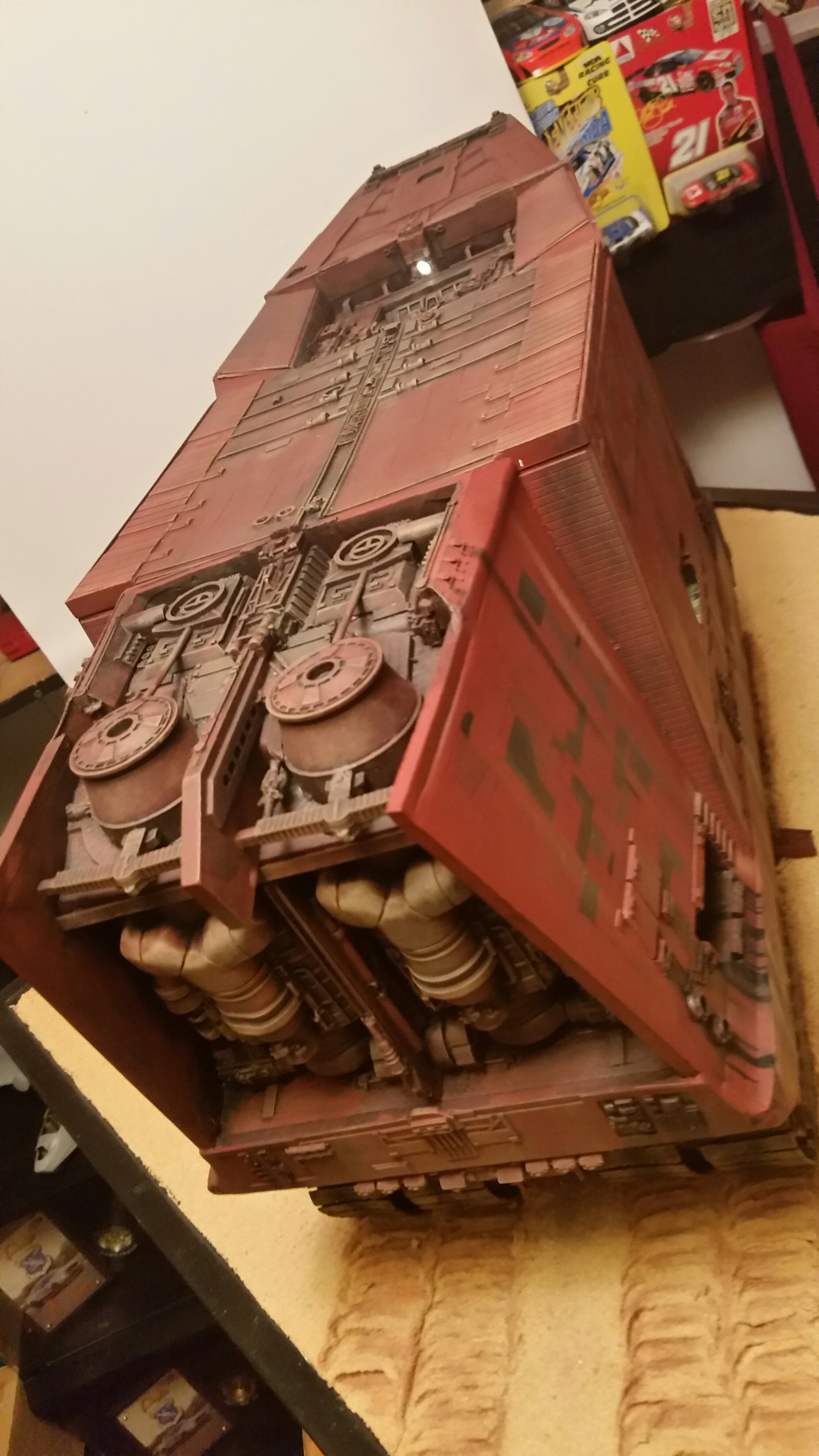 Cooper Sandcrawler built for my wife Stacy. Complete scratch built main floor with an escape pod , droids (micro machine sets) and fully lit ceiling using around 90 lights total. The base was made with brick mortar sand and three bottles of white glue. It dried rock hard.