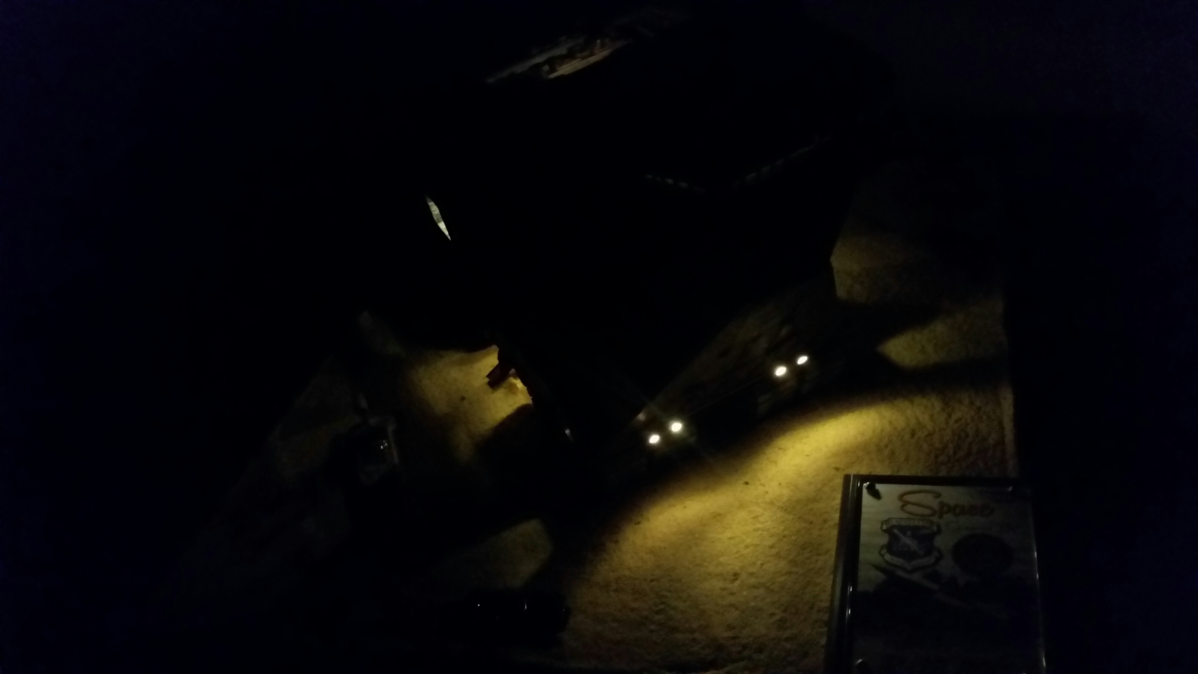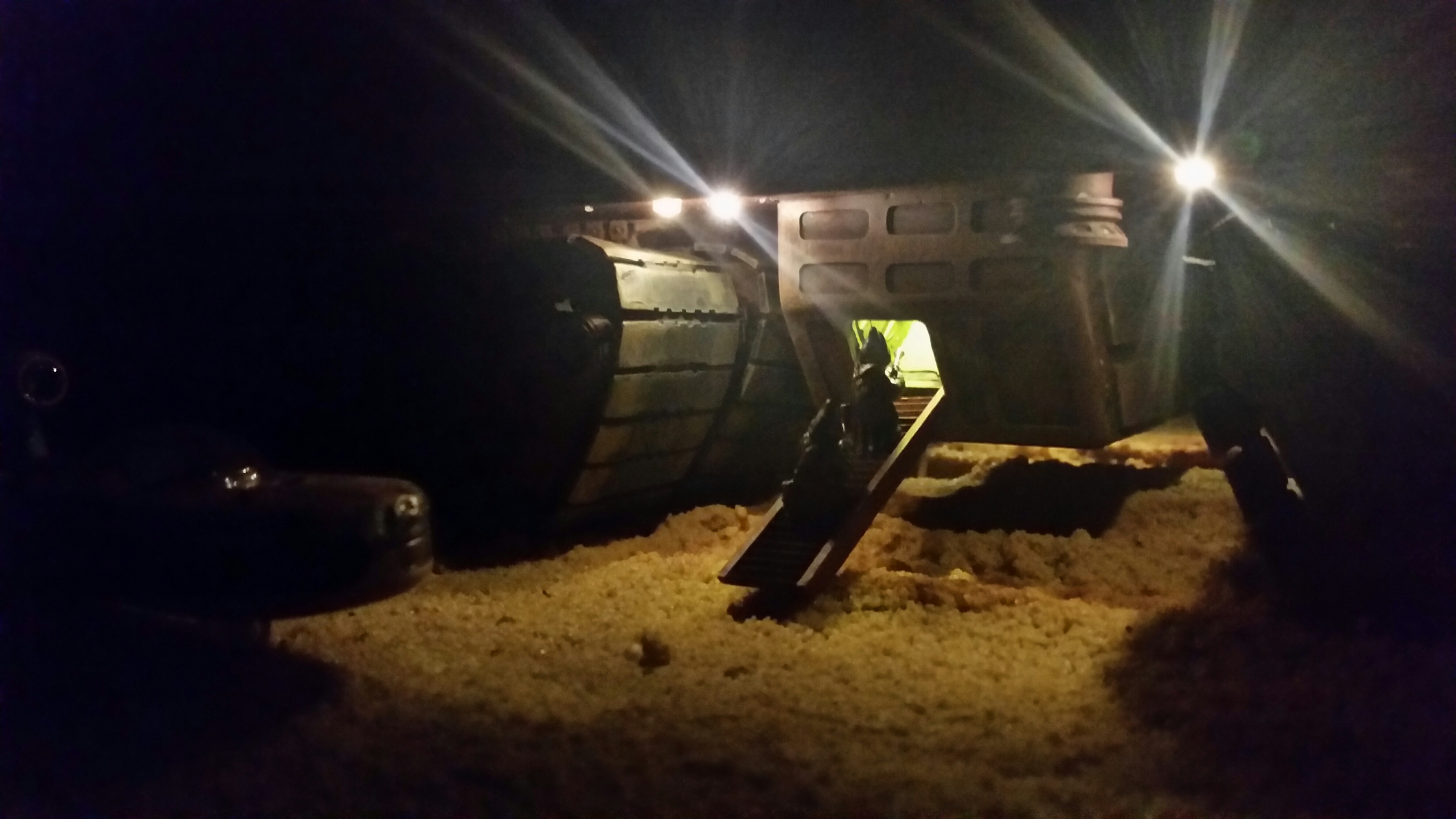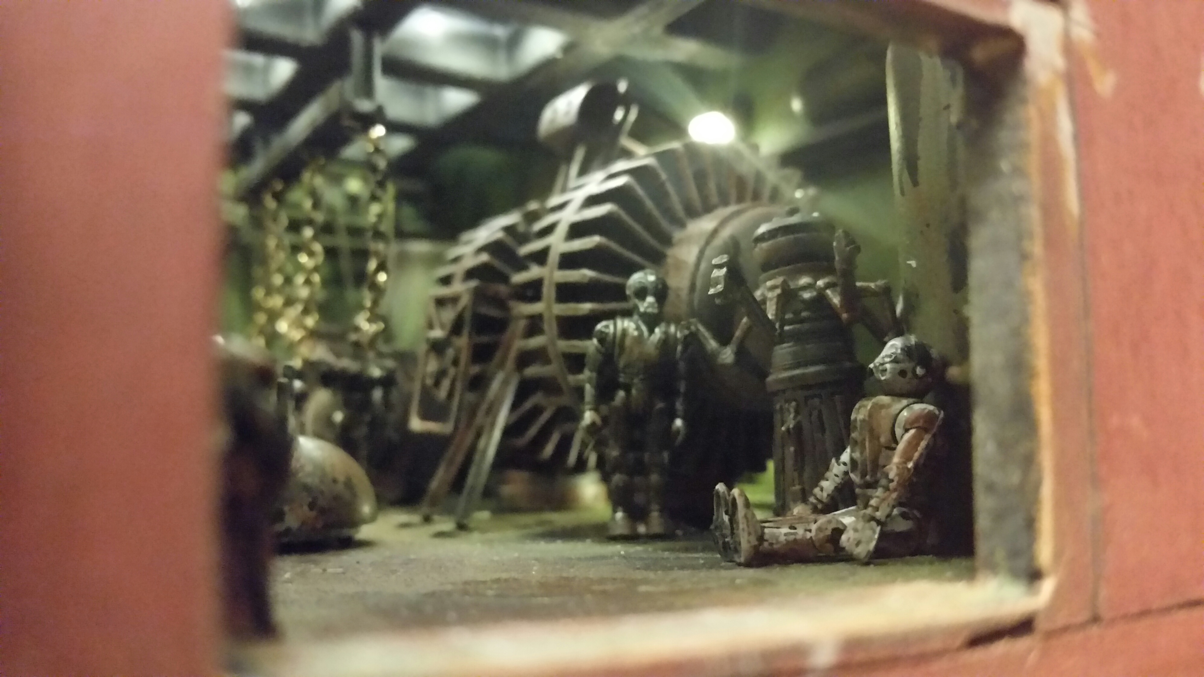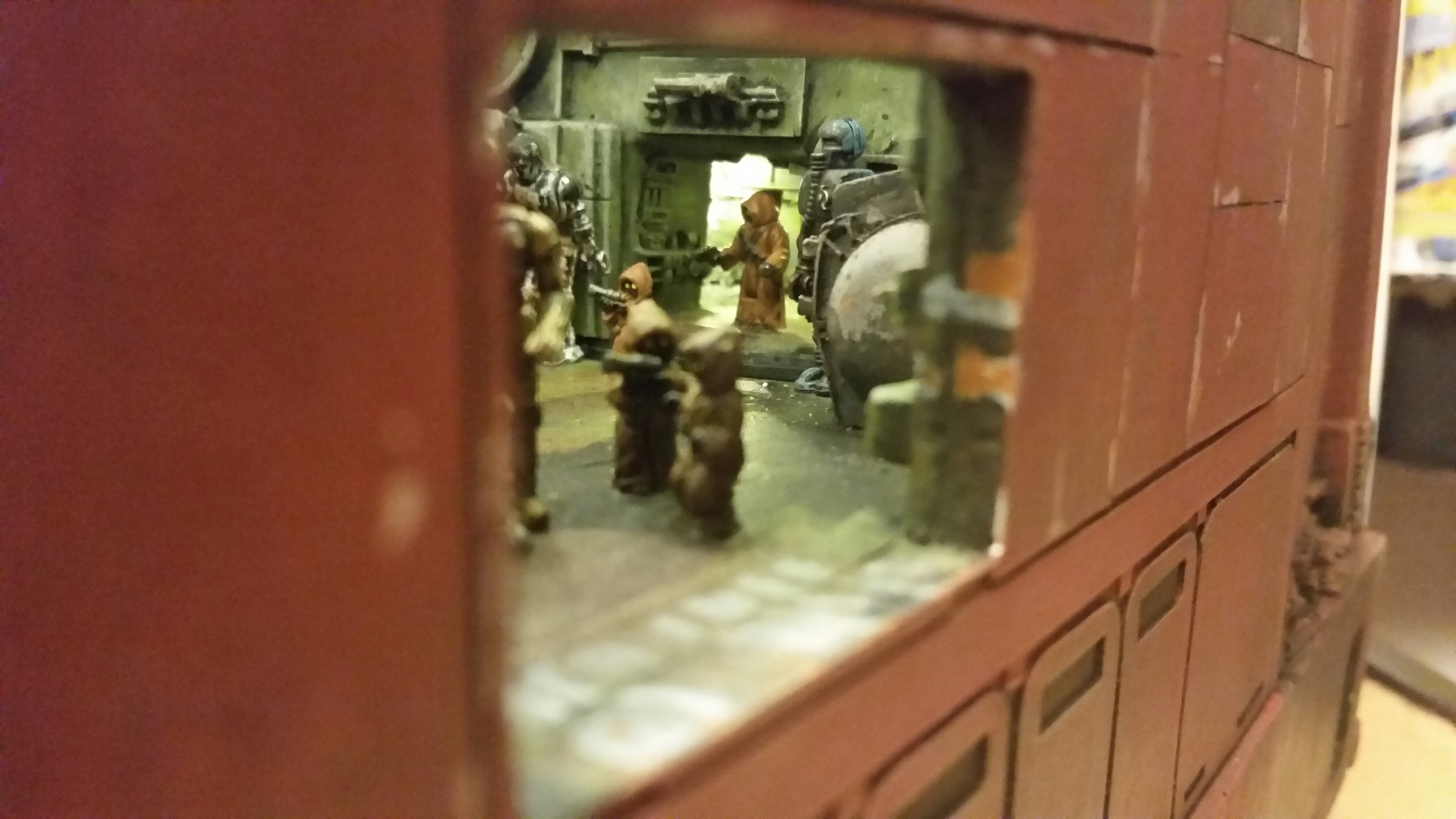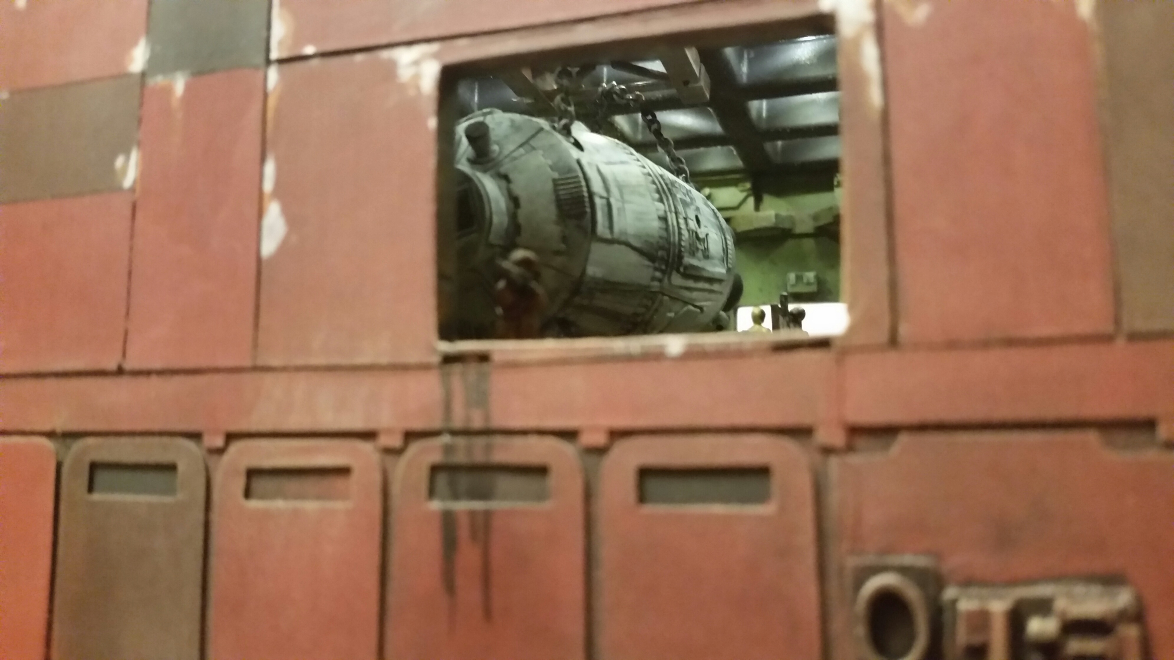 Cooper Sandcrawler built for my wife Stacy. Complete scratch built main floor with an escape pod , droids (micro machine sets) and fully lit ceiling using around 90 lights total. The base was made with brick mortar sand and three bottles of white glue. It dried rock hard.
