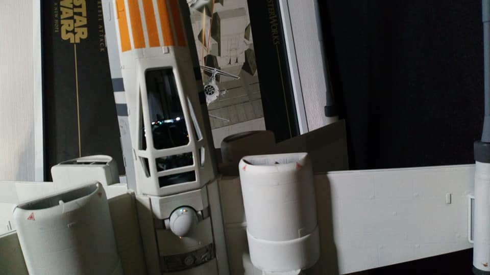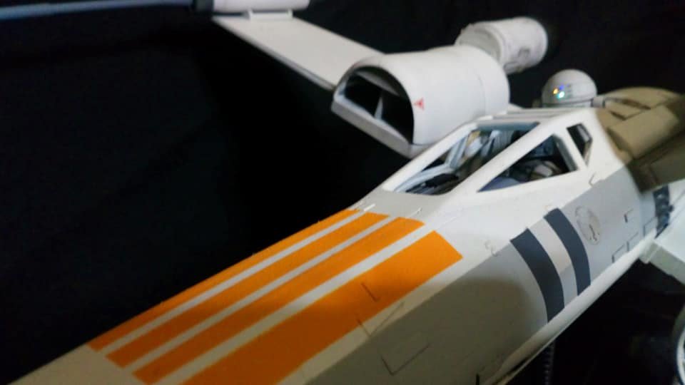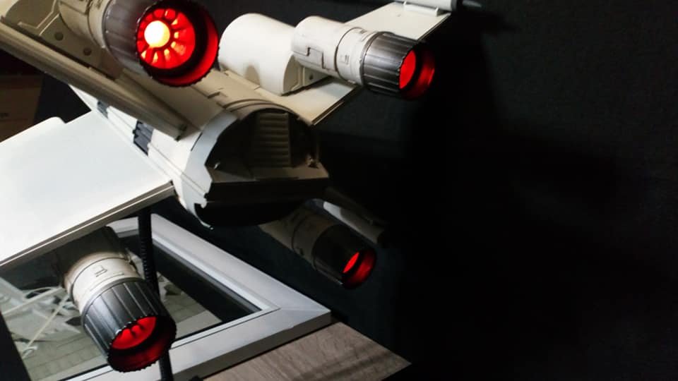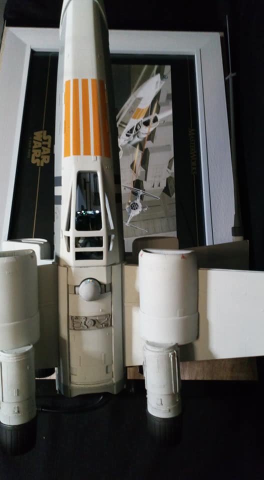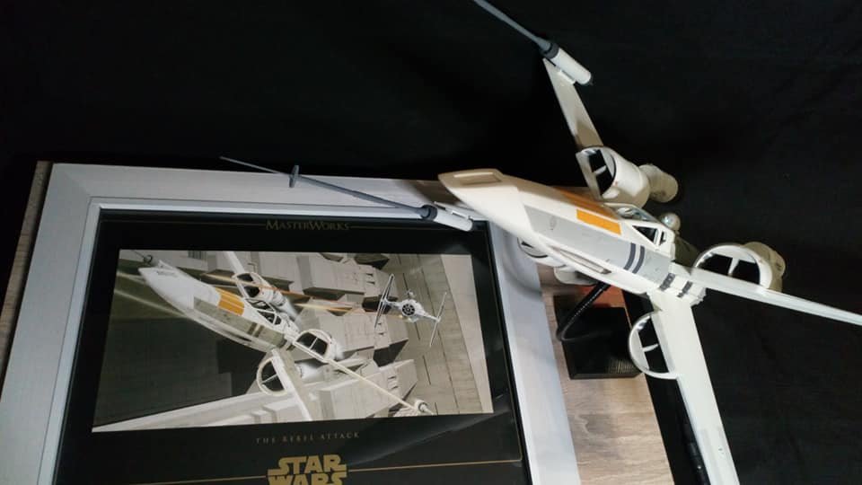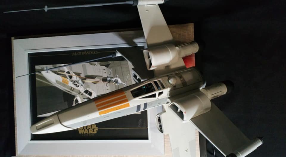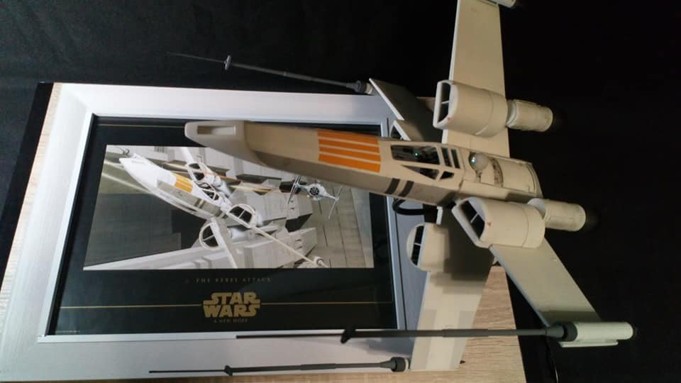 Here is my latest project, made from the Richard Long (REL) patterned Frank Cerney (FM Model Co) kit. The X-WING is Ralph McQuarrie 1/24 SCALE. I added a light-up in the cockpit, along with the droid and thrusters. The kit is supported by a removable foot which allows to put it in different positions above the base. The base is composed of a lithography which is magnetized at the base to allow to expose it like a painting.