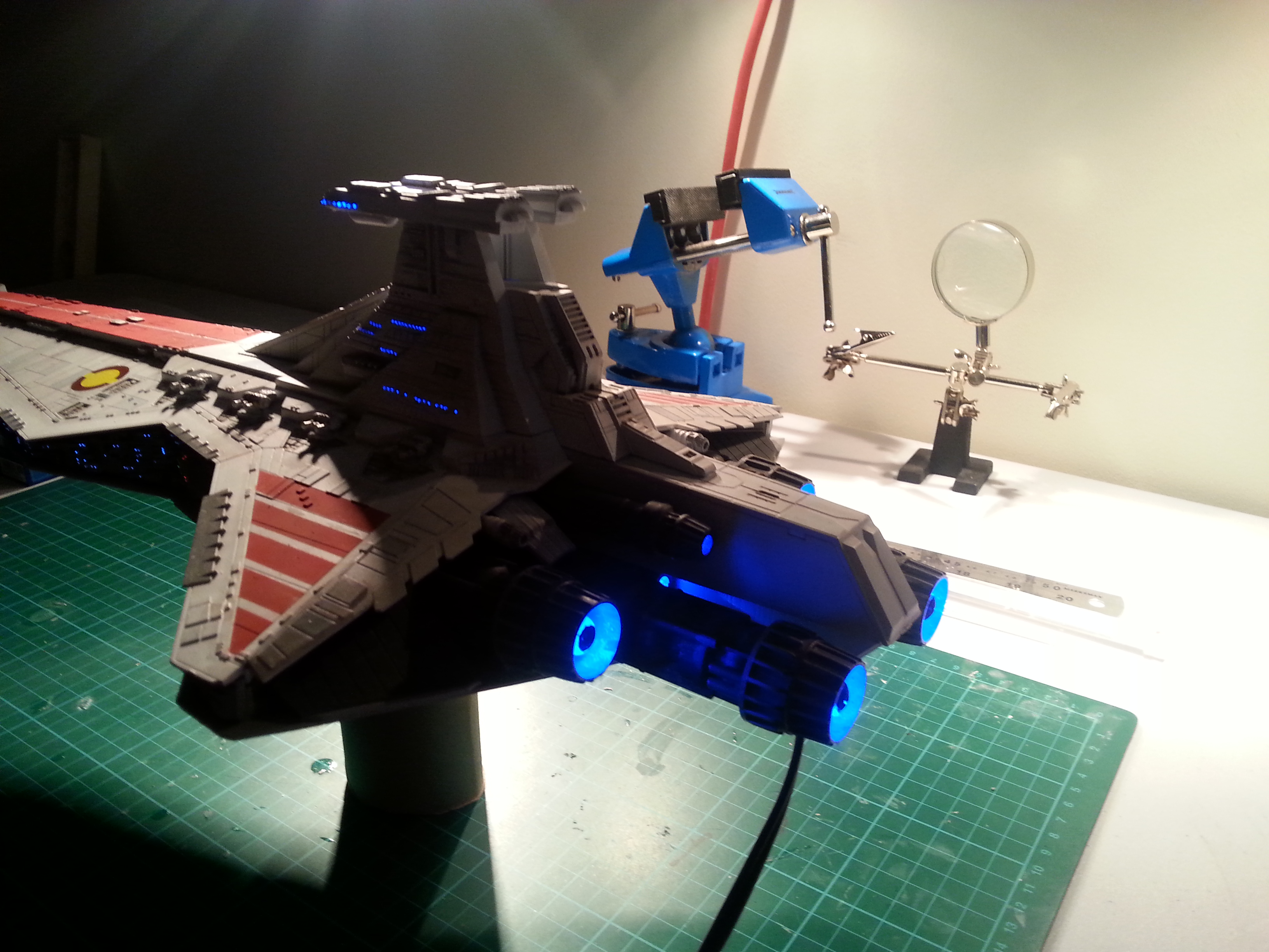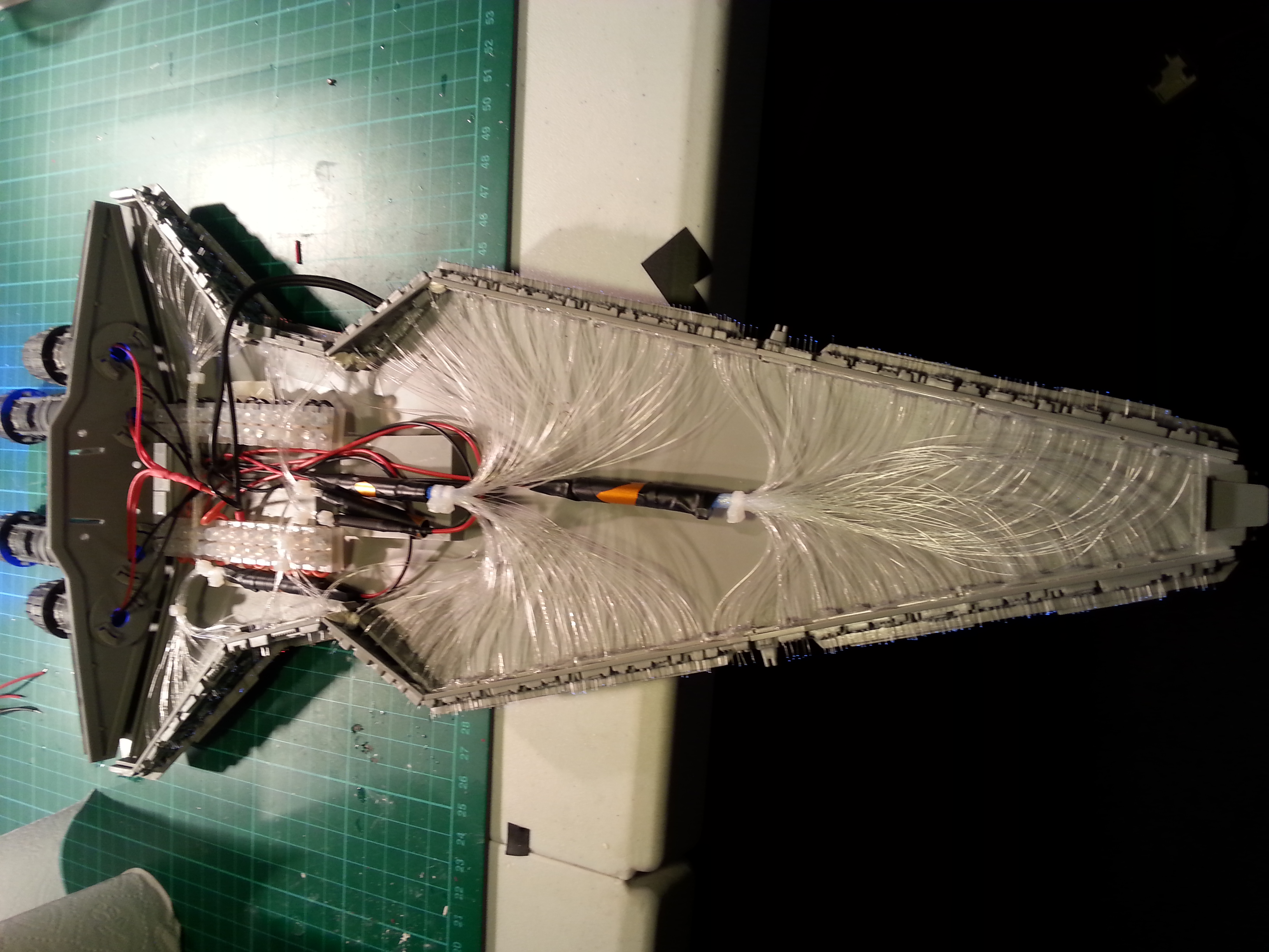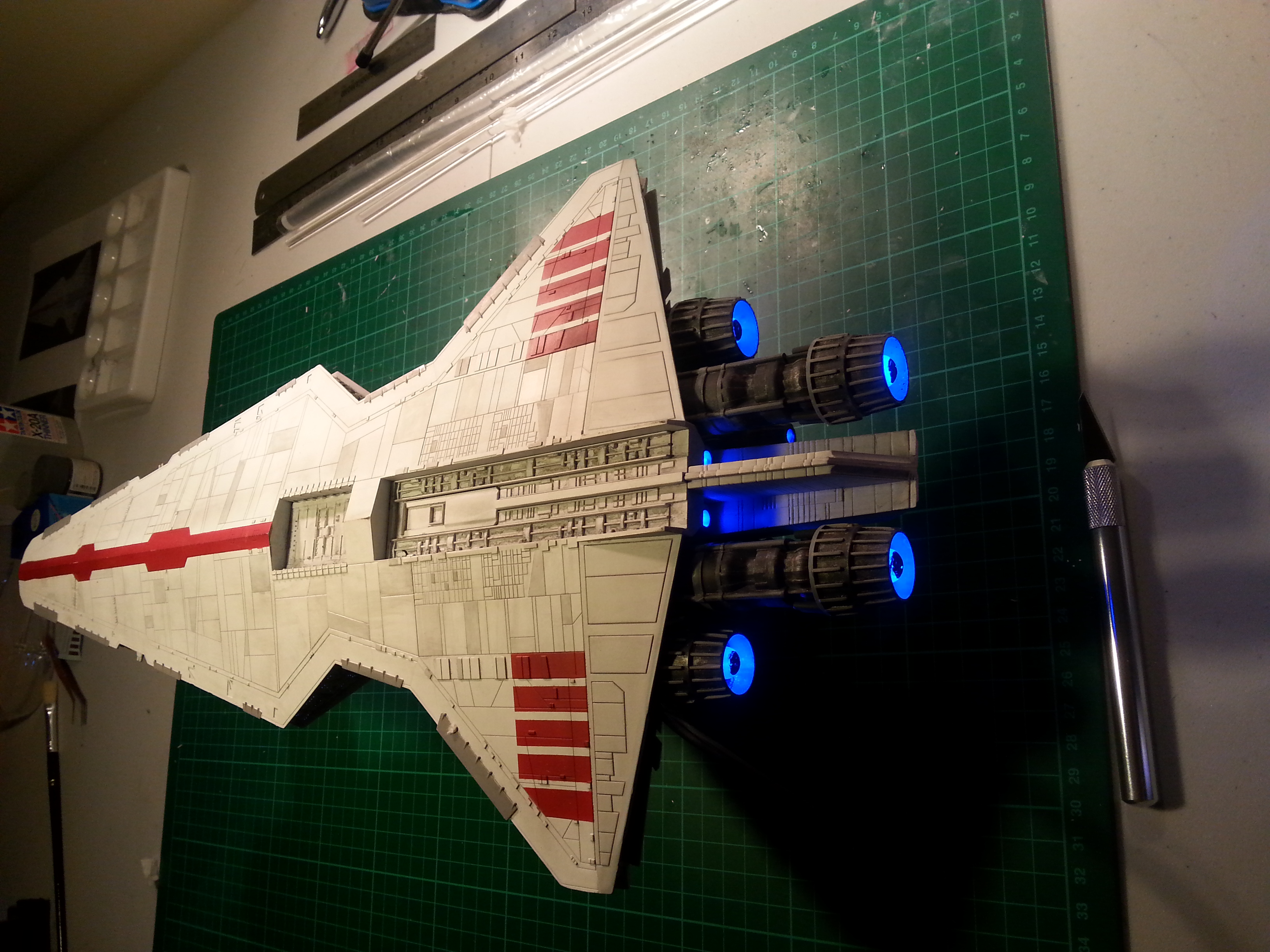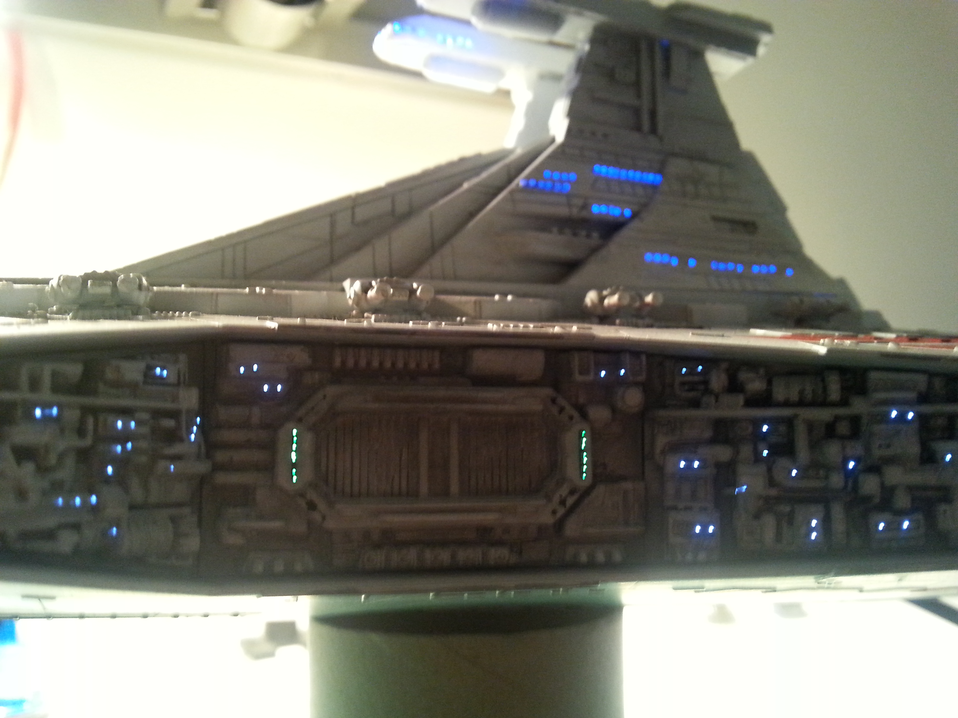 Here is another model I finished a few months ago. Its the standard Revell Republic Star Destroyer model kit fitted out with 0.25mm and 1mm fibre optics. I ignored the transfers that came with the original kit apart from the yellow discs and masked up and spray painted the rest. Weathering and shadowing was created with pastels. Hope everyone enjoys it as much as I do.