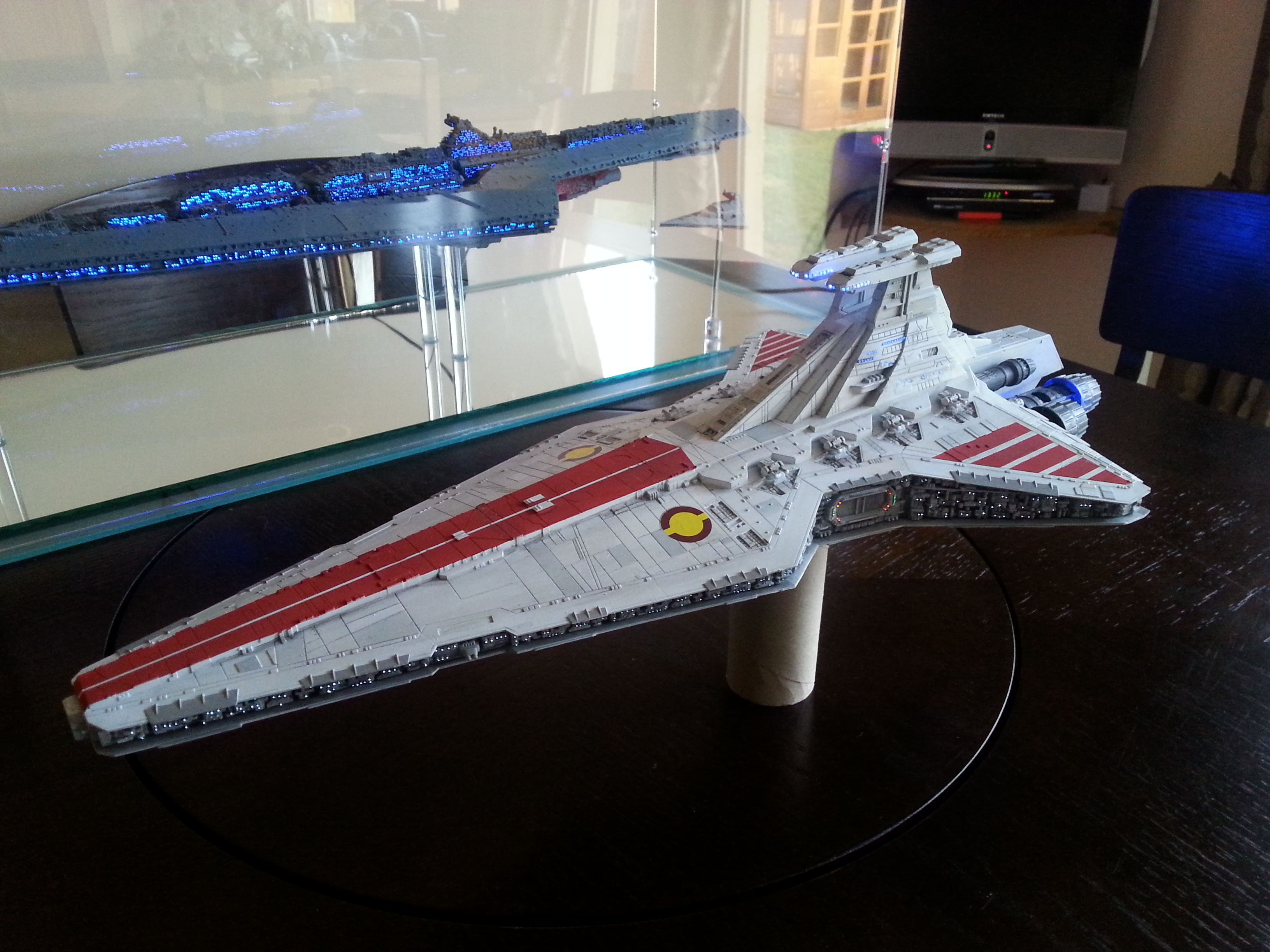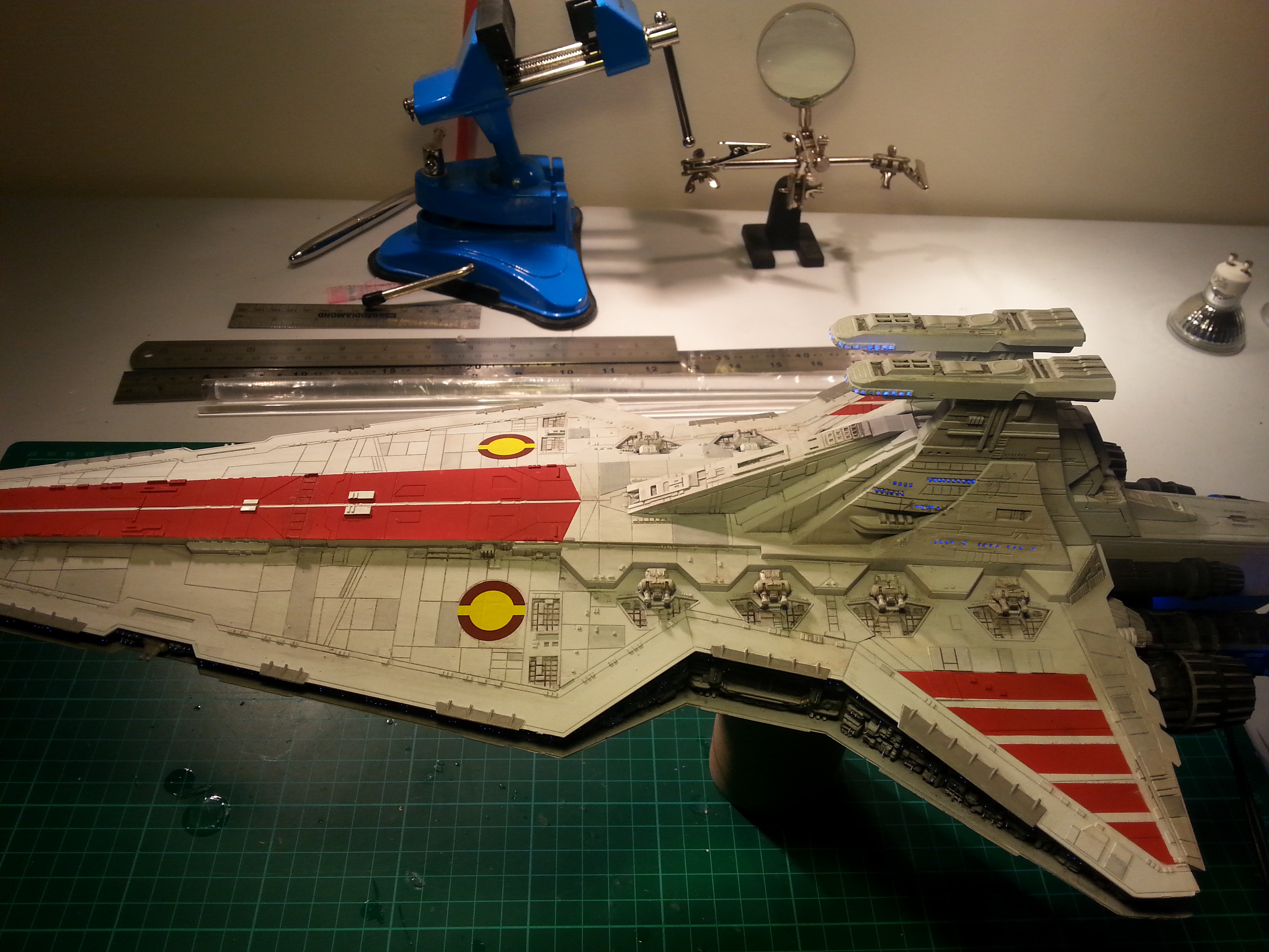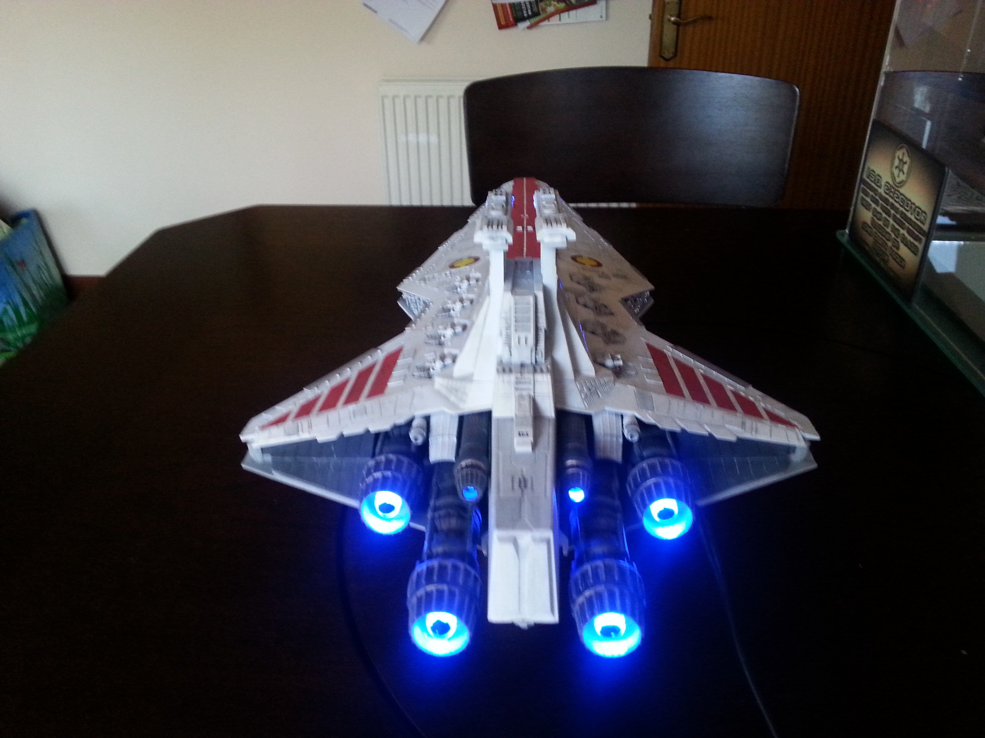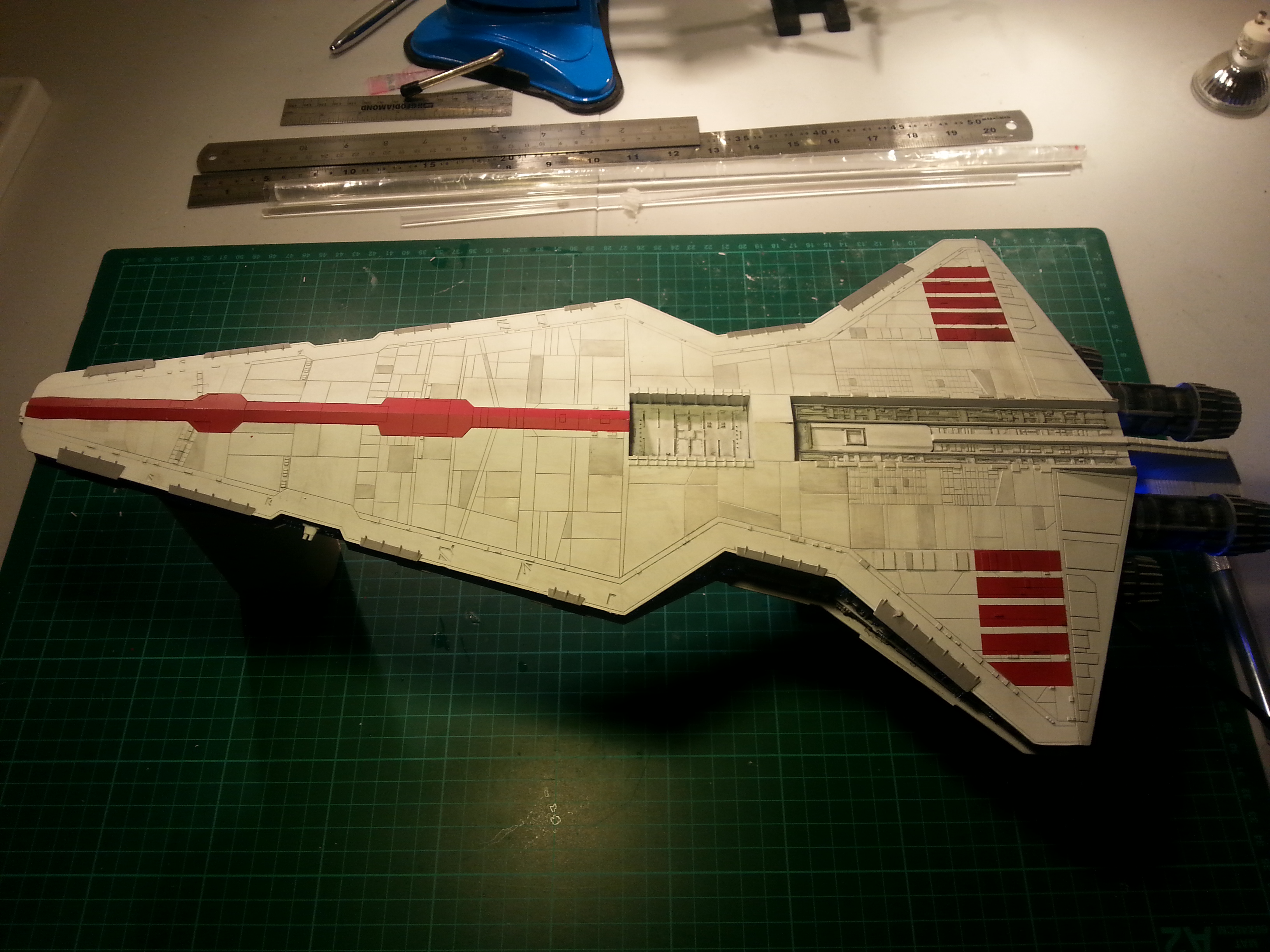 Here is another model I finished a few months ago. Its the standard Revell Republic Star Destroyer model kit fitted out with 0.25mm and 1mm fibre optics. I ignored the transfers that came with the original kit apart from the yellow discs and masked up and spray painted the rest. Weathering and shadowing was created with pastels. Hope everyone enjoys it as much as I do.