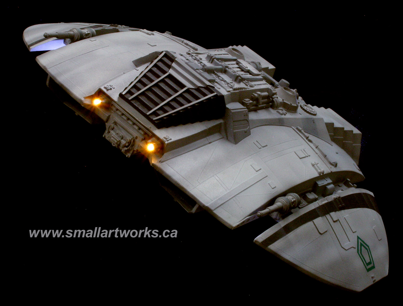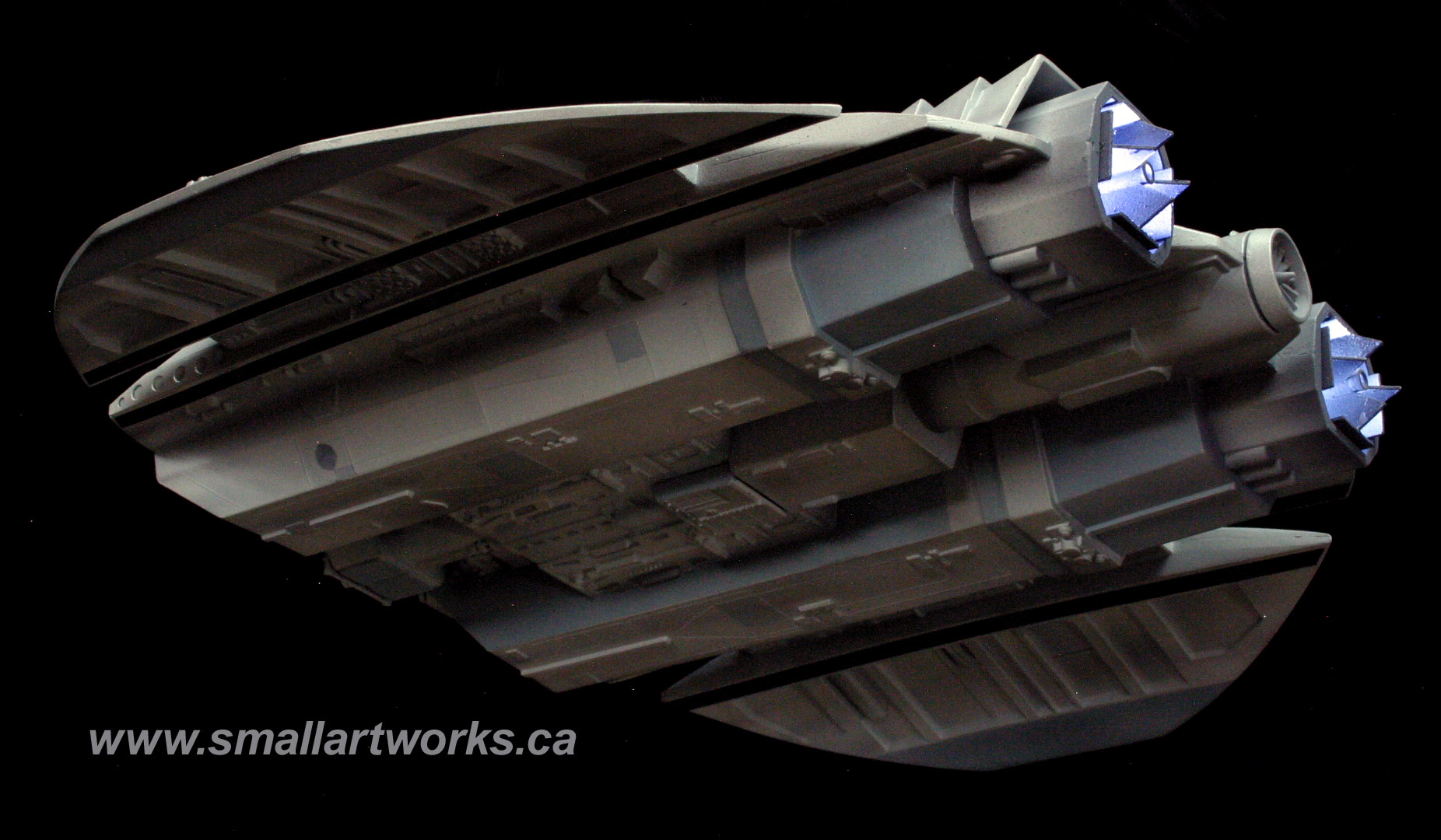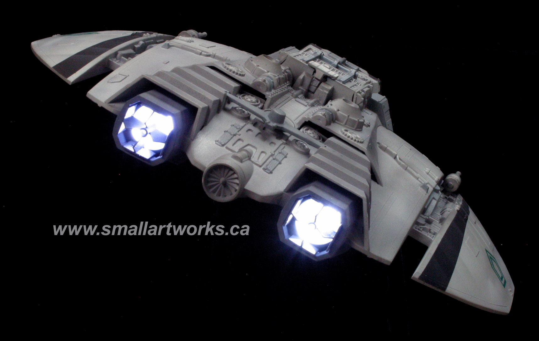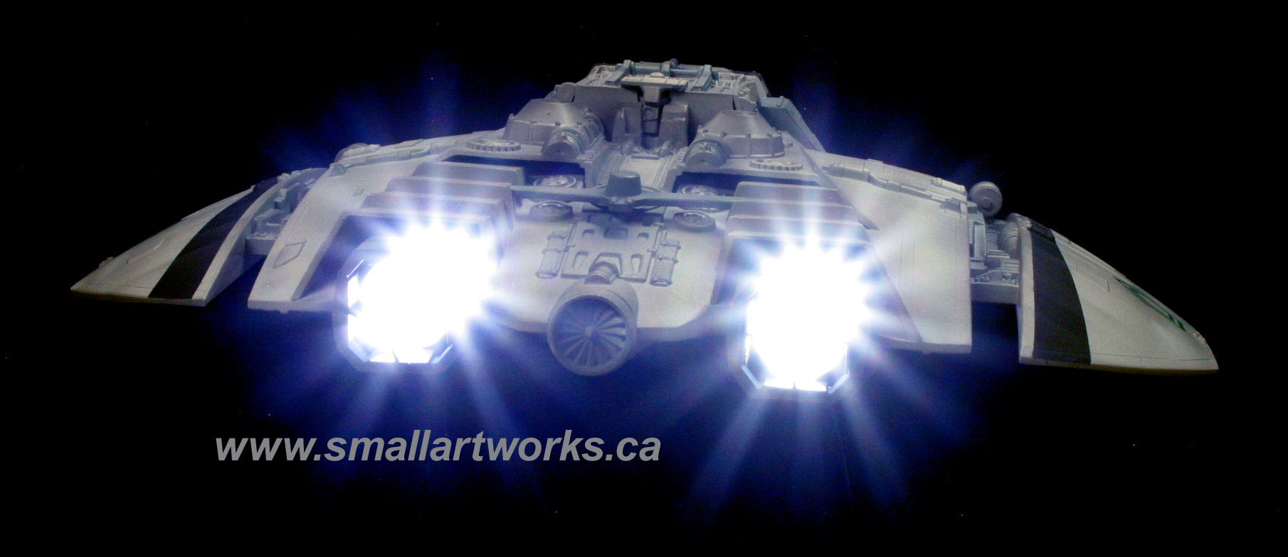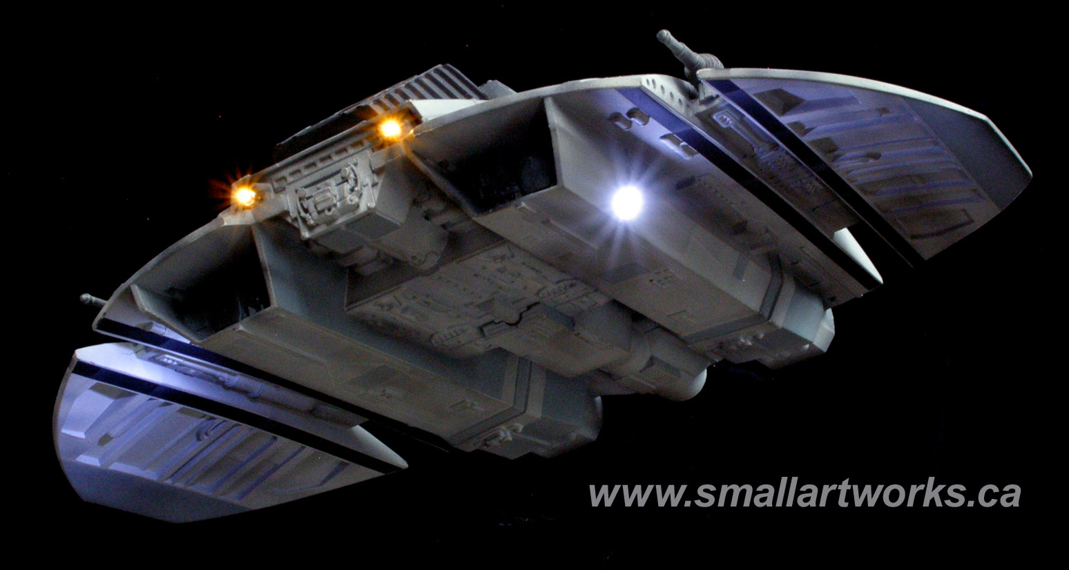 Some of you may question the lights under the wings… Not seen often during the show, so I put them on a separate switch so the other lights could be turned on without them, but yes, those lights ARE THERE on a couple of the original VFX miniatures, and can be seen during the sequence where the Raiders are attacking Caprica as they fly overhead if you watch carefully or freeze frame your DVD in the right spots.