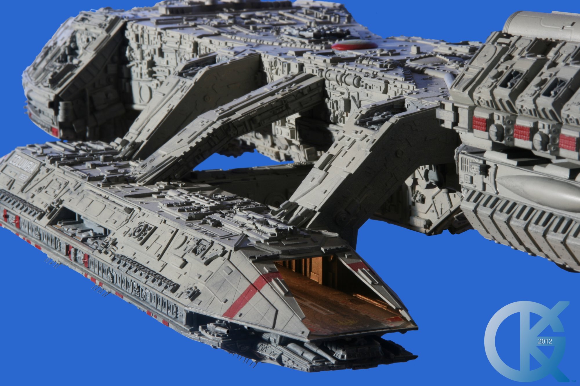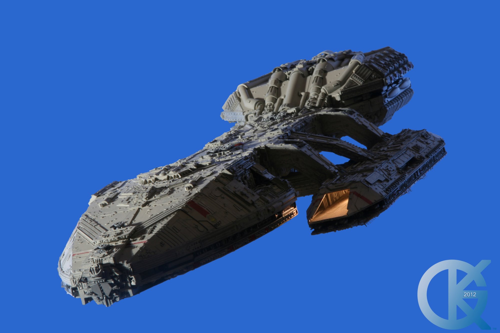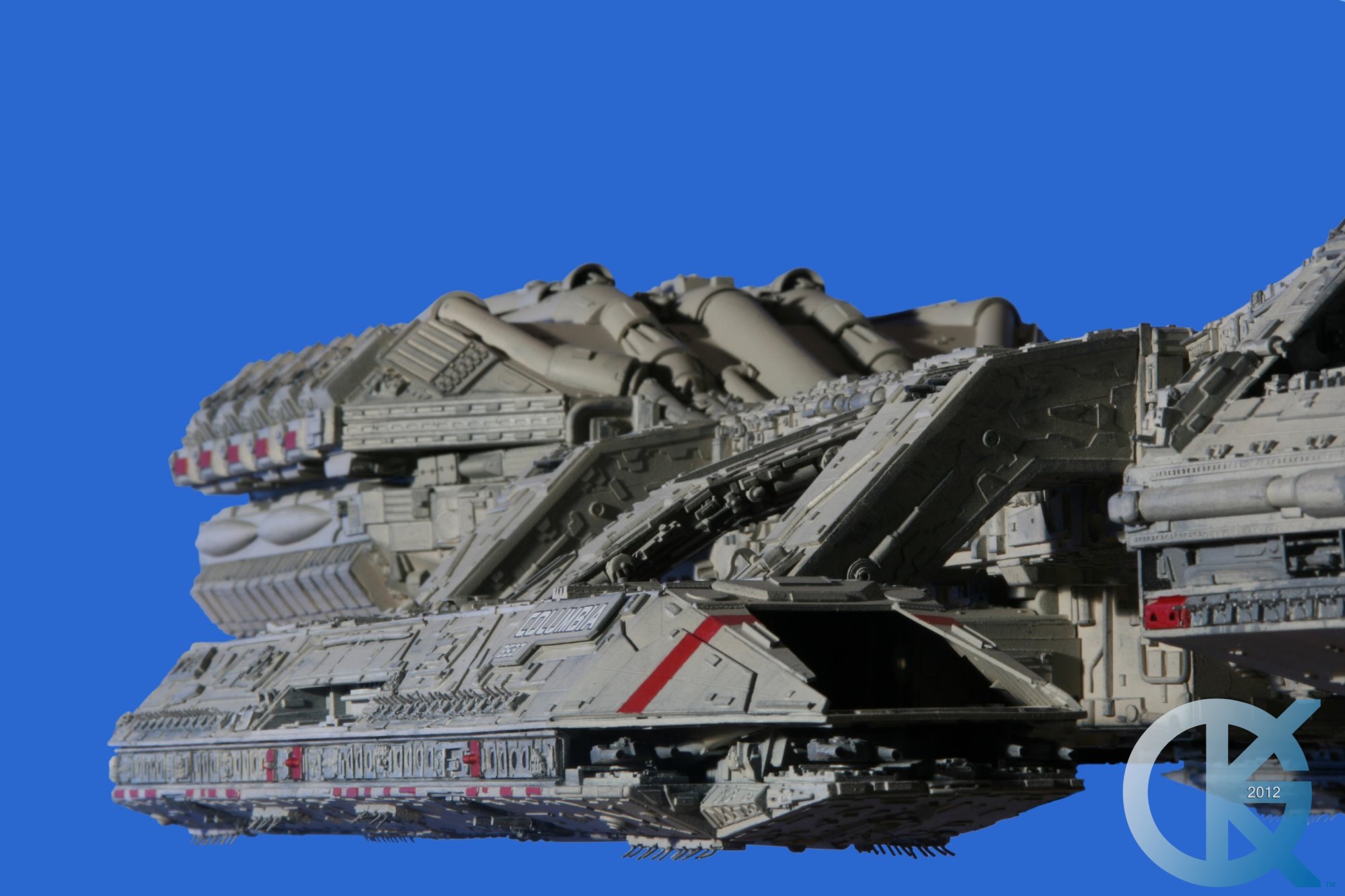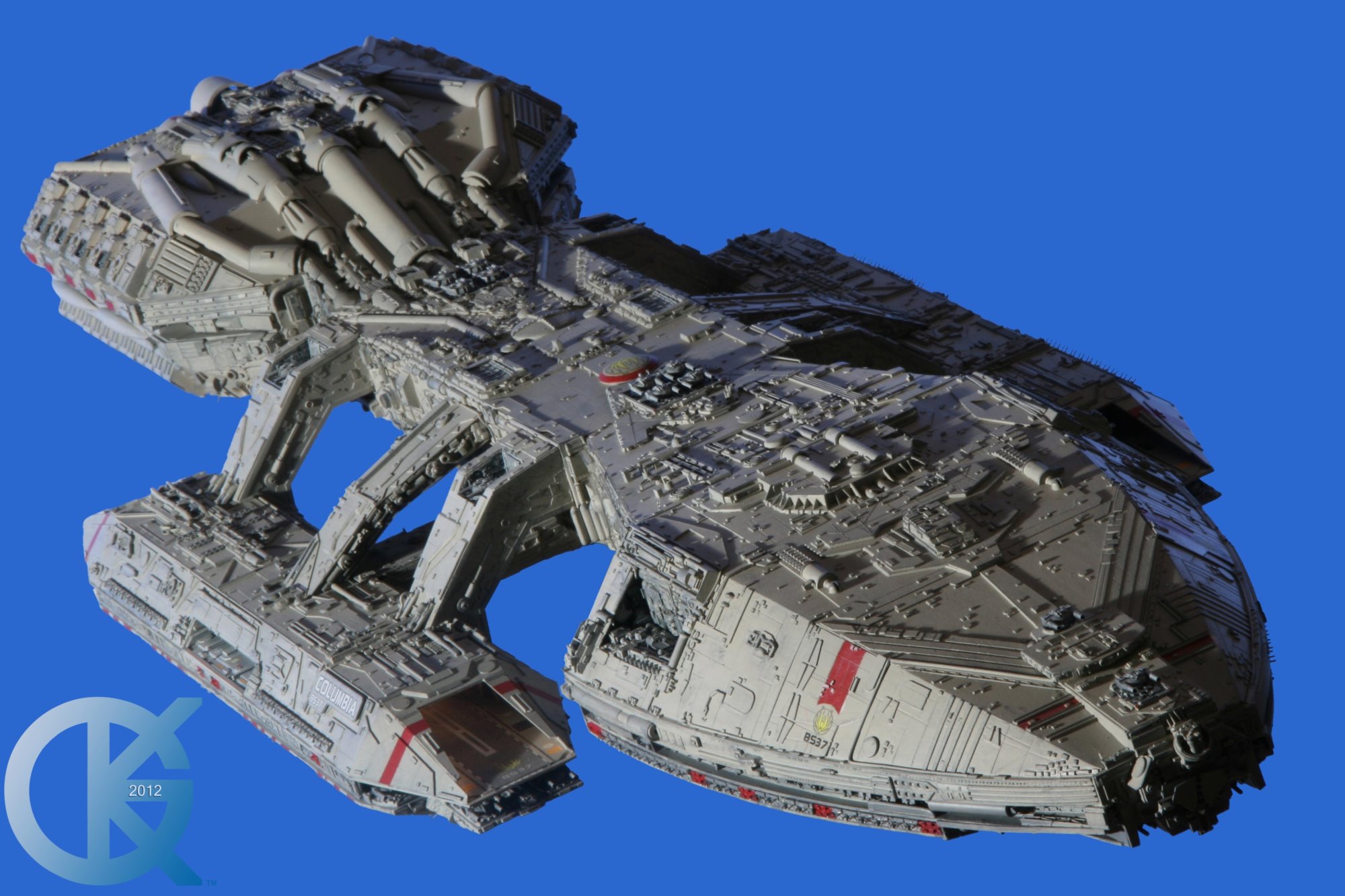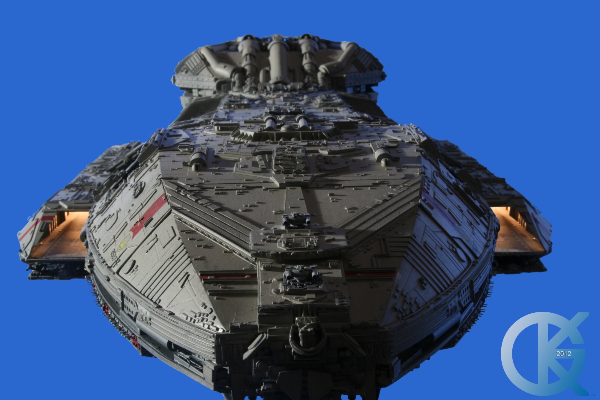 Back in 2011, artist Clifton Simmons contacted me about a 1/2 studio scale Battlestar he was scratch building. It would be a unique Battlestar in it’s modified design to be a mix Eric Chu design from the Ron Moore Series, and the Classic Series, not to mention have some resembling features of Brian Larson’s Re-Imagined Battlestar (SEEN HERE). This designed thrilled me so much, and Clifton created it so well that I had to have it. Clifton then sold it to me and I took these Blue Screen Photos of it that you are viewing today. I love this piece. That stated, I was getting ready to change out the entire collection to be of even larger display pieces, and a friend of mine, Collector Richard Sung, showed great interest in having this great piece in his own Collection. This piece resides in that Collection even today. Truth be told, I wish I had it back! LOL. Ahh.. well…It remains in good hands.