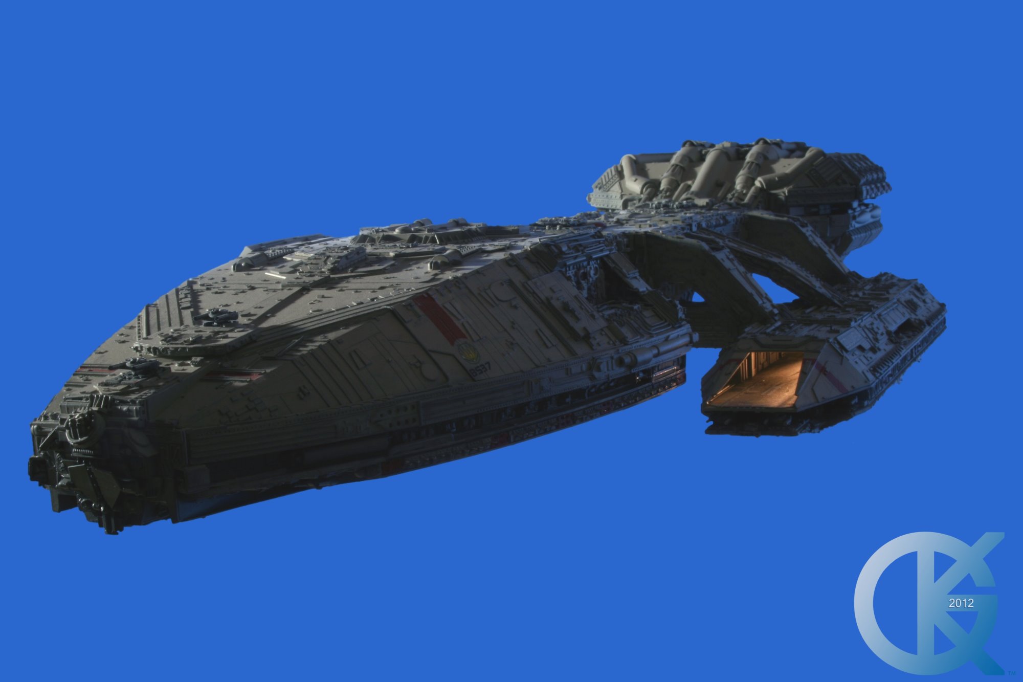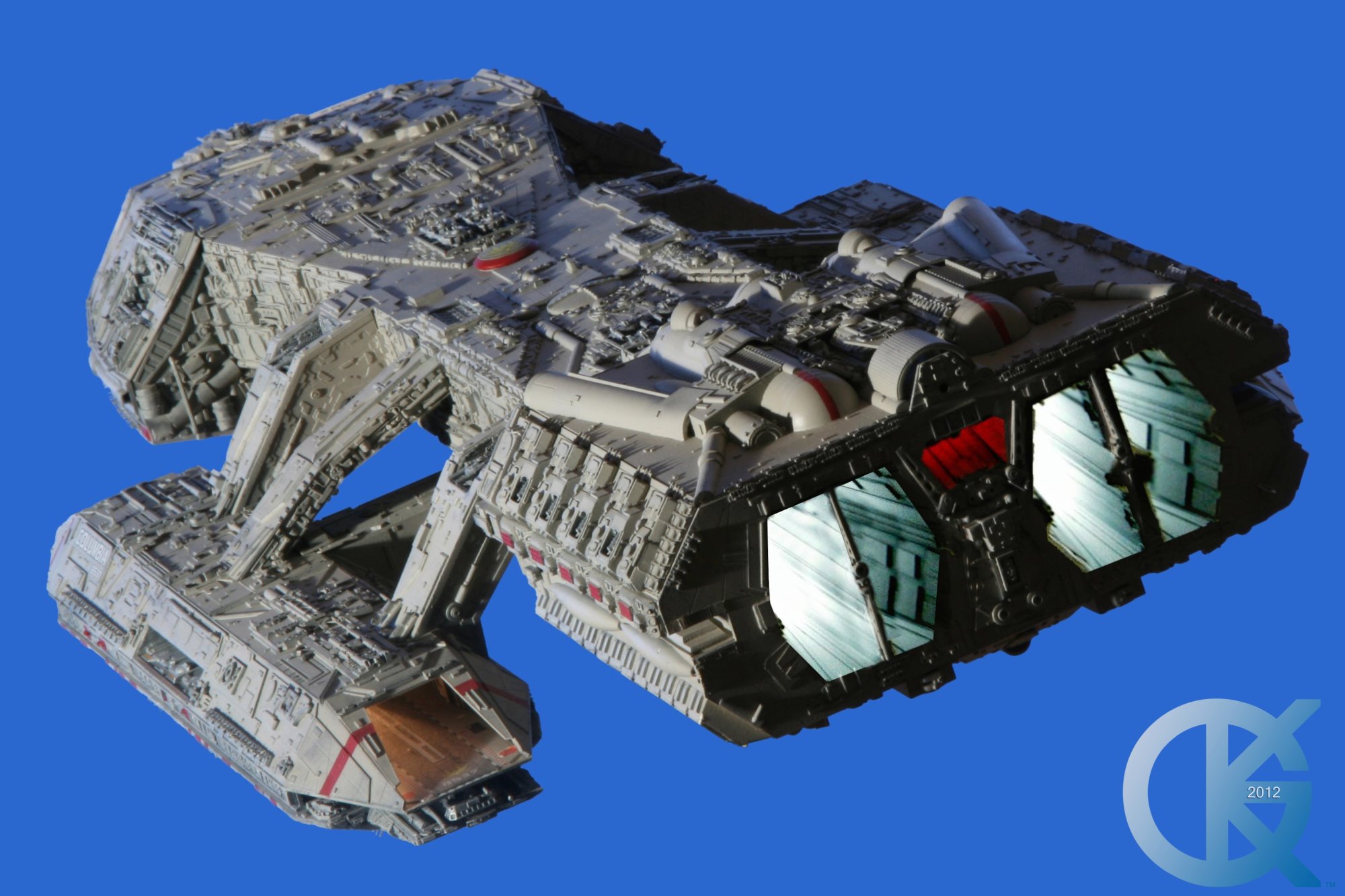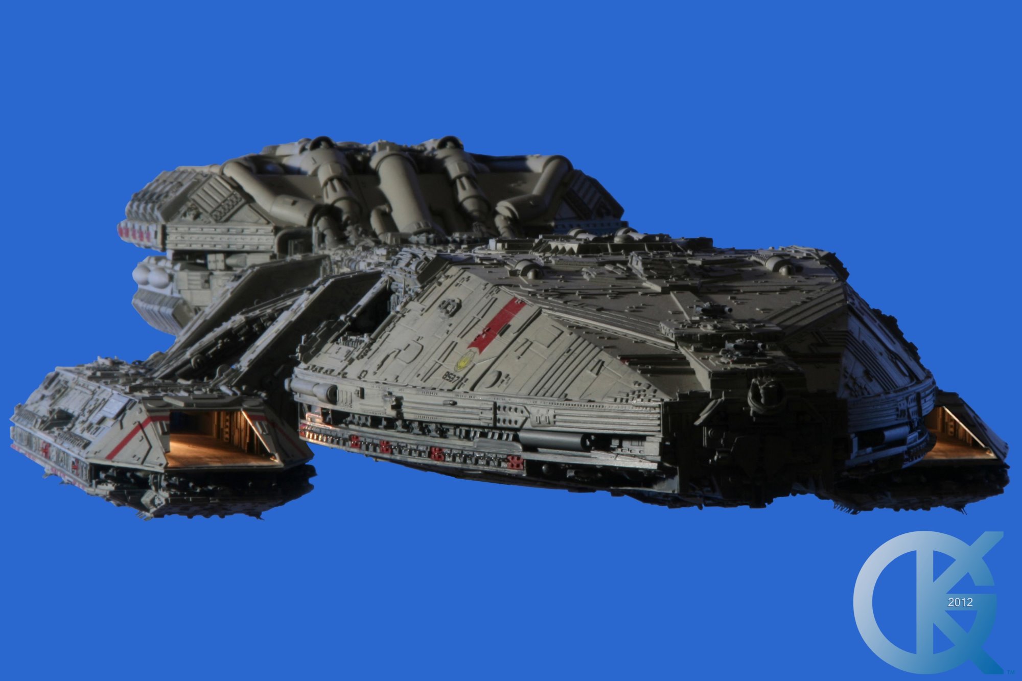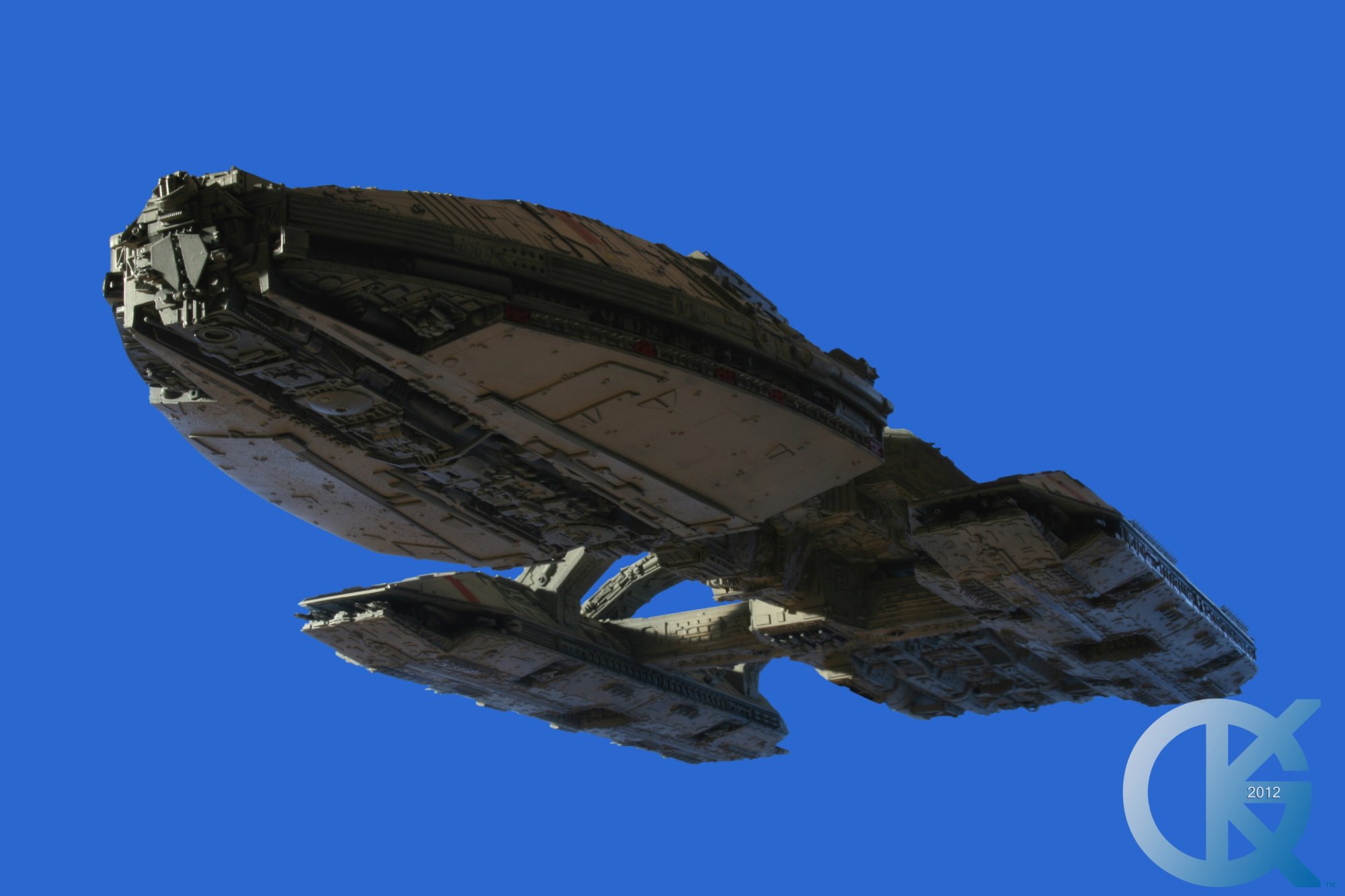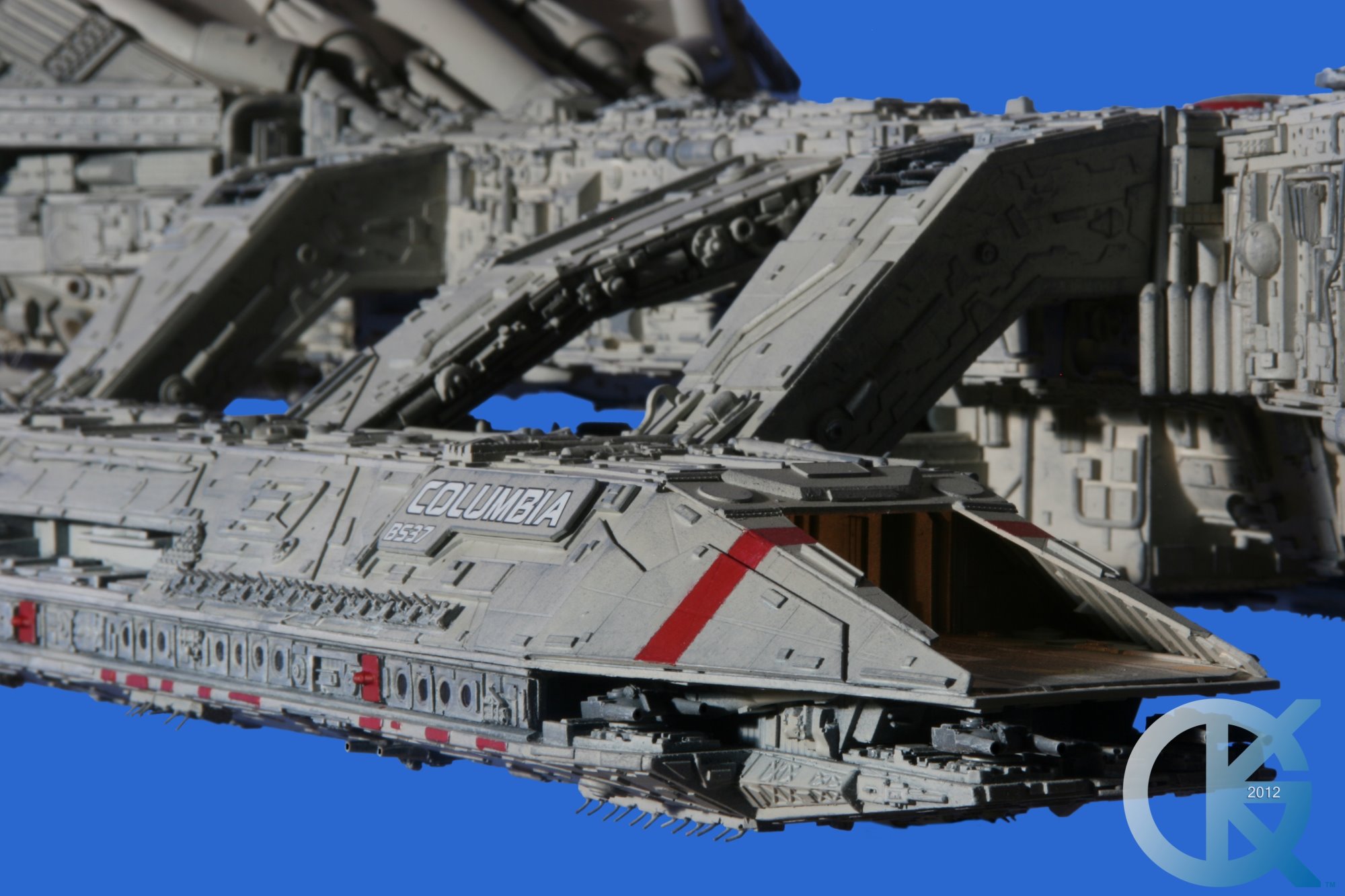 Back in 2011, artist Clifton Simmons contacted me about a 1/2 studio scale Battlestar he was scratch building. It would be a unique Battlestar in it’s modified design to be a mix Eric Chu design from the Ron Moore Series, and the Classic Series, not to mention have some resembling features of Brian Larson’s Re-Imagined Battlestar (SEEN HERE). This designed thrilled me so much, and Clifton created it so well that I had to have it. Clifton then sold it to me and I took these Blue Screen Photos of it that you are viewing today. I love this piece. That stated, I was getting ready to change out the entire collection to be of even larger display pieces, and a friend of mine, Collector Richard Sung, showed great interest in having this great piece in his own Collection. This piece resides in that Collection even today. Truth be told, I wish I had it back! LOL. Ahh.. well…It remains in good hands.