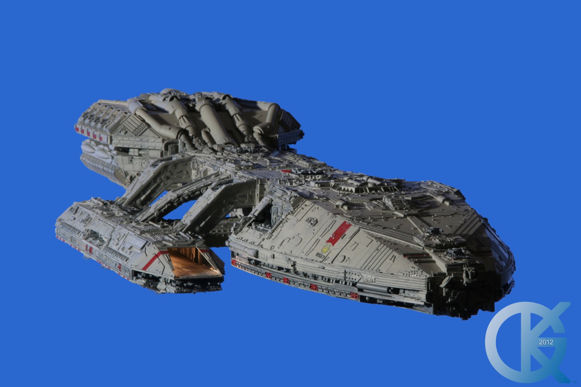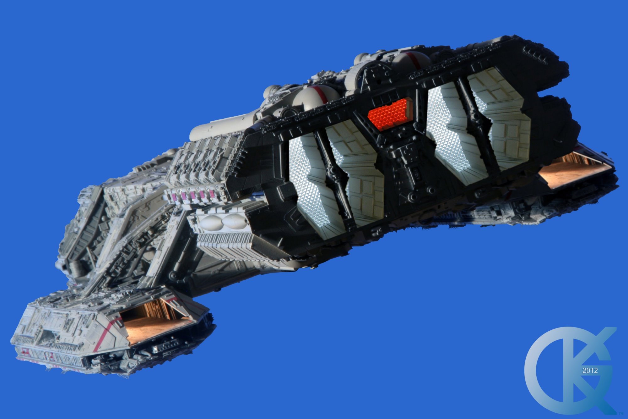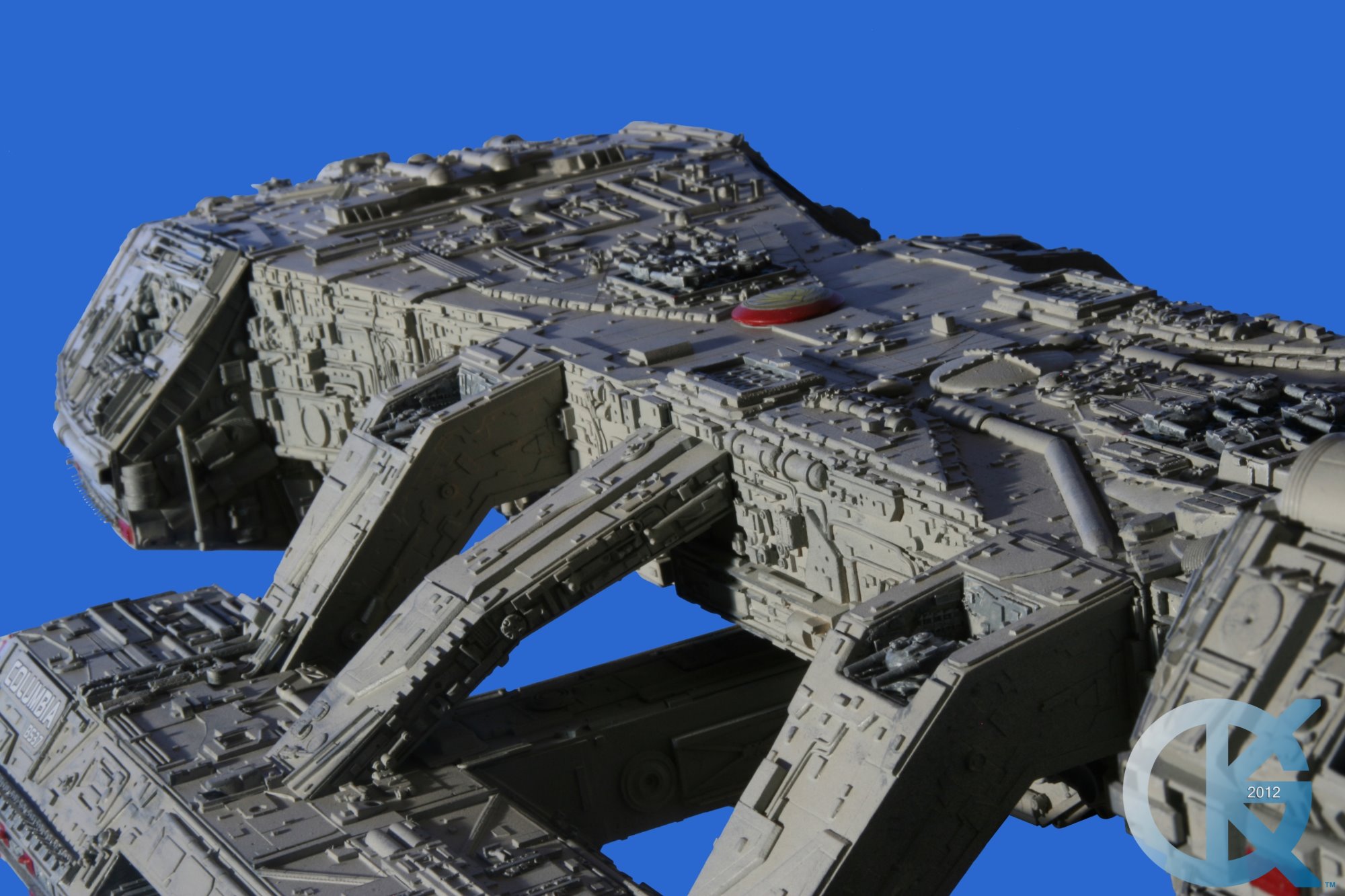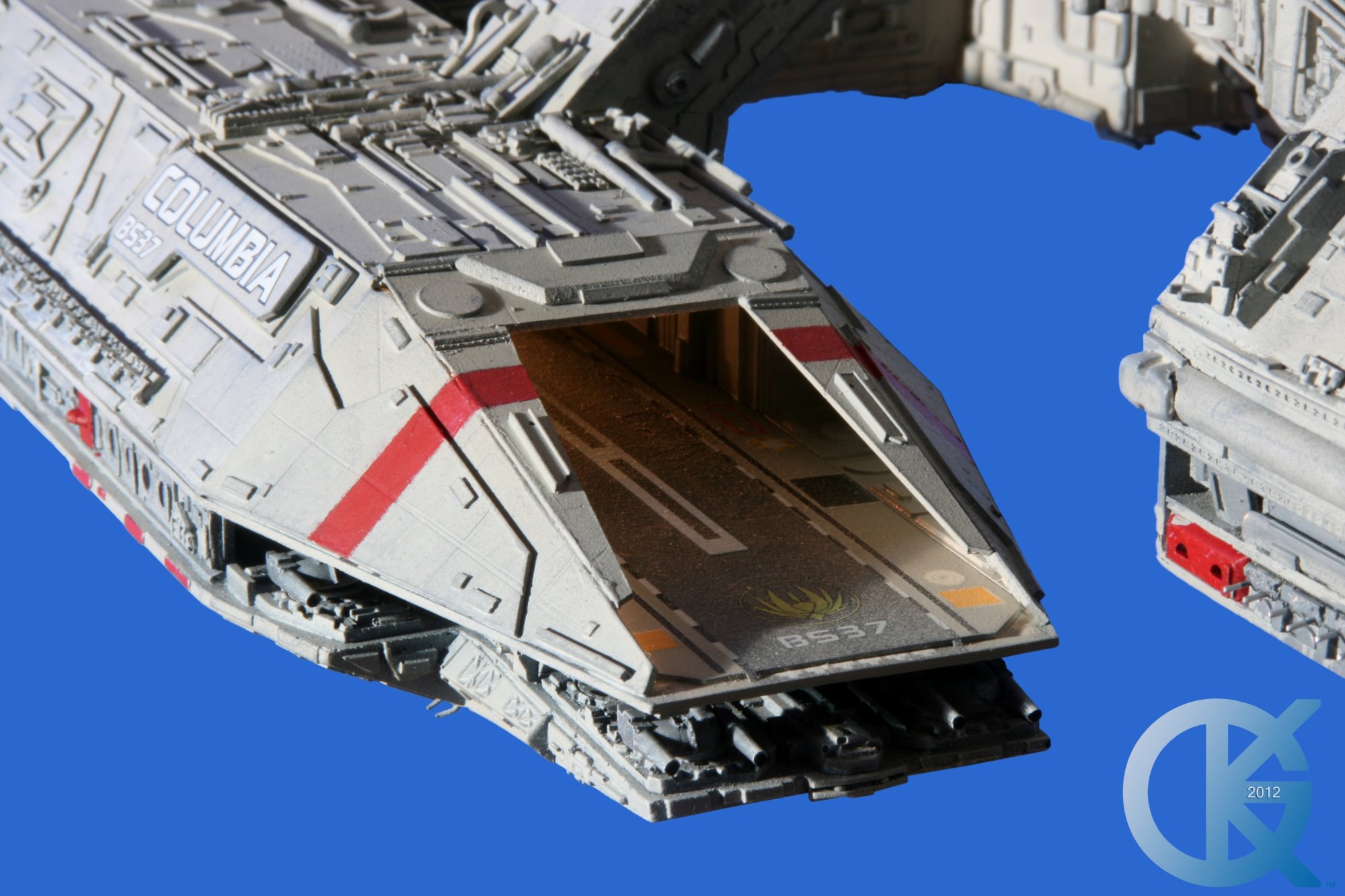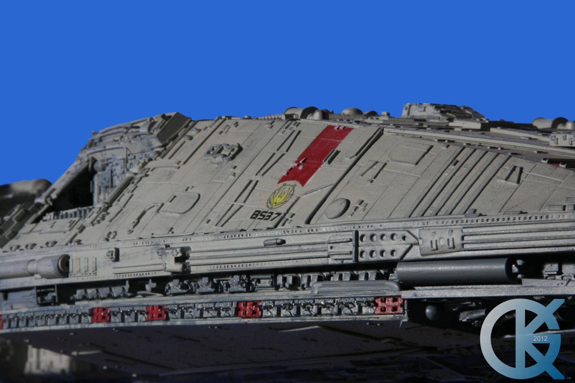 Back in 2011, artist Clifton Simmons contacted me about a 1/2 studio scale Battlestar he was scratch building. It would be a unique Battlestar in it’s modified design to be a mix Eric Chu design from the Ron Moore Series, and the Classic Series, not to mention have some resembling features of Brian Larson’s Re-Imagined Battlestar (SEEN HERE). This designed thrilled me so much, and Clifton created it so well that I had to have it. Clifton then sold it to me and I took these Blue Screen Photos of it that you are viewing today. I love this piece. That stated, I was getting ready to change out the entire collection to be of even larger display pieces, and a friend of mine, Collector Richard Sung, showed great interest in having this great piece in his own Collection. This piece resides in that Collection even today. Truth be told, I wish I had it back! LOL. Ahh.. well…It remains in good hands.