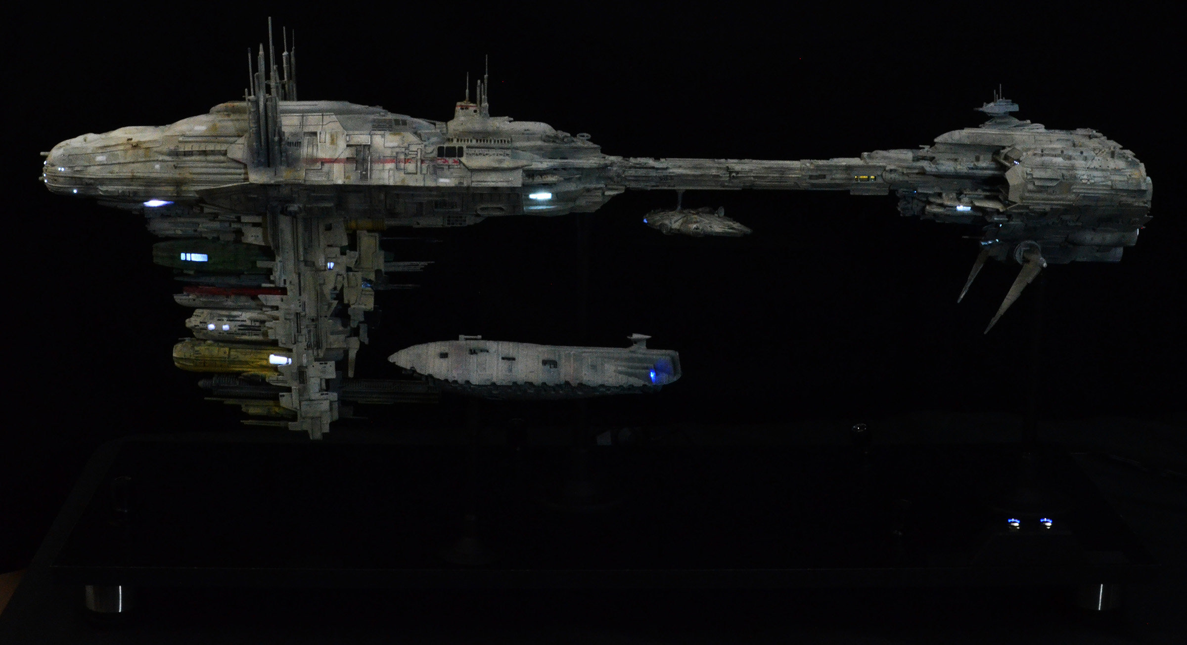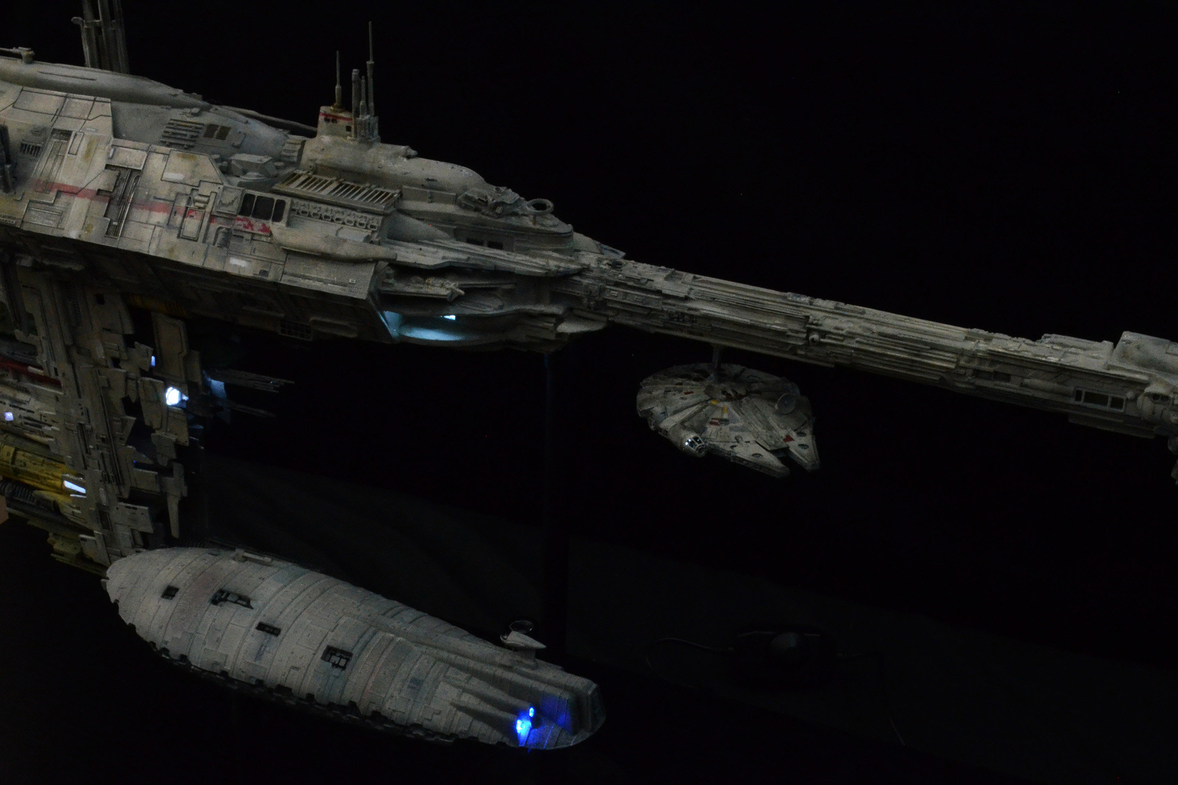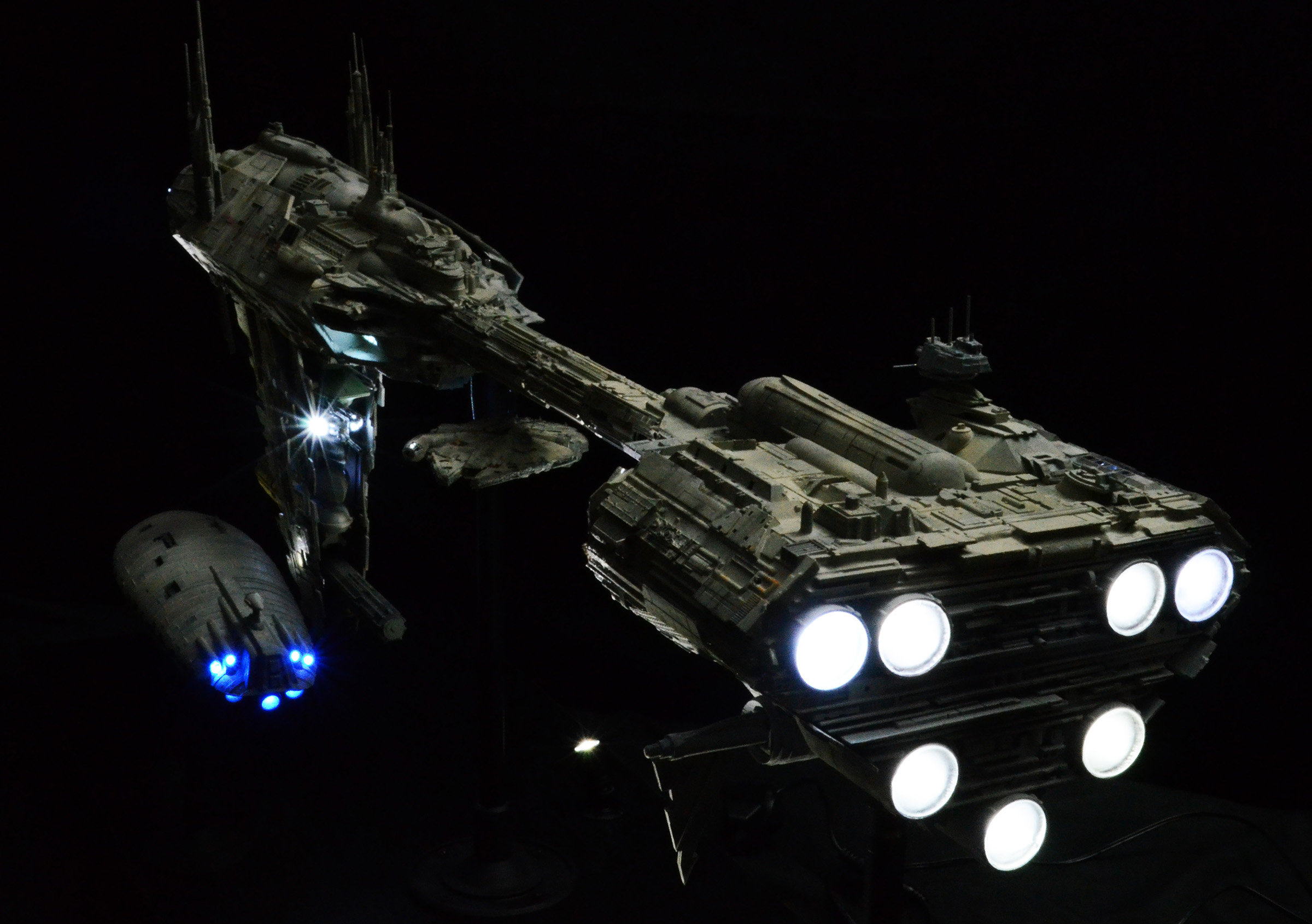 I recently completed a 1/350 scale JPG Productions Nebulon-B Medical Frigate build. This is not for sale as it is already promised to a client I built it for. The Rebel Transport is a modified version from an old MPC kit for the “Rebel Base” kit from the 80s.