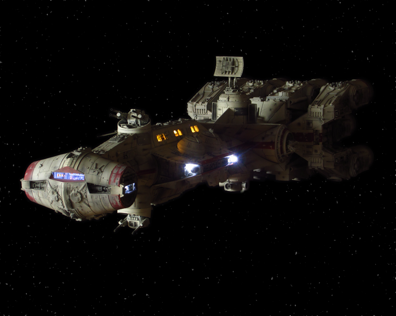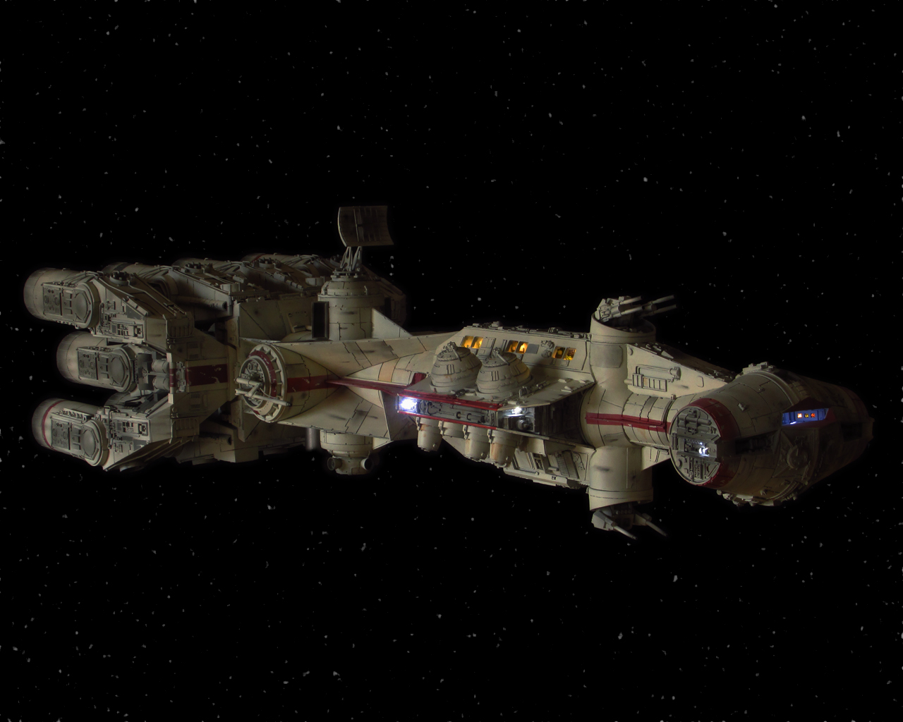 I had the great pleasure to build the Chris Kelly Blockade Runner for an Client and finally it is done. There are more than 275 LEDs to light the engines up. These are seperated to an inner ring (Yellow) and an outer ring (Orange). Every engine has it’s own Random Thruster Effect. I built an interior for every window with chairs, beds, wall pictures and wood, and I spent extra time in building the details and displays for the cockpit. Every fragile part is connected with magnets. On one side of the ship there is another Docking Port hidden behind an magnetic gun for mounting the model on a wall or something.