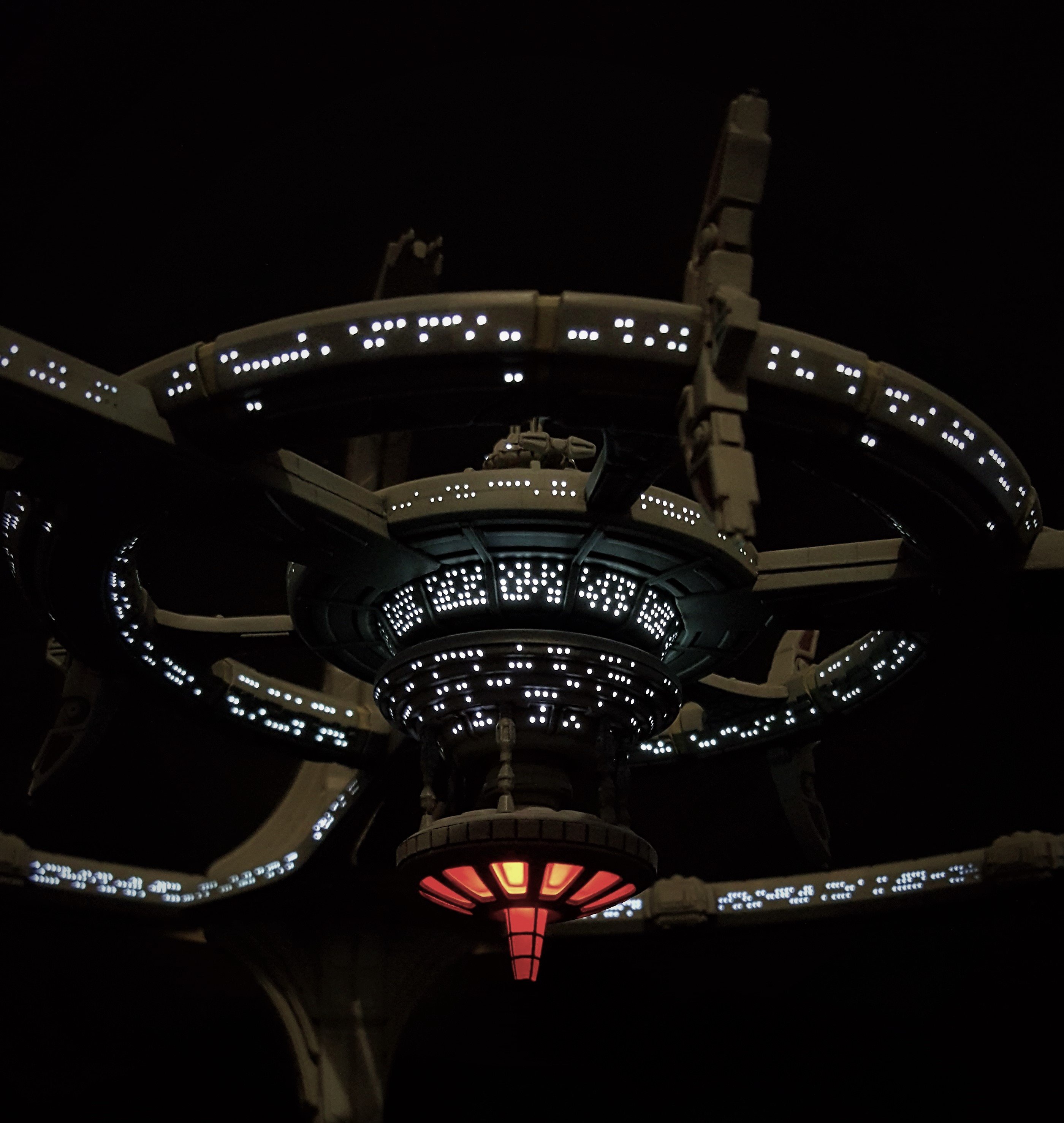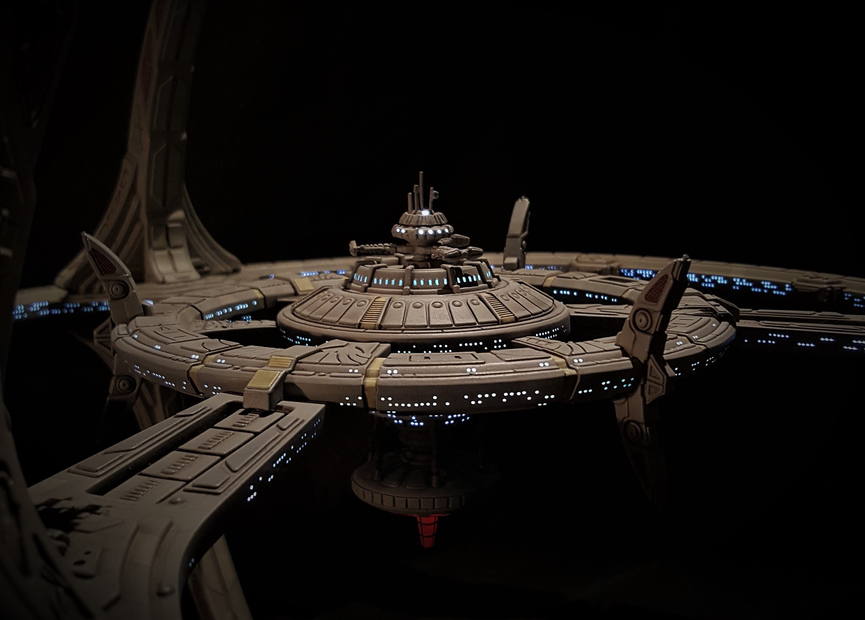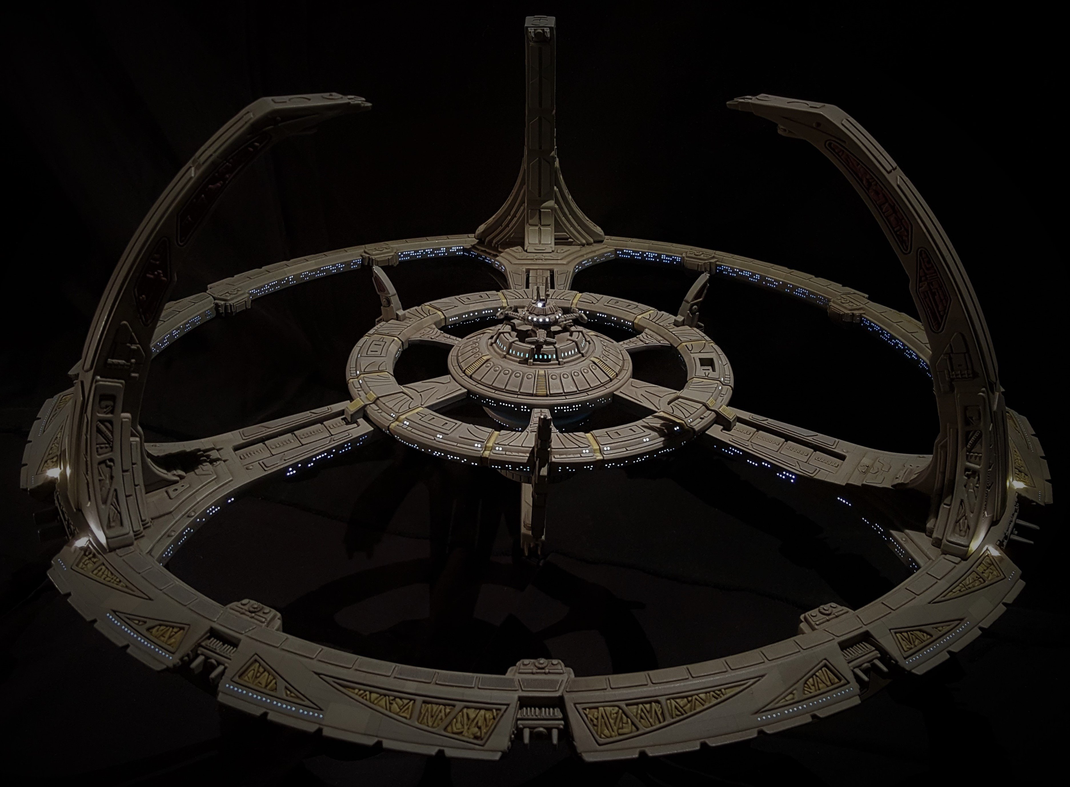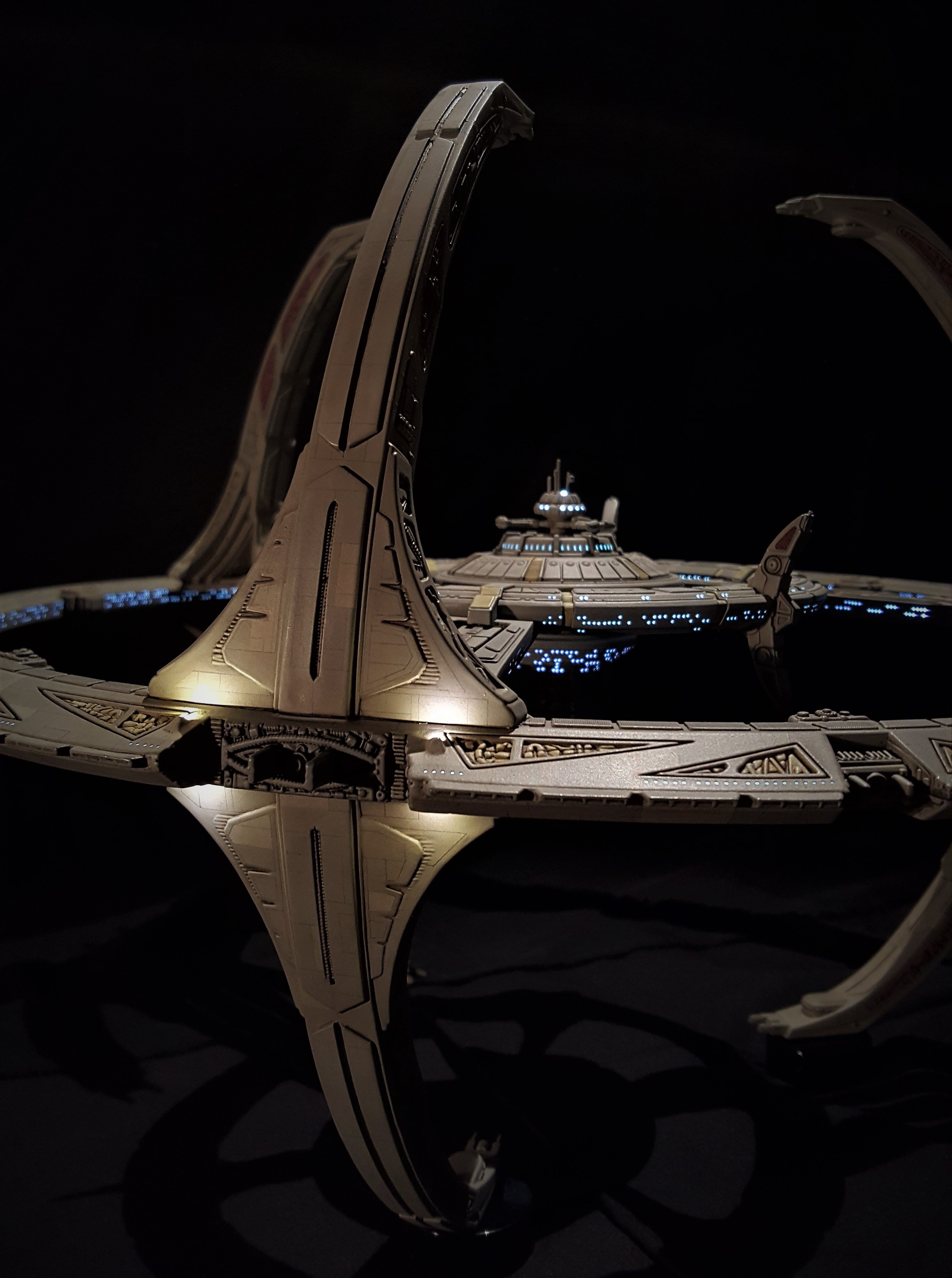 I was commissioned by a collector in Germany to build a new Deep Space Nine space station model to replace the current one being displayed in his private Star Trek museum. This new version was to be fully lighted, including flood lighting on the docking pylons, lit cabin windows, flashing anti-collision markers and a pulsating reactor core.