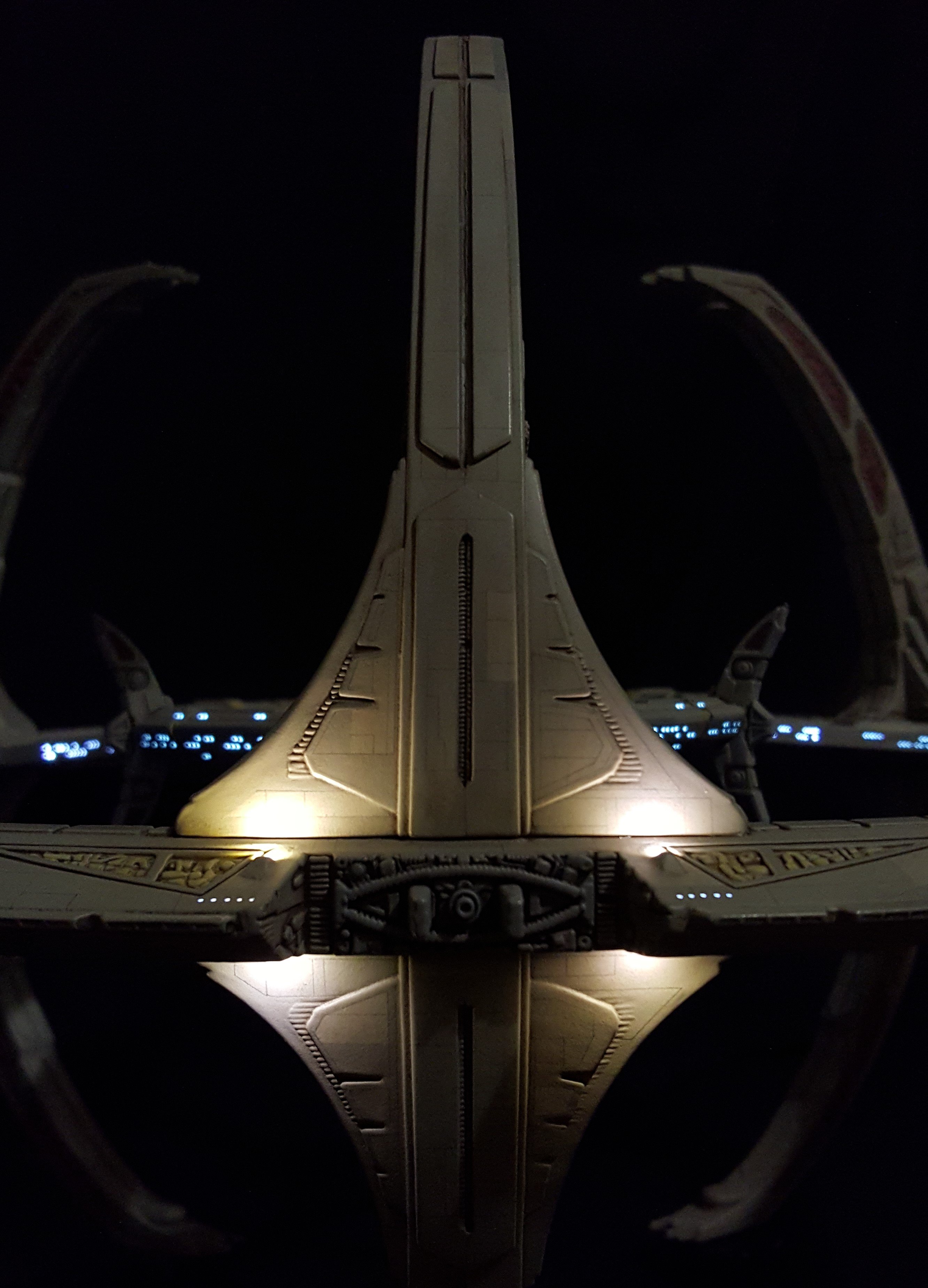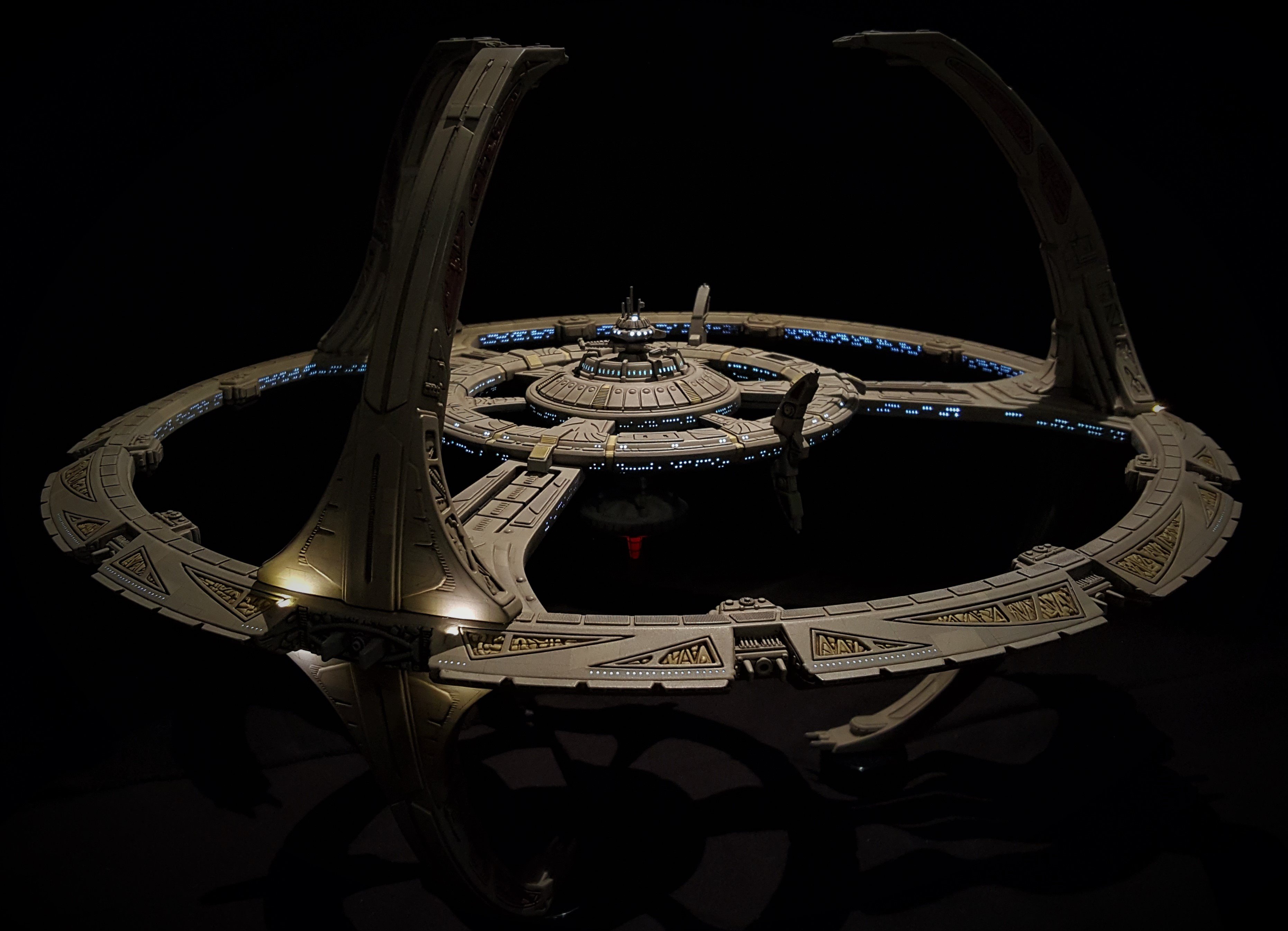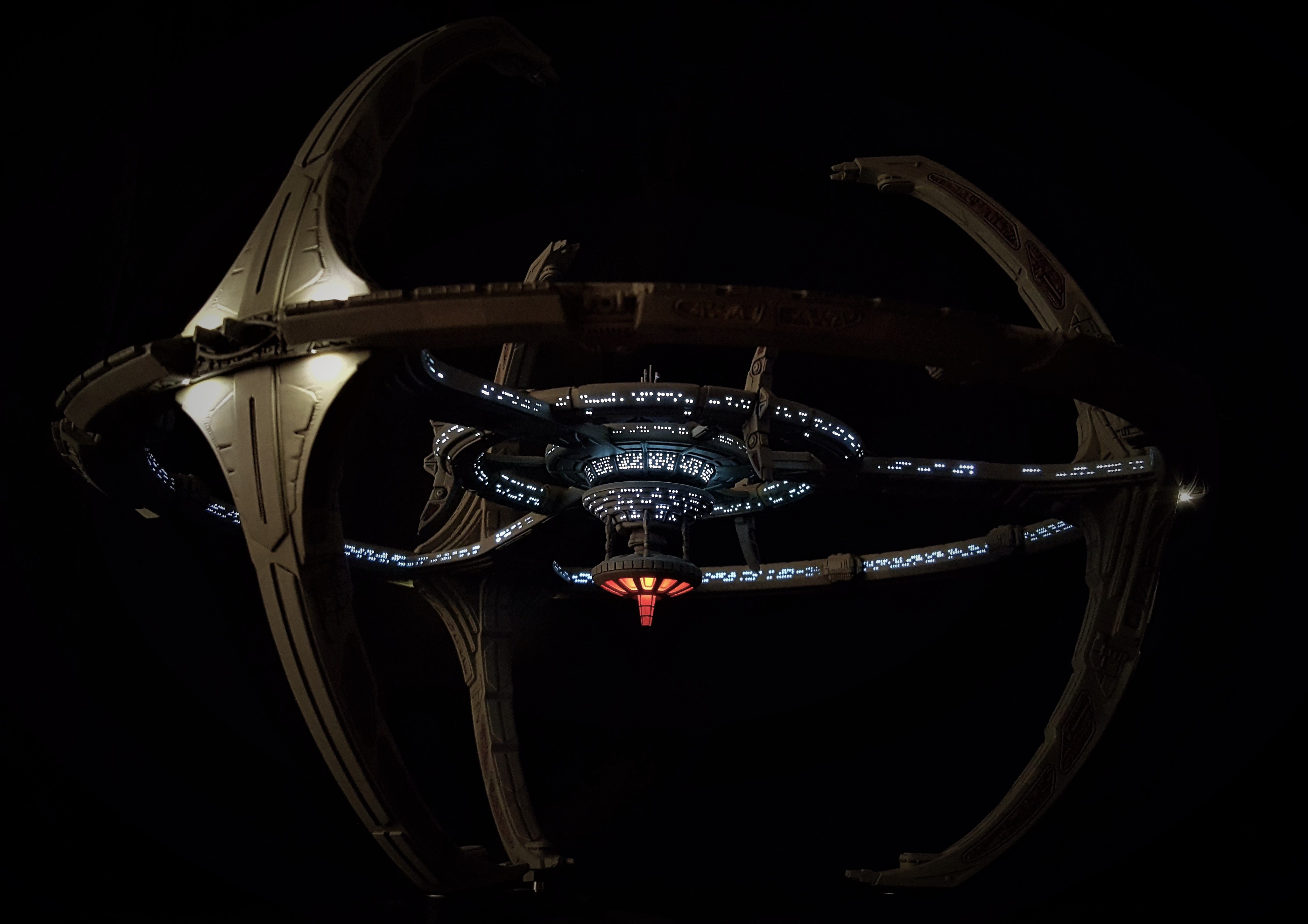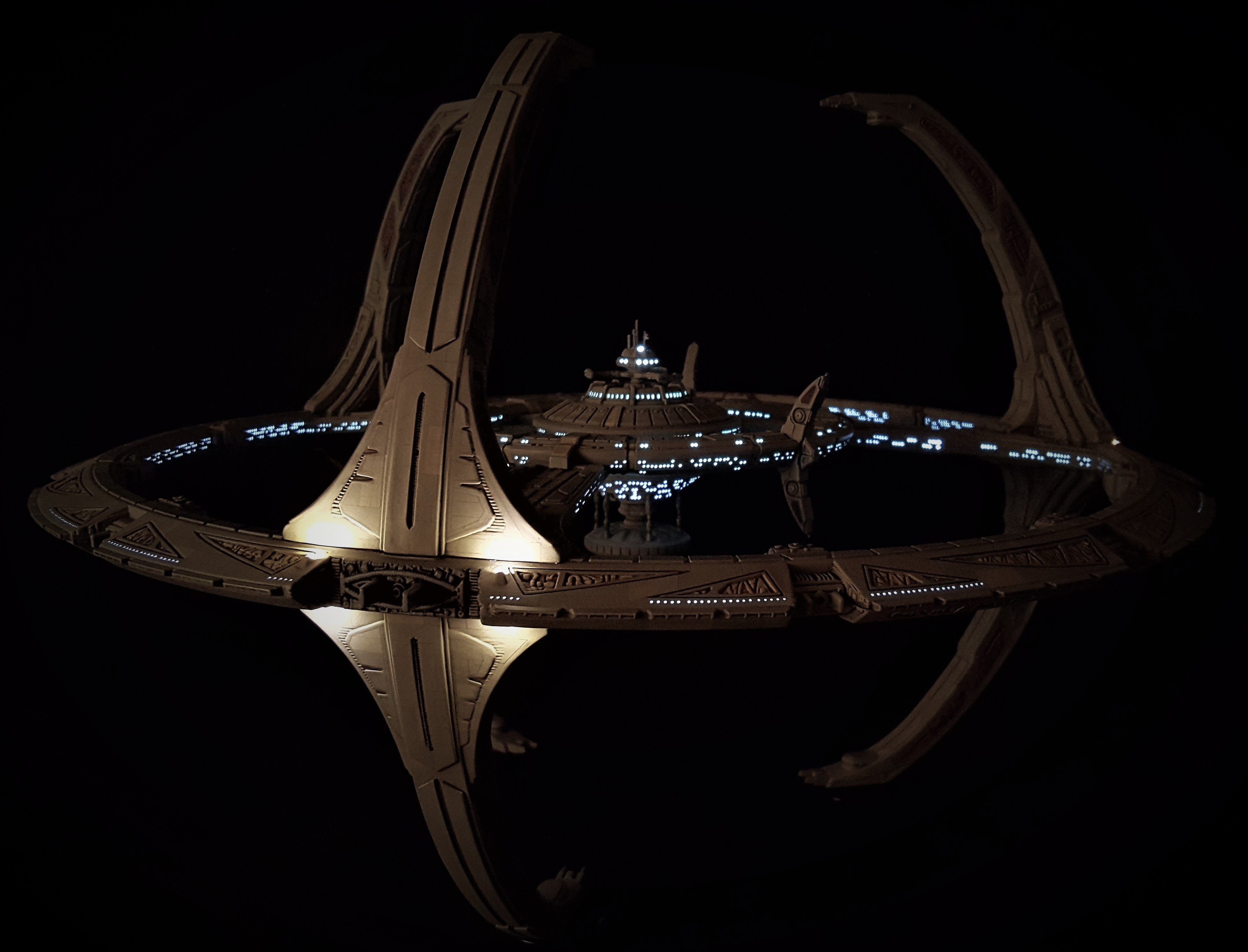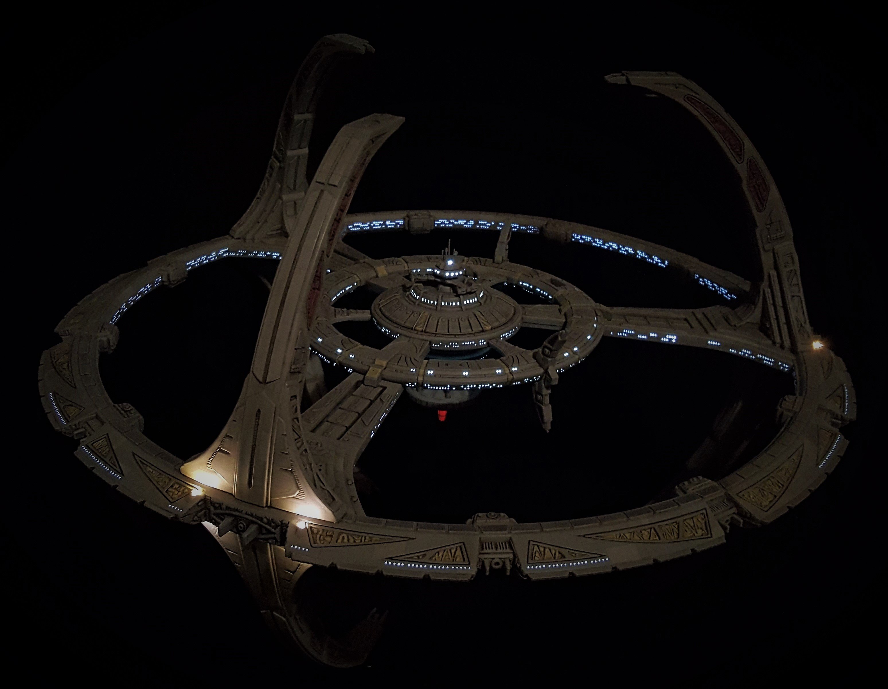 I was commissioned by a collector in Germany to build a new Deep Space Nine space station model to replace the current one being displayed in his private Star Trek museum. This new version was to be fully lighted, including flood lighting on the docking pylons, lit cabin windows, flashing anti-collision markers and a pulsating reactor core.