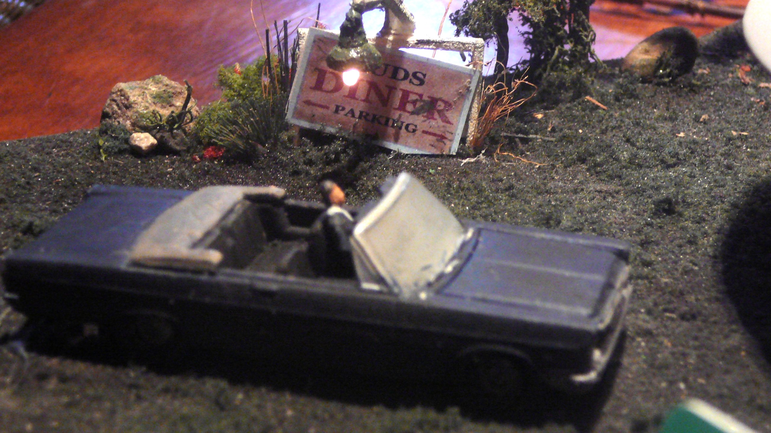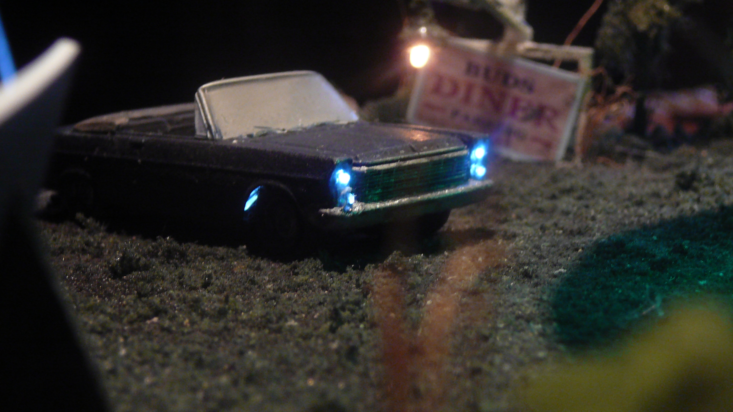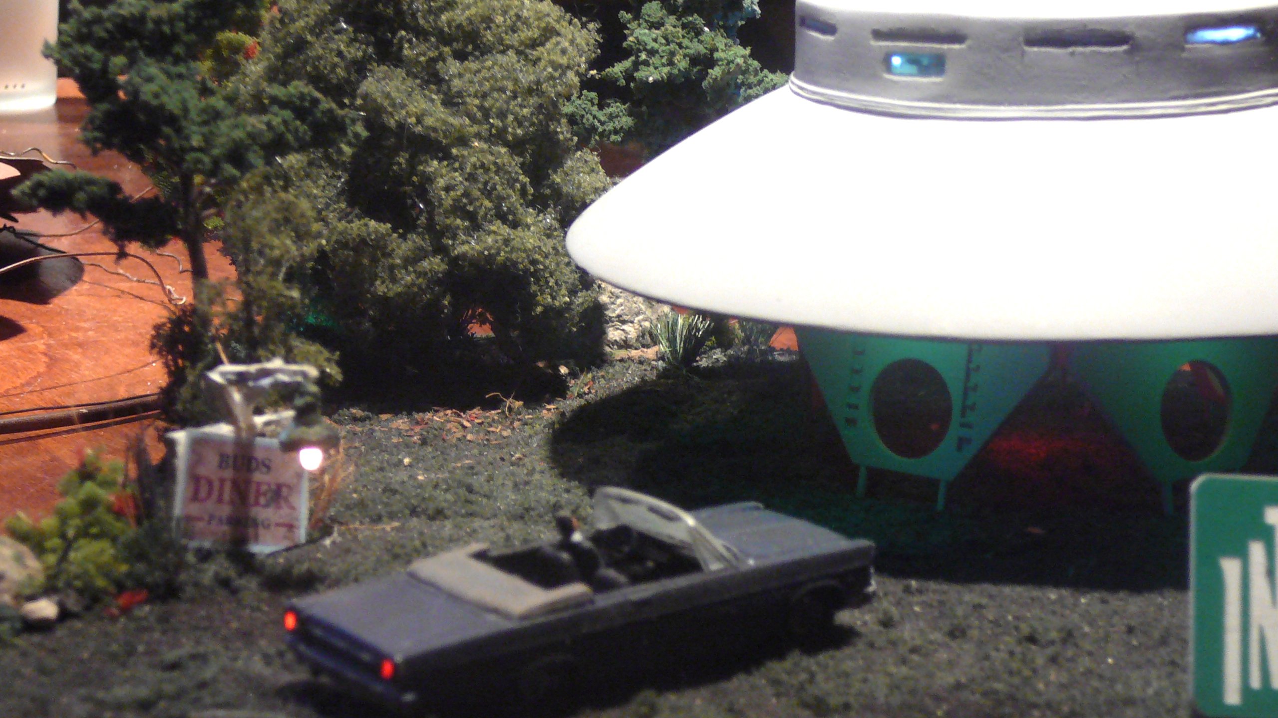 There is a main switch, that shut everything off, and is indicated by the BUDS DINER sign in a warm white light. Another switch for the trees to simulate the moon light, and to give shadow. Also on the same switch is the Galaxy Fork Car, Full Head Light, and tail light with fiber optics inside. SOUND CARD ( 5 sounds)