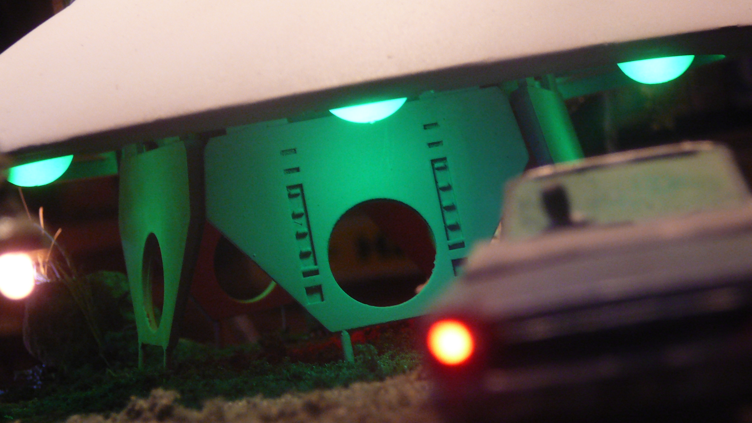 I have corrected the scale of the upper saucer and added two extra window ports, making them thinner, and the spaces smaller. Re scaling the main window as well, making that smaller too and adding a space between the two… I have added a control room with three men inside , with blinking lights on the wall, and invaders decal kit, for the invaders interior doors.