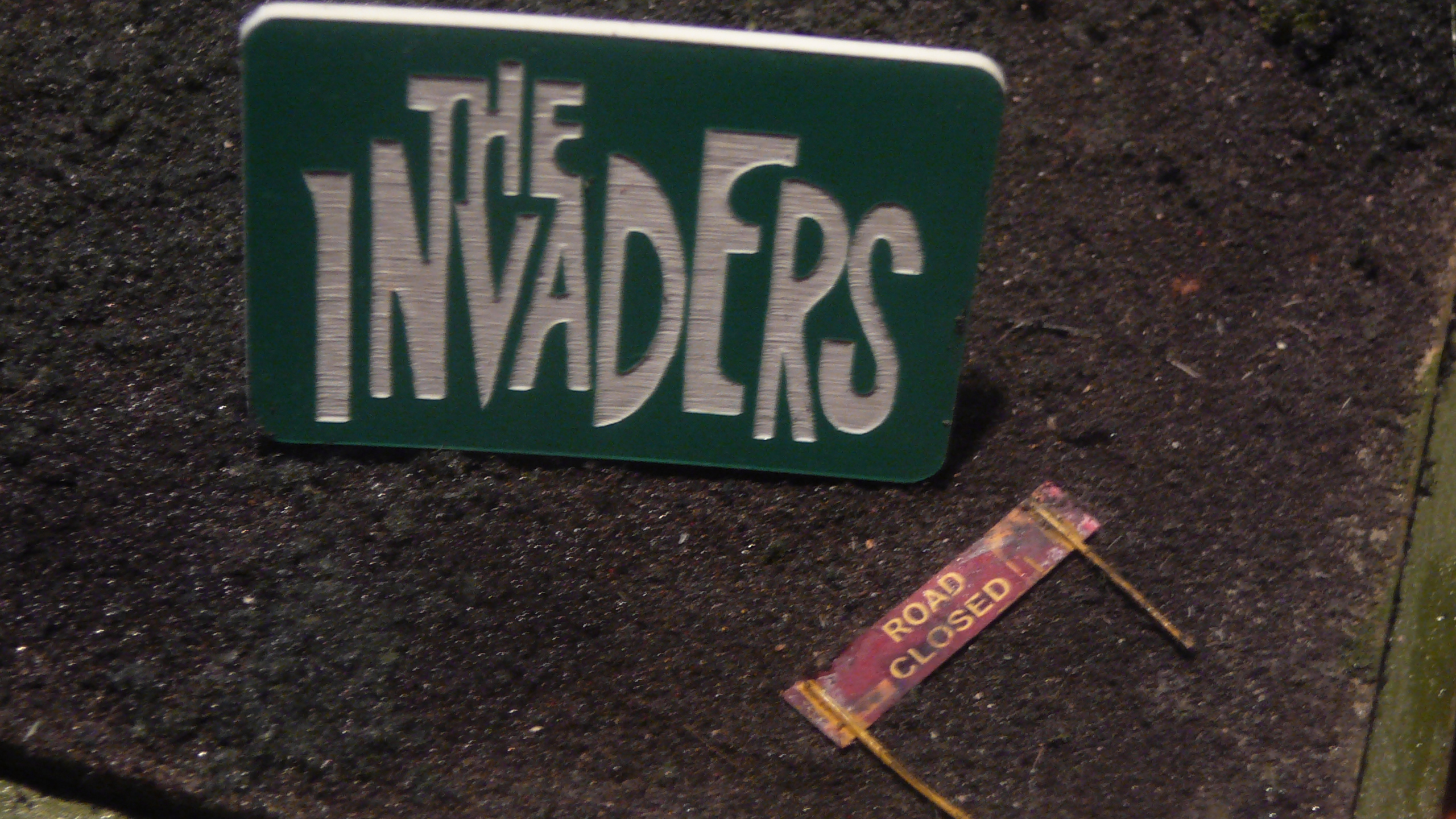 Real rocks, and high grade look trees, grass and weeds and logs along the back of the base.. ( Plus Road close sign on the ground ) Also a custom made Invaders Logo for the model, in green. A top cover for the Ford..which can be removed..