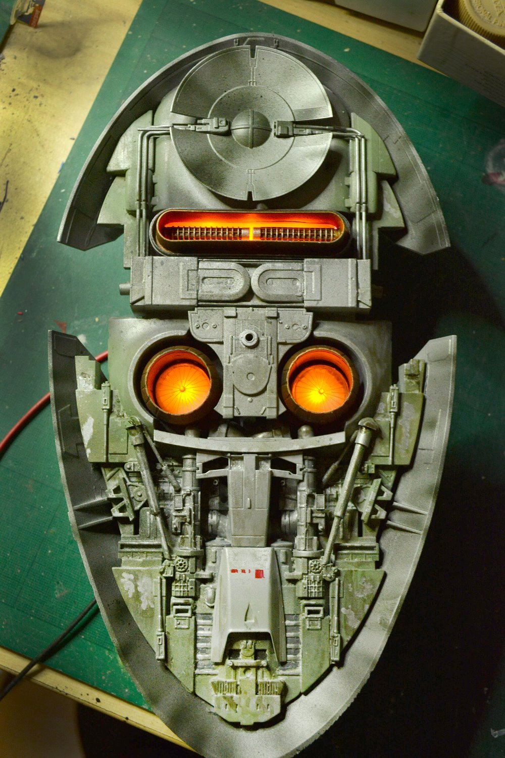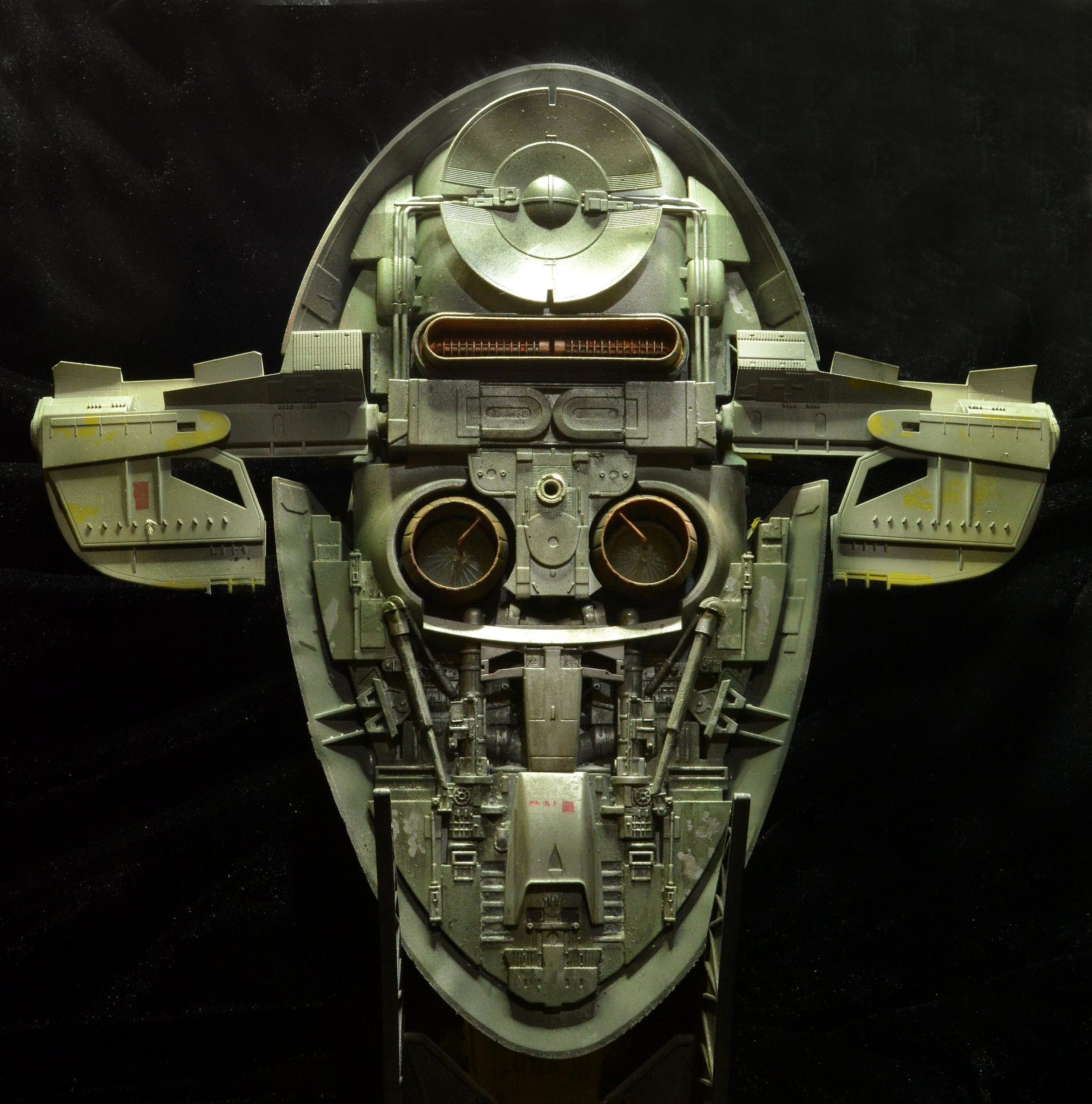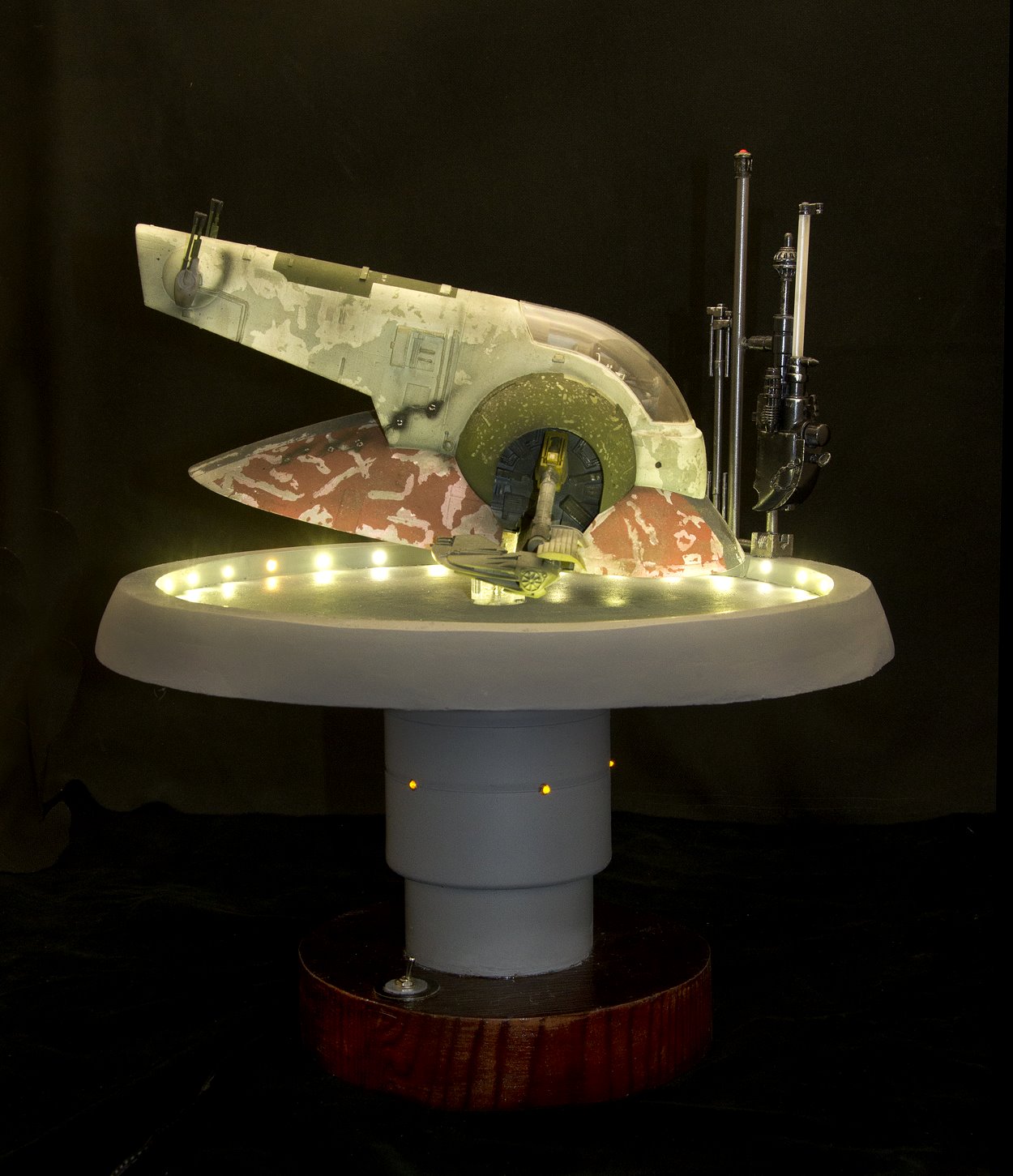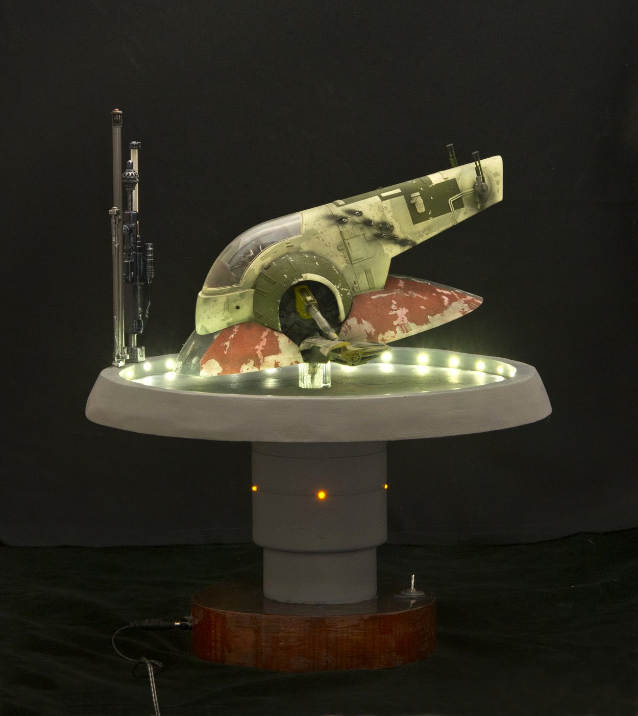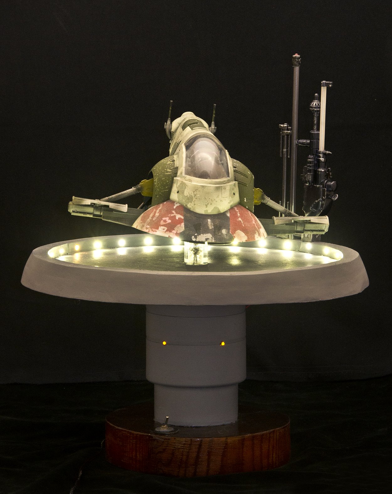 So I completed the kit but didn’t want it hanging around collecting dust like its predecessor so I decided to build a presentation diorama for it. I decided on a circular platform as seen in Cloud City but didn’t want a straight up identical copy. I did want those circular lights though. I also added a sort of antenna array thingy, the tallest pole which has a red flashing warning beacon like you see on all tall towers. The outside diameter of the platform is 15 inches and the kit is 12 inches in length, so they’re not in scale to each other but hey ho, it works. The base is a piece of mahogany I cut and mounted a piece of toilet pipe from the local hardware store. Into this I added 5 orange LED’s. The platform mounted on top of this. The kit itself is connected via a 1/8″ jack and allows it to turn 360 degrees on its clear acrylic tube. It’ll still collect dust but the display now gives me incentive to regularly clean it.
