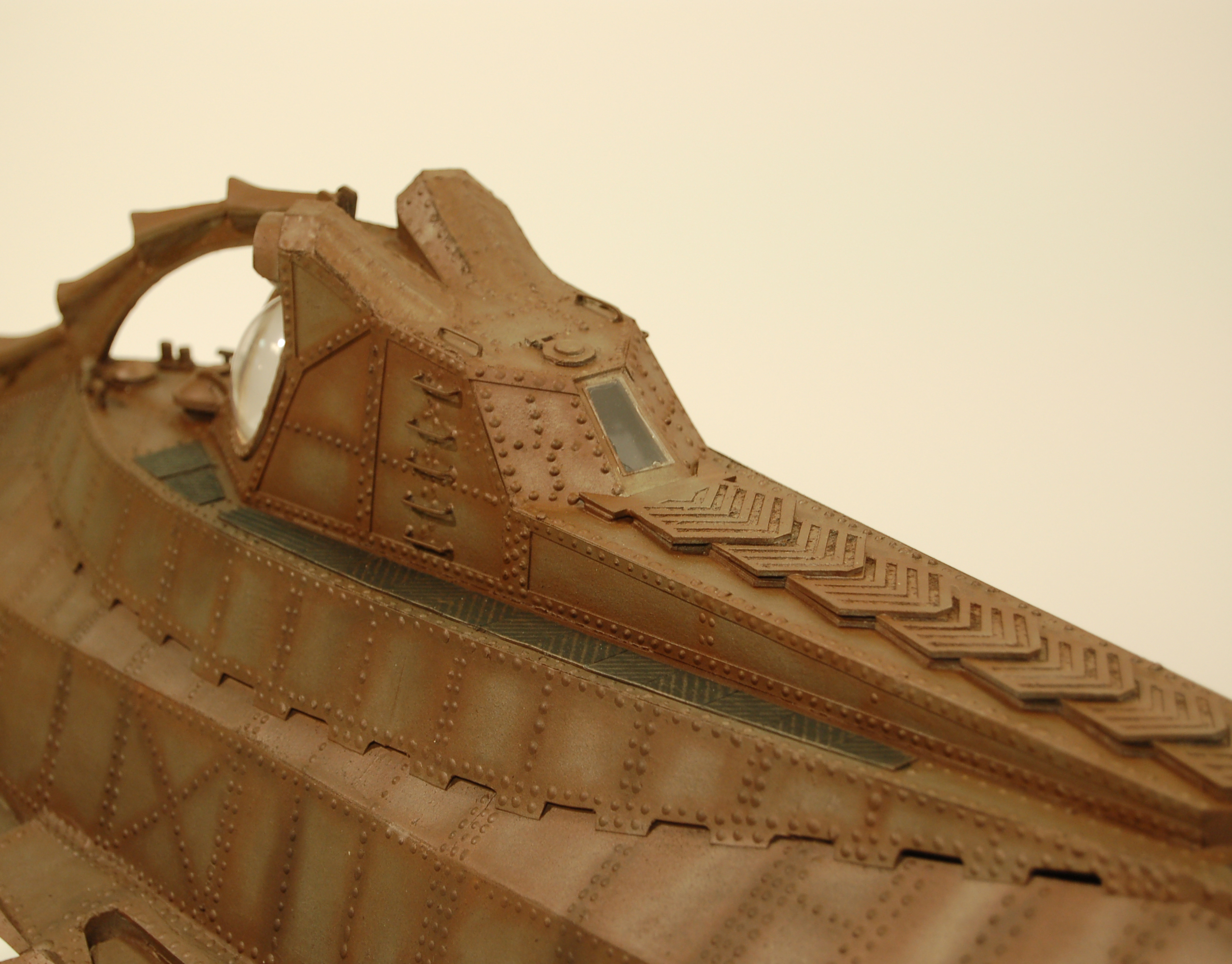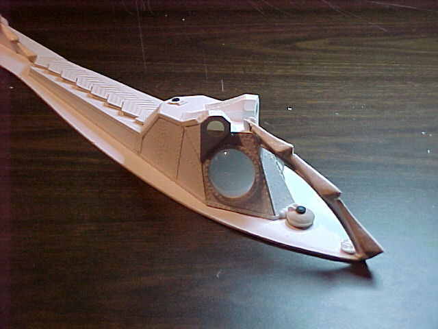 I used 3/4” dia. clear domes which I ordered online for the larger light lenses on either side of the Salon window, and for the smaller light lenses, I used some 1/2” dia. clear domes with a mirrored back which I got at Hobby Lobby. The Alligator Eyes are Enterprise engine nacelle caps. The salon windows themselves were cut from clear domed drink lids… the kind you might get at Dairy Queen that have a hole in the top for a straw. Then I cut another light bulb package blister to seal the hole. I glued all of these items into place. The last thing I did was to draw and cut the salon window braces out of illustration board, paint them with the metallic bronze paint, and glue them into place.