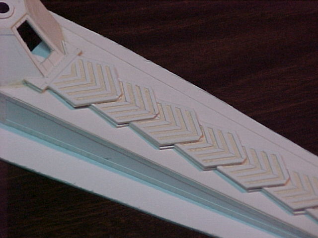 For the deck grating, I used cover weight laid stock (which has pre-embossed horizontal lines). I cut sections at the proper shape and with the lines at the proper angles and glued them to the top of the deck.