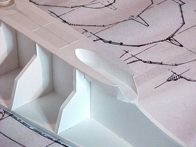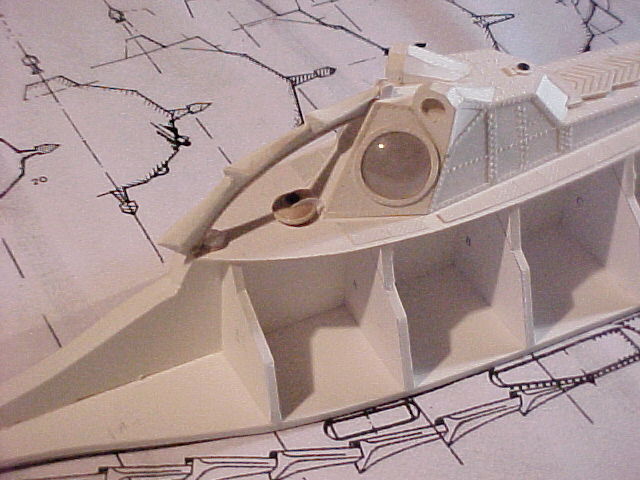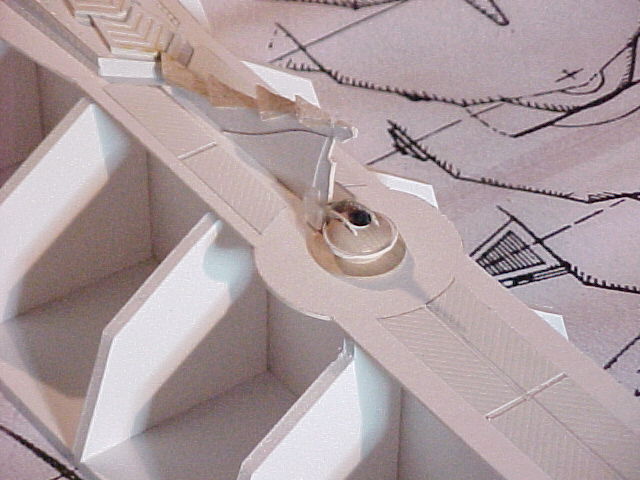 I cut two support shapes from foam core for each side, which acted as a “stand out” on which I attached the face of the salon window housing. Each side of the housing face was contoured and curved around to slip neatly into the notches left in the side keels. Then I drew the salon window/light dome frame in Freehand, spray mounted the drawings onto illustration board, cut them out and attached them to the housing faces. The housing top and bottom were finished by laying a strip of poster board on and drawing the shape I would need onto them (this took a couple of tries). I then cut, glued and formed the pieces into place and when dry, trimmed off the excess material.