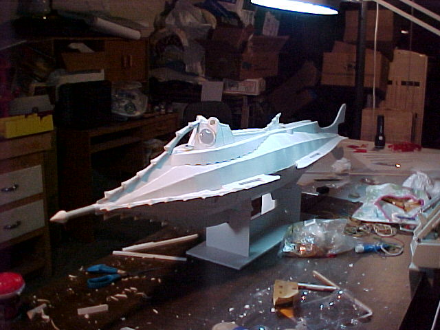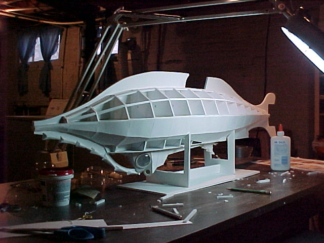 I then turned the model upside down on one of many temporary foam core stands I would use during construction, and repeated the process, gluing the lower hull profile to the underside of the footprint, and applying the bulkheads and hull panels.