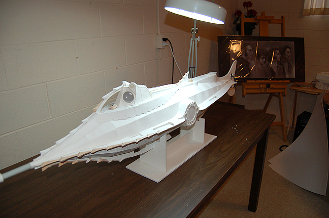 The ramming spur was actually a left over engine nacelle from the Polar Lights U.S.S. Enterprise model. I cut the length and made the end by combining a pre-packaged wood shape and a cone I made from paper. With some spackle it came together rather well.