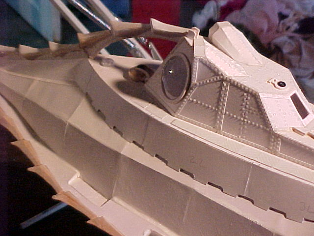 The sliding top was made by cutting three individual shapes from illustration board and covering them with the laid paper in the proper grid pattern. Then I built them up on top of one another. The hull of the skiff was made similarly to the hull of the sub, a profile shape and bulkhead “ribs”. Then I glued the whole thing into the skiff slot and filled in the exposed hull with the light-weight spackle.