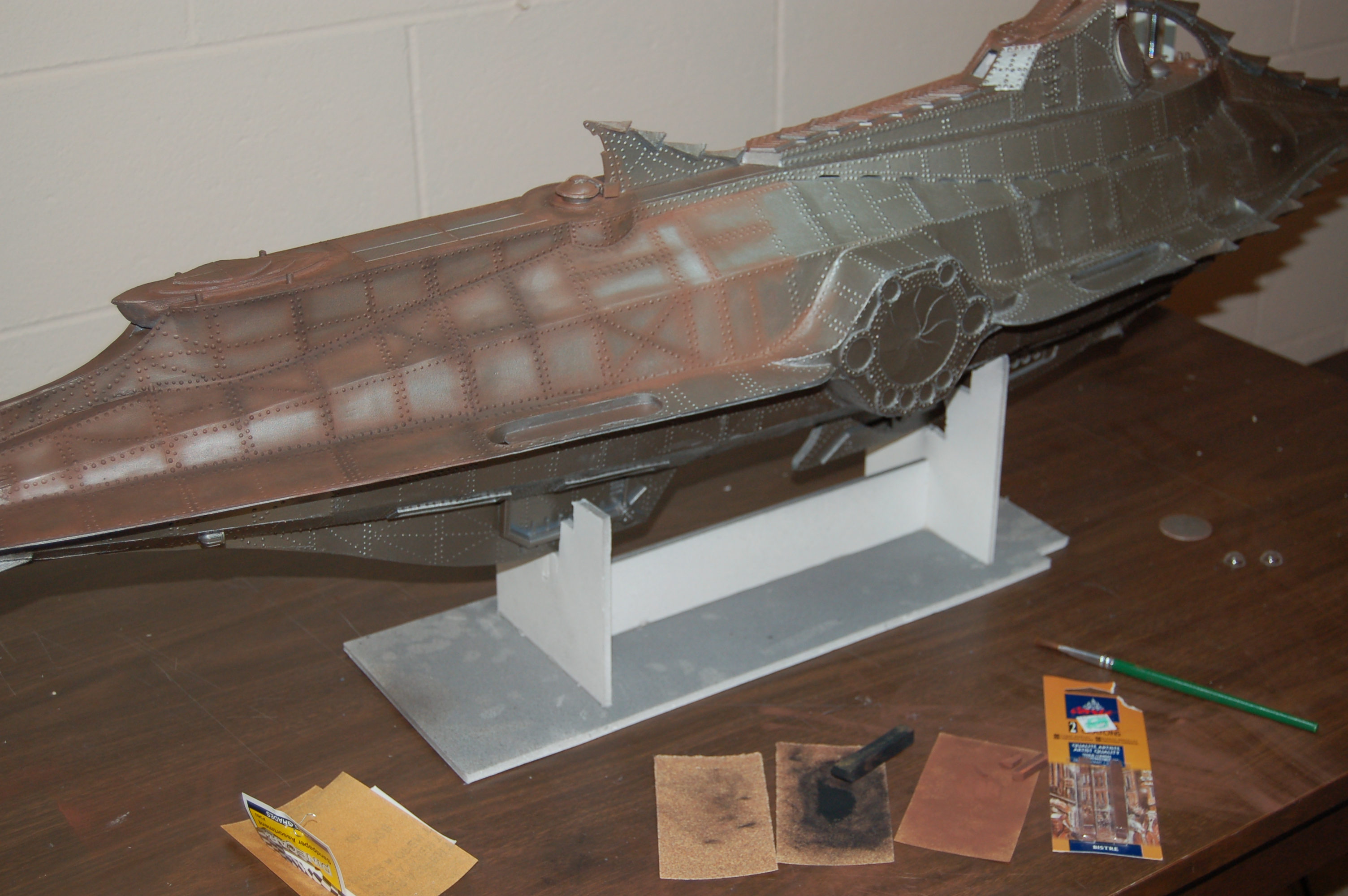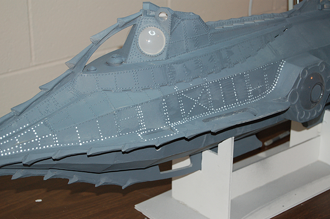 I then applied a second coat of primer. For the final color, I wanted something different from other Nautilus models I had seen. I knew I didn’t want gold, or copper, nor did I want just a brown color. I elected to use metallic bronze paint (though in the construction pictures, the paint appears silver). I applied the paint onto the entire model. Next, I used a combination of powdered charcoal and conte crayon to weather the vessel. I rubbed the sticks on coarse sandpaper to get the powder, and applied it heavily to the rivet lines with a small brush, and then I very lightly brushed the powder over the rest of the model.