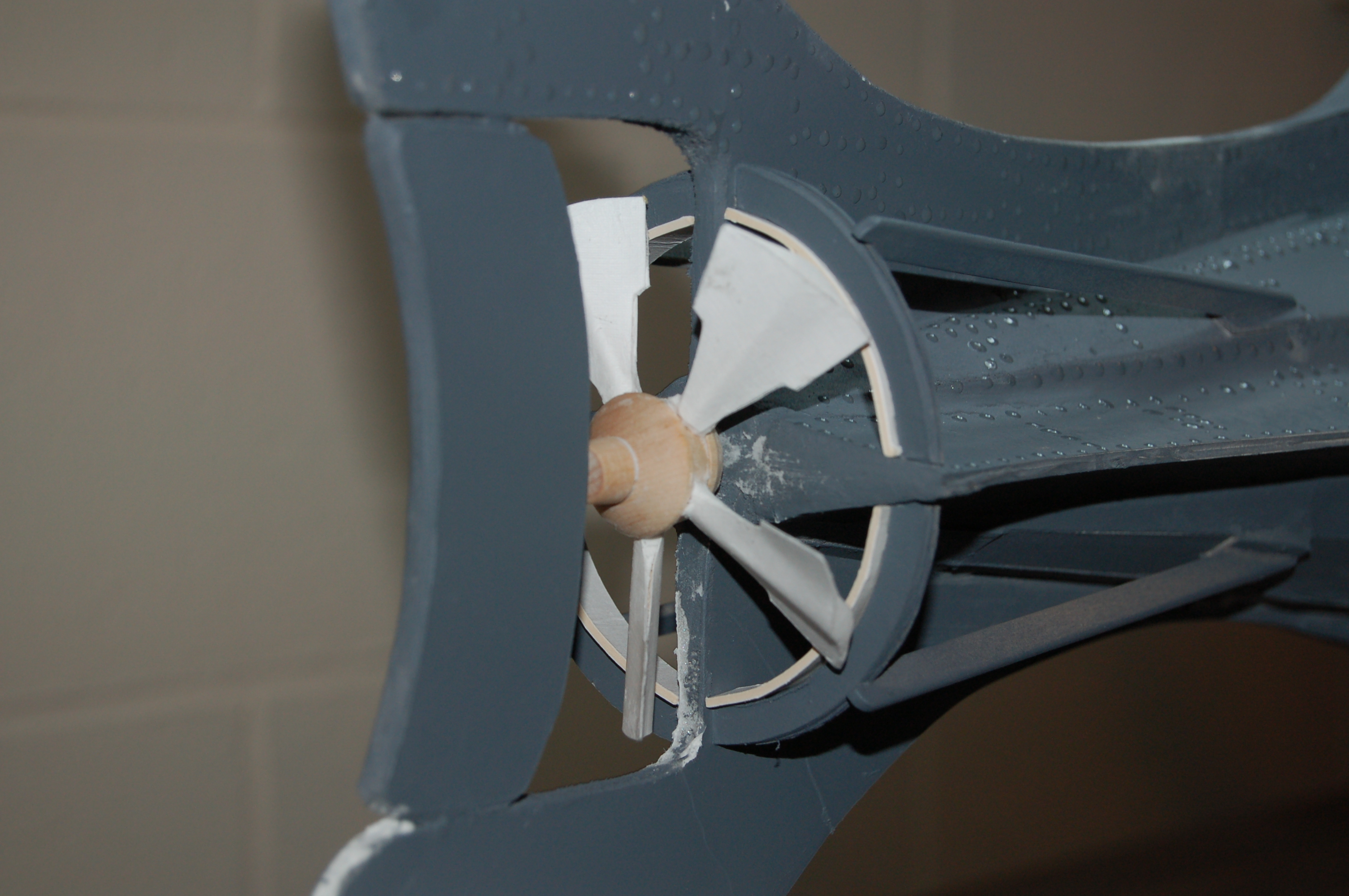 The prop was made from three different pre-package wood shapes, glued together to form the hub, and 1/8″ wood stick (Hobby Lobby) cut to length and glued around like spokes. I then cut the prop blades from coated poster board (2 shapes for each blade) and sandwiched them around the sticks at the proper angle. Then I filled any gaps and capped the ends with the light-weight spackle.