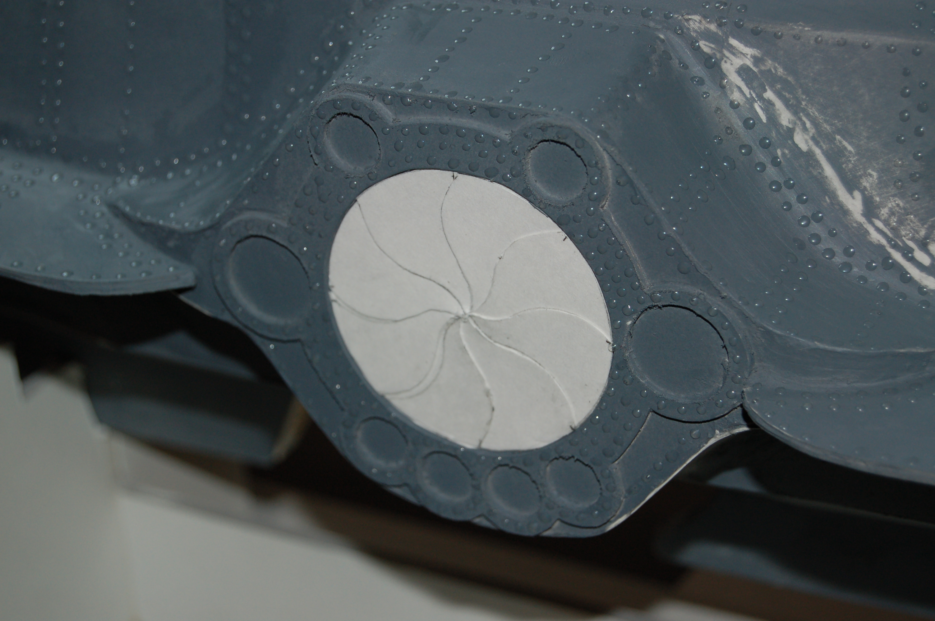 The breathers were created in two layers, one cut as a single piece of illustration board, and another layer cut one breather at a time, and overlayed on top of each other. The details in the breathers were cut into the first few layers of the board and lifted out.
