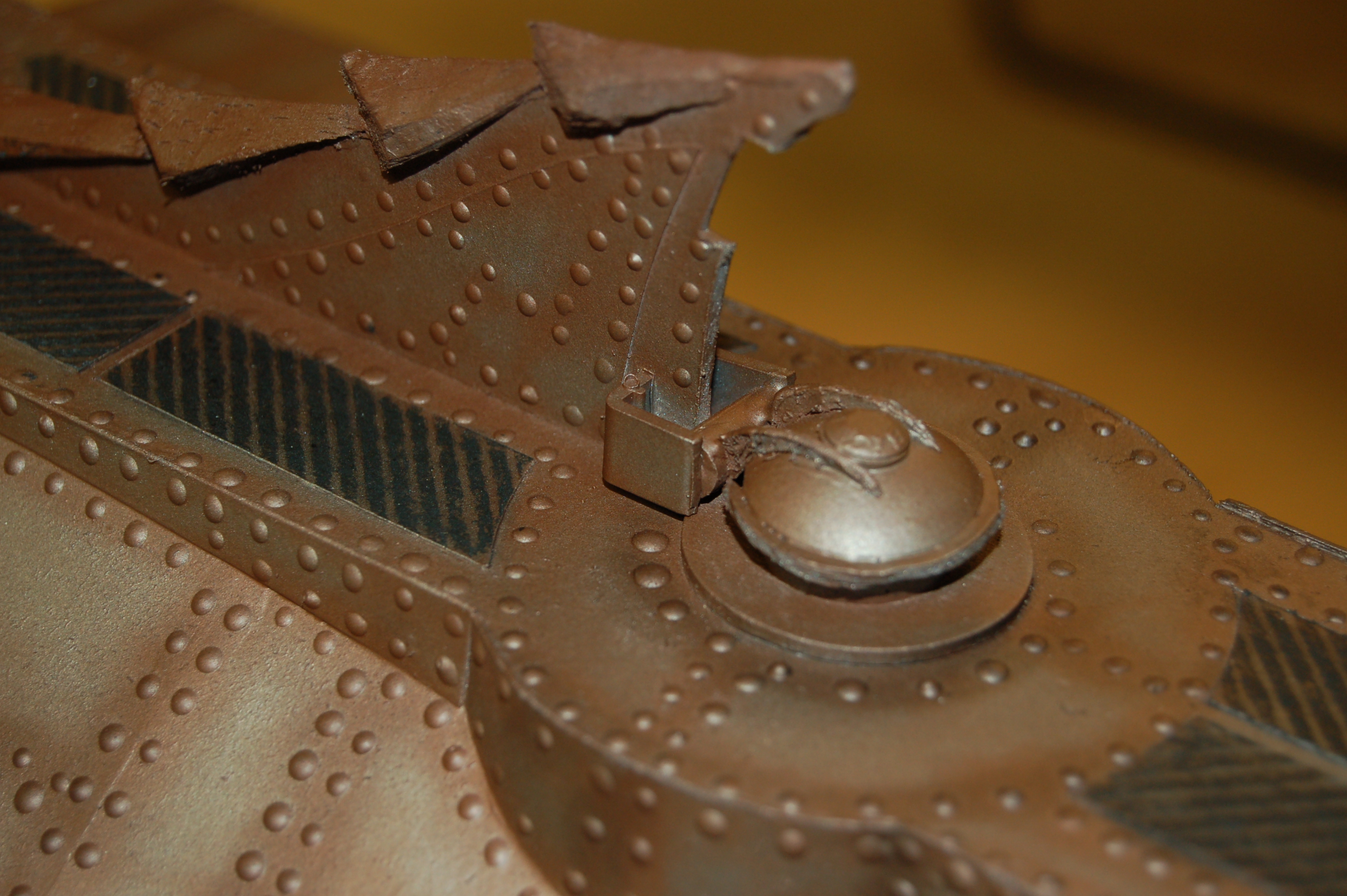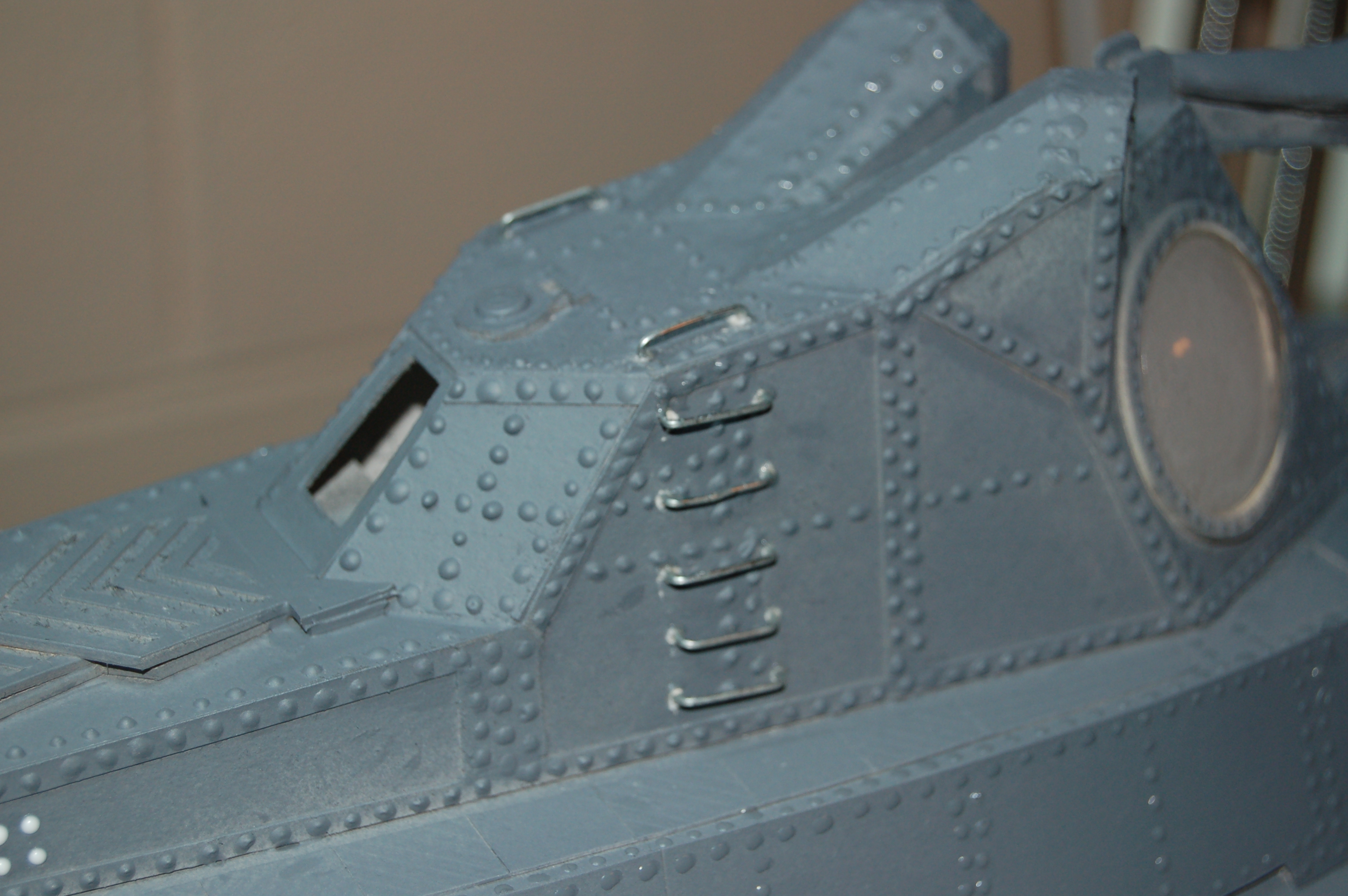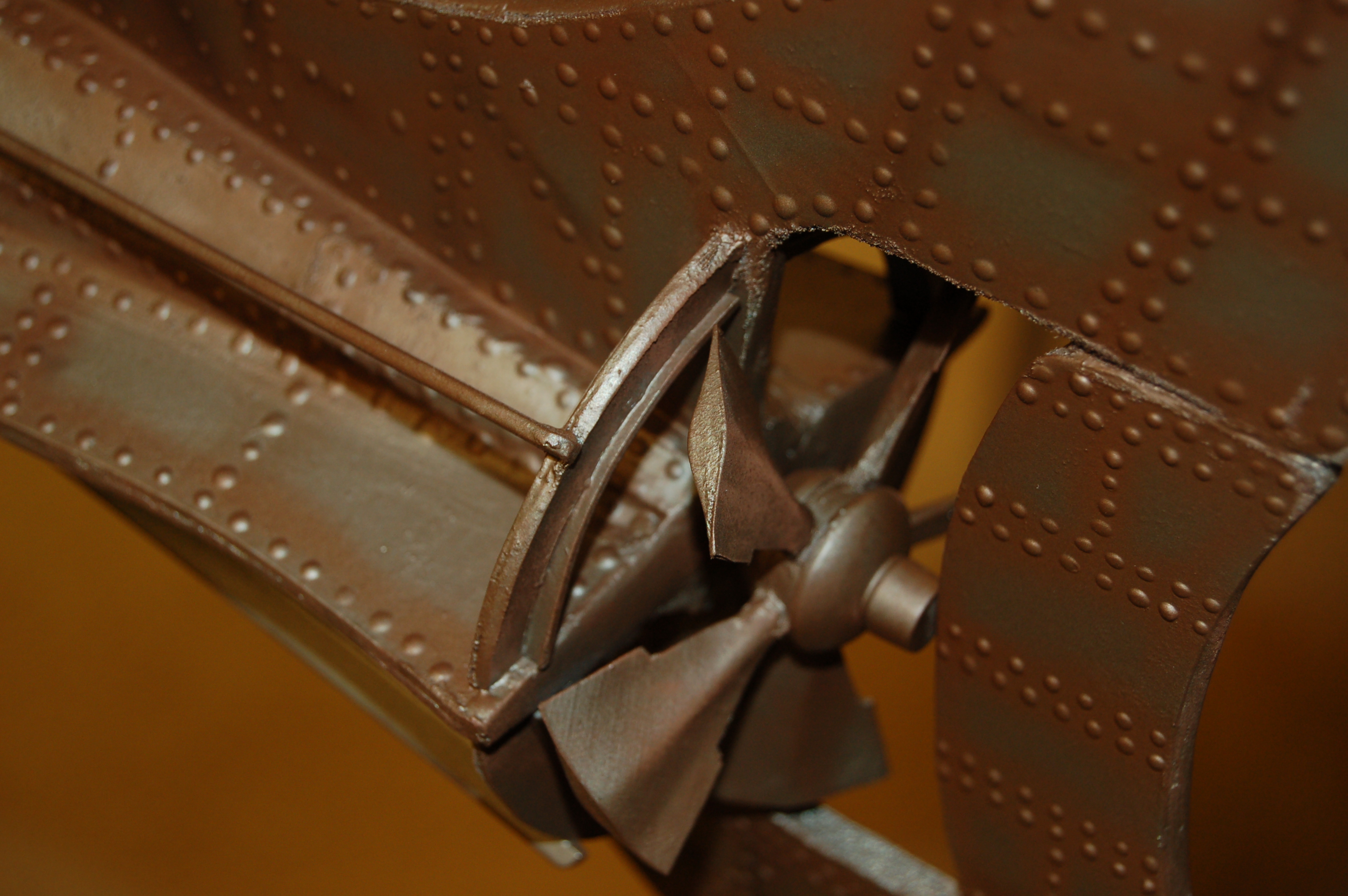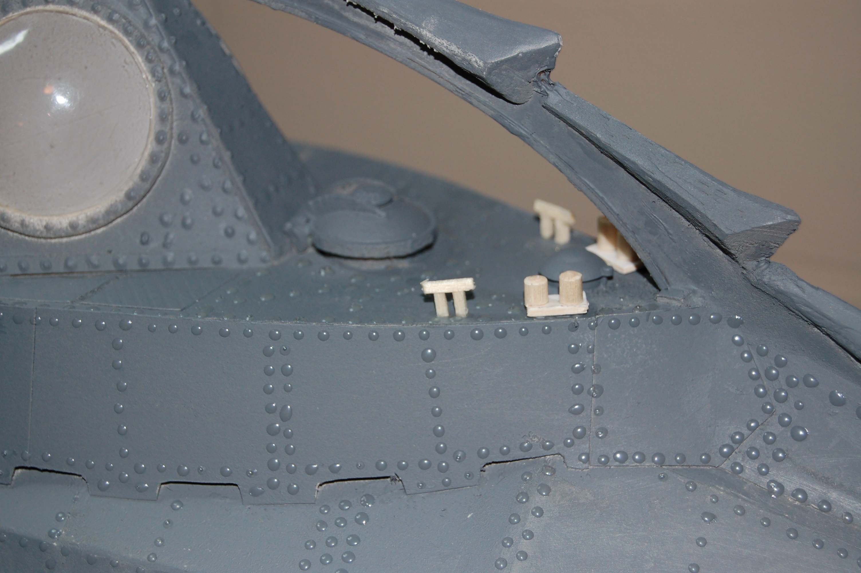 I applied the first coat of primer to the entire model in preparation for the rivets. Then came the lengthy task of applying rivets using the Pine Car glue. I did it in sections and worked and turned the model until all the rivets were applied. This took a few days.