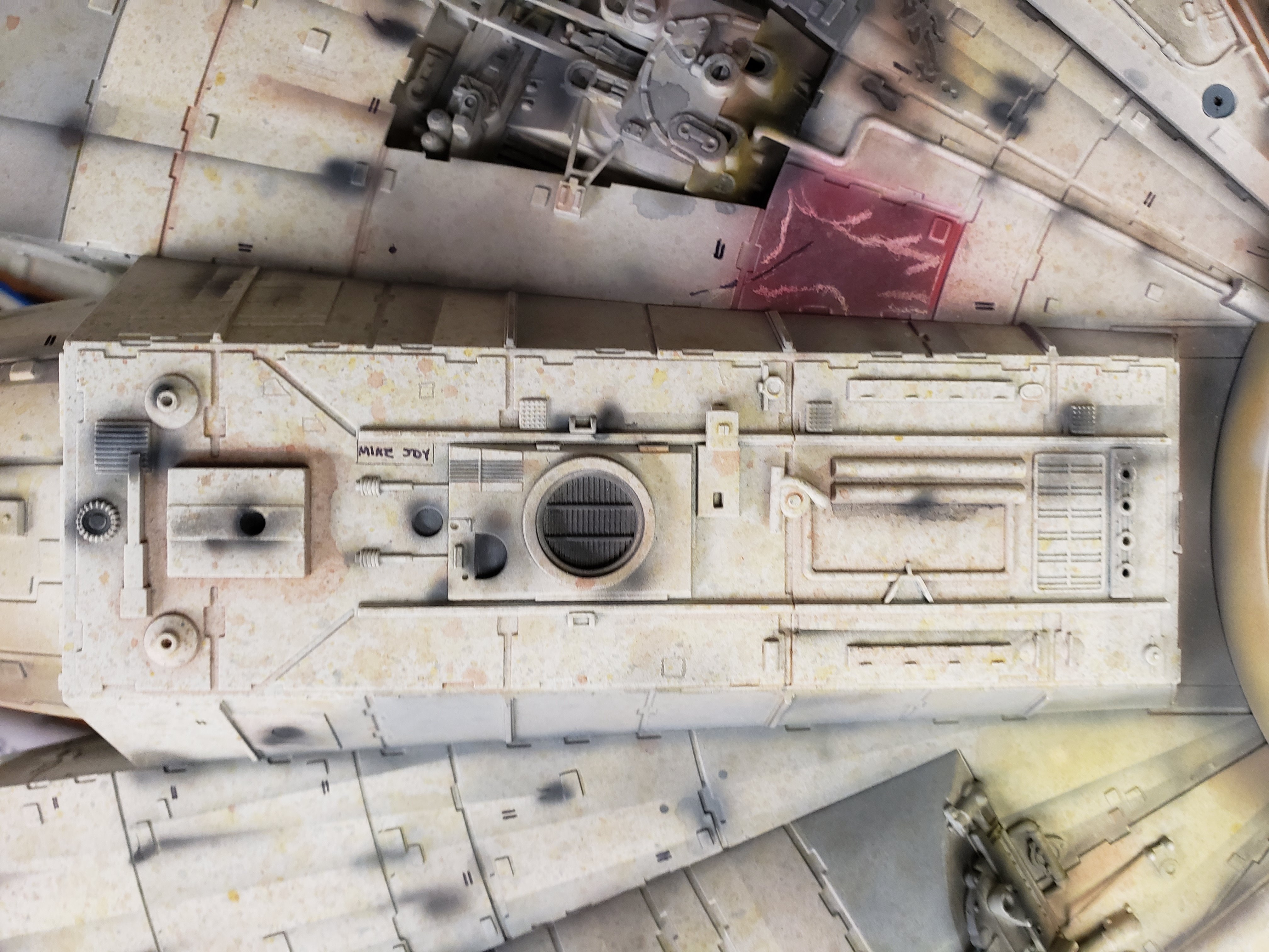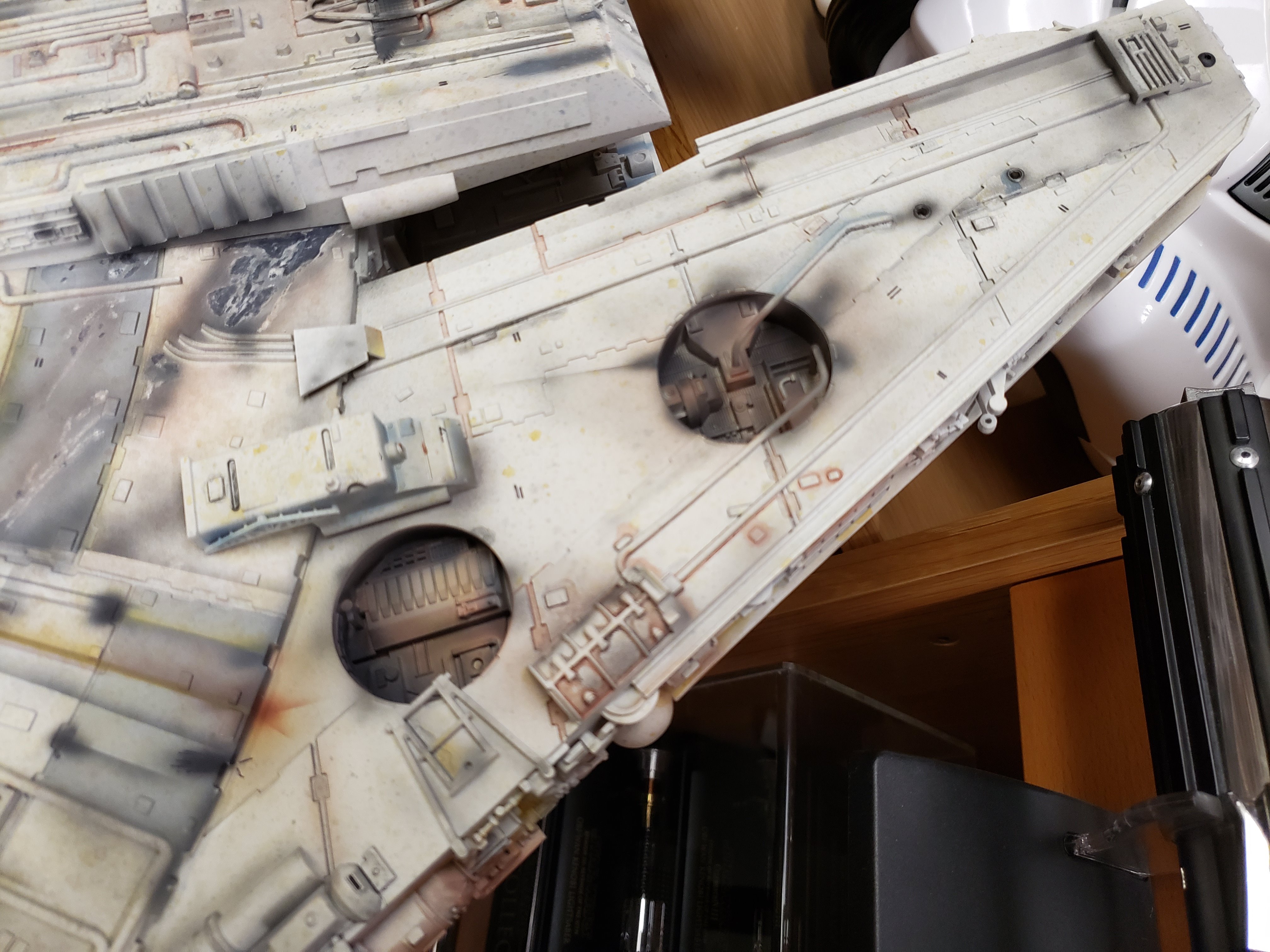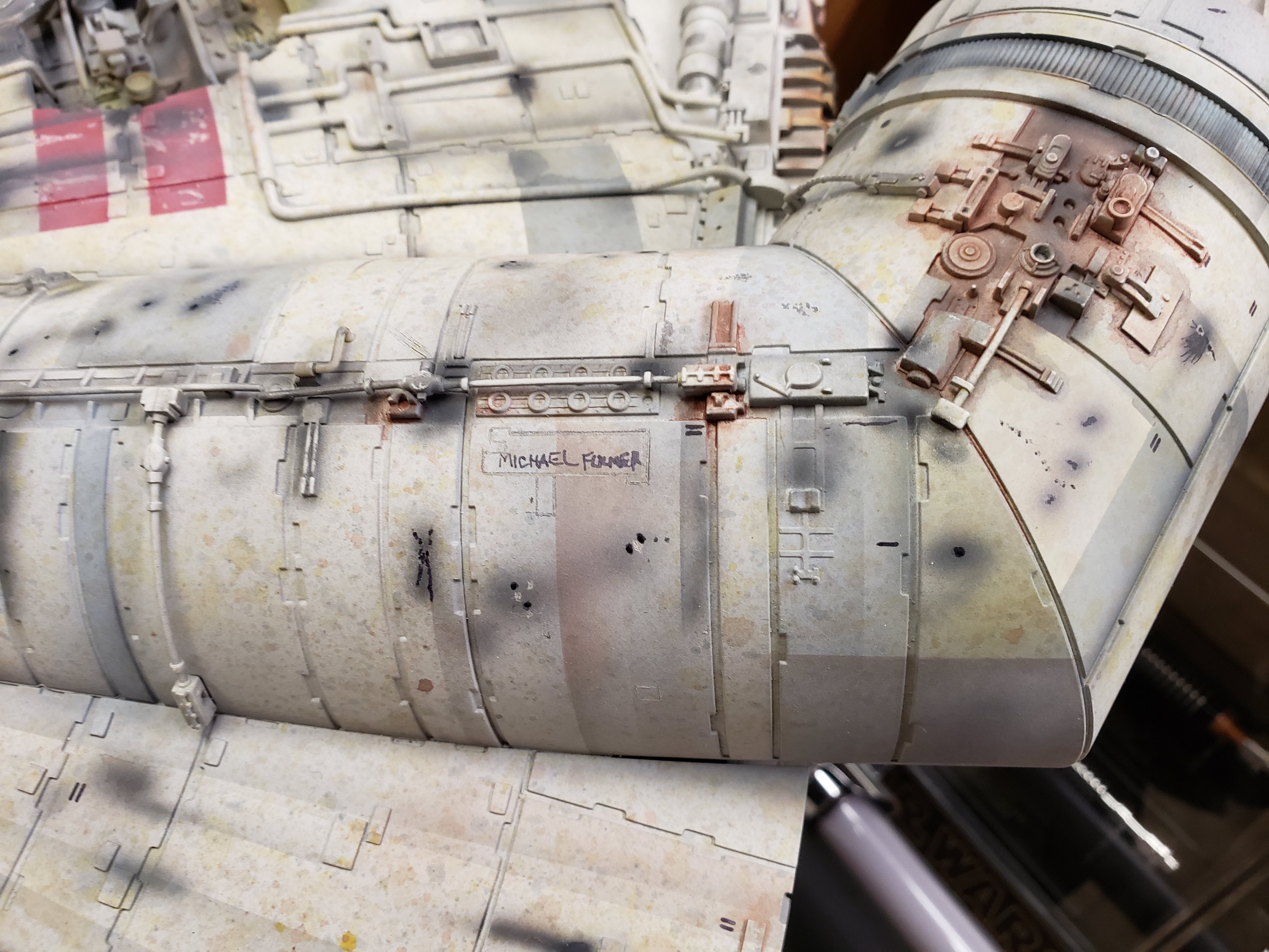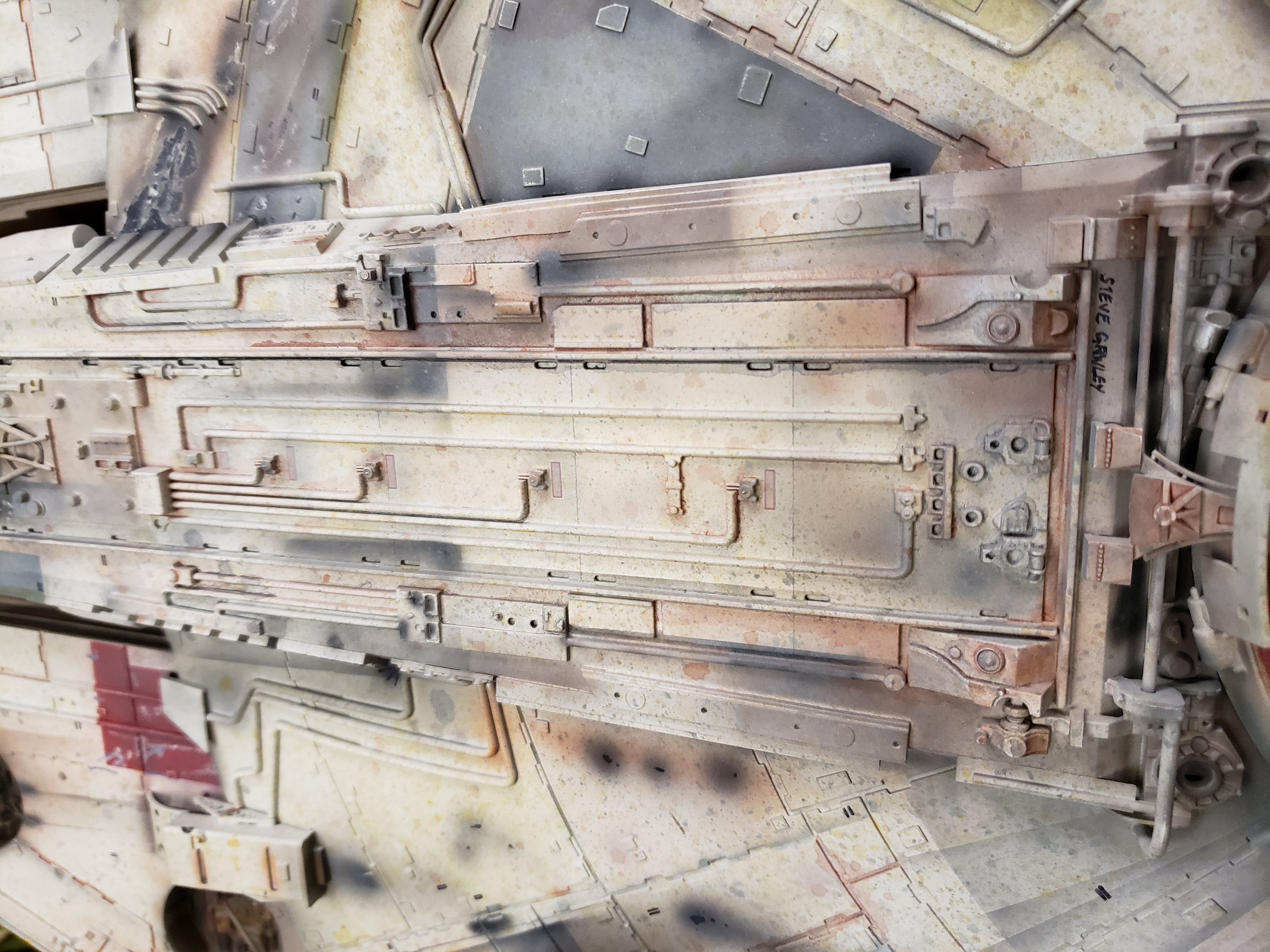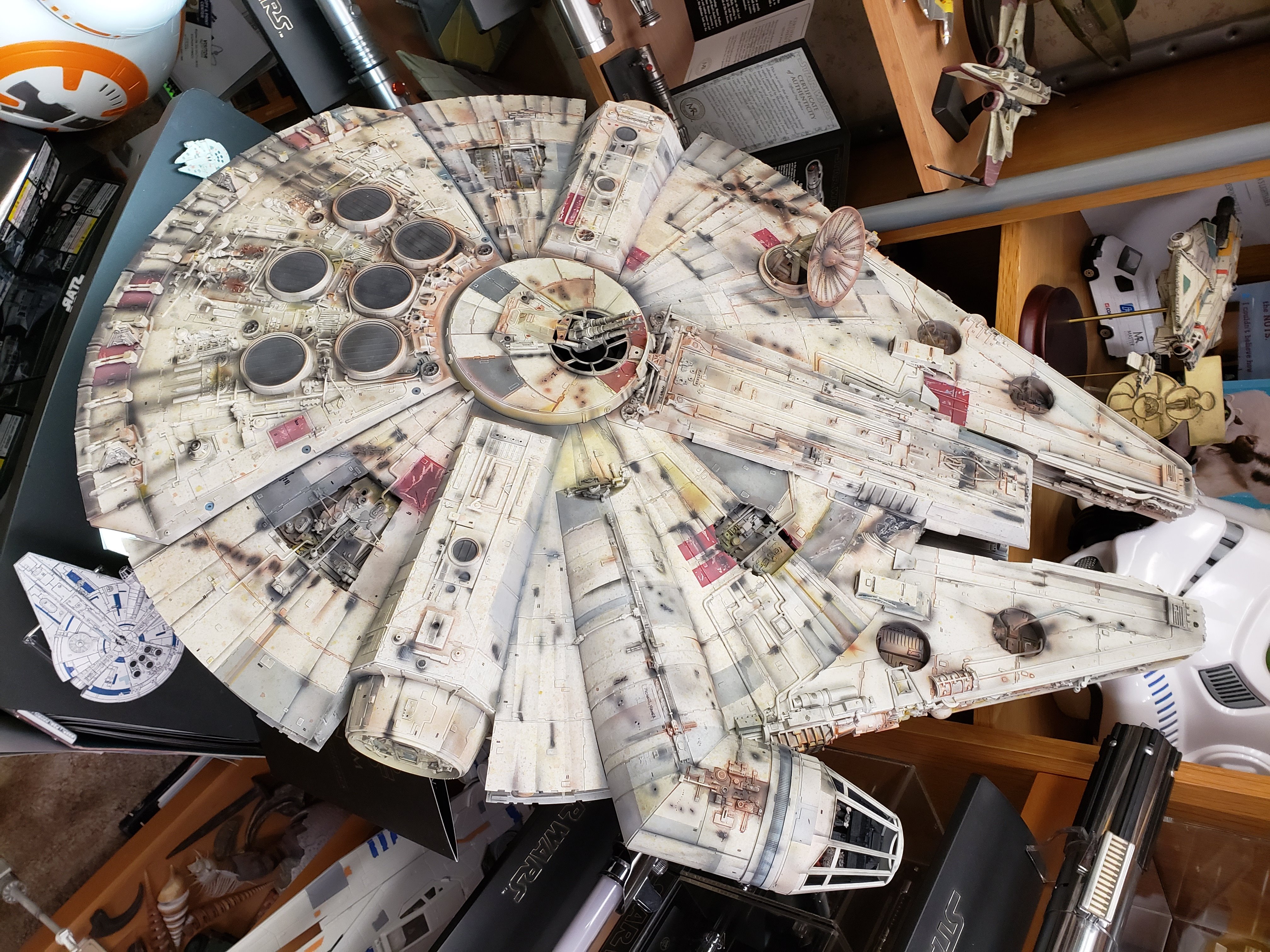 So this is the DeAgostini kit with about 150 replacement parts. I used parts from Shapeways and original model kit parts to replace some of the kit. I also added about 30 missing parts that we didn’t catch on the MR version, because they had fallen off before we got to them. I also removed all of the molded screws and used real screws across the surface of the model. The paint job took about 120 hours and there’s probably about 250 hours in the build. I also added about 50 ultra-bright LEDs to the engine and it is blinding! The cockpit cone is a Shapeways replacement, because the kit cone was really bad. I worked with the factory to try to fix it but they just messed it up more, so I gave up. All of the ILM signatures are on the model and I copied each person’s writing style to make sure they were accurate. Every mark is exactly where it’s supposed to be. There are no incorrect placements. I plot out the position of each blast mark with a pencil first to make sure it’s correct before I paint it in…so every blast mark and streak is exactly where it’s supposed to be. I also filled in and re-sculpted all of the incorrect kit blast marks and added all the missing ones. I think this is the most accurate build/paint that anybody has done.