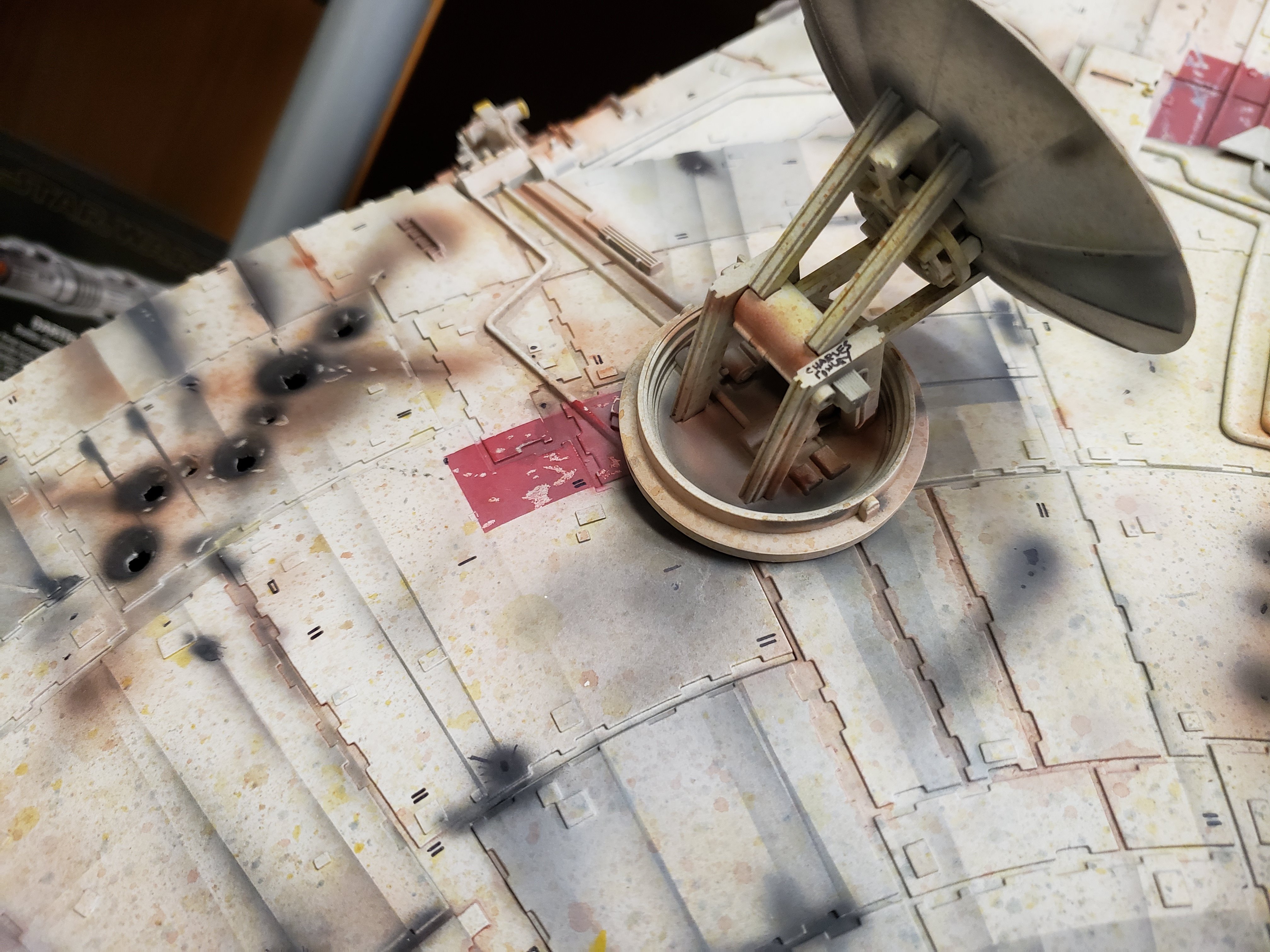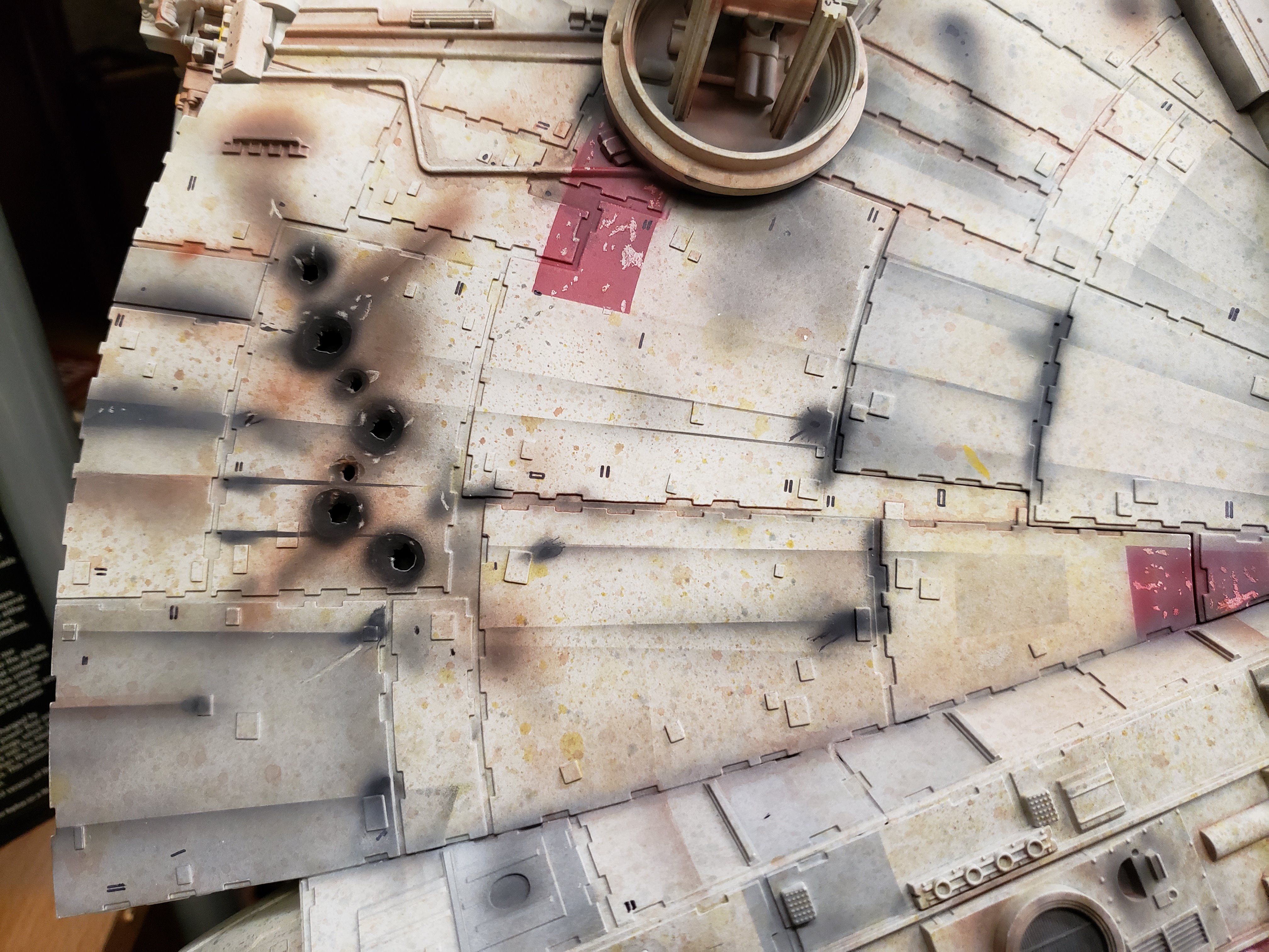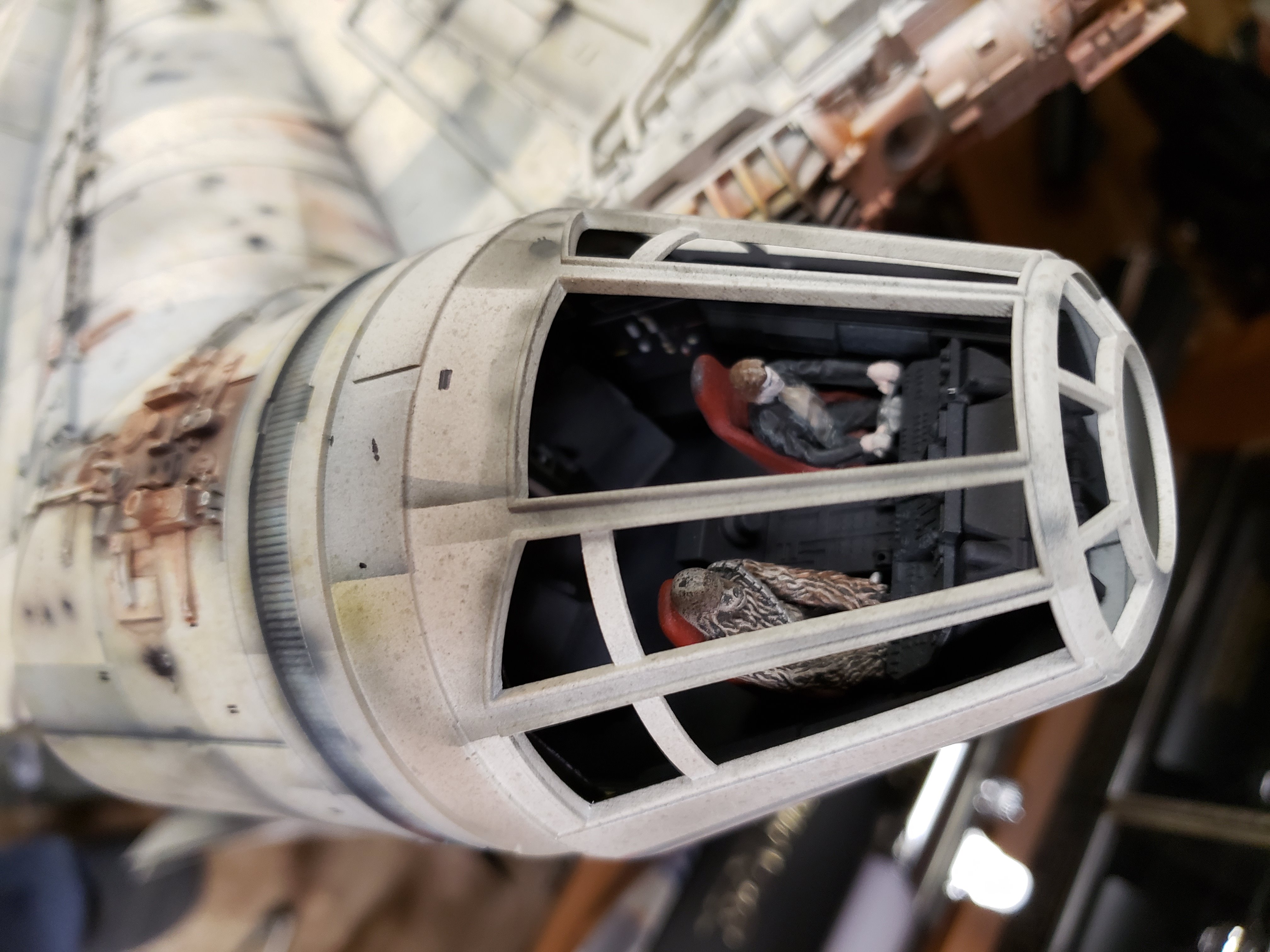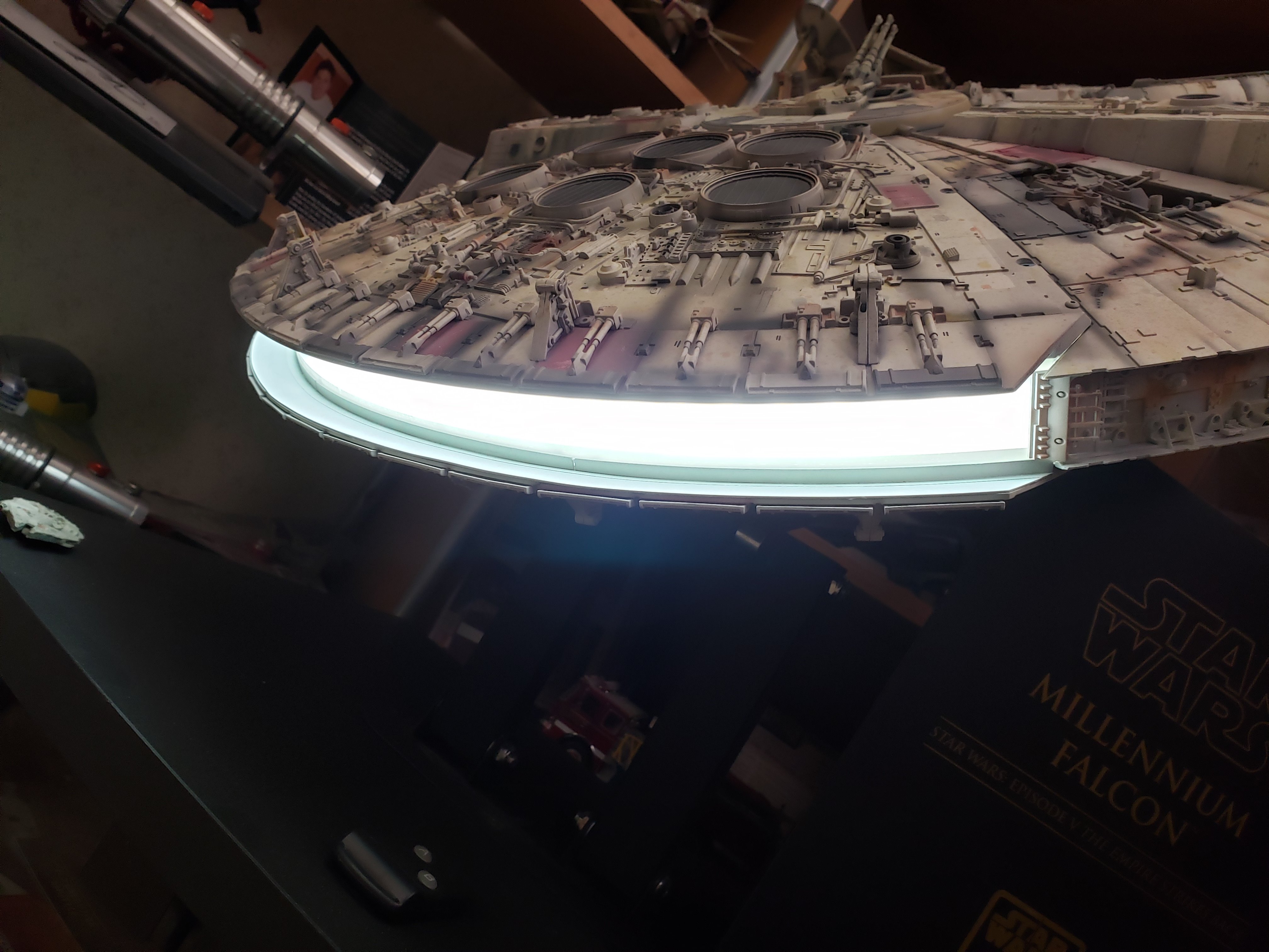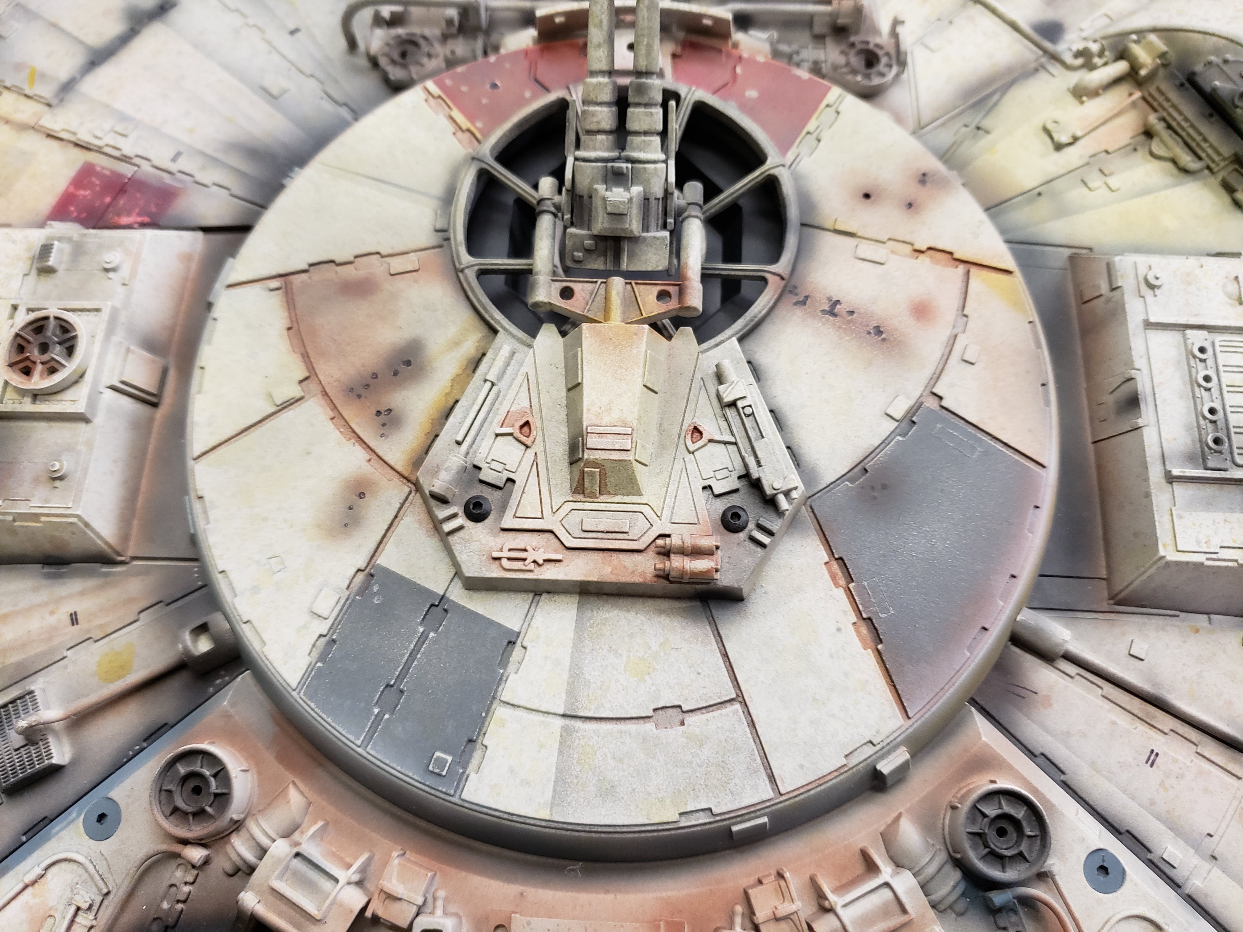 So this is the DeAgostini kit with about 150 replacement parts. I used parts from Shapeways and original model kit parts to replace some of the kit. I also added about 30 missing parts that we didn’t catch on the MR version, because they had fallen off before we got to them. I also removed all of the molded screws and used real screws across the surface of the model. The paint job took about 120 hours and there’s probably about 250 hours in the build. I also added about 50 ultra-bright LEDs to the engine and it is blinding! The cockpit cone is a Shapeways replacement, because the kit cone was really bad. I worked with the factory to try to fix it but they just messed it up more, so I gave up. All of the ILM signatures are on the model and I copied each person’s writing style to make sure they were accurate. Every mark is exactly where it’s supposed to be. There are no incorrect placements. I plot out the position of each blast mark with a pencil first to make sure it’s correct before I paint it in…so every blast mark and streak is exactly where it’s supposed to be. I also filled in and re-sculpted all of the incorrect kit blast marks and added all the missing ones. I think this is the most accurate build/paint that anybody has done.