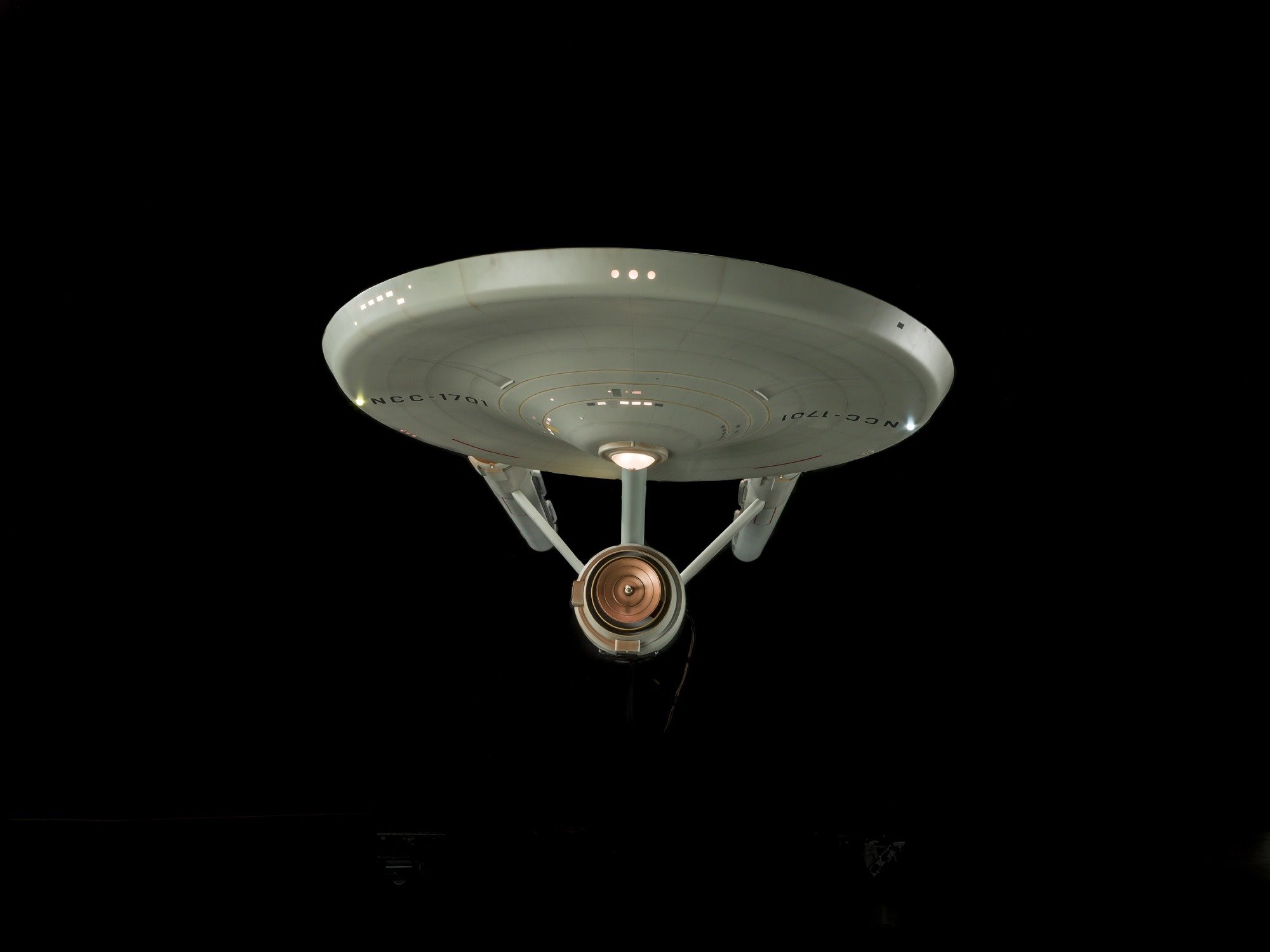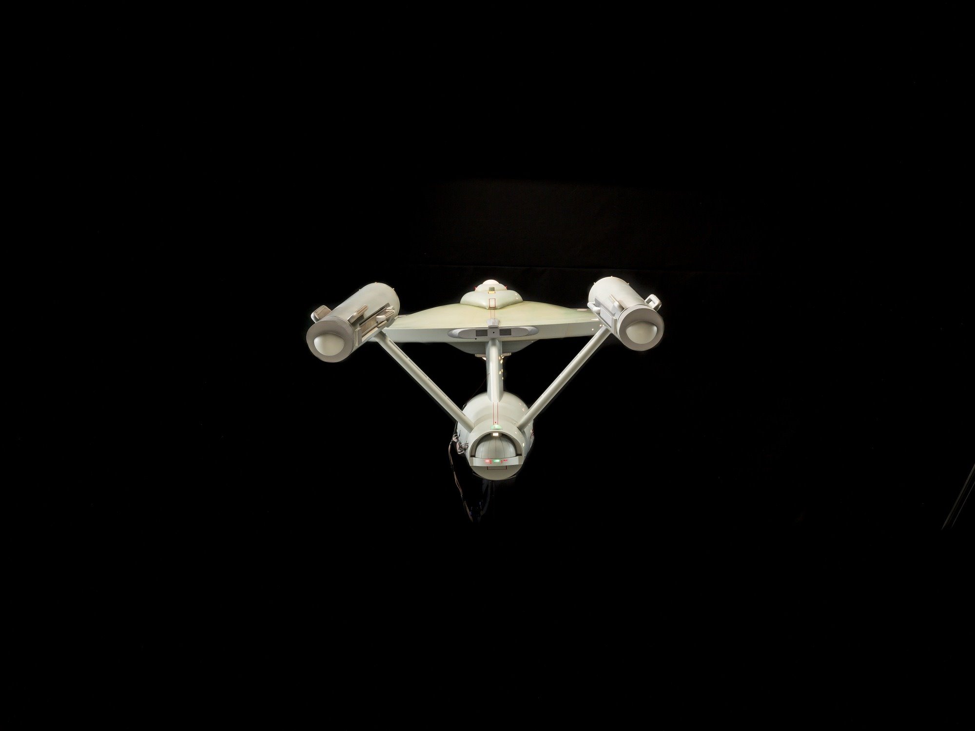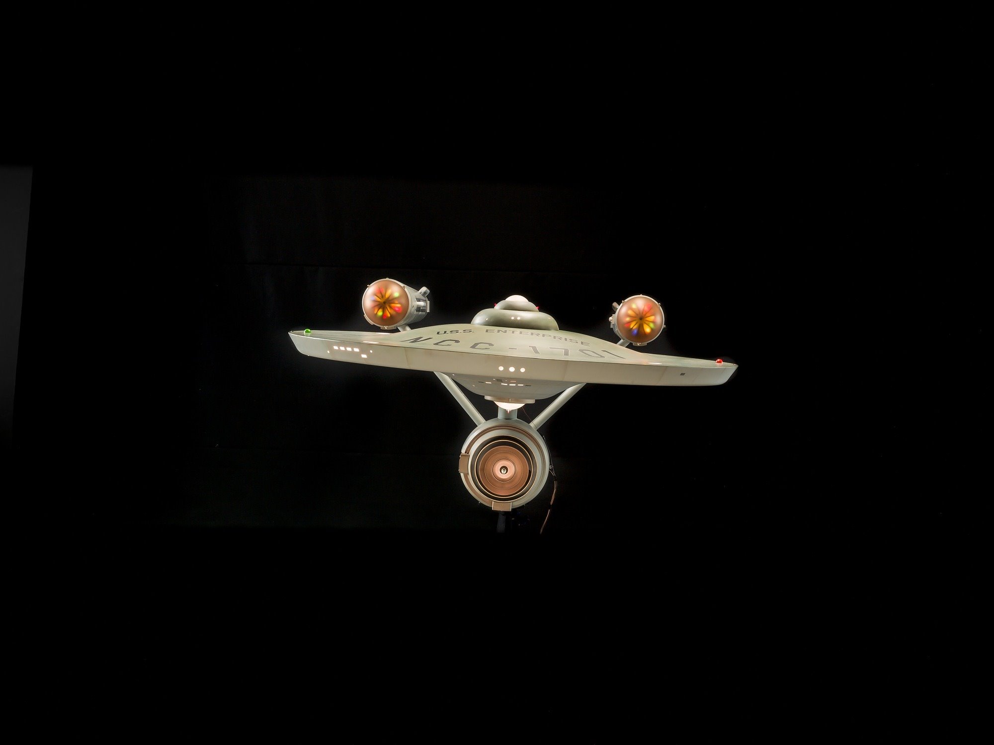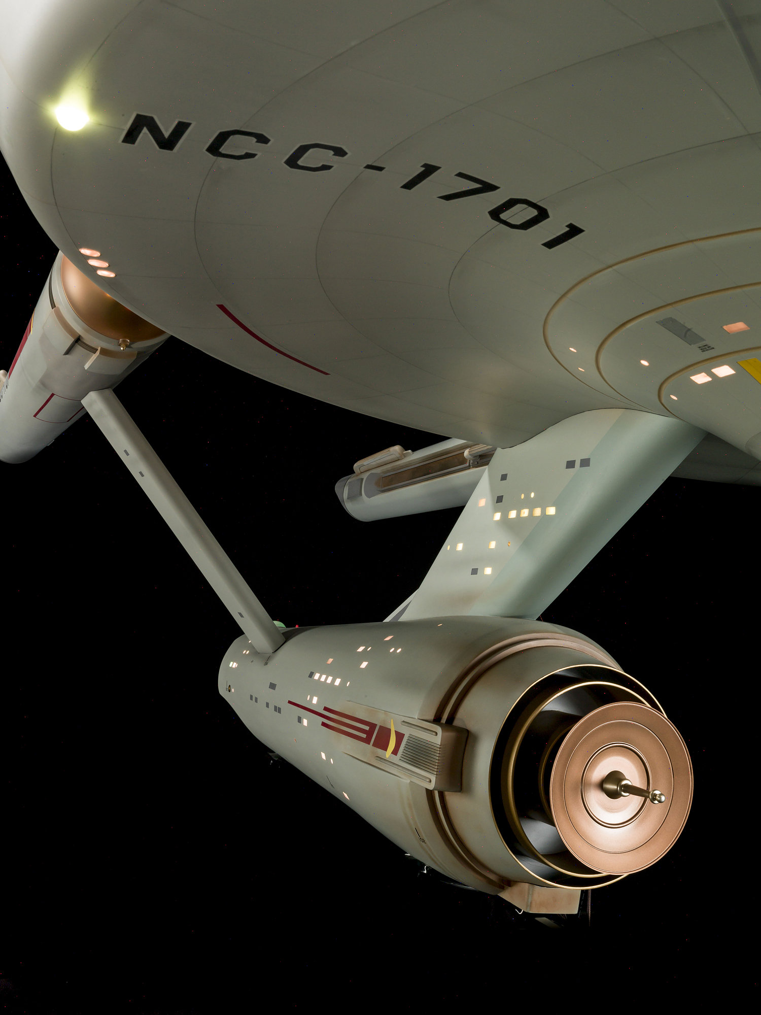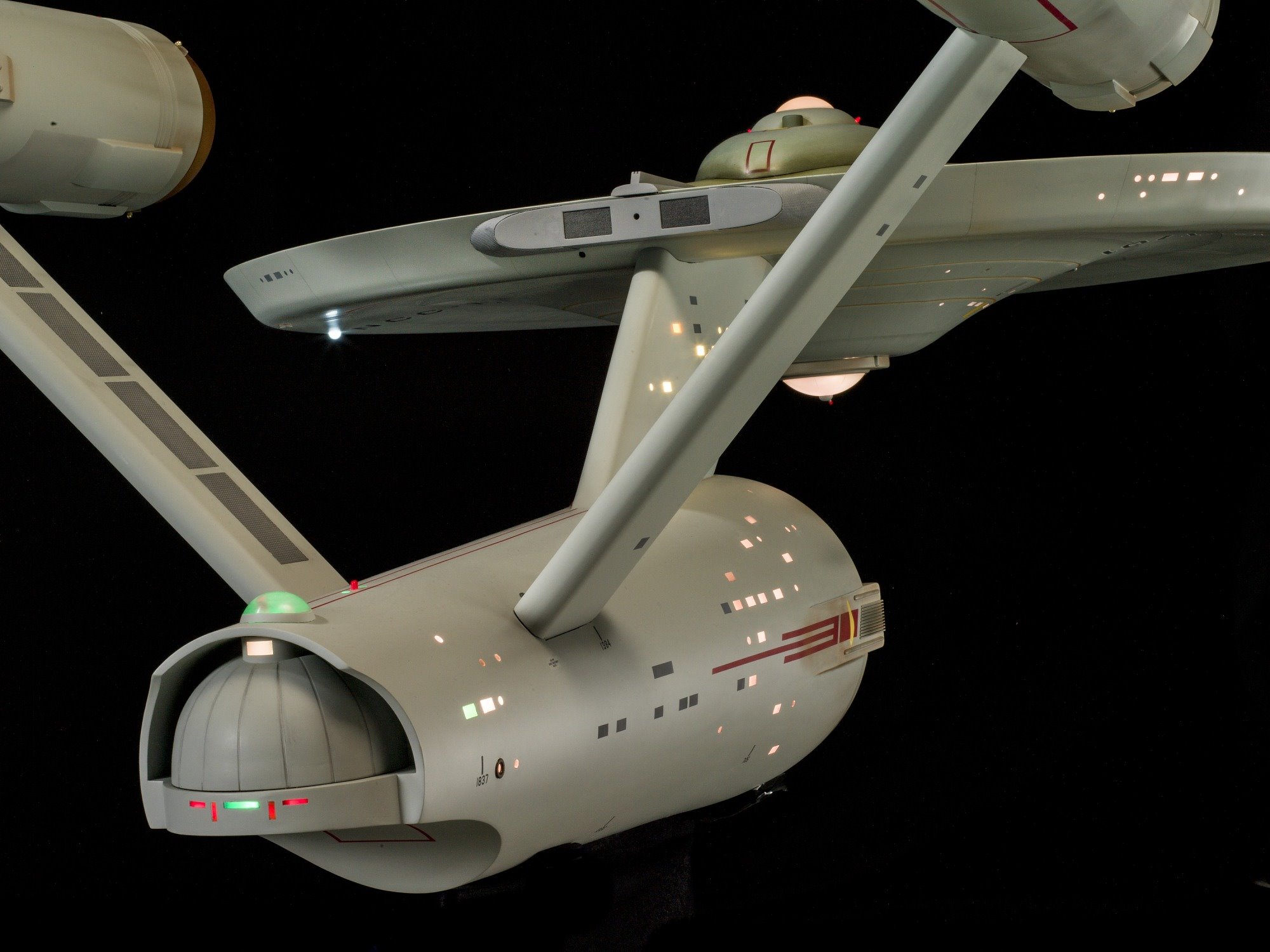 The model’s principal designer, Walter “Matt” Jefferies, created several different ideas for the Enterprise’s design to fit the requirements provided by Star Trek’s creator Gene Roddenberry. To support the final design suggestion, Jefferies also created a rough 4-inch balsa and cardboard prototype. A 33-inch “pilot” model mostly of solid wood was then built by model-maker Richard C. Datin under subcontract to the Howard Anderson Company. Enlarging the plans for that model resulted in the final 11-foot model shown here. The Anderson Company again turned to Datin who contracted it out to Production Model Shop of Burbank, California, with Datin supervising the construction while he did the detail work. The internal lights and nacelle end cap effects were added in 1965.