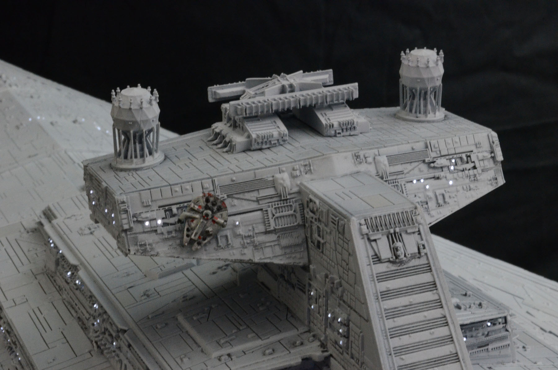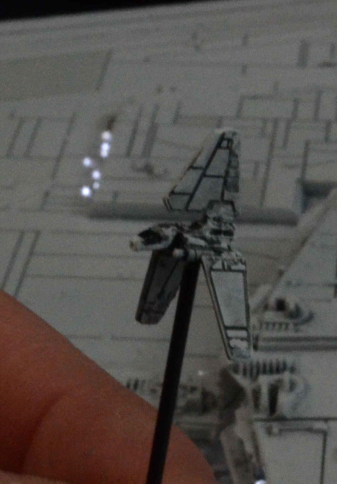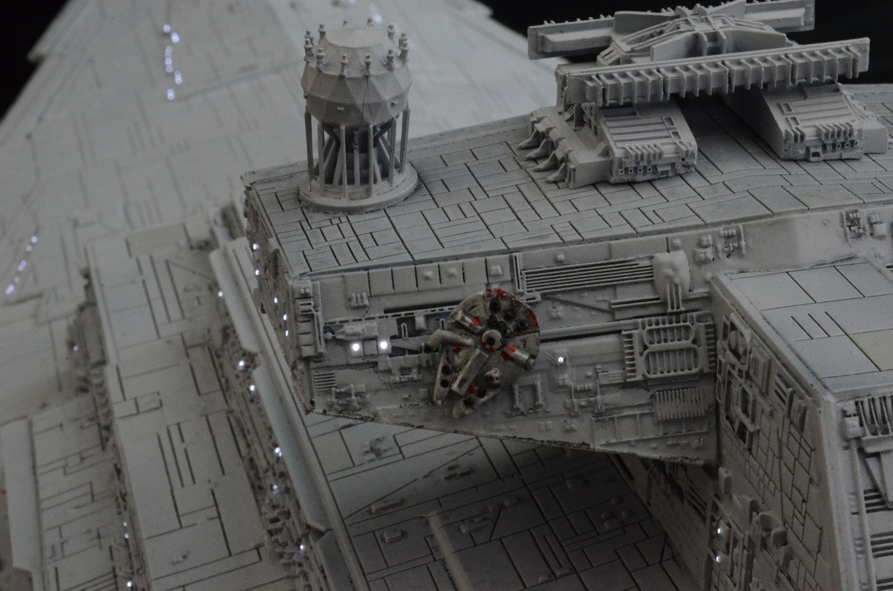 Also included is a 1/2256 Imperial Shuttle and Millennium Falcon. The MF is shown mounted to the bridge but can be added and removed. It is not mounted permanently. The base itself is made of wood and resin and will easily support the ship.