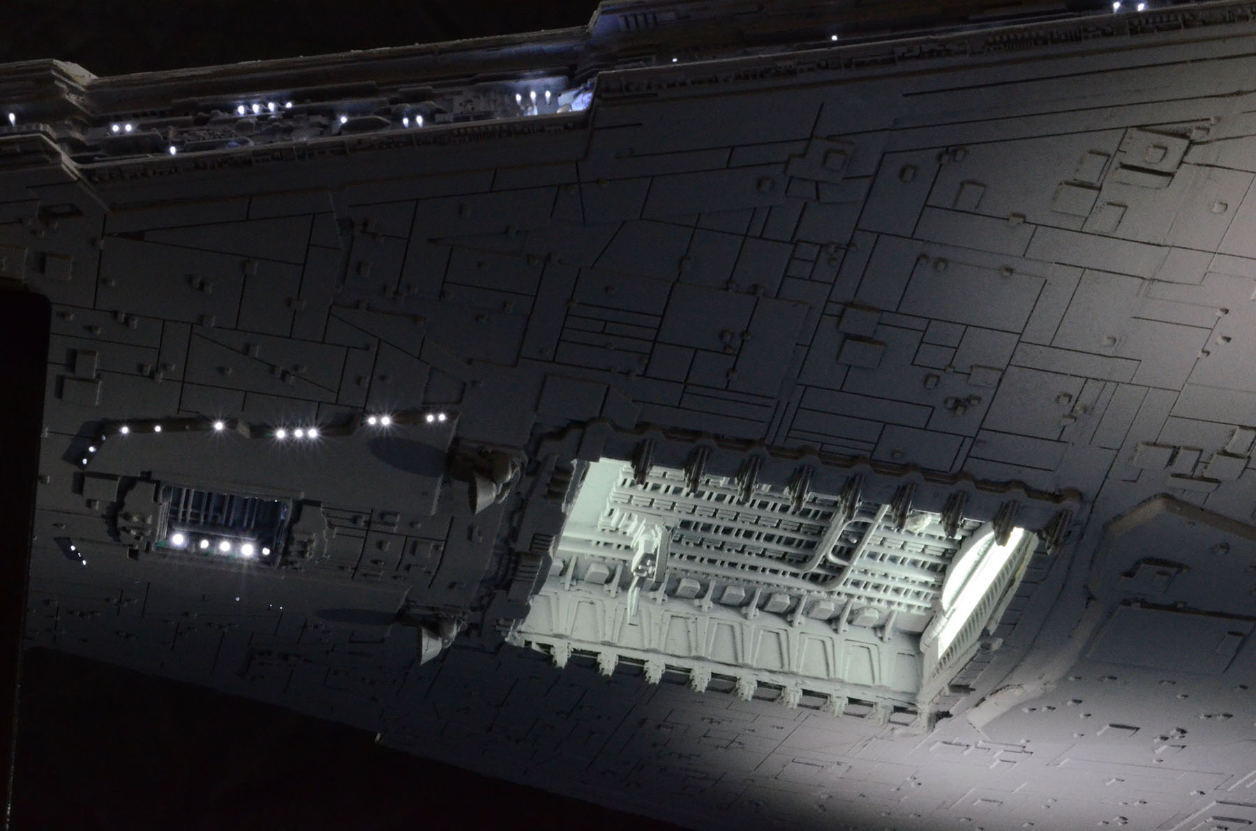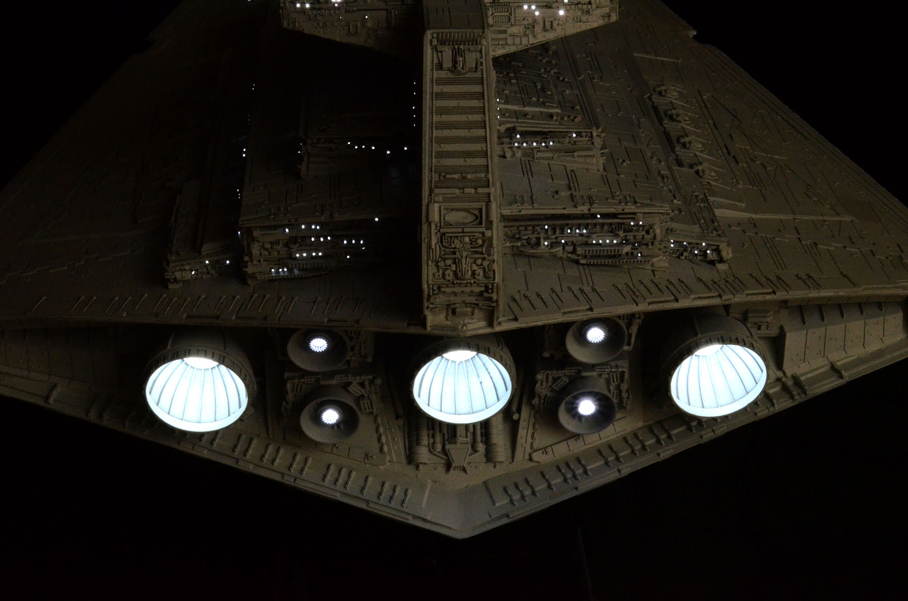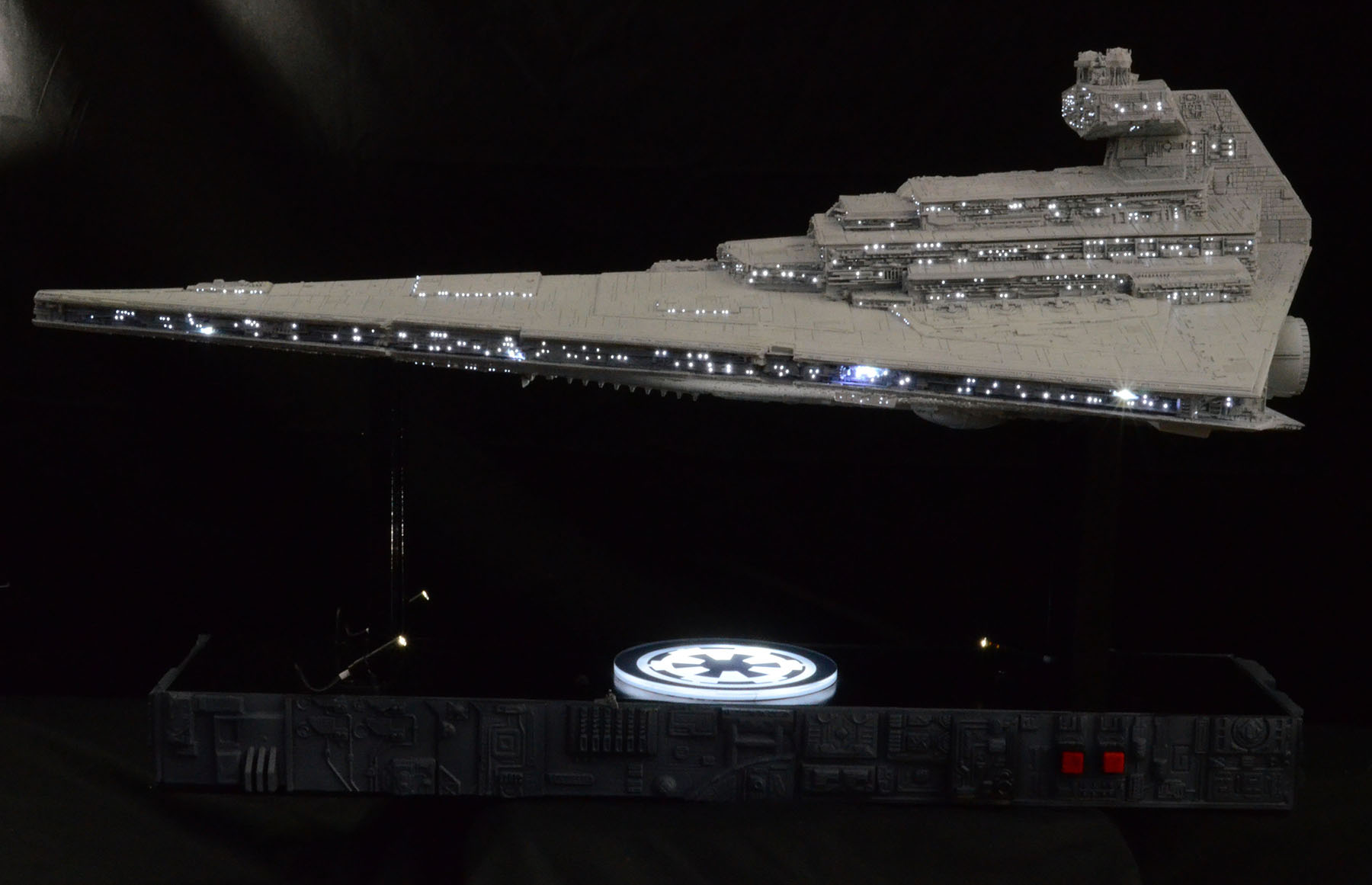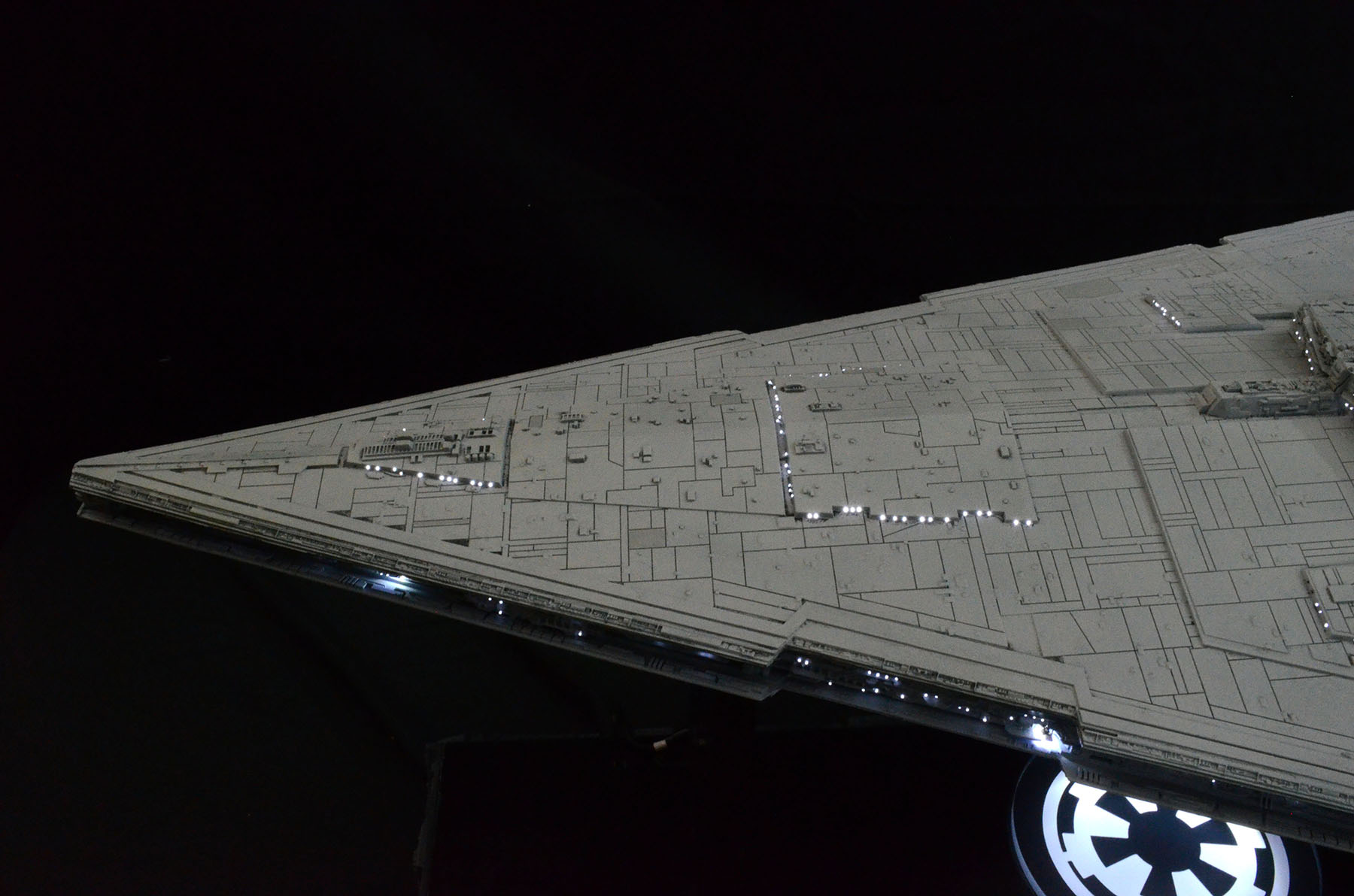 1/2256 scale Imperial Star Destroyer Avenger. Full measurements are 29” long, 19” wide, and about 16” high when sitting on base. The model is fully lit with fiber optic and LED lighting. All wires are hidden in the base and the connector is mounted in the post, so no visible connections or wires in the display. The power to the model and base is supplied by a variable voltage wall adapter. There are separate switches for the base and the model lighting. The base lighting can be turned on/off independently of the model.