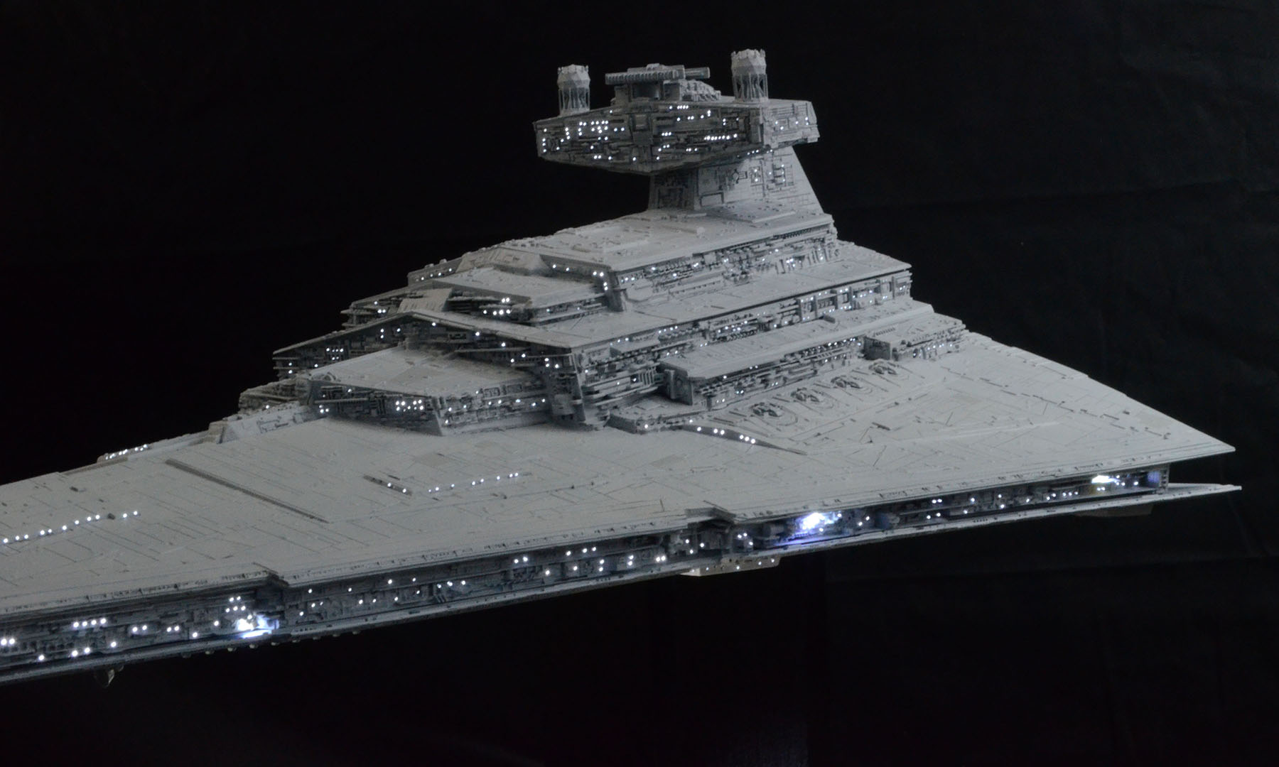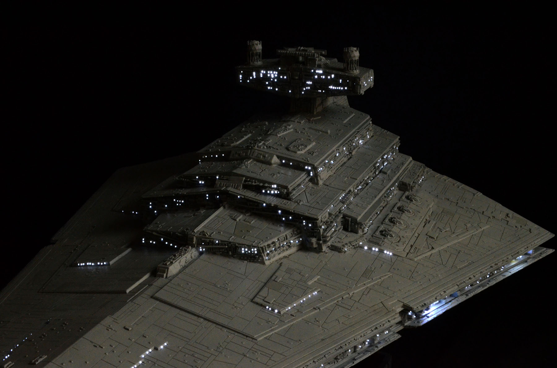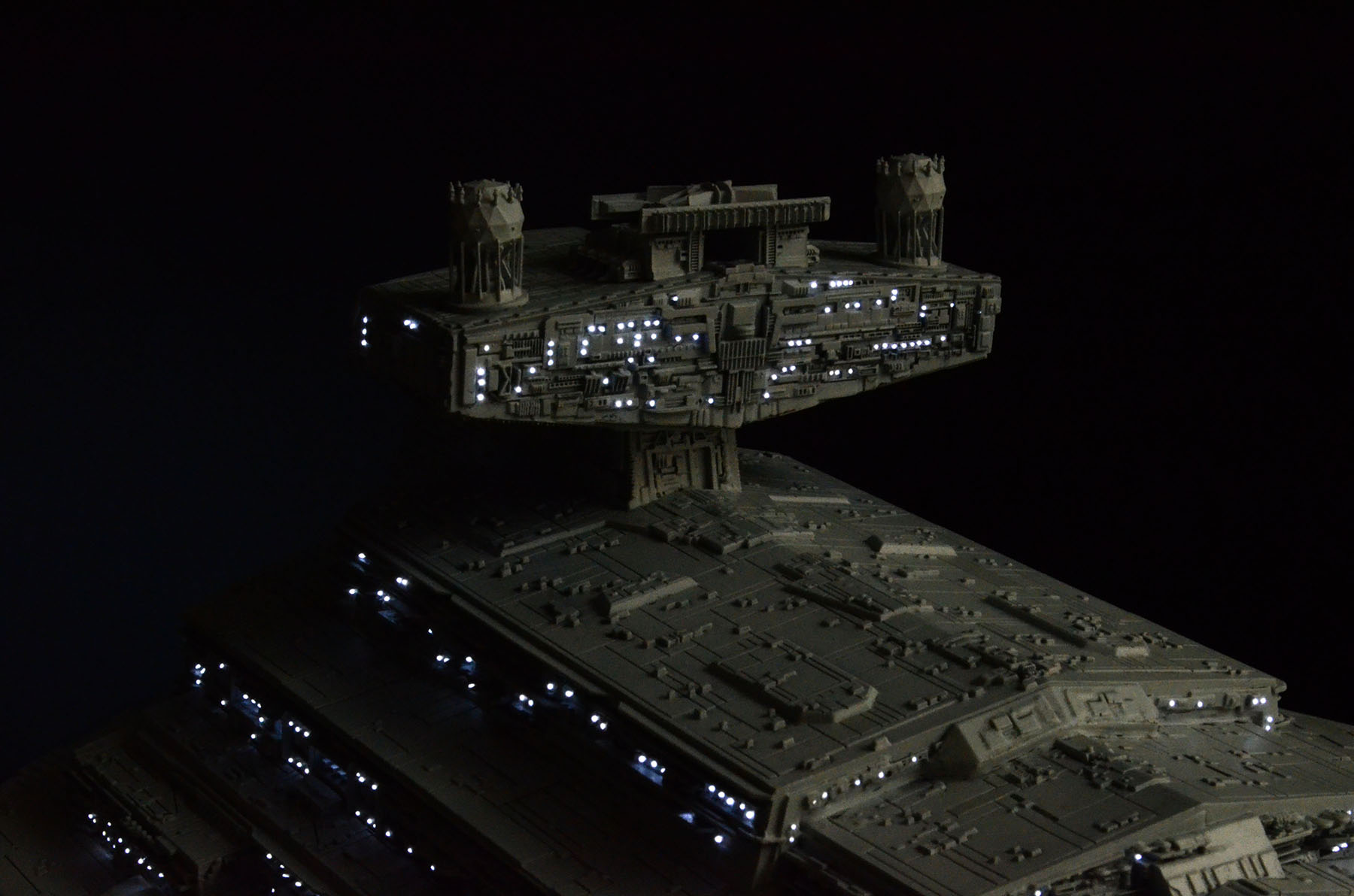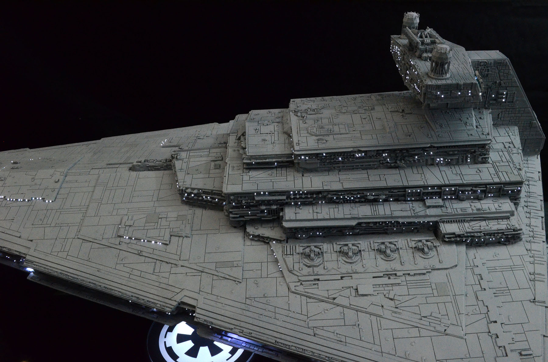 1/2256 scale Imperial Star Destroyer Avenger. Full measurements are 29” long, 19” wide, and about 16” high when sitting on base. The model is fully lit with fiber optic and LED lighting. All wires are hidden in the base and the connector is mounted in the post, so no visible connections or wires in the display. The power to the model and base is supplied by a variable voltage wall adapter. There are separate switches for the base and the model lighting. The base lighting can be turned on/off independently of the model.
