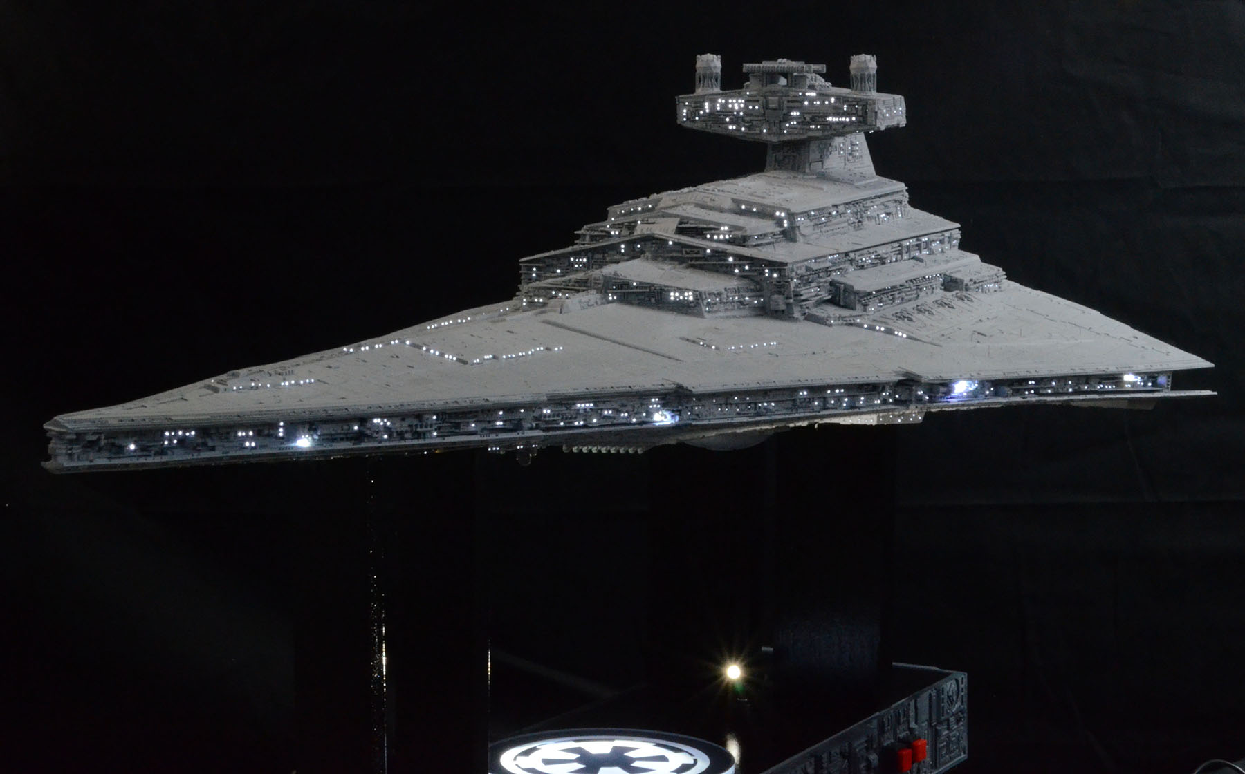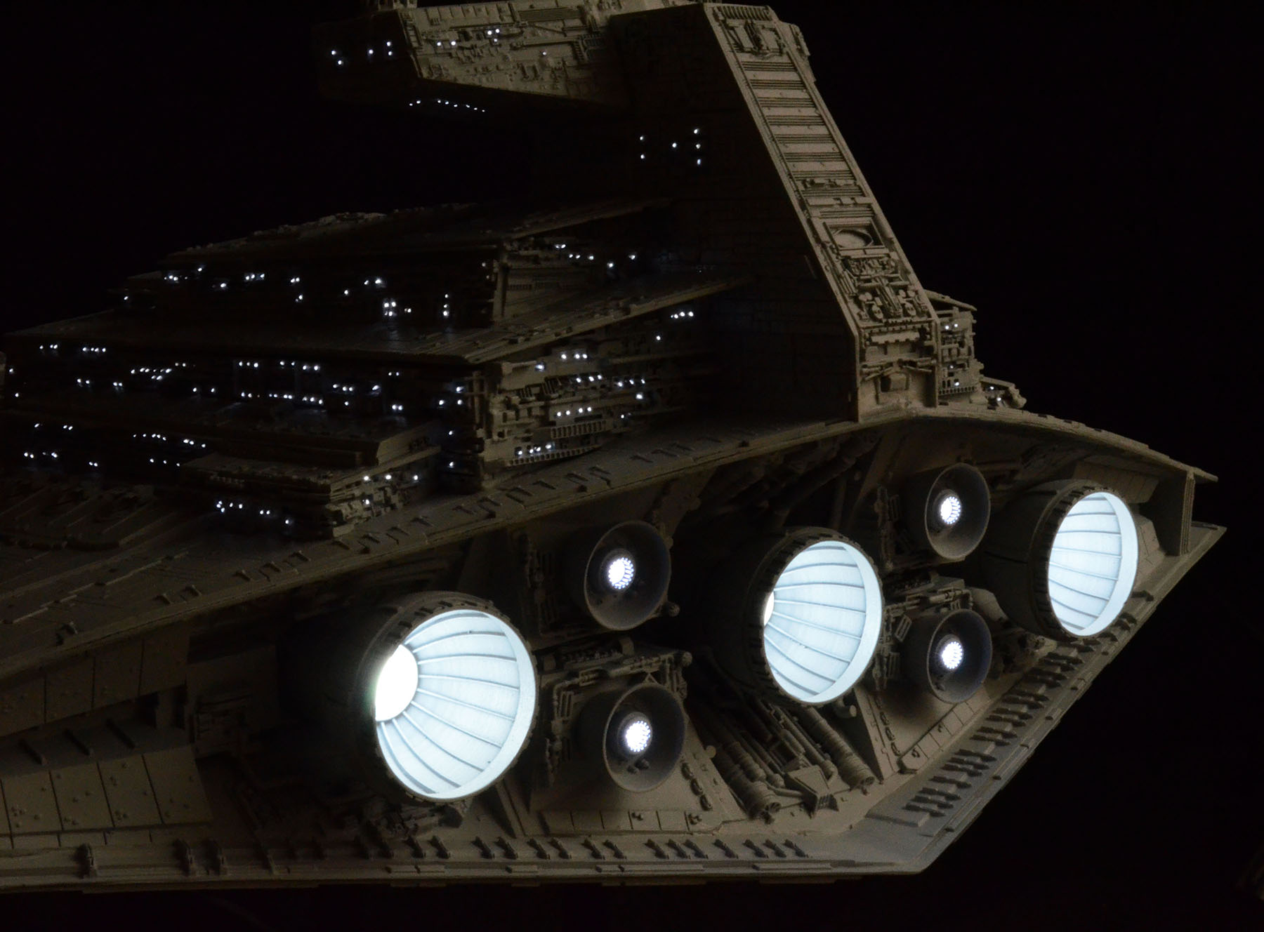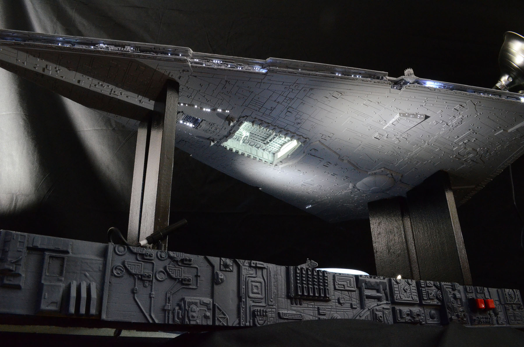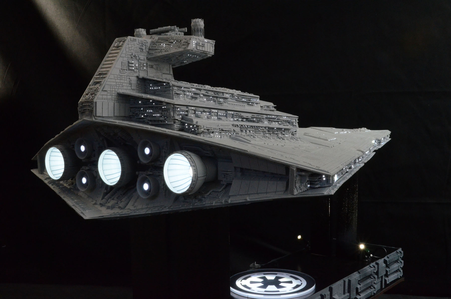 1/2256 scale Imperial Star Destroyer Avenger. Full measurements are 29” long, 19” wide, and about 16” high when sitting on base. The model is fully lit with fiber optic and LED lighting. All wires are hidden in the base and the connector is mounted in the post, so no visible connections or wires in the display. The power to the model and base is supplied by a variable voltage wall adapter. There are separate switches for the base and the model lighting. The base lighting can be turned on/off independently of the model.