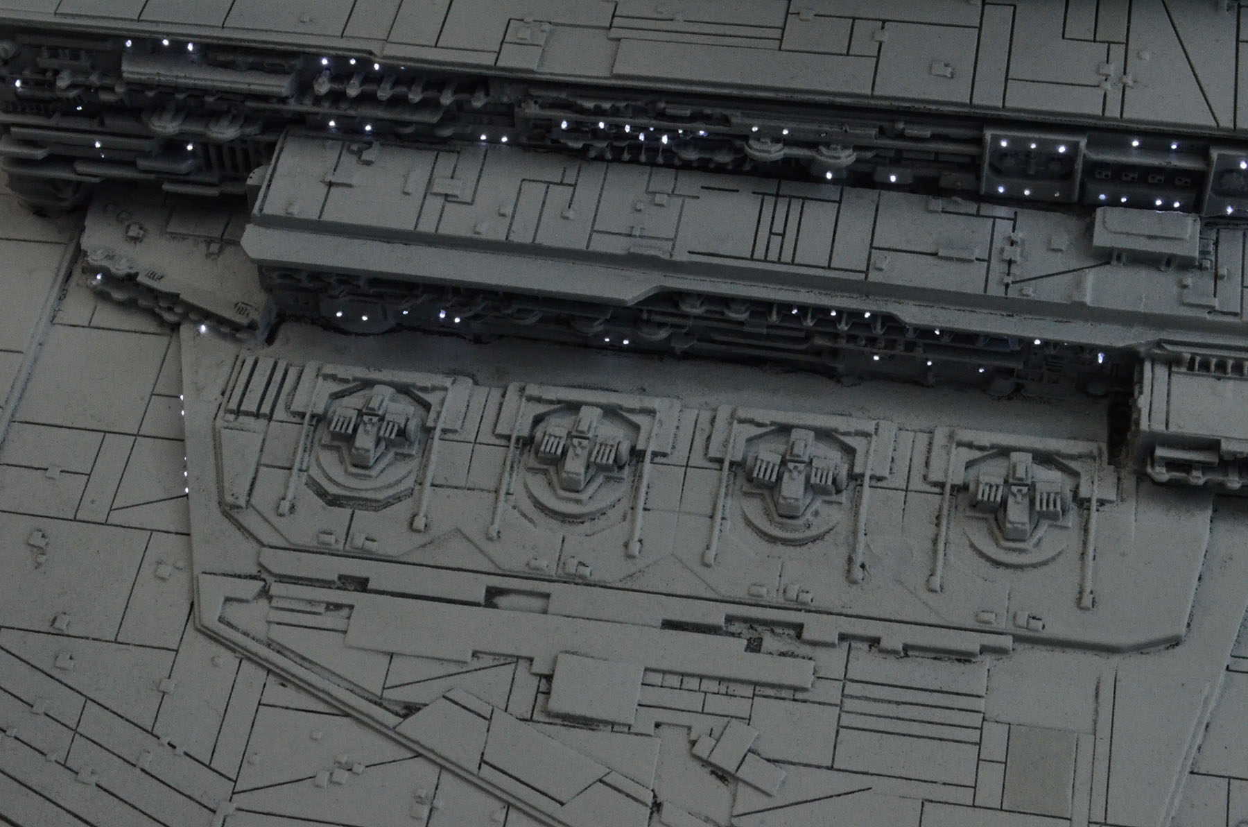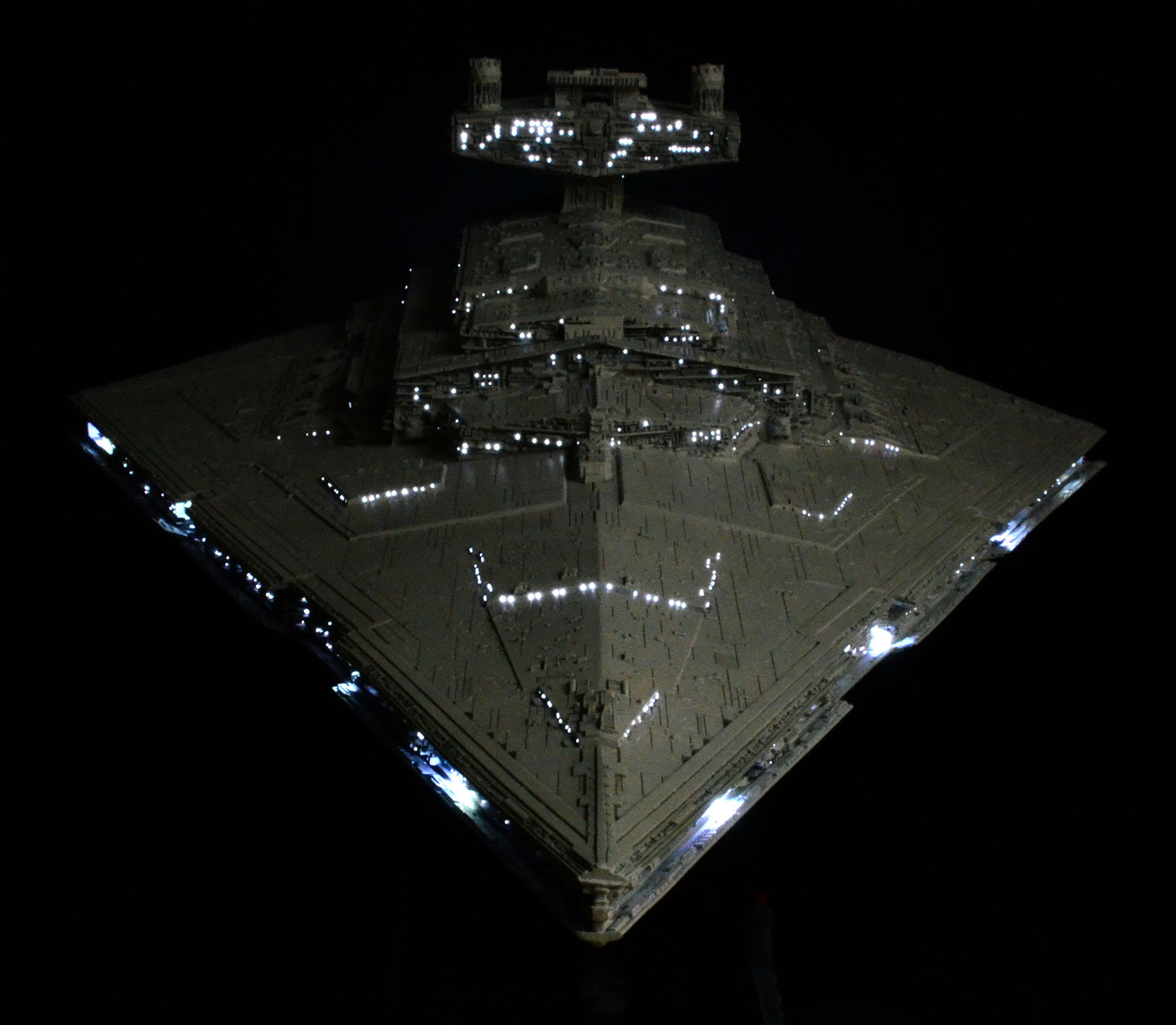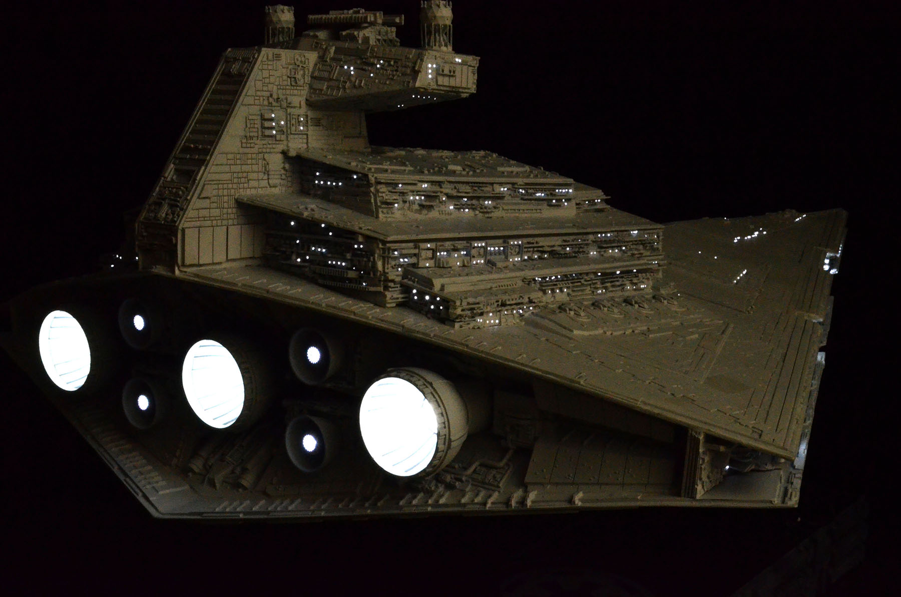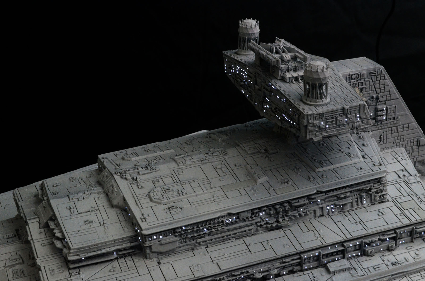 1/2256 scale Imperial Star Destroyer Avenger. Full measurements are 29” long, 19” wide, and about 16” high when sitting on base. The model is fully lit with fiber optic and LED lighting. All wires are hidden in the base and the connector is mounted in the post, so no visible connections or wires in the display. The power to the model and base is supplied by a variable voltage wall adapter. There are separate switches for the base and the model lighting. The base lighting can be turned on/off independently of the model.