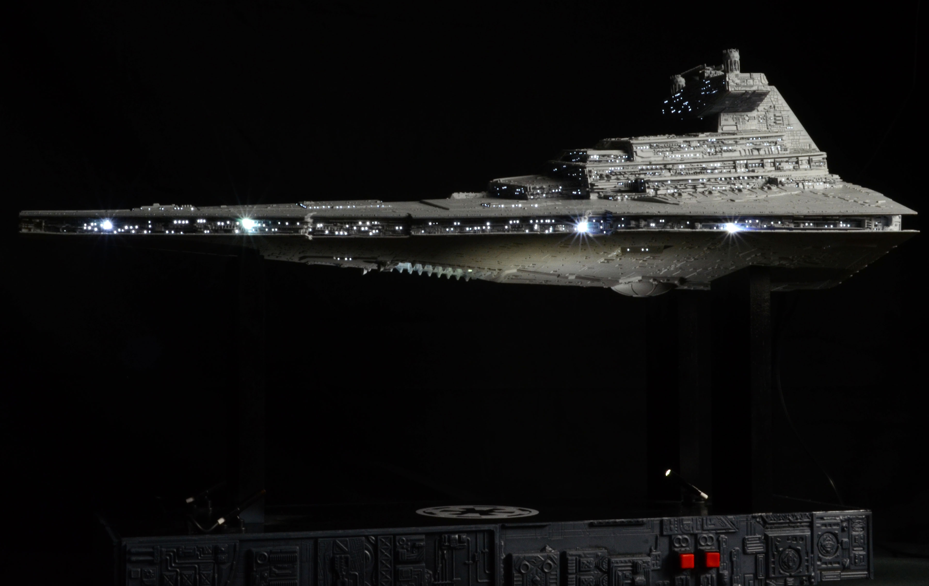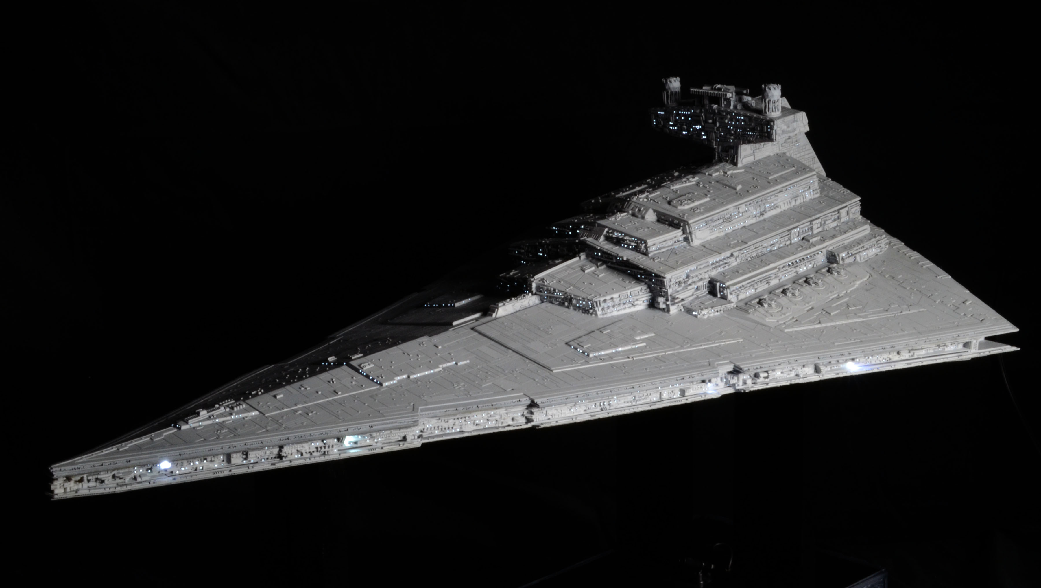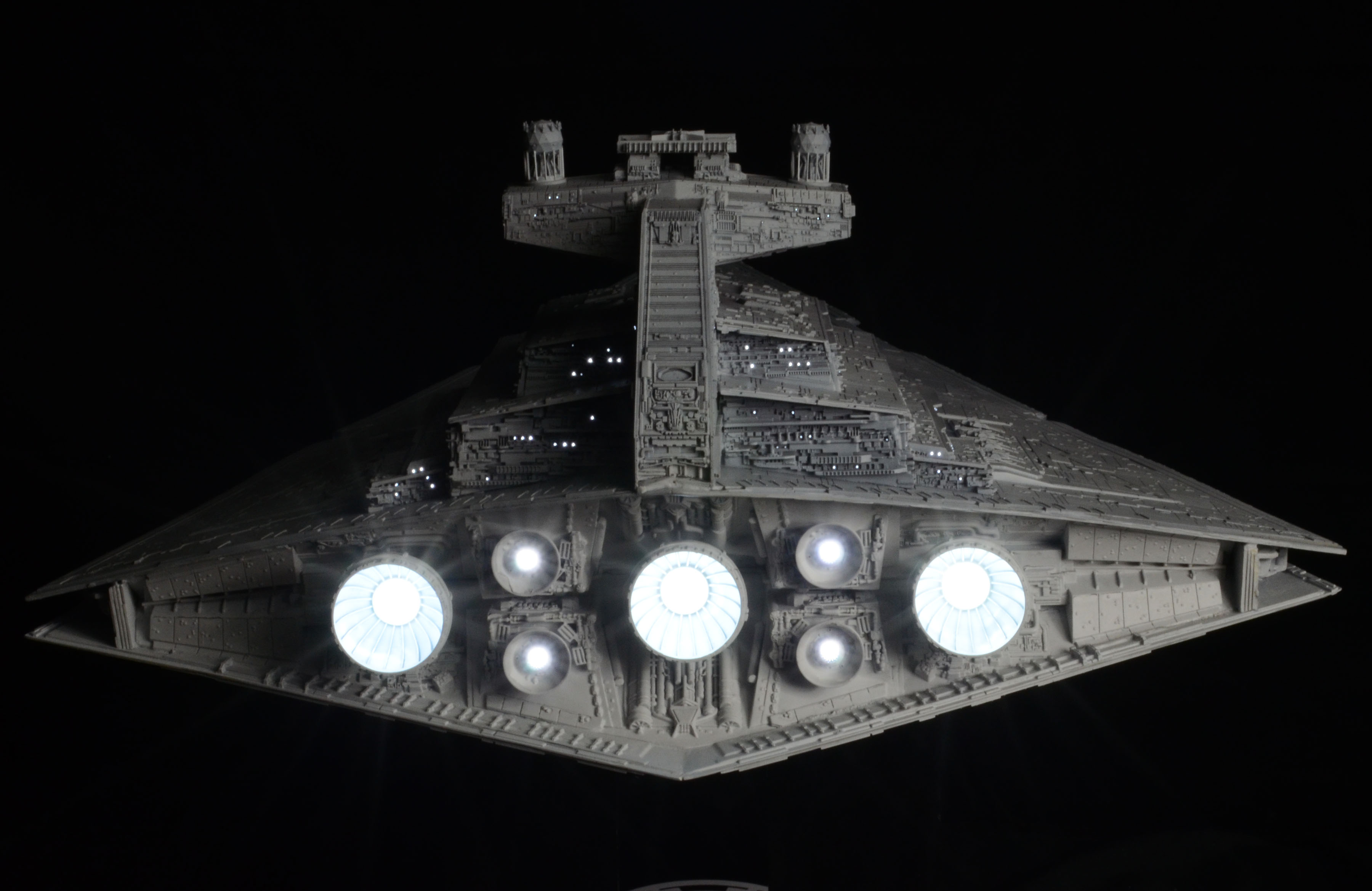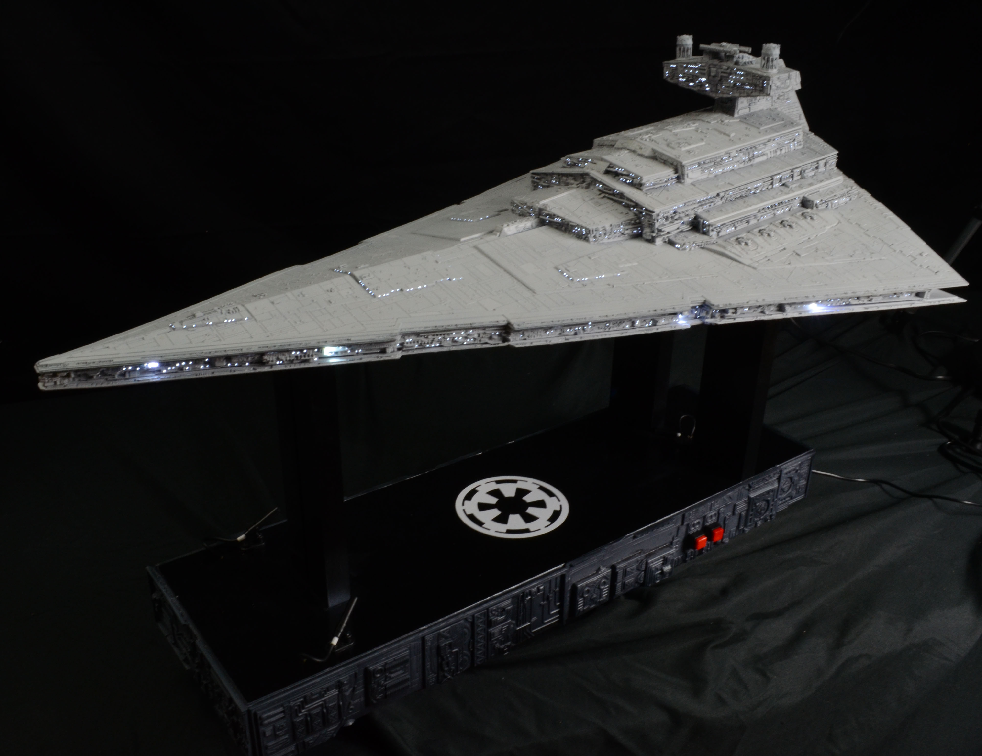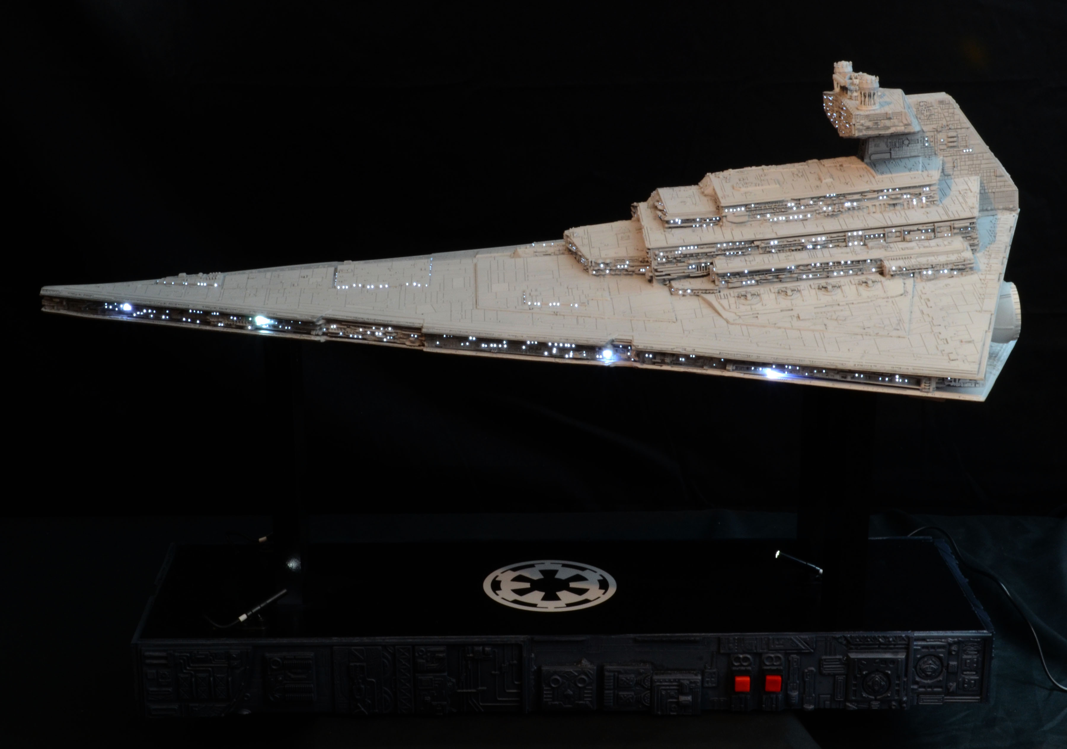 1/2256 scale Imperial Star Destroyer model made from a resin kit. This is a highly-detailed casting of the ISD at 29” long. The ship is lit with LED and fiber optic lighting, and is powered by a plug hidden in the base support. All lights are controlled by the switch on the base, which turns the model lights on/off and the spot lights on the base on/off as well. The model measures 29” long, and about 17” wide.