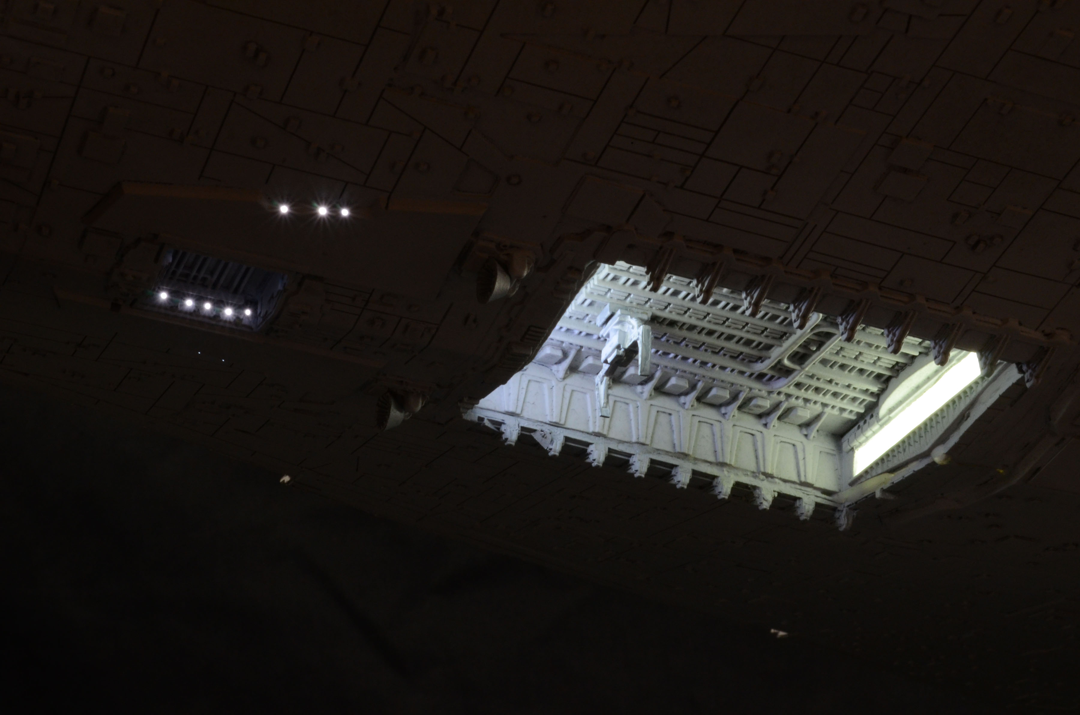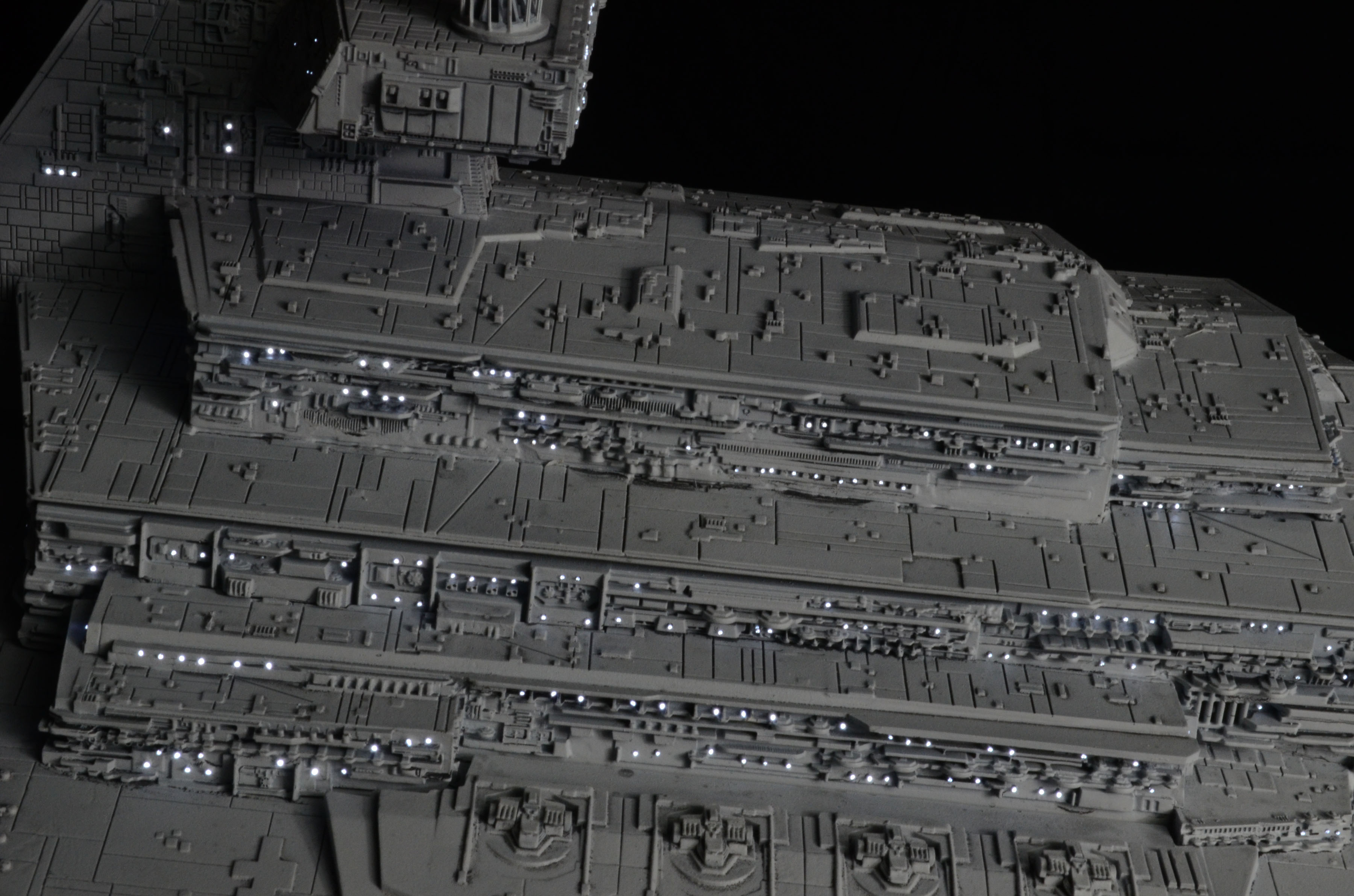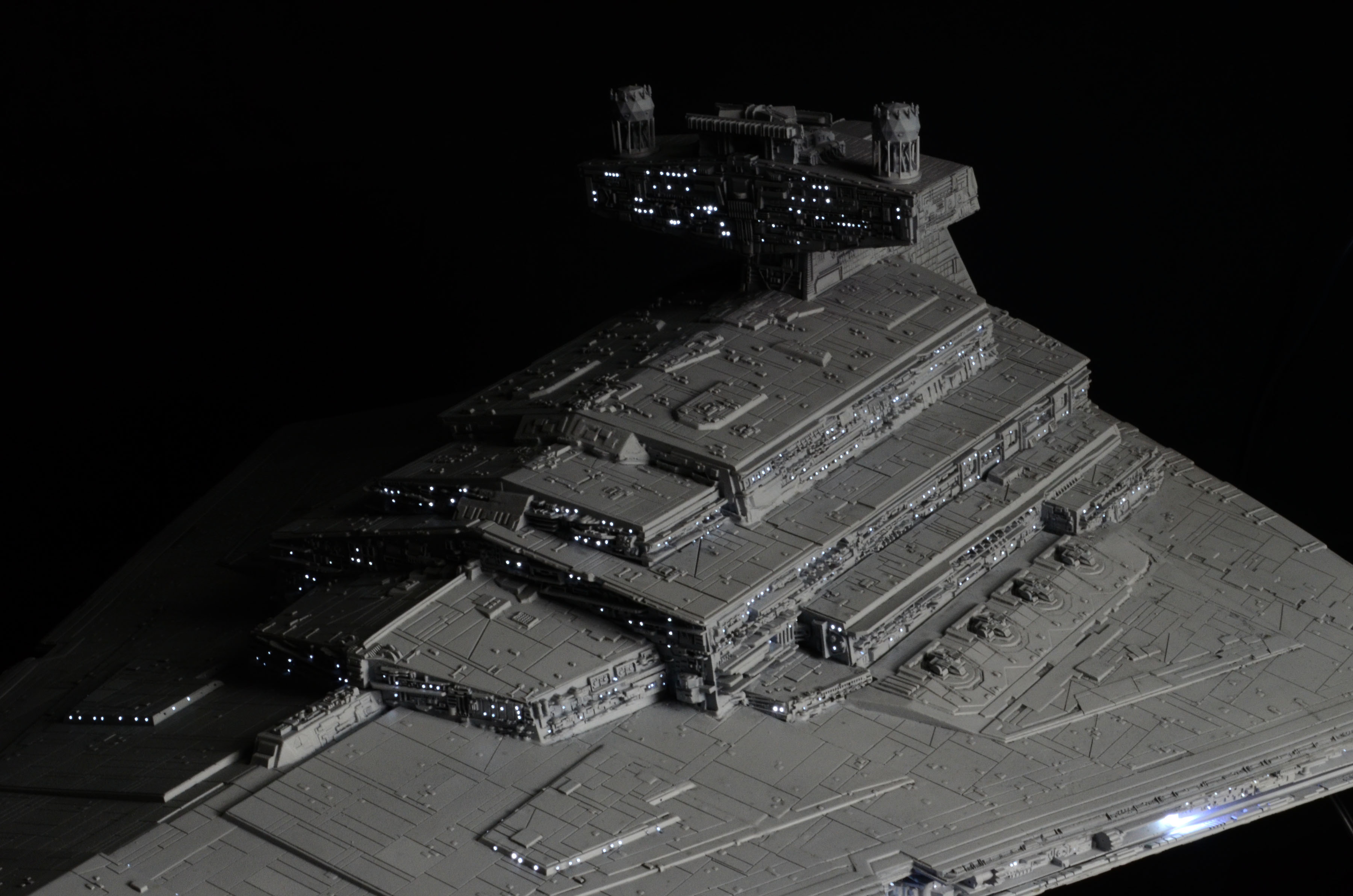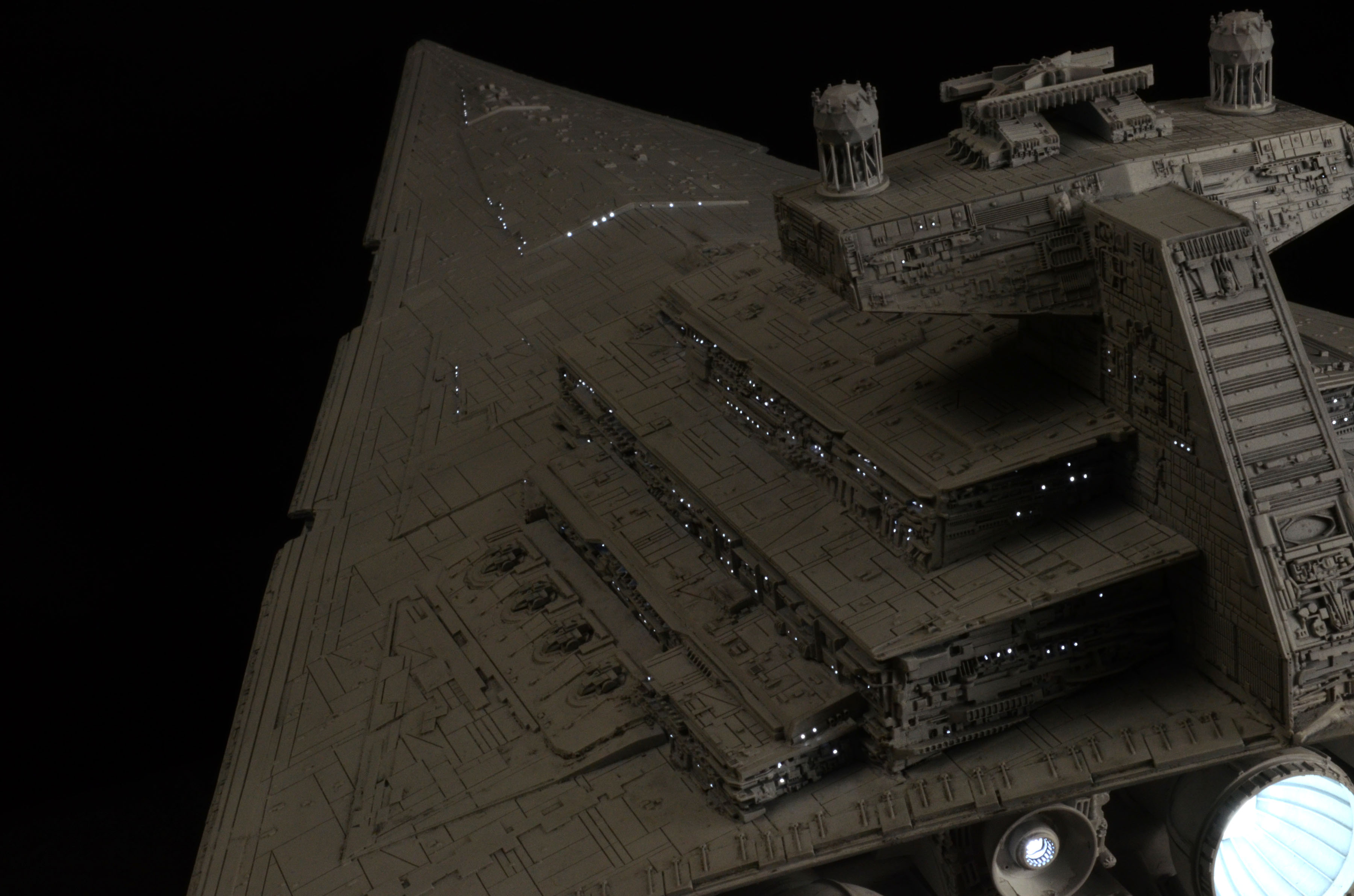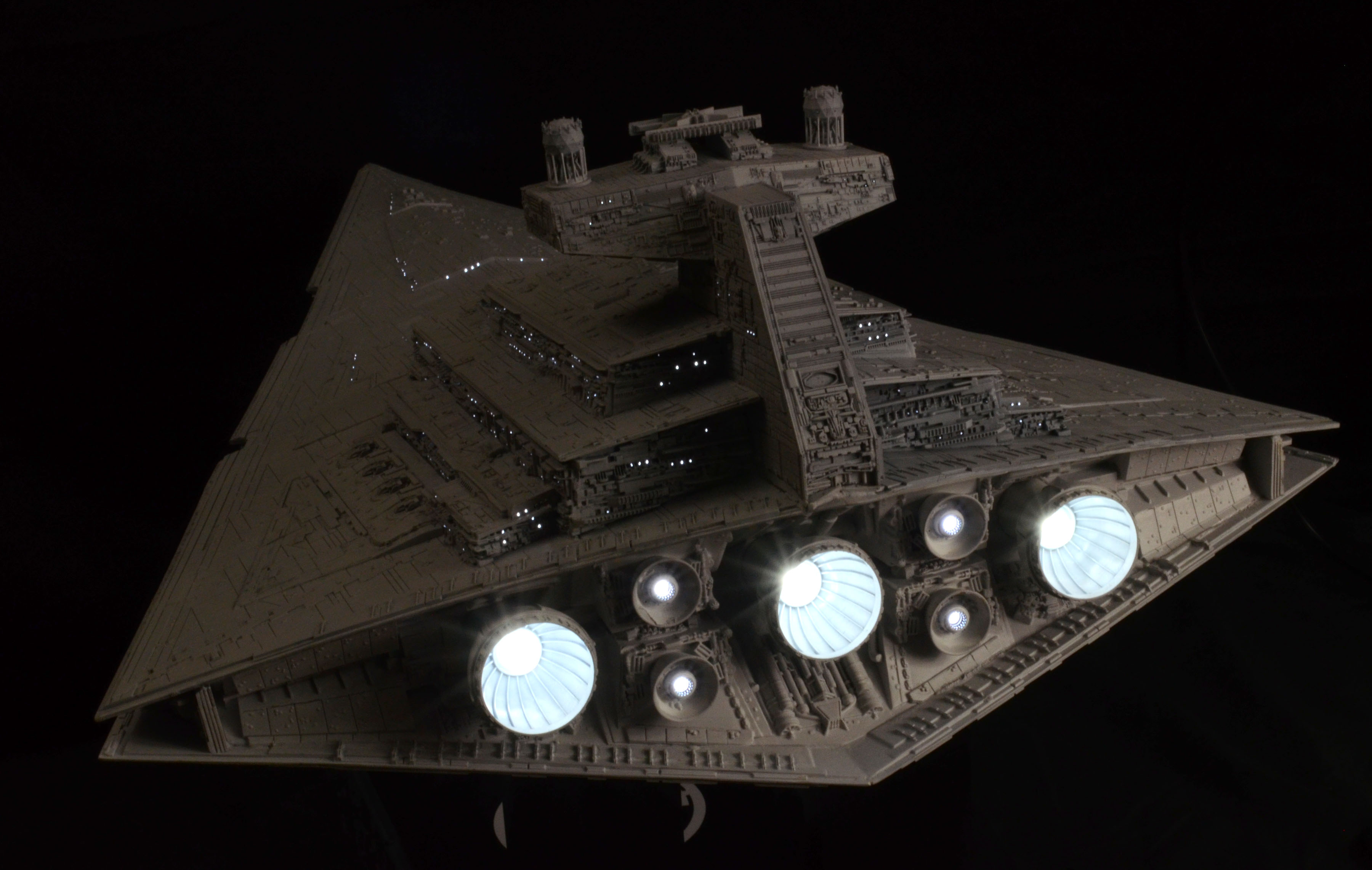 1/2256 scale Imperial Star Destroyer model made from a resin kit. This is a highly-detailed casting of the ISD at 29” long. The ship is lit with LED and fiber optic lighting, and is powered by a plug hidden in the base support. All lights are controlled by the switch on the base, which turns the model lights on/off and the spot lights on the base on/off as well. The model measures 29” long, and about 17” wide.