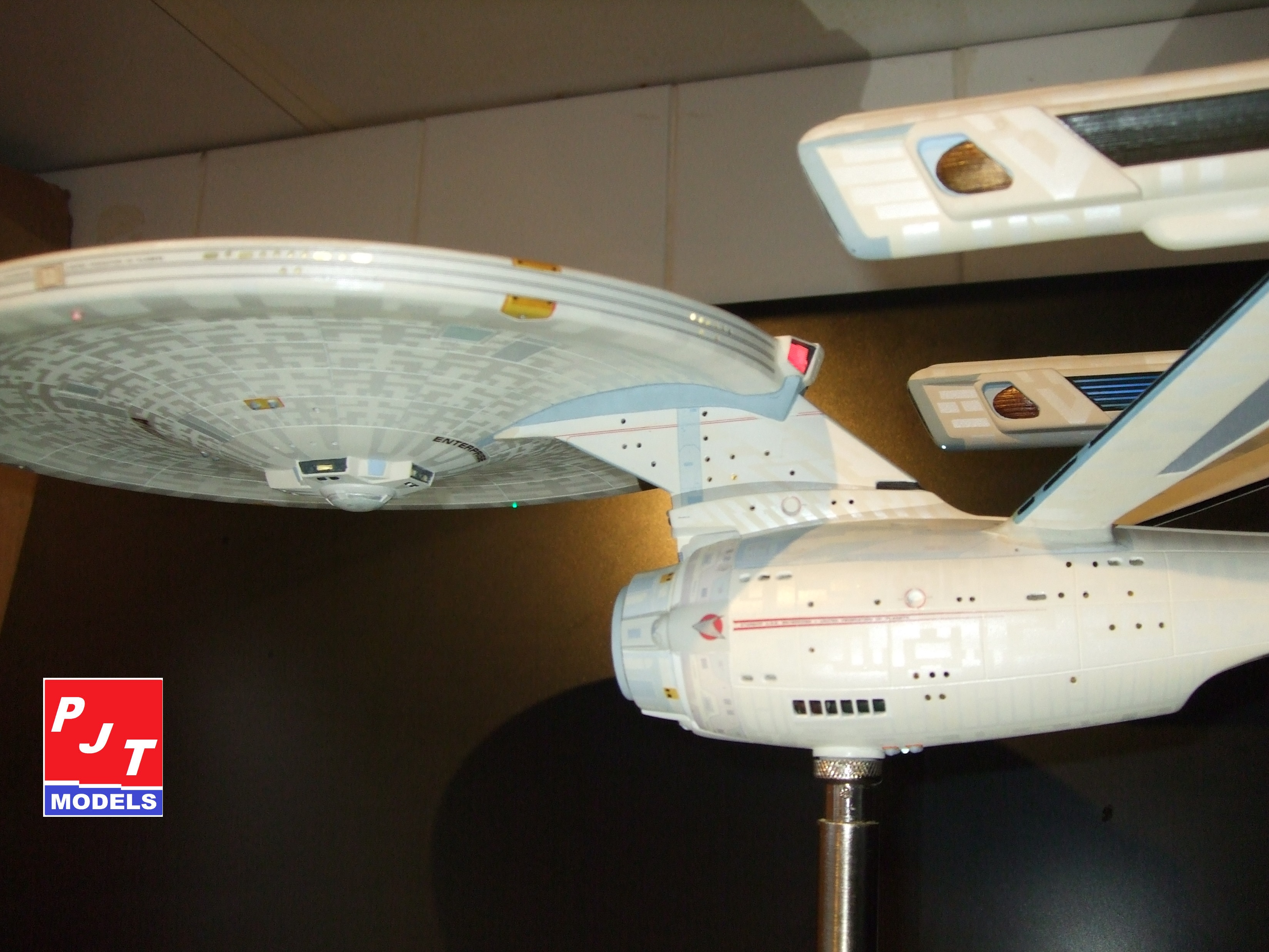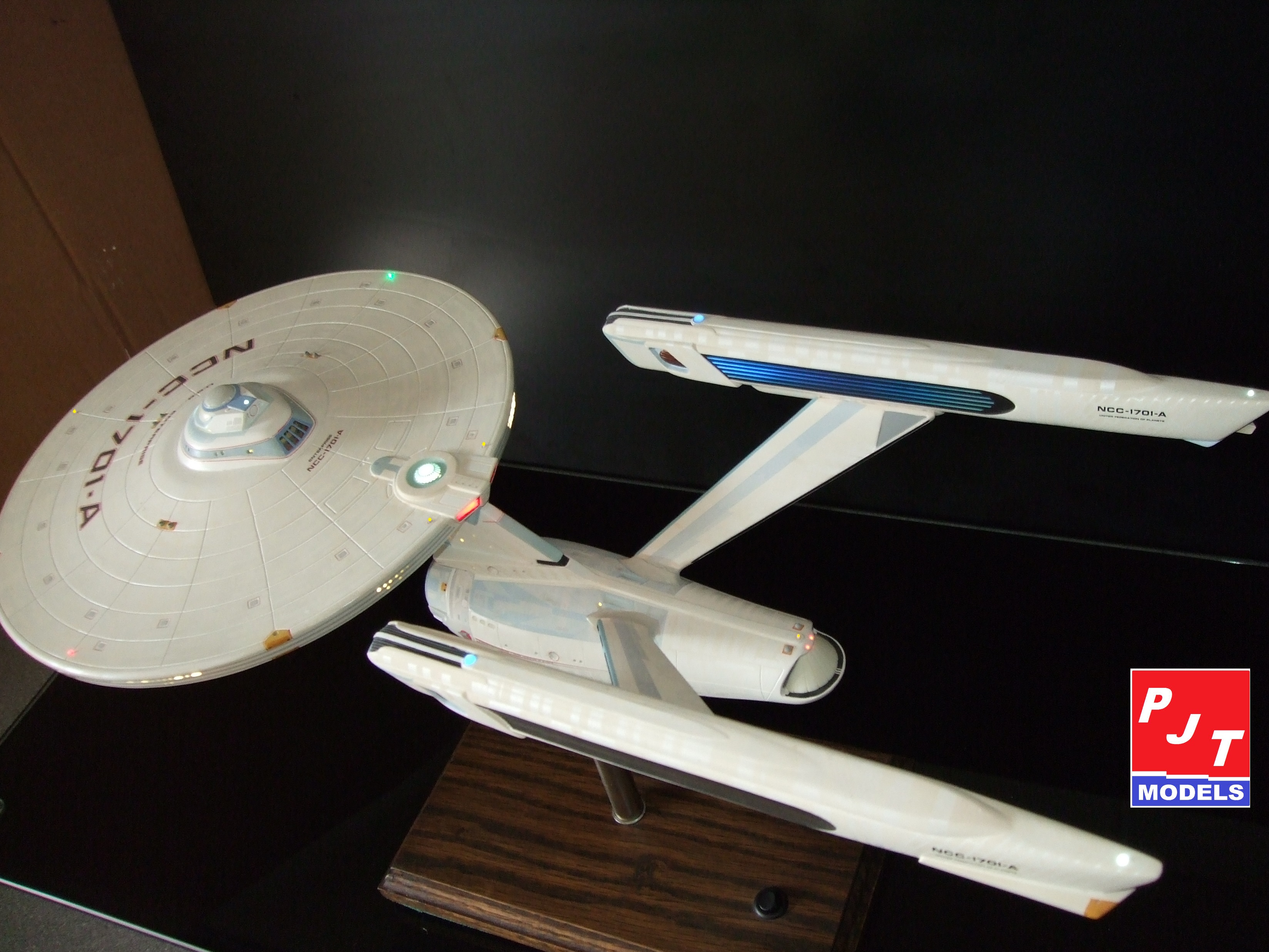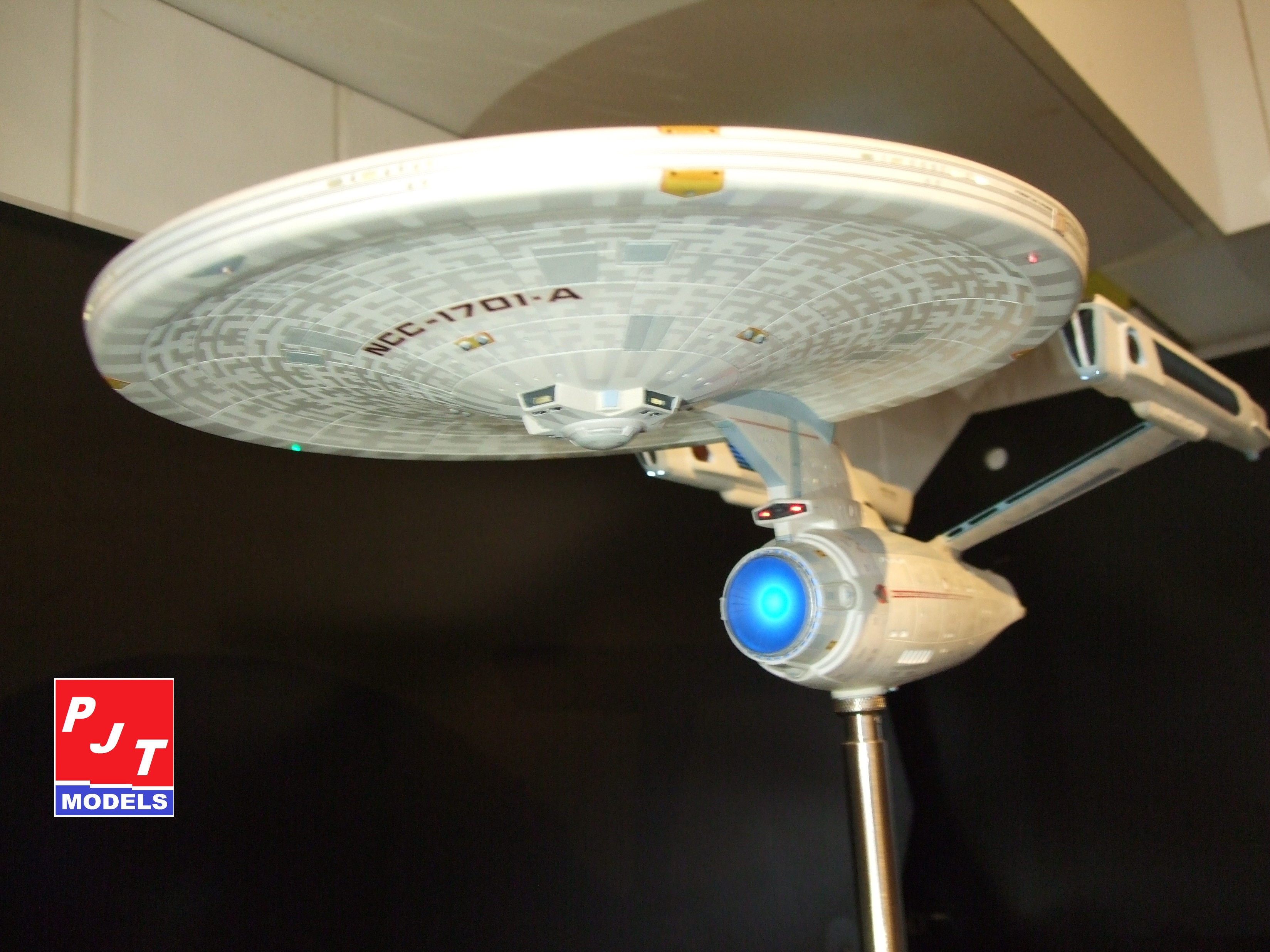 JUST SOLD: This is the U.S.S ENTERPRISE NCC-1701-A refit model which is fully lit with active flashing navigation and strobe lights. This beautiful ship has been produced from the AMT ERTL 22″ kit. I have made extensive alterations to make it look closely to the studio filming model. All the paint has been airbrushed on including the Aztec’s. It also features a fully lit VIP lounge and Arboretum, both with scale Starfleet figures.