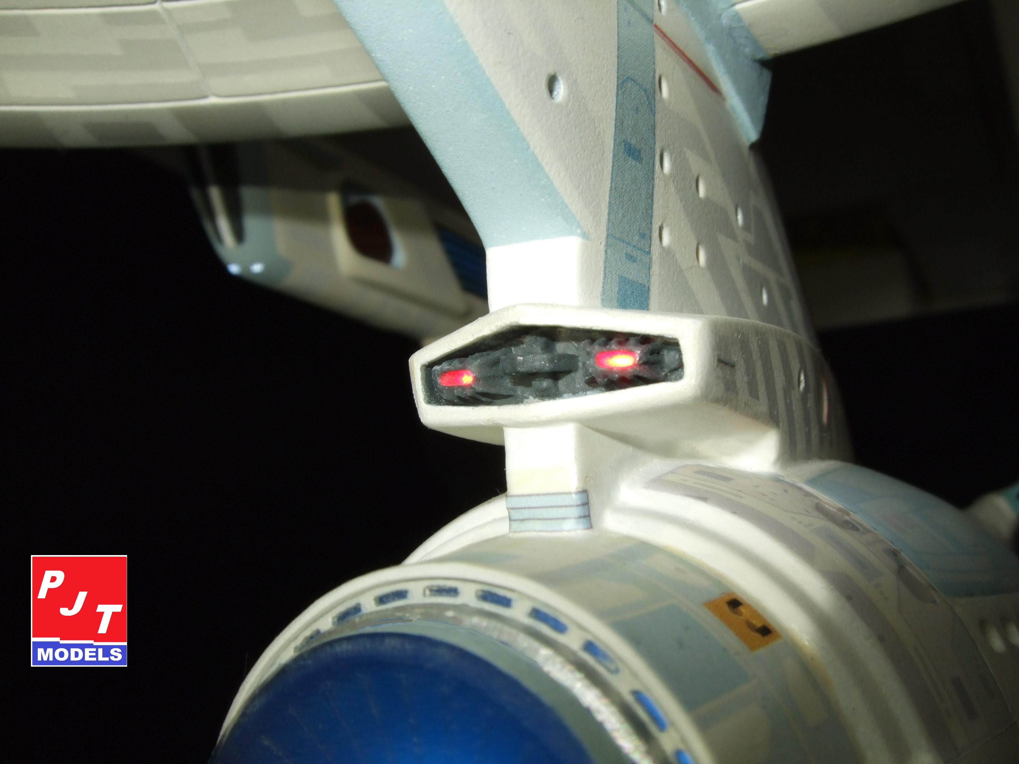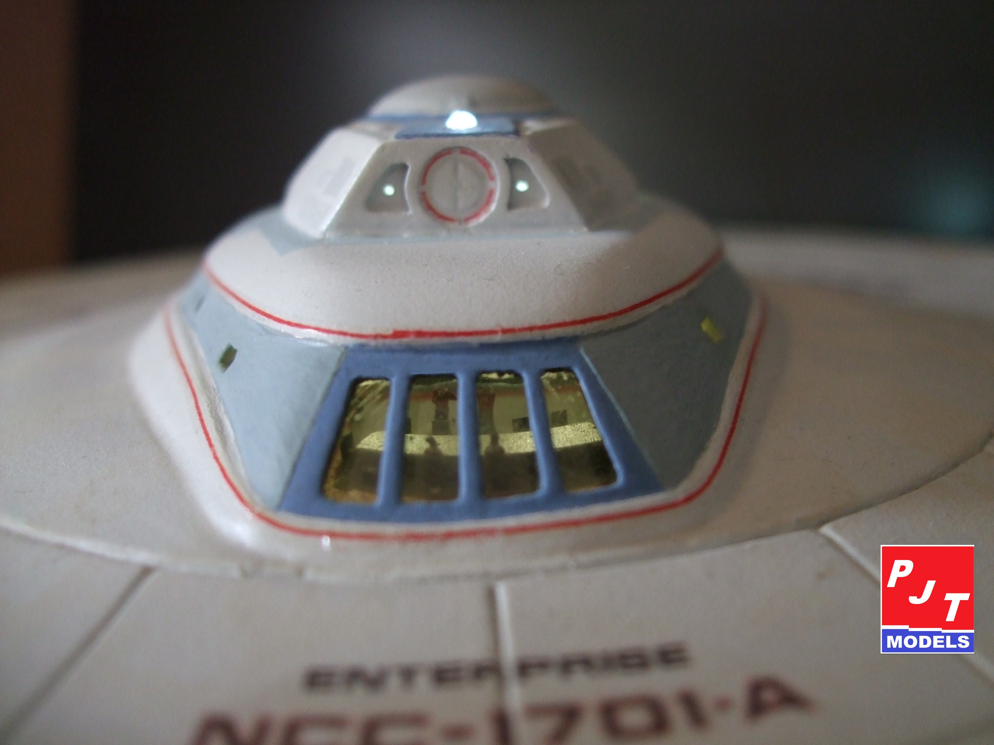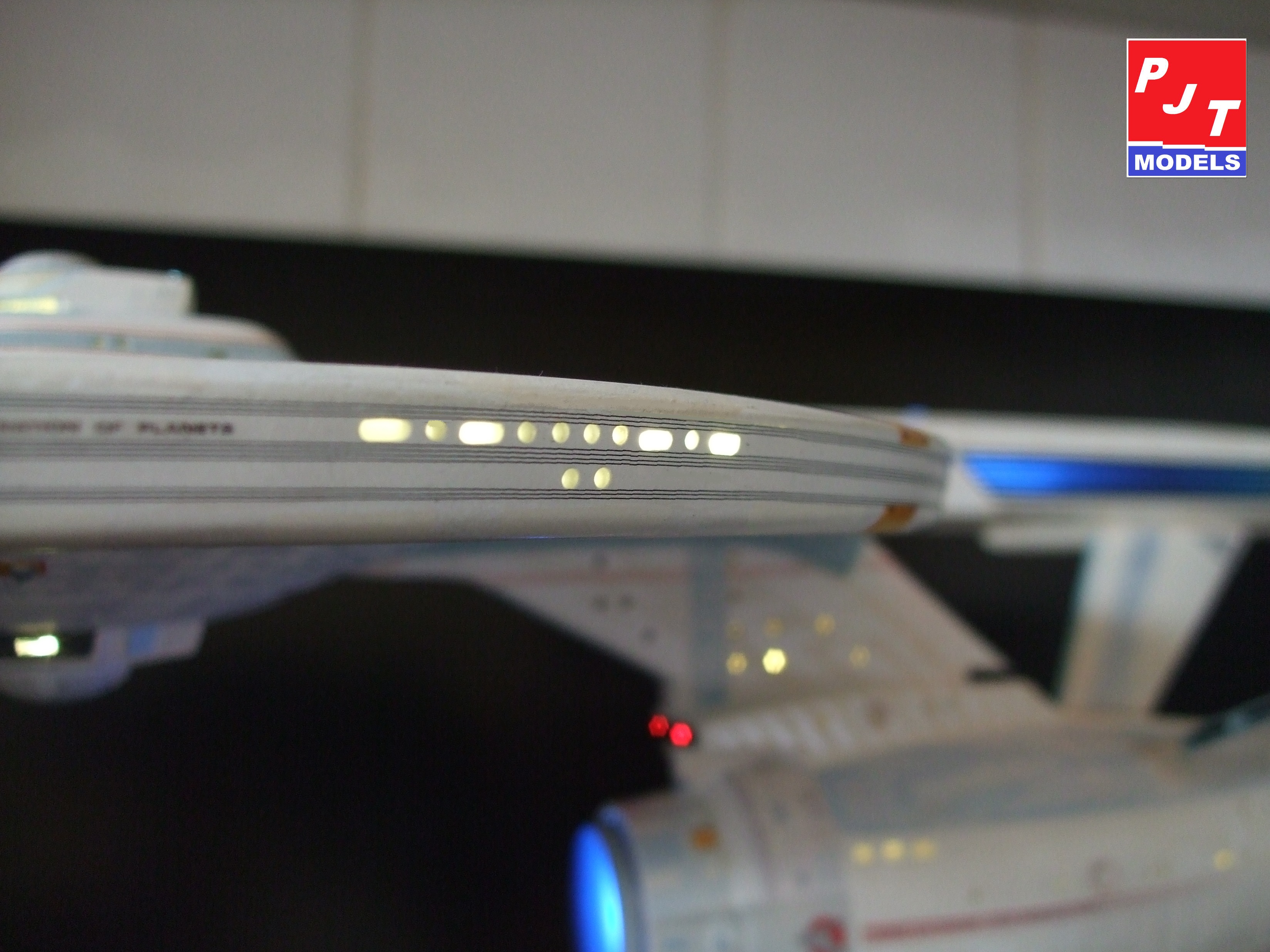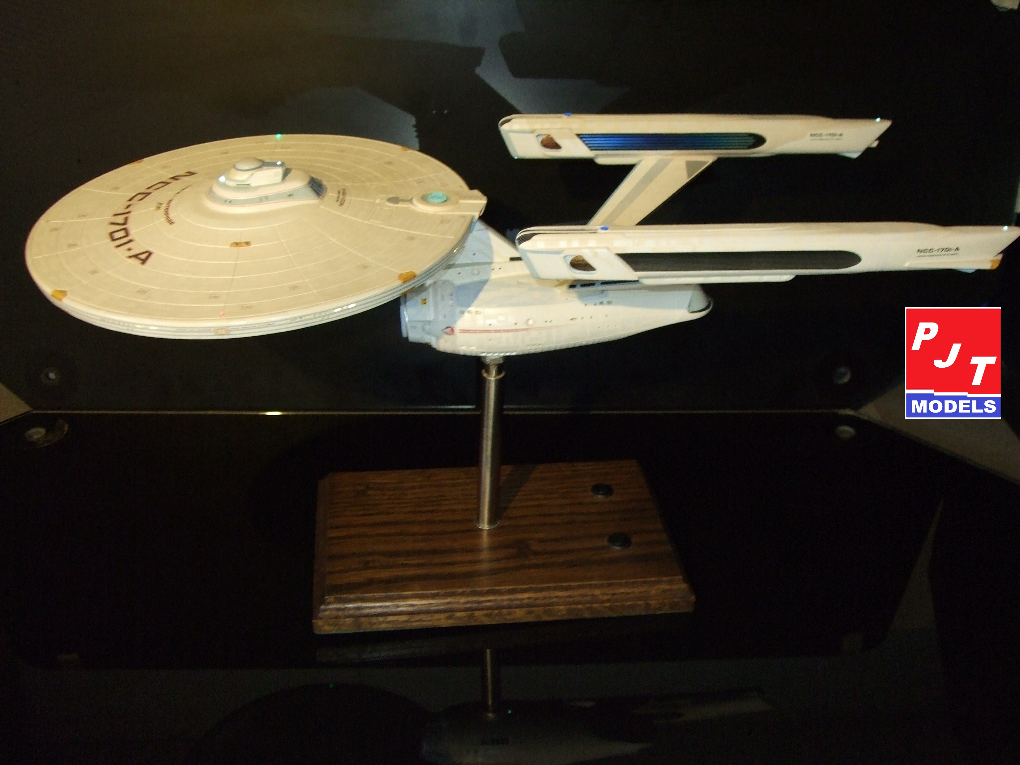 JUST SOLD: This is the U.S.S ENTERPRISE NCC-1701-A refit model which is fully lit with active flashing navigation and strobe lights. This beautiful ship has been produced from the AMT ERTL 22″ kit. I have made extensive alterations to make it look closely to the studio filming model. All the paint has been airbrushed on including the Aztec’s. It also features a fully lit VIP lounge and Arboretum, both with scale Starfleet figures.