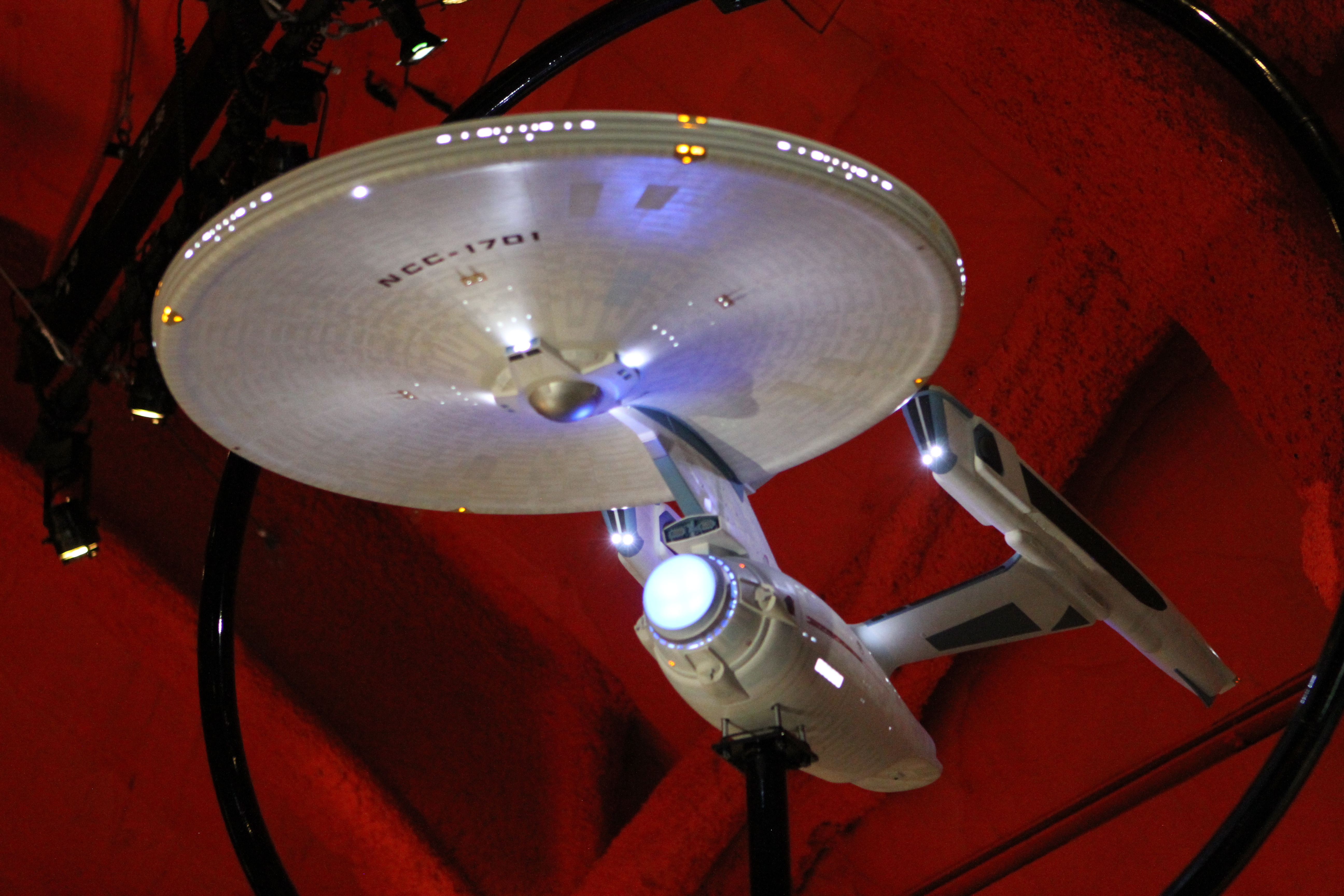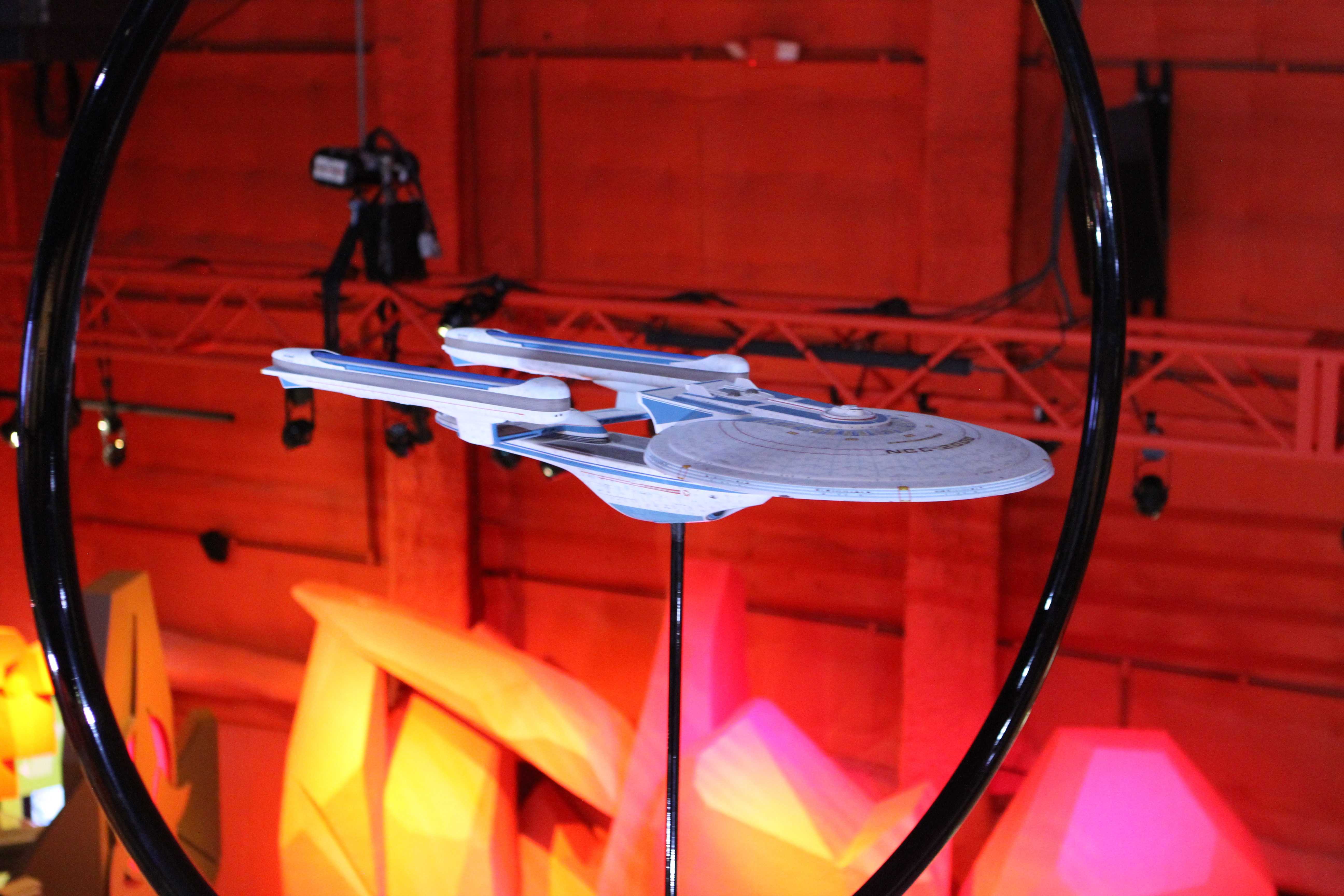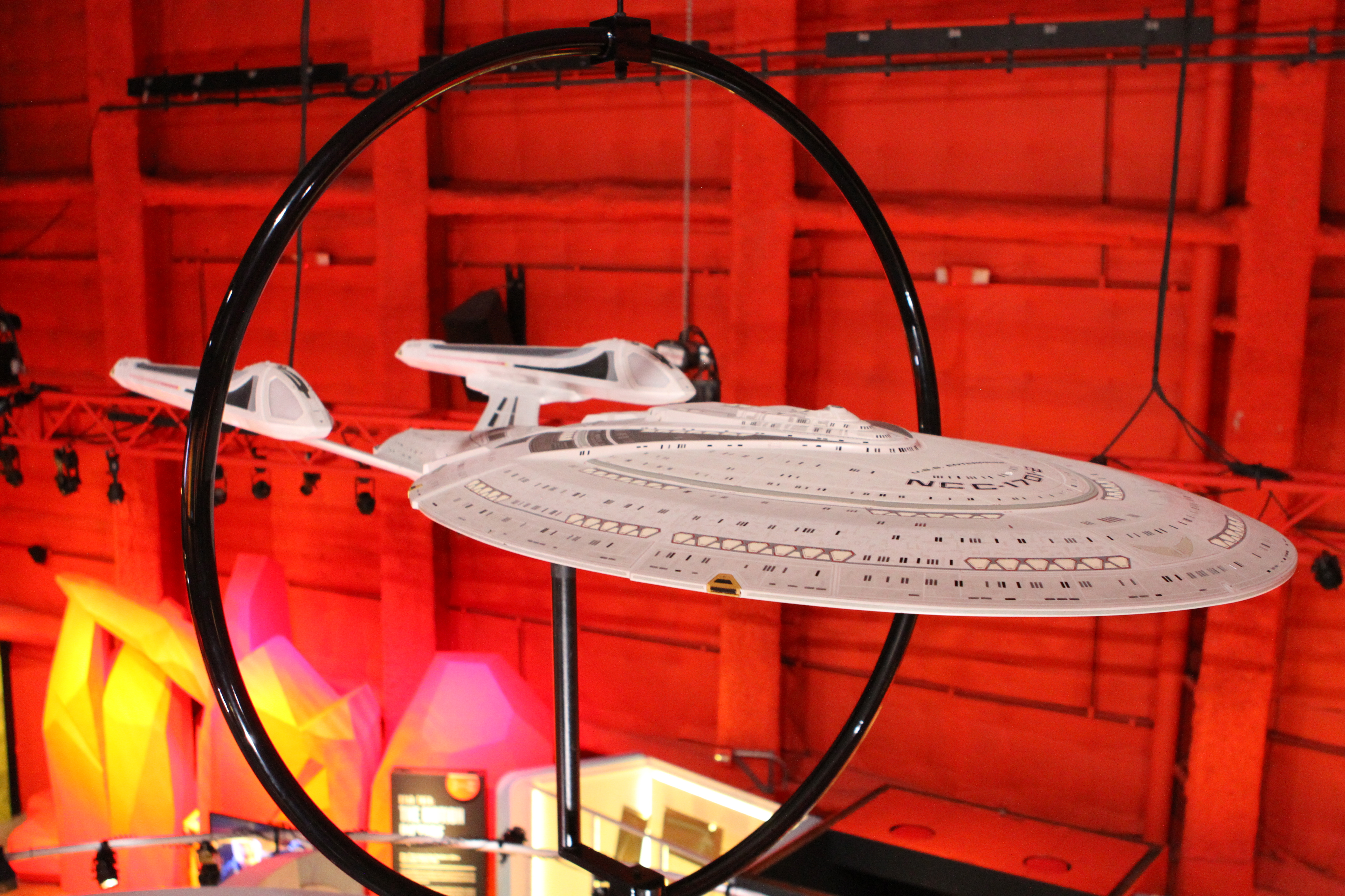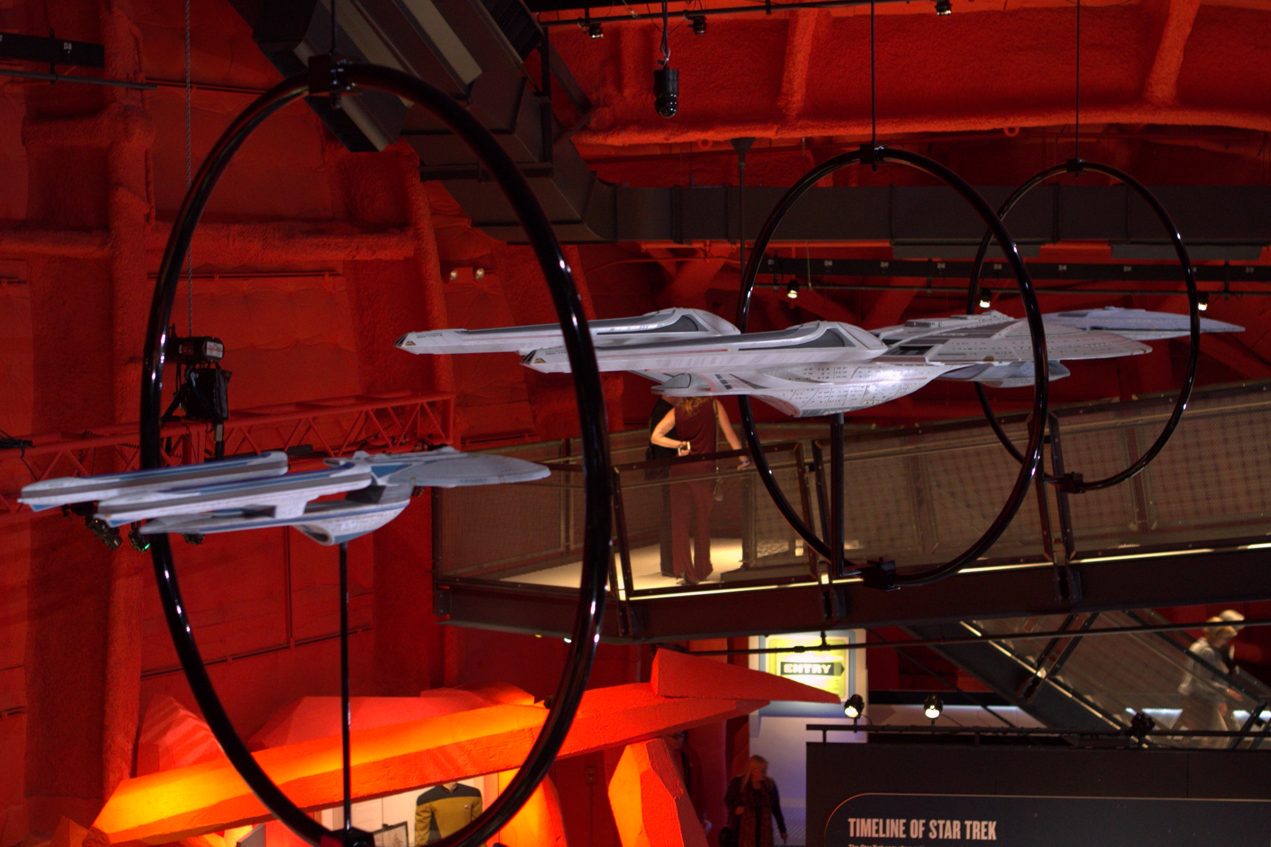Studio Scale Phase II Enterprise Refit: This is the Phase II converted to TMP, from my dry dock. Its 6 foot long. And really lovely – a great conversion was done. We tried to have Excelsior and Enterprise-E lit, but EMP could not manage it on their display stand. (it’s not like they take a simple plug, its COMPLICATED.)
