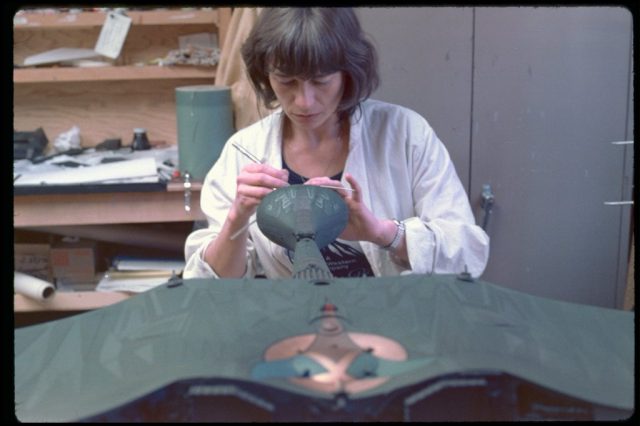 The picture with Andrew Probert and the picture with Suzana Swansea show the model in the earliest condition I know. It can be seen well on the still existing Disruptor towers at the front edges of the underside of the main body. In the final version these are replaced by more complex illuminated parts.