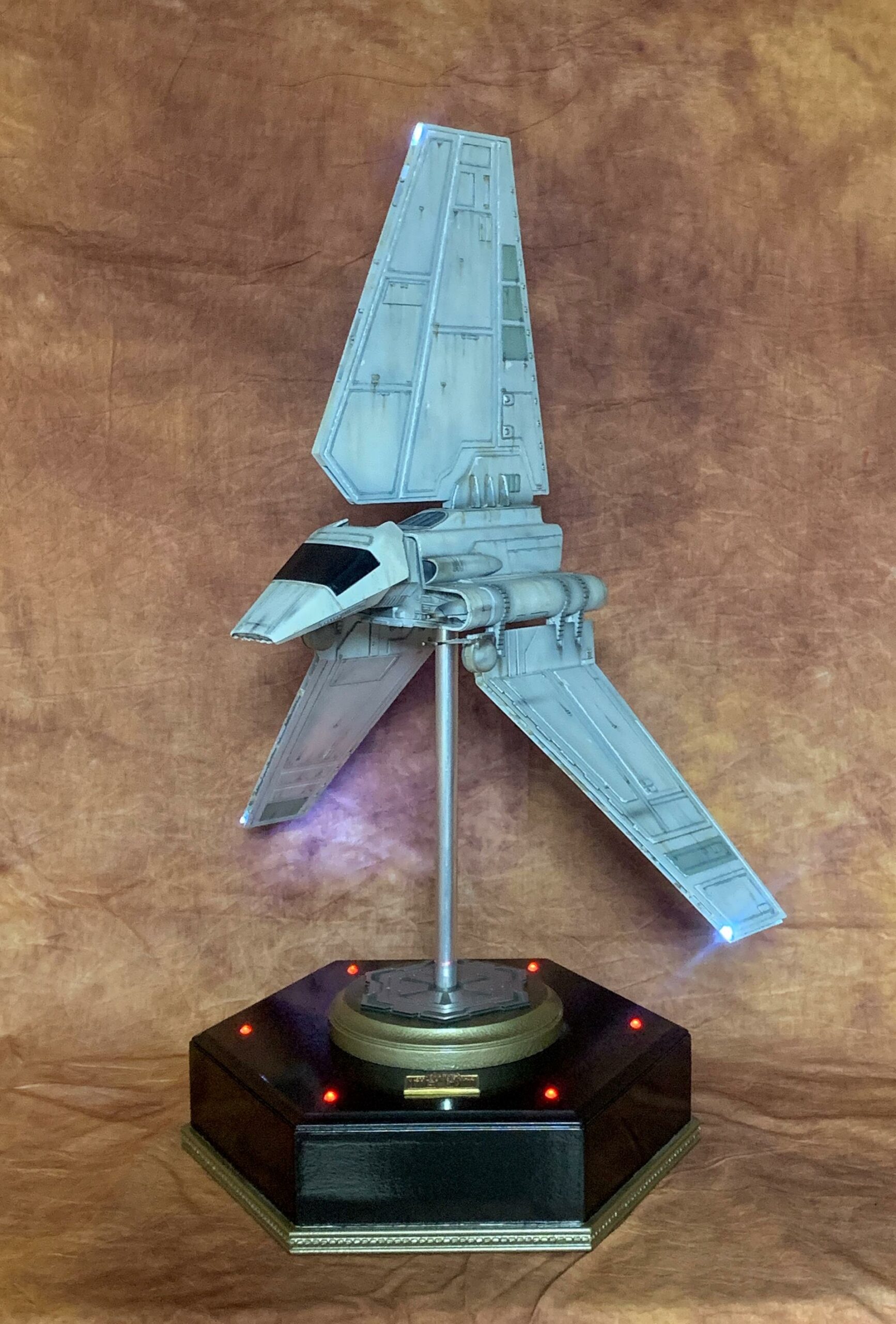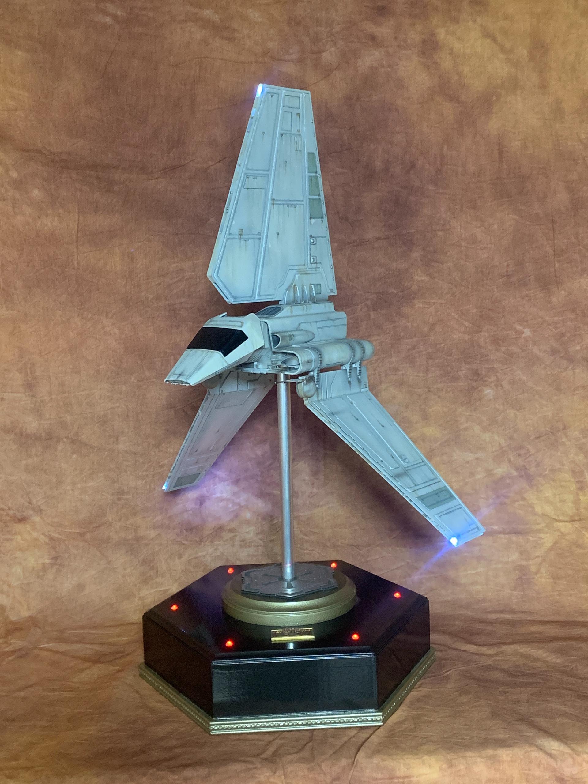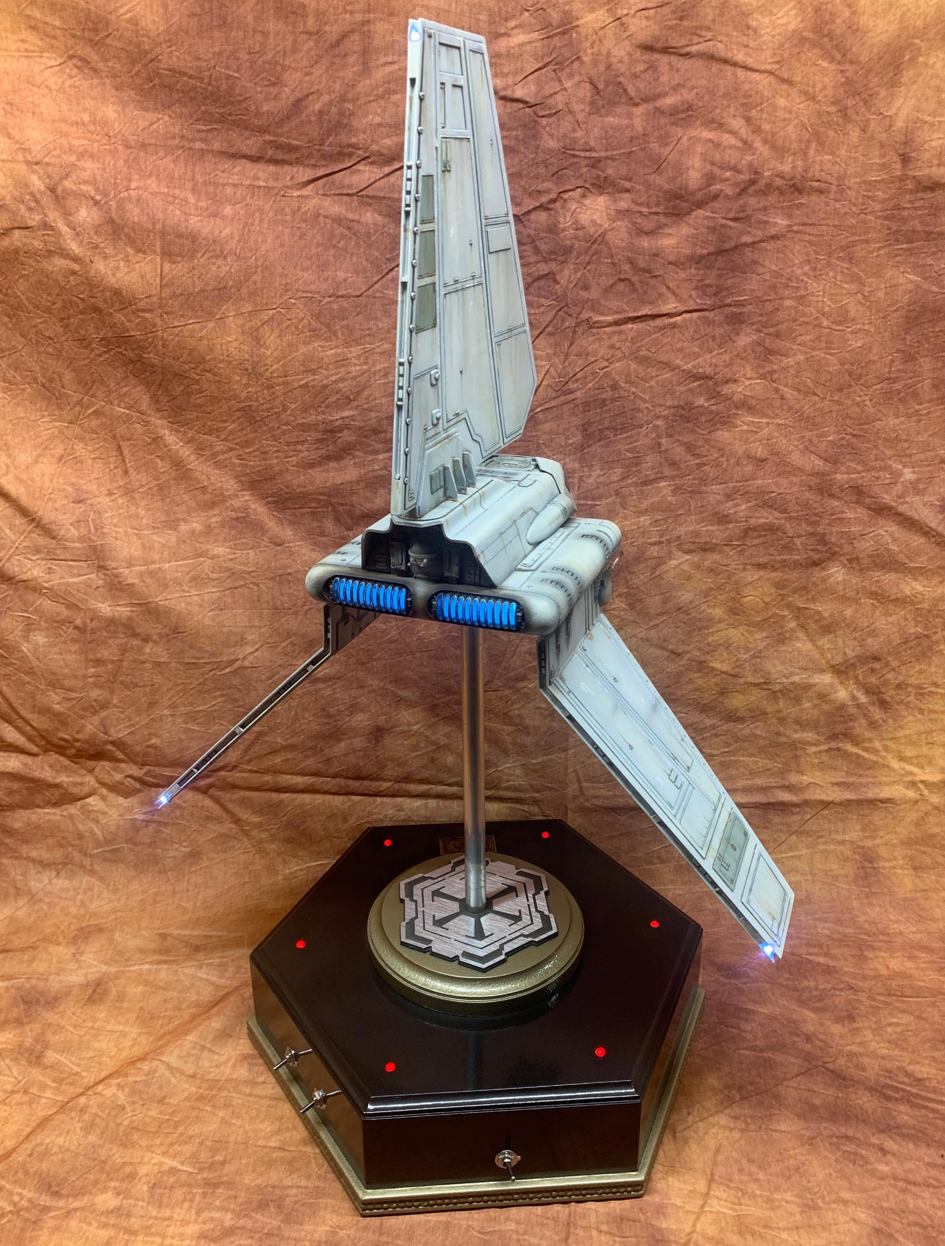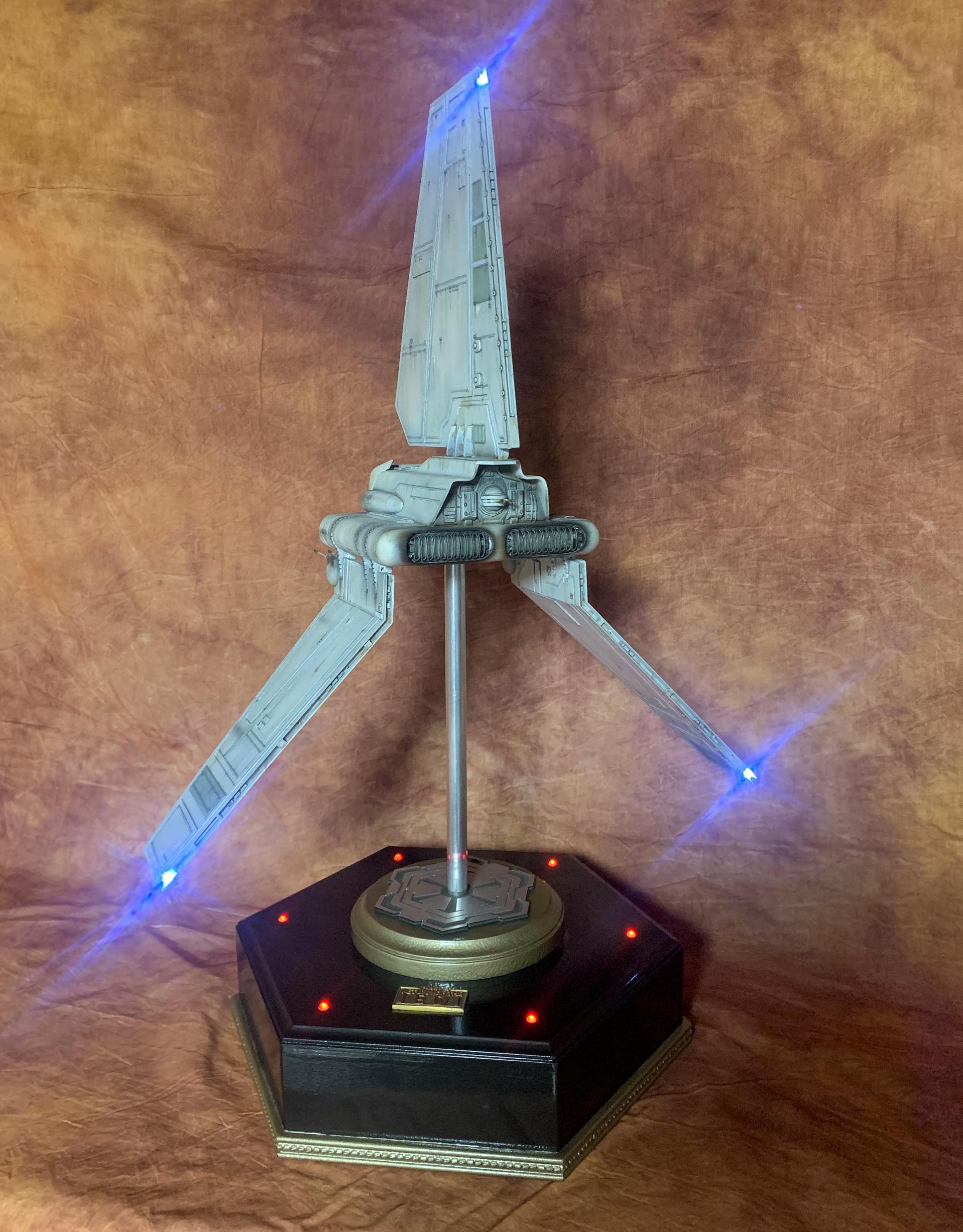 The model was painted in Tamiya acrylics and panel line accents used to weather the model. A display base was constructed from MDF board and I incorporated red led landing lights into the top of the base with an Imperial emblem in the middle where the model support tube goes through. I think all in all this turned out to be one of my favorite Star Wars Model builds.