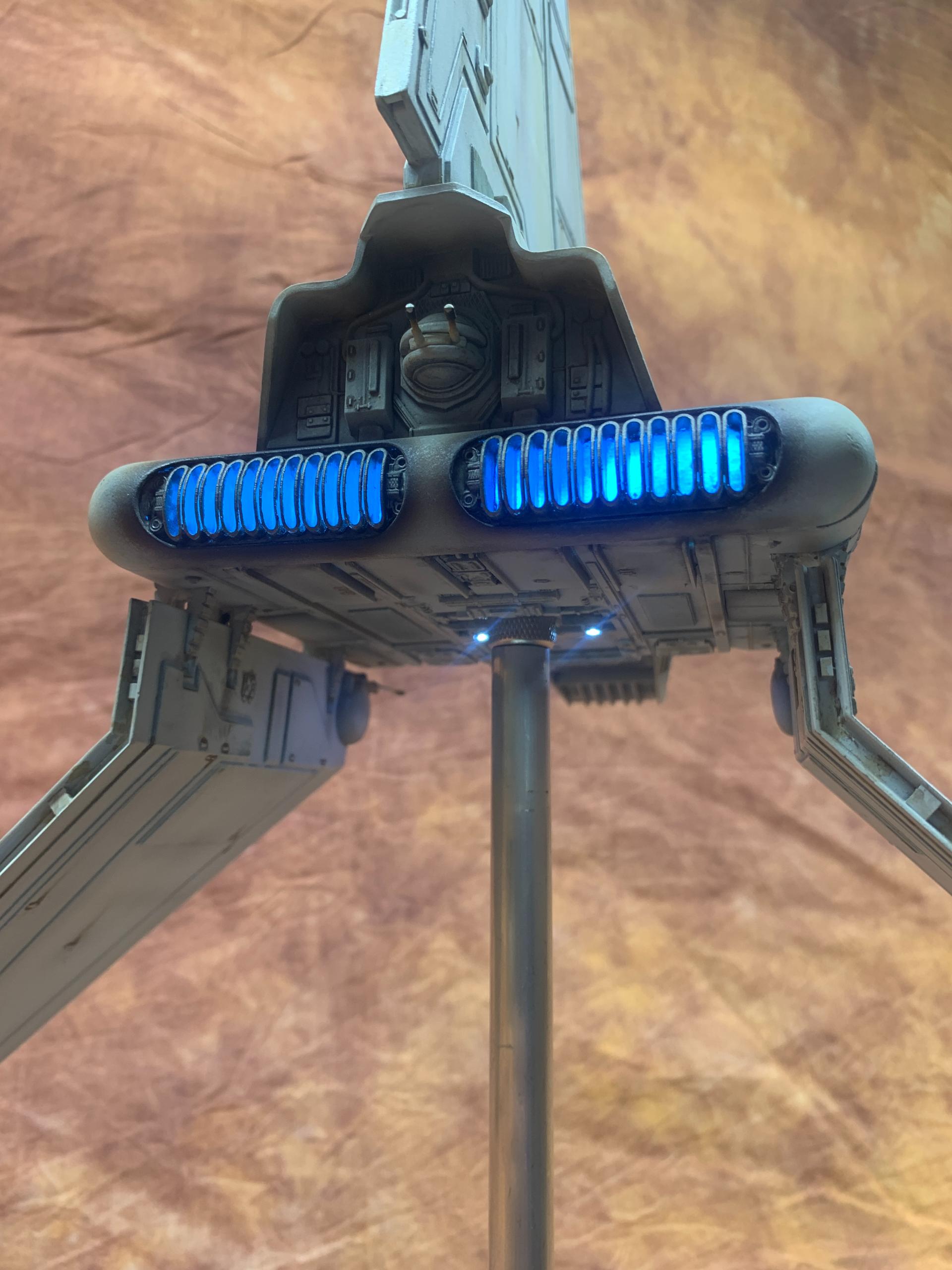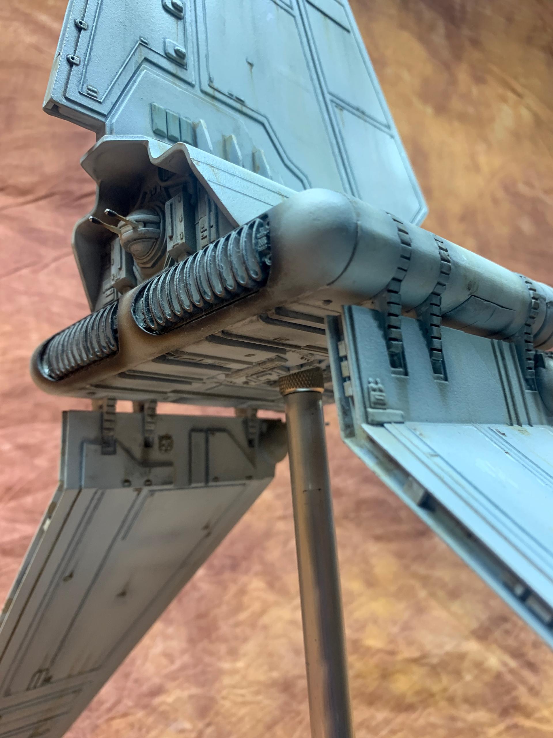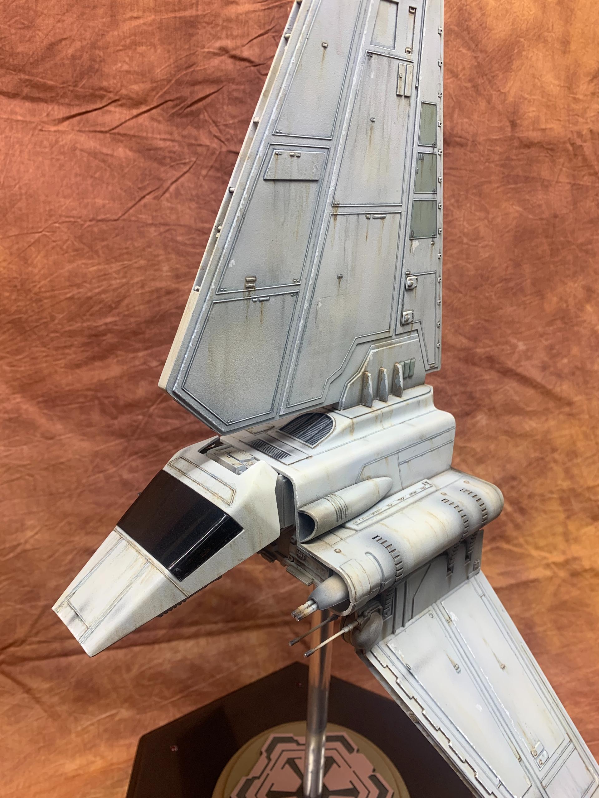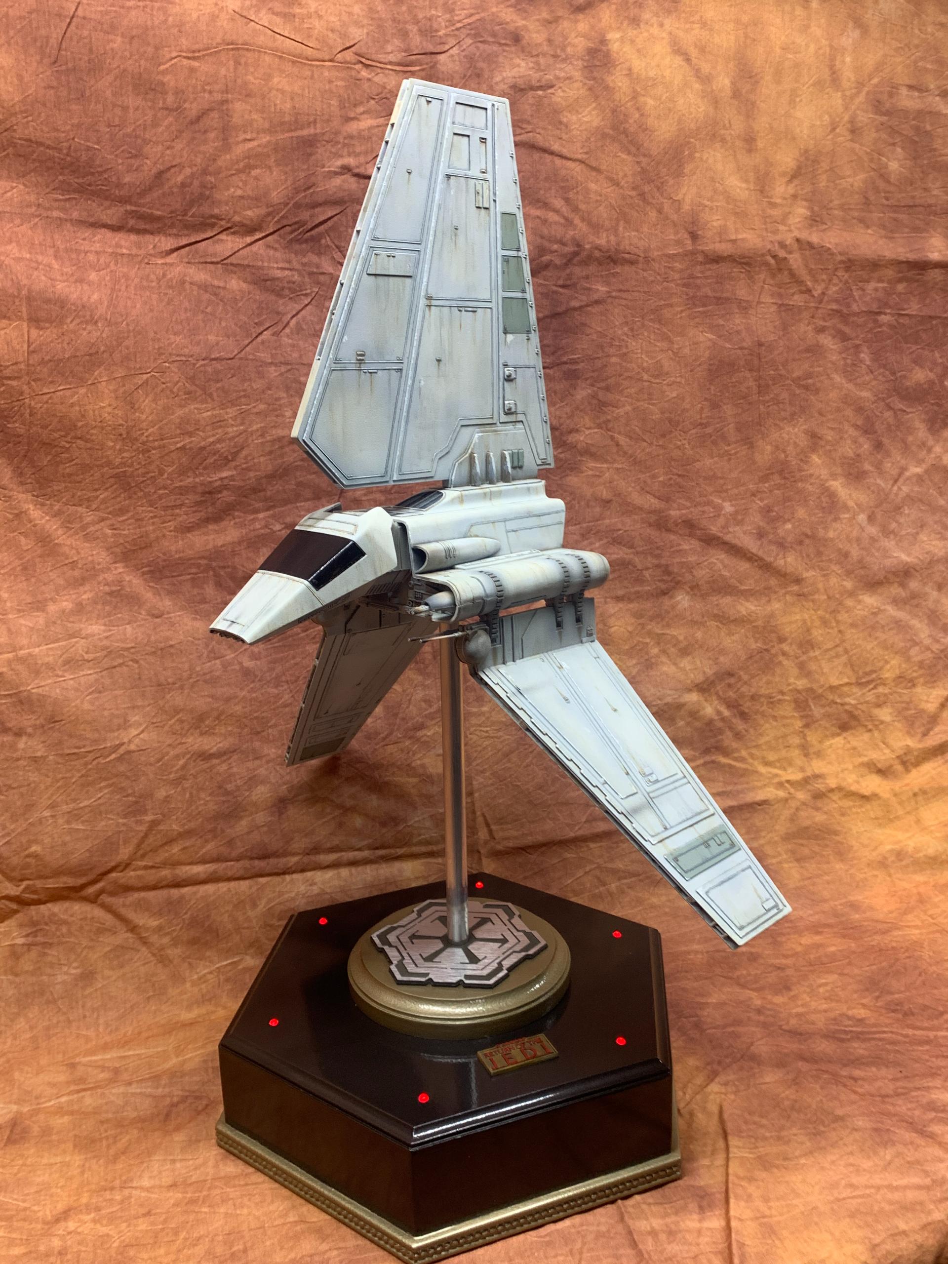 The model was painted in Tamiya acrylics and panel line accents used to weather the model. A display base was constructed from MDF board and I incorporated red led landing lights into the top of the base with an Imperial emblem in the middle where the model support tube goes through. I think all in all this turned out to be one of my favorite Star Wars Model builds.