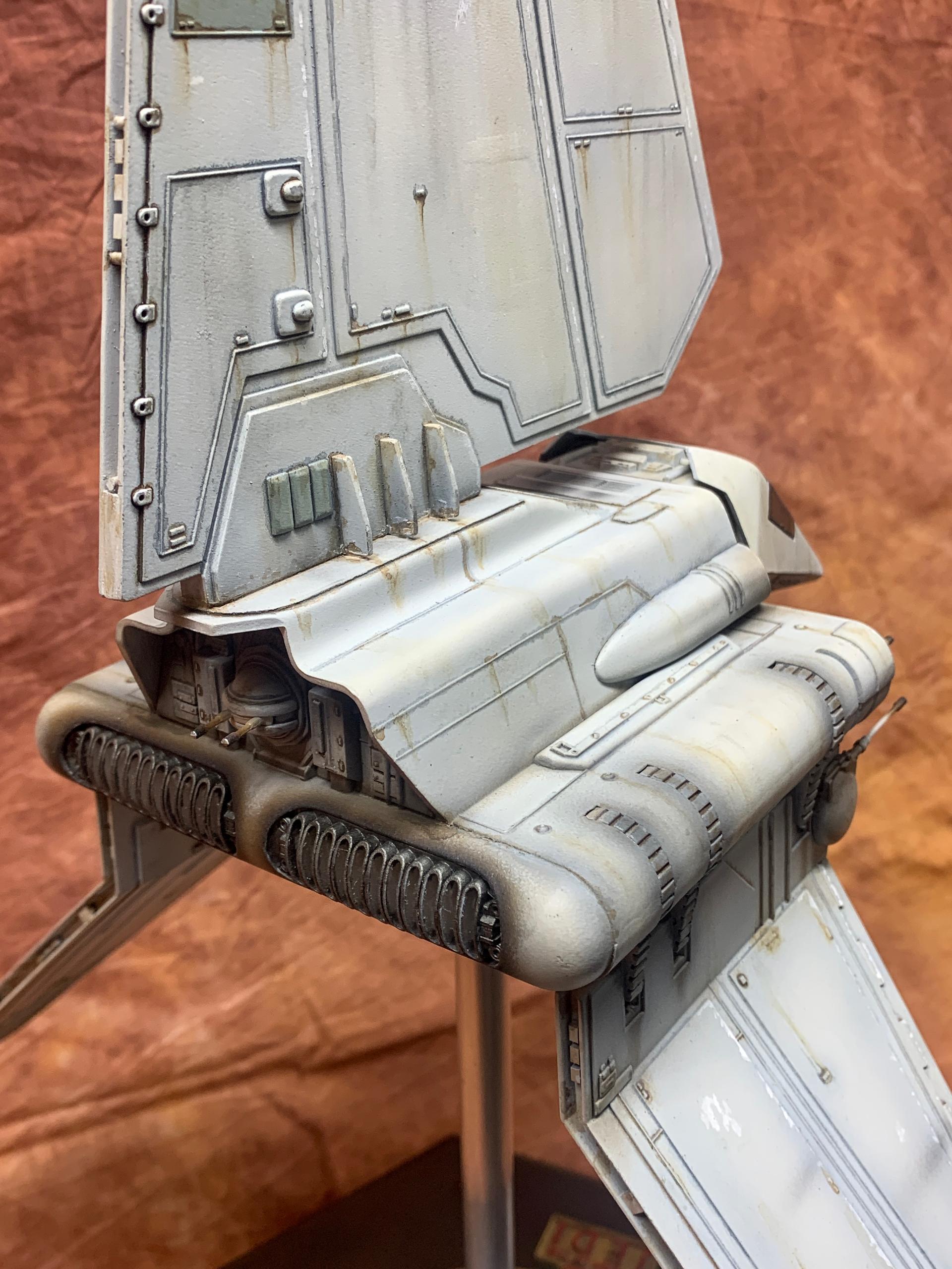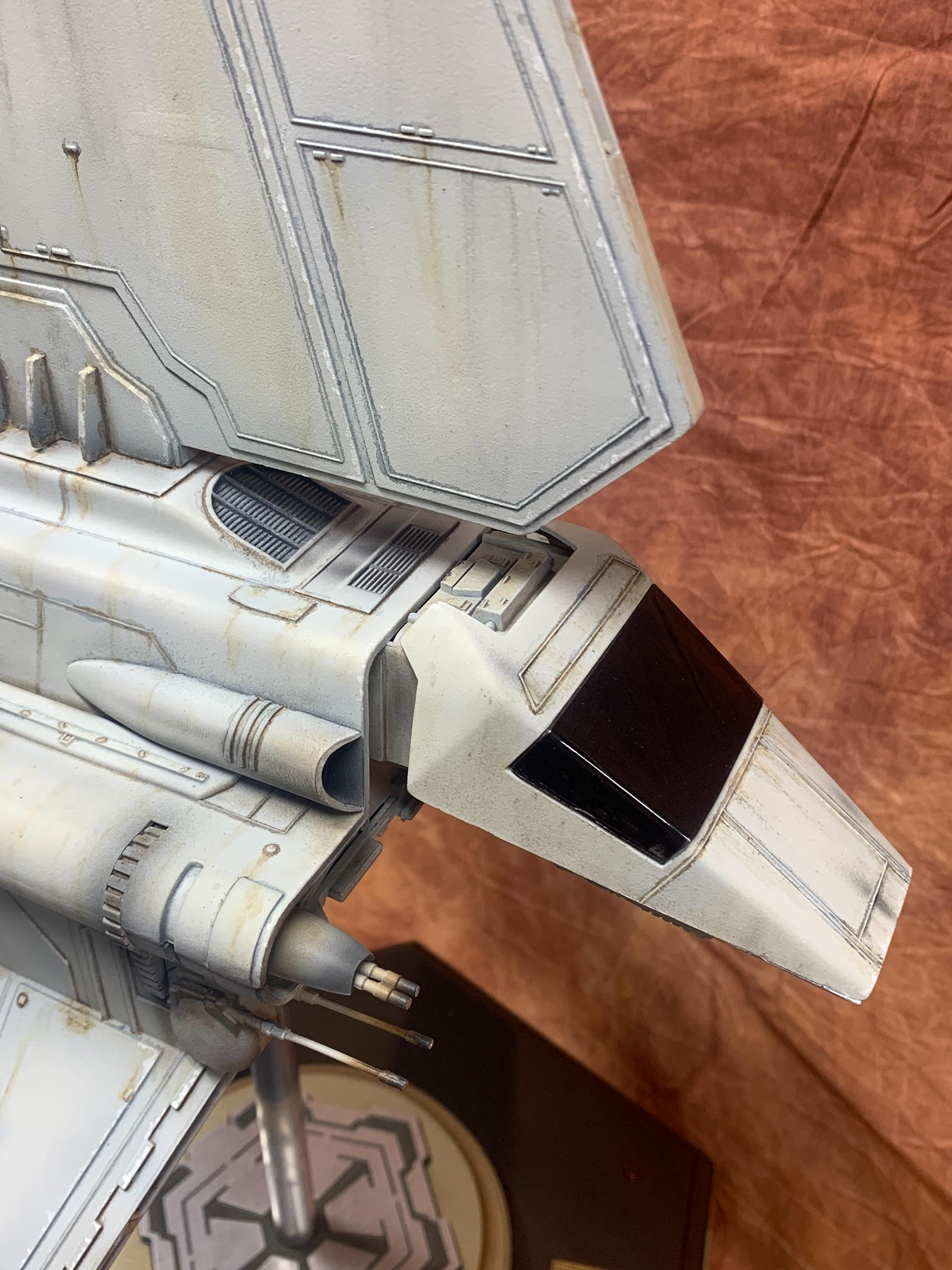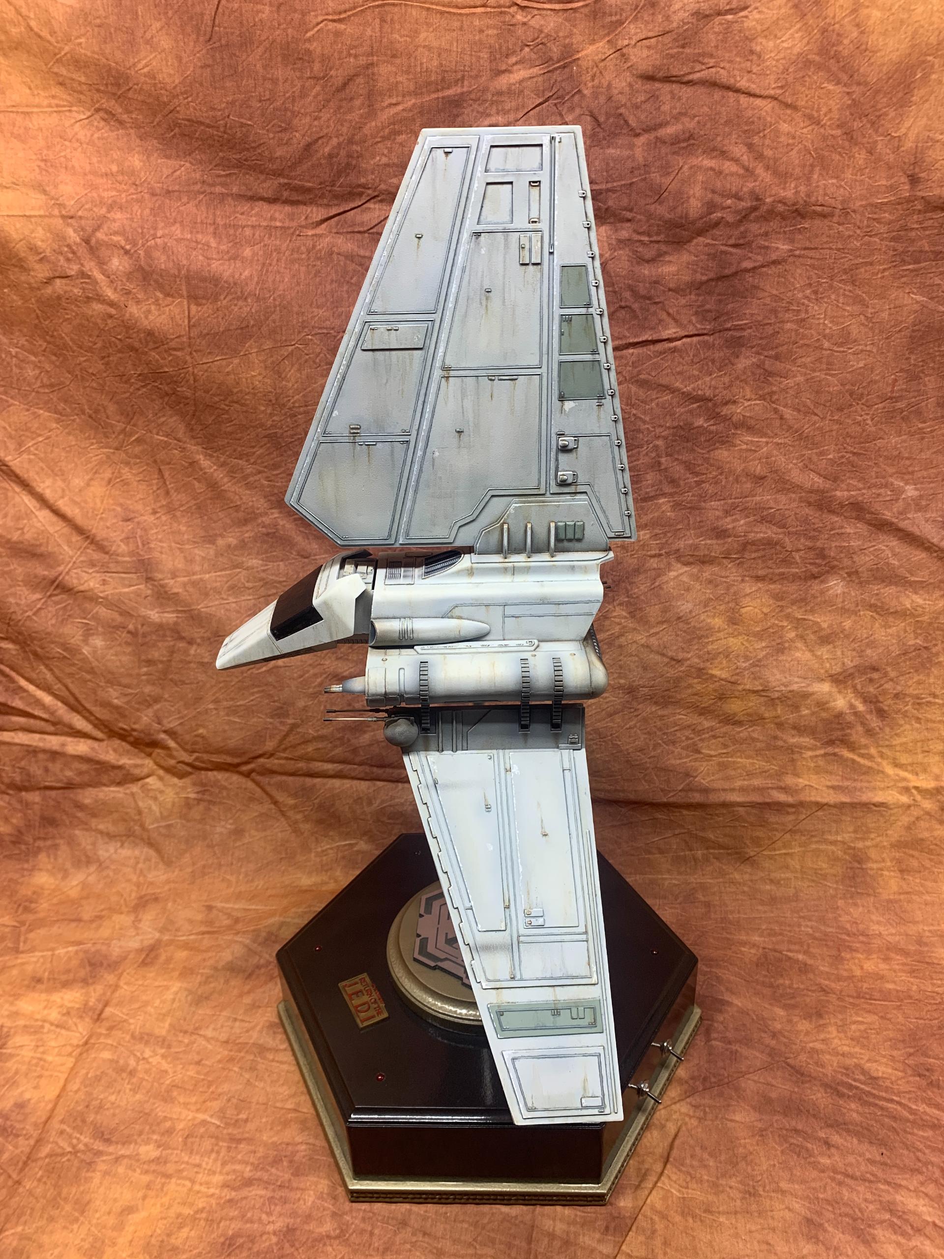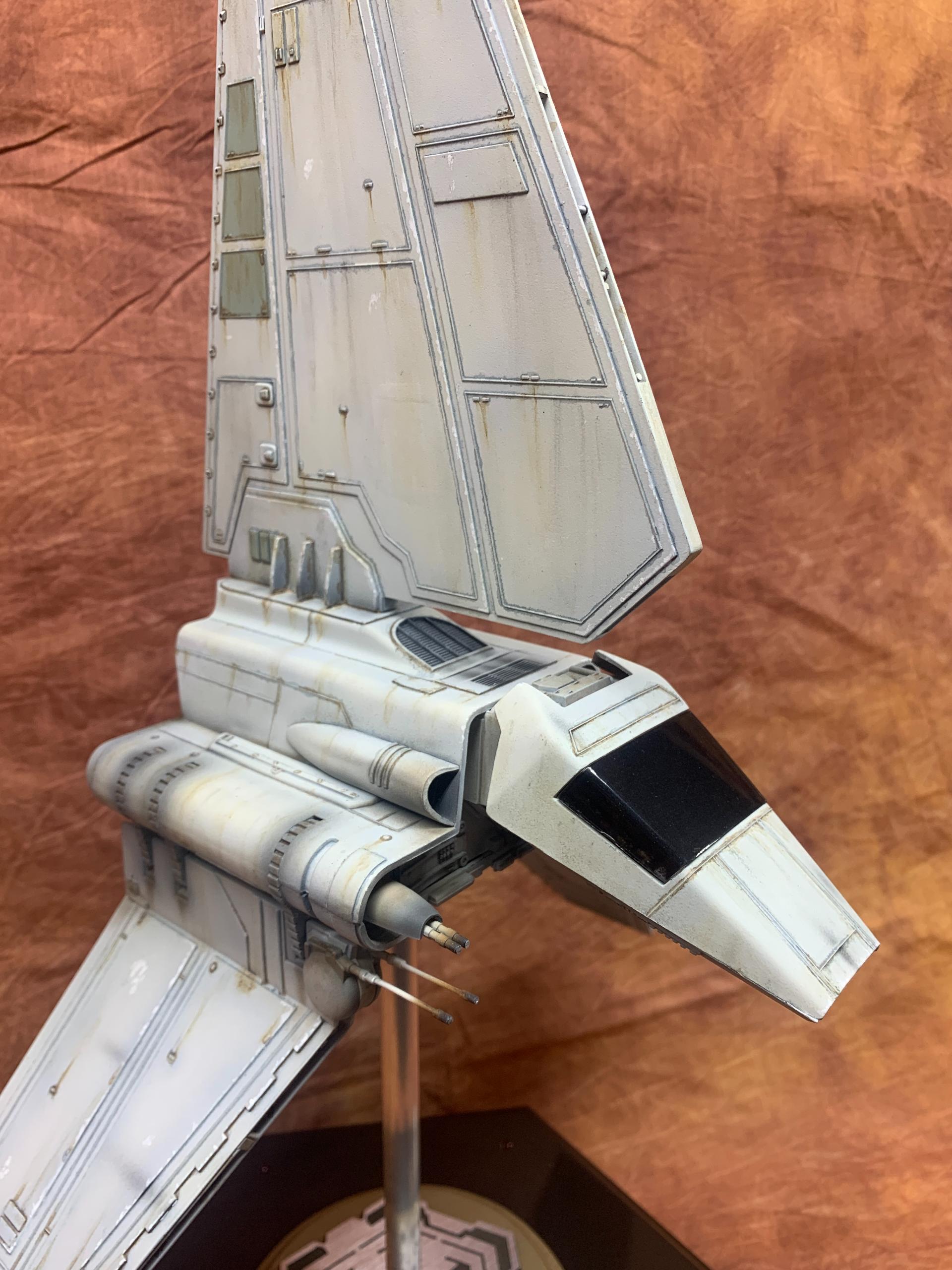 The model was painted in Tamiya acrylics and panel line accents used to weather the model. A display base was constructed from MDF board and I incorporated red led landing lights into the top of the base with an Imperial emblem in the middle where the model support tube goes through. I think all in all this turned out to be one of my favorite Star Wars Model builds.