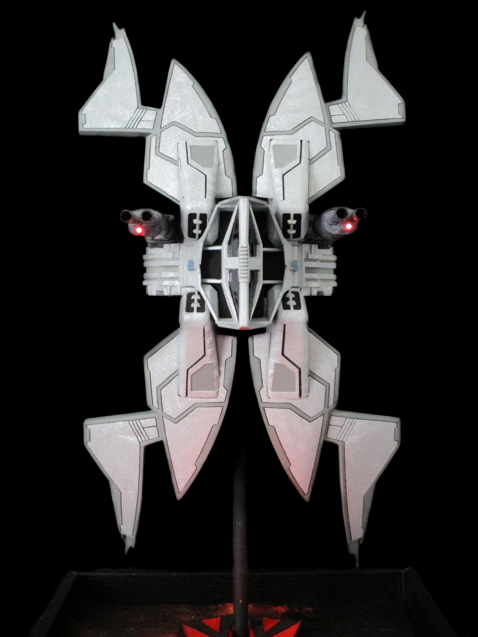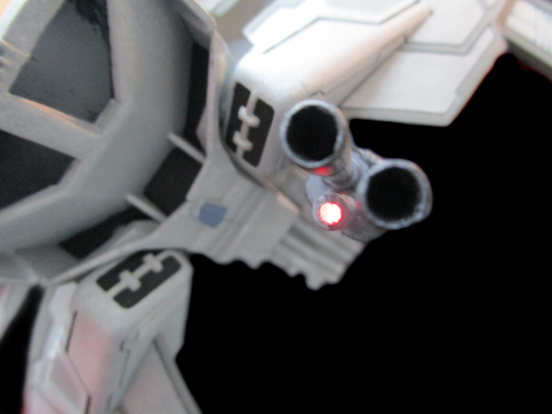 Has lights in the engines and the tracking sensors of the lasers.