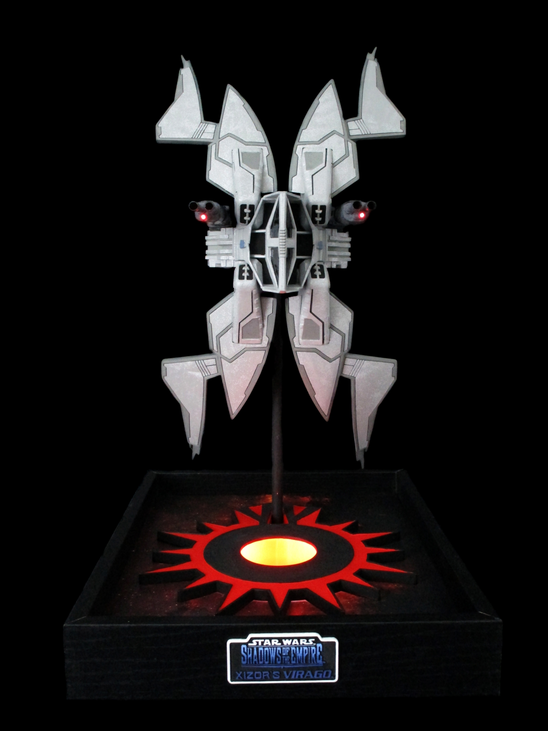 Custom base which holds the 2xAA batteries and on/off switch. And has red light to shine on the model as well.