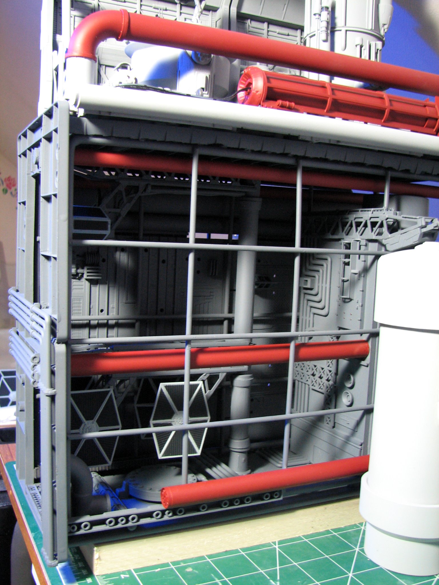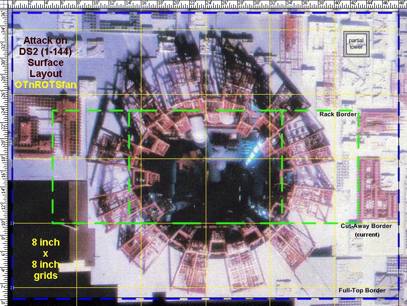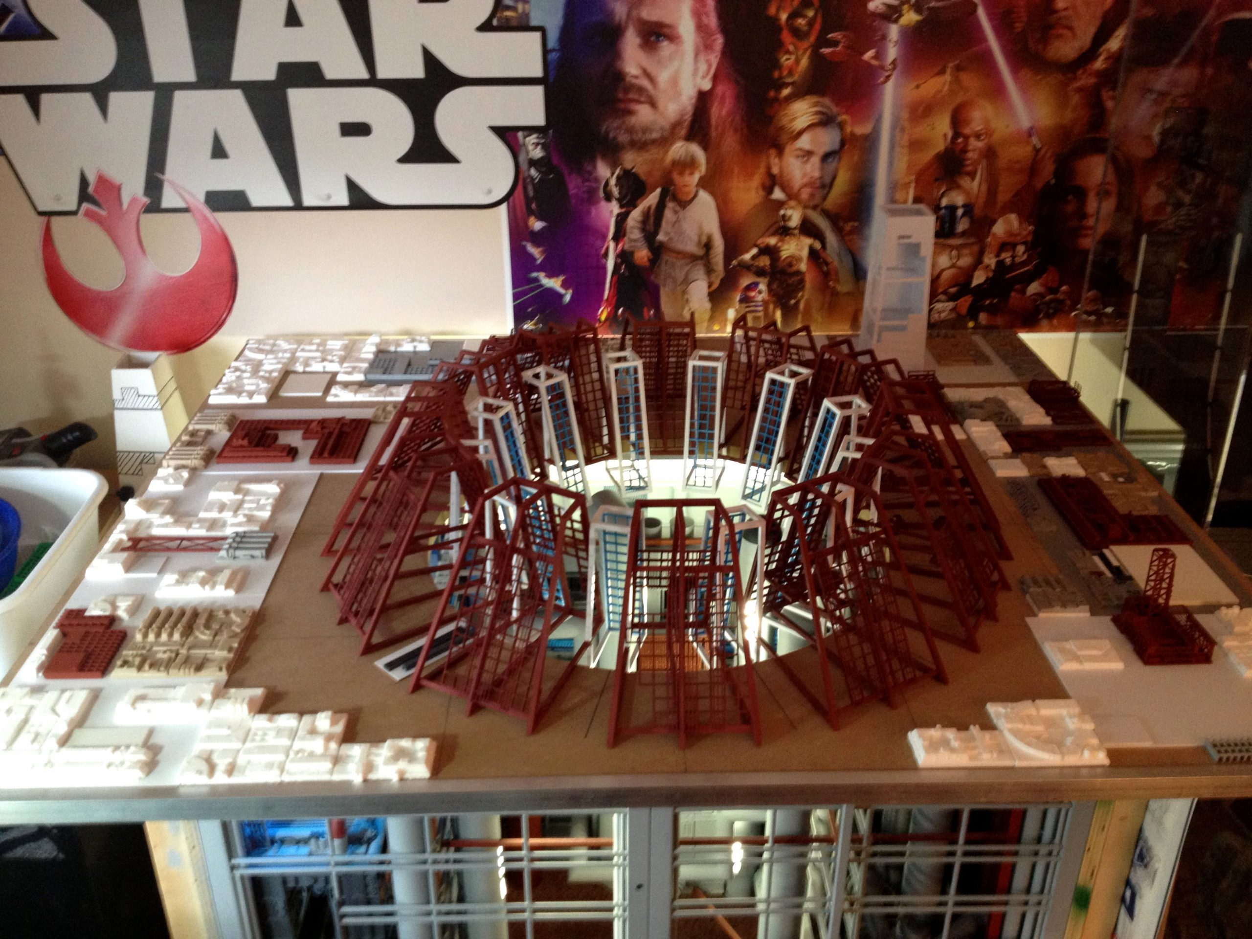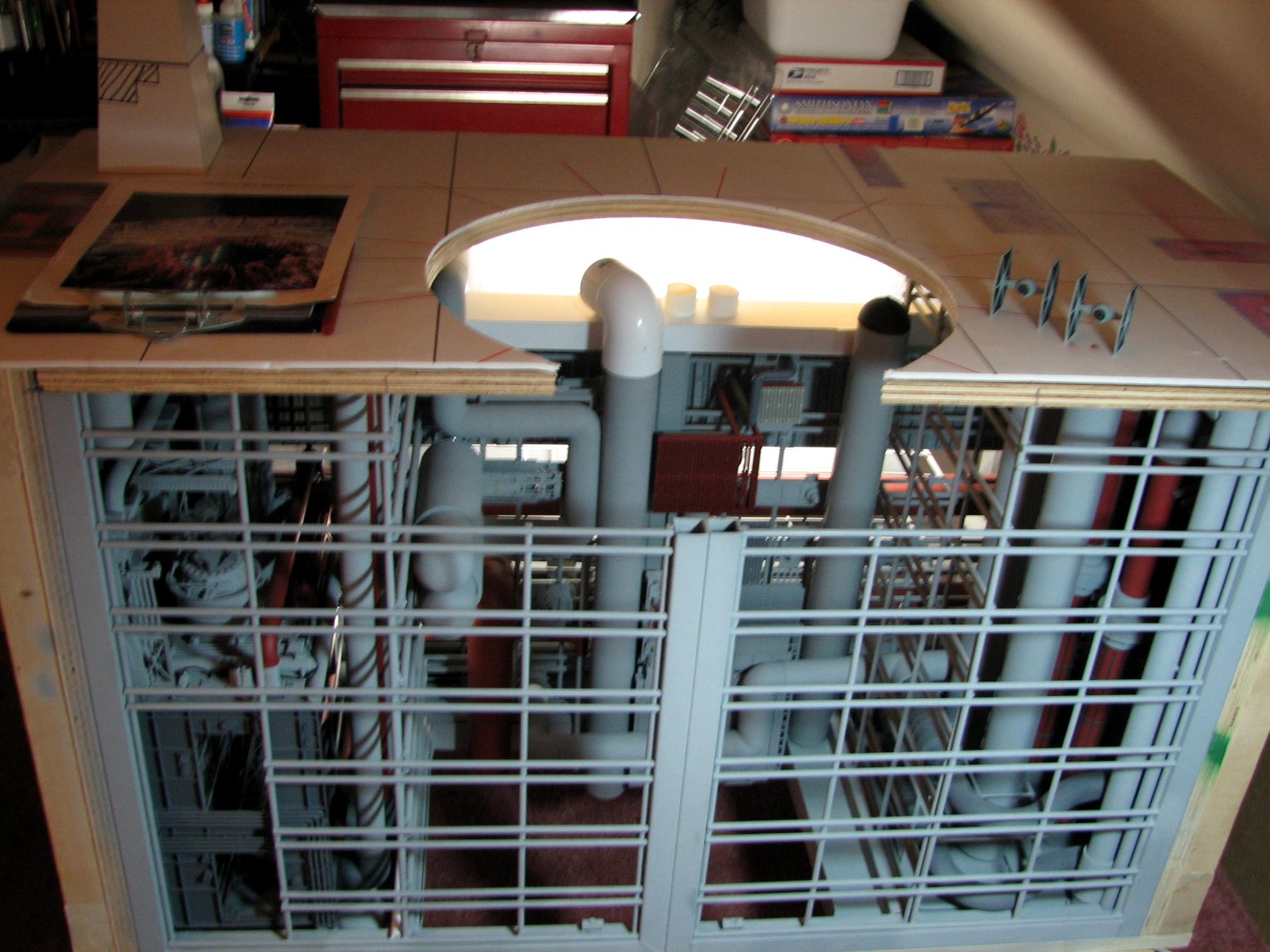The Death Star II Port Attack (Cross-Section) began life as a discarded metal store rack. The cross-section tunnel and lighting were completed between 2008 and 2010. The math of doing a port intrigued me as an long-time engineer. The top surface is hinged like a car hood for access to all inner workings and lighting. All surface port parts were hand-crafted and completed between 2011 and 2012. Mathematically, when connected, the port came out almost exact. The surface city-scape parts were laid out and completed between 2012 and 2013. This final phase of this project is being rebooted in summer 2021. Stay tuned…