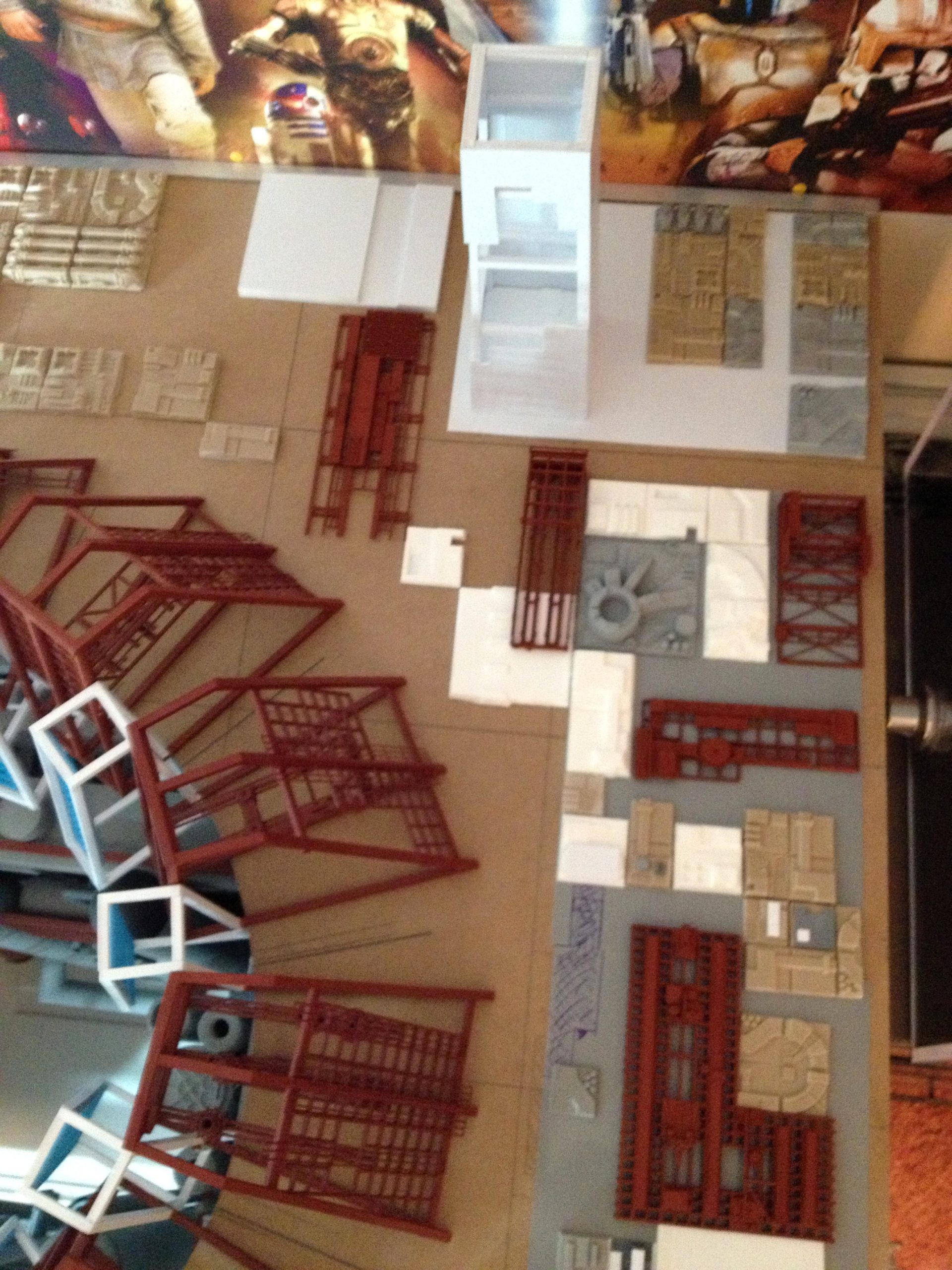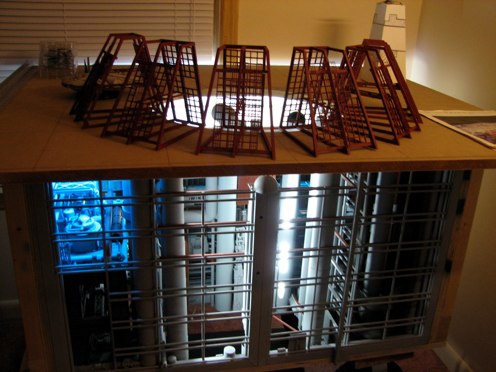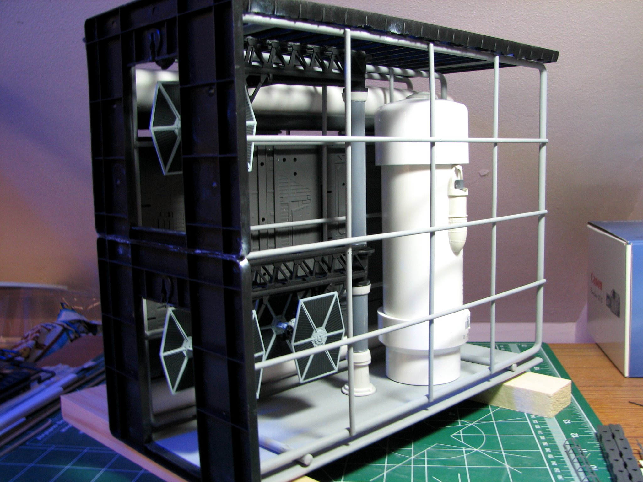 The Death Star II Port Attack (Cross-Section) began life as a discarded metal store rack. The cross-section tunnel and lighting were completed between 2008 and 2010. The math of doing a port intrigued me as an long-time engineer. The top surface is hinged like a car hood for access to all inner workings and lighting. All surface port parts were hand-crafted and completed between 2011 and 2012. Mathematically, when connected, the port came out almost exact. The surface city-scape parts were laid out and completed between 2012 and 2013. This final phase of this project is being rebooted in summer 2021. Stay tuned…